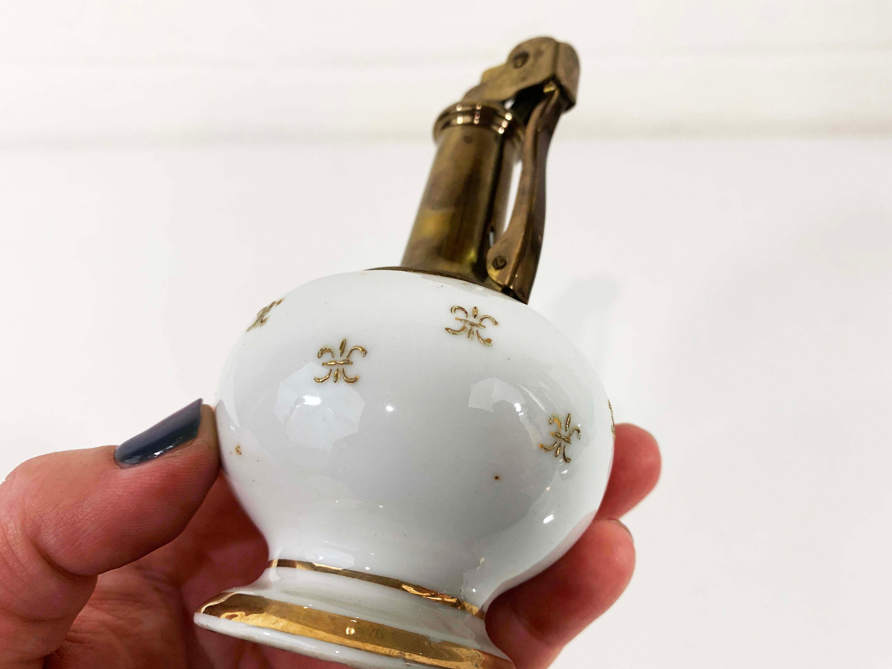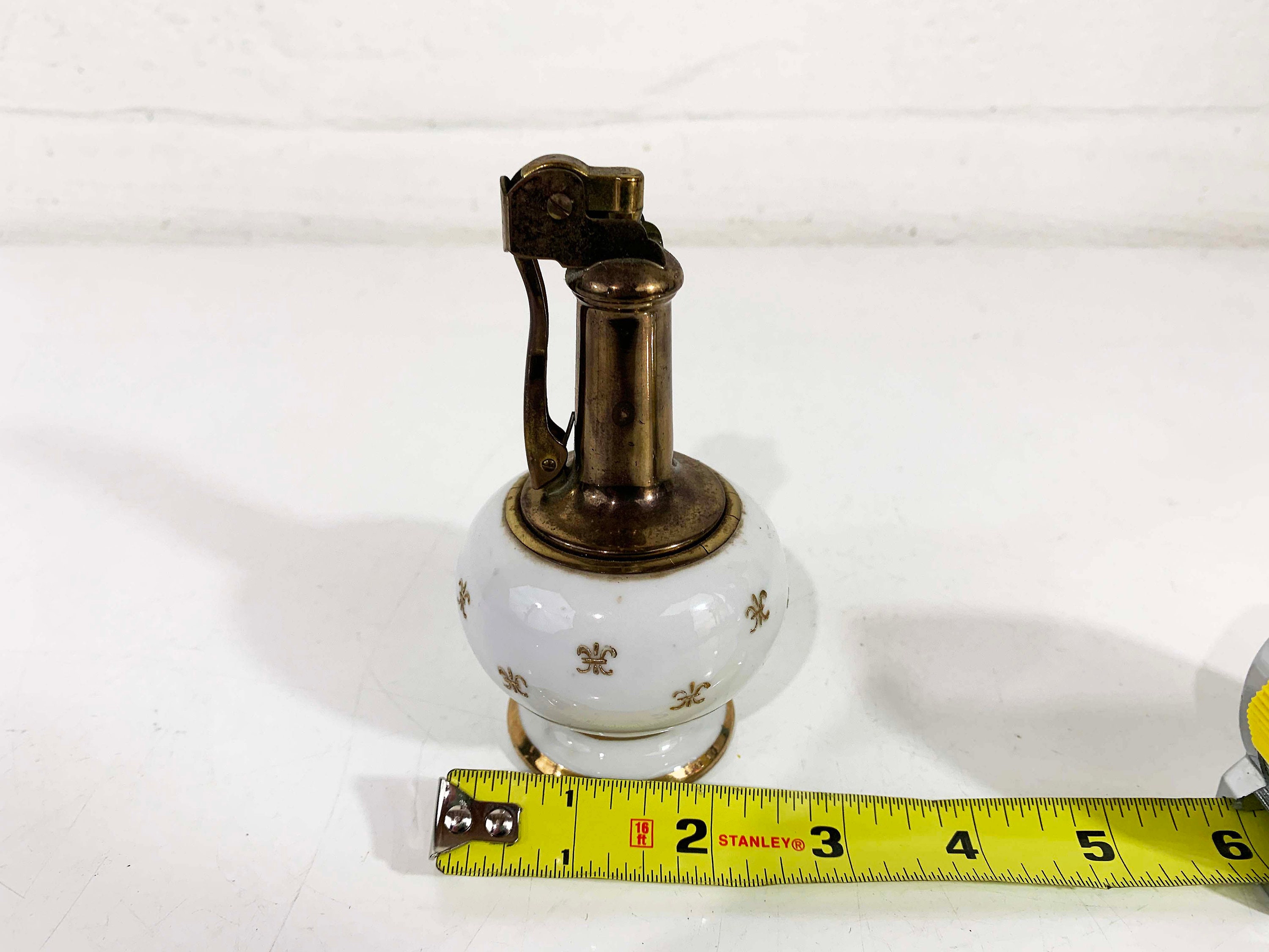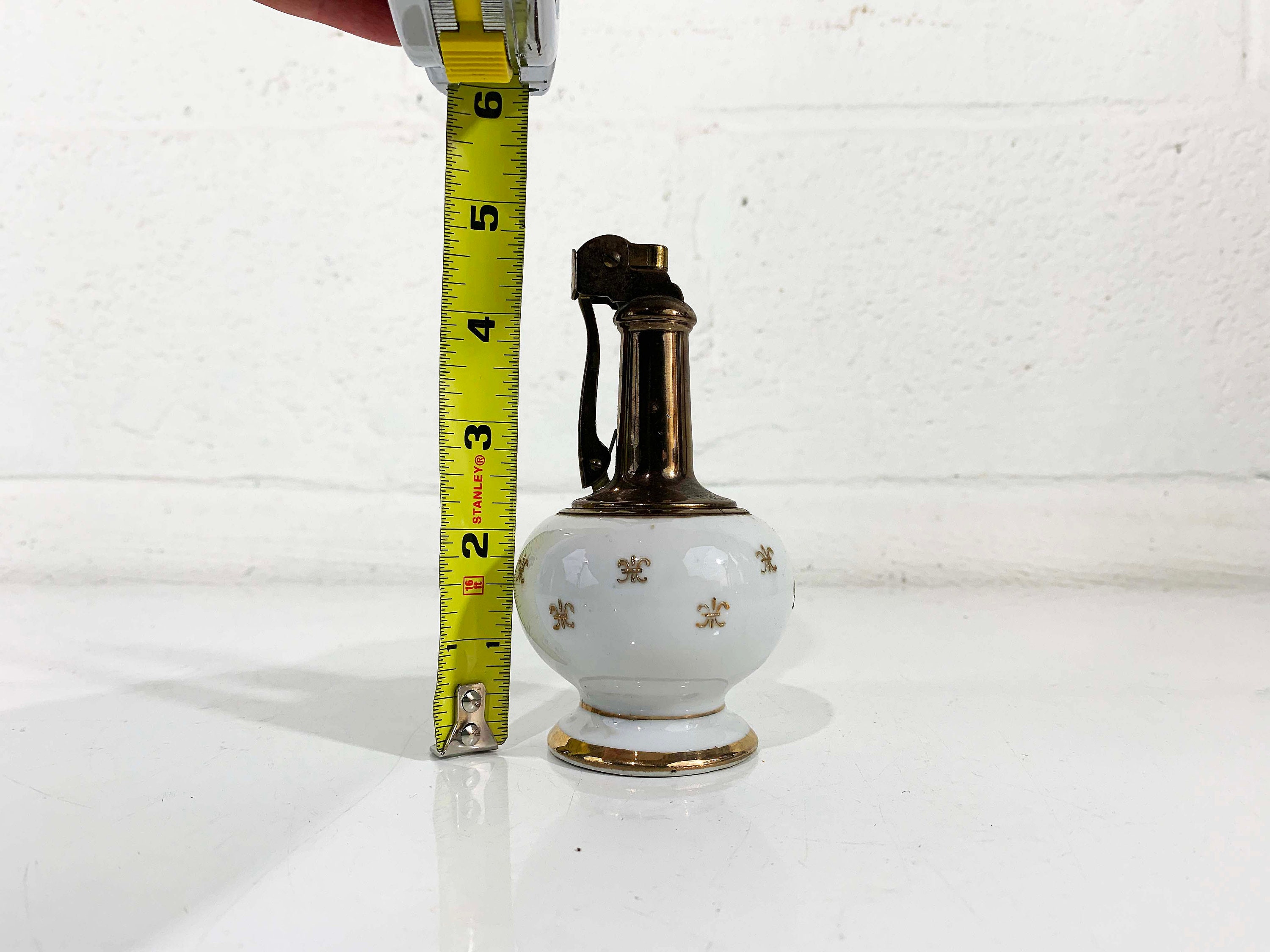 Super adorable tall vintage lighter in great condition - no cracks or chips! I have not tried to refill it so I cannot guarantee that it is in working order. The lighter is approximately 5 inches tall and 2 1/2 inches in diameter.