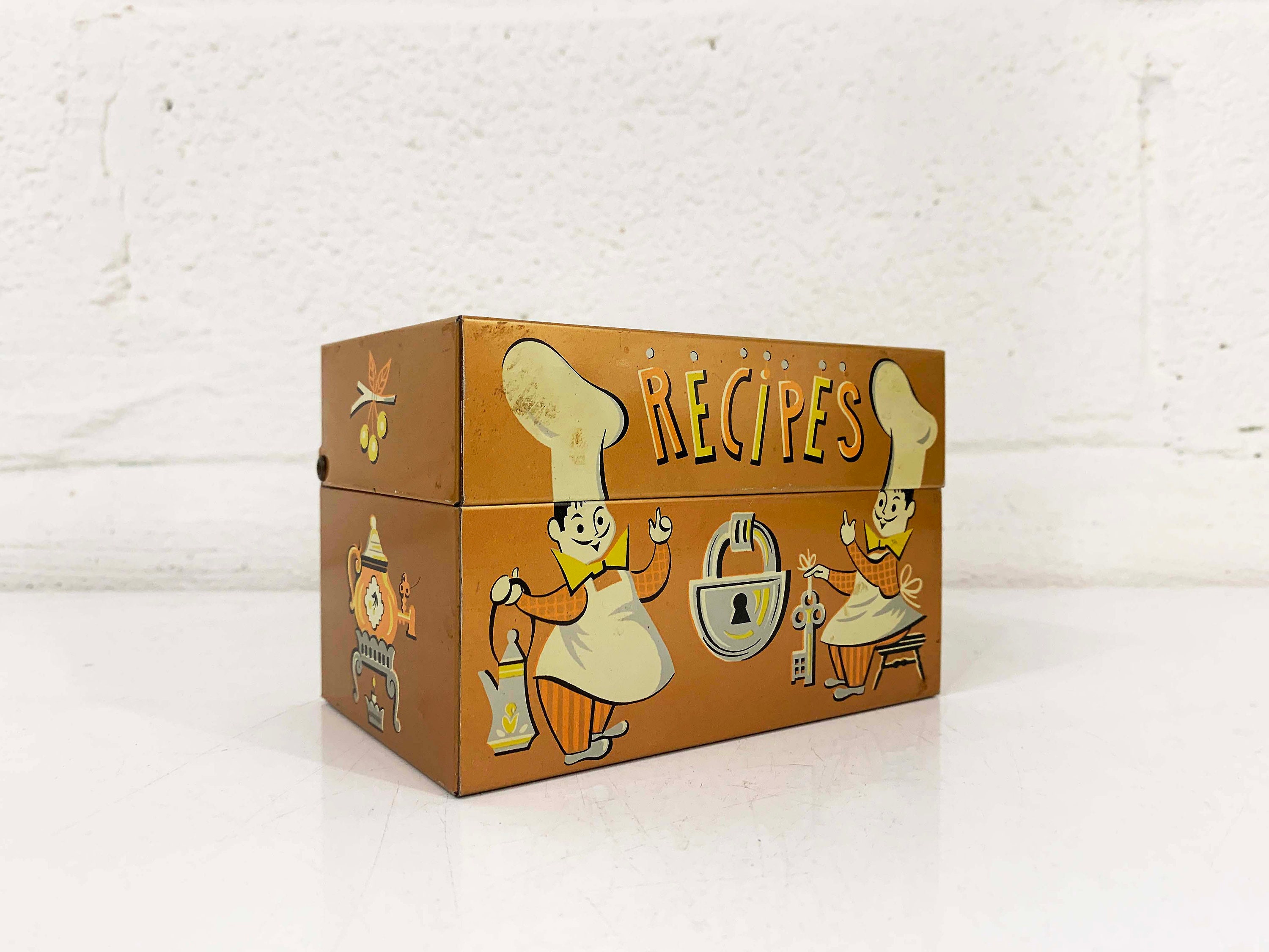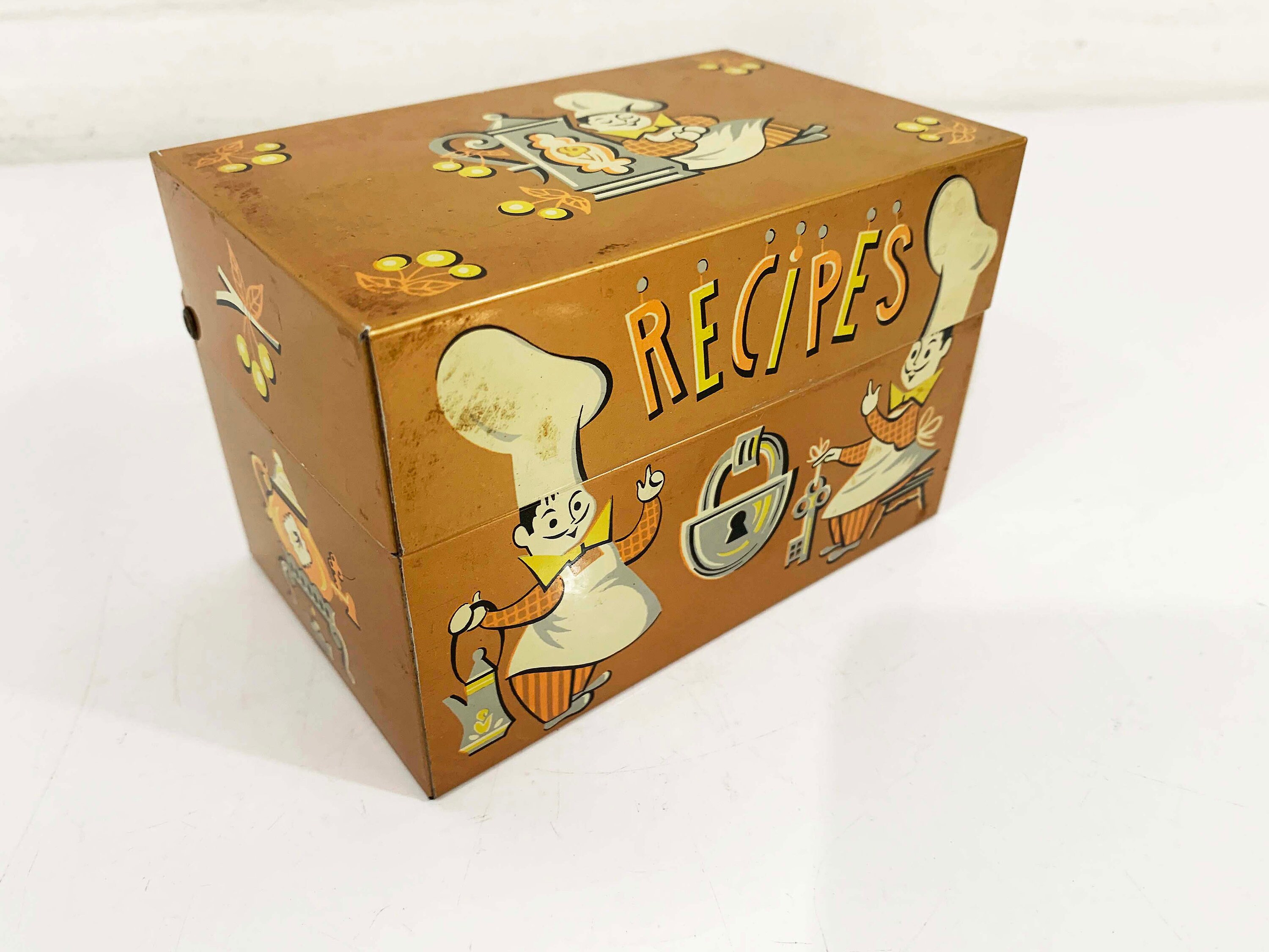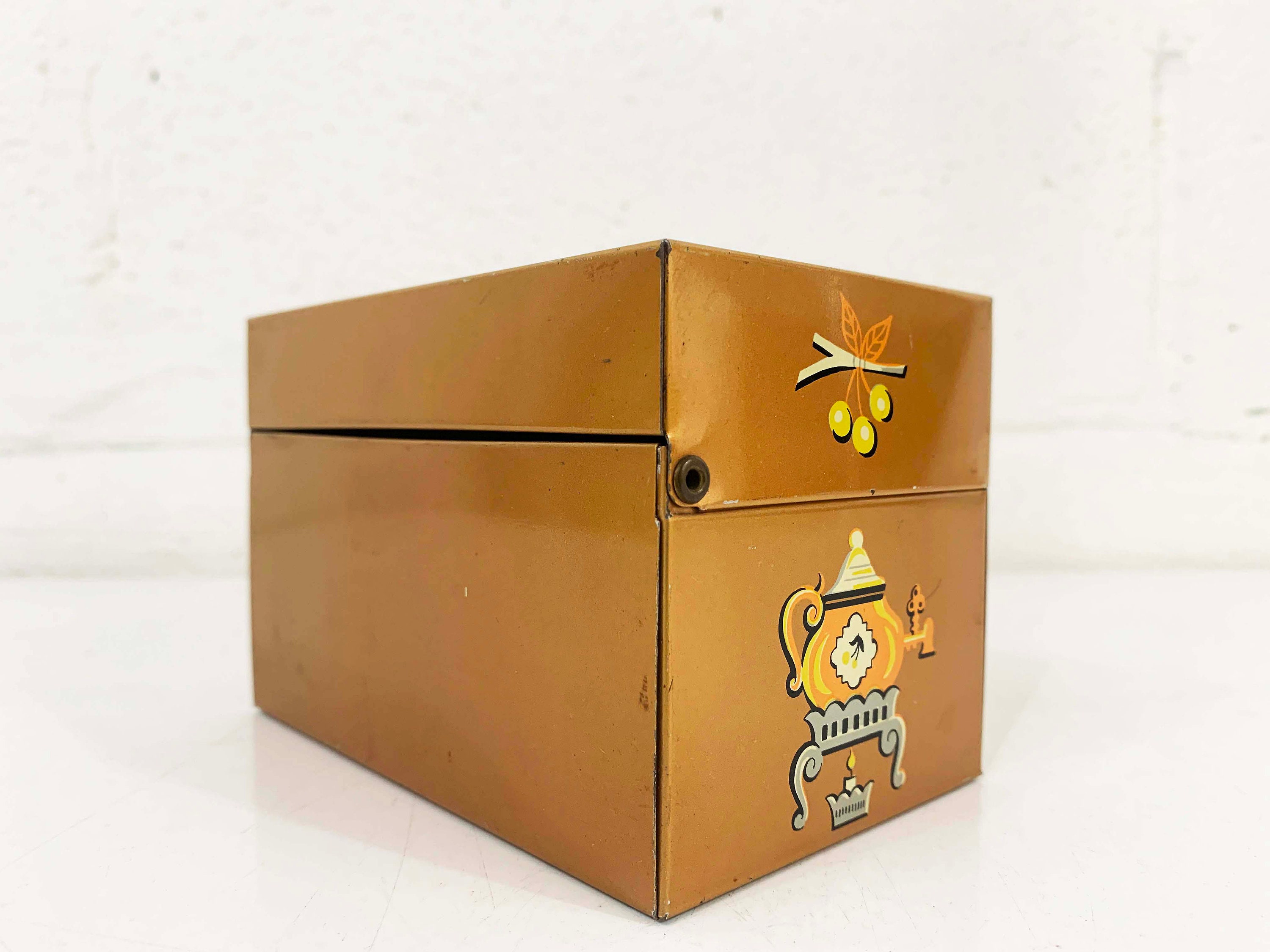 Super adorable metal recipe box in good condition. Would look so cute in your vintage kitchen! It is in excellent condition with no significant flaws. The box is approximately 5 1/4 inches long, 3 1/4 inches wide, and 3 1/2 inches tall.