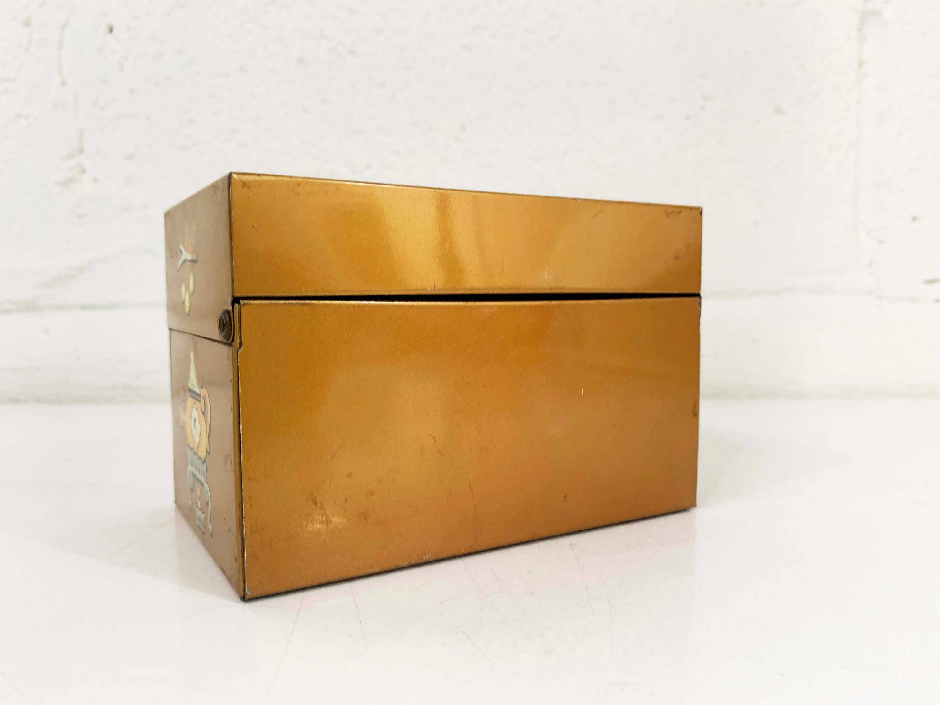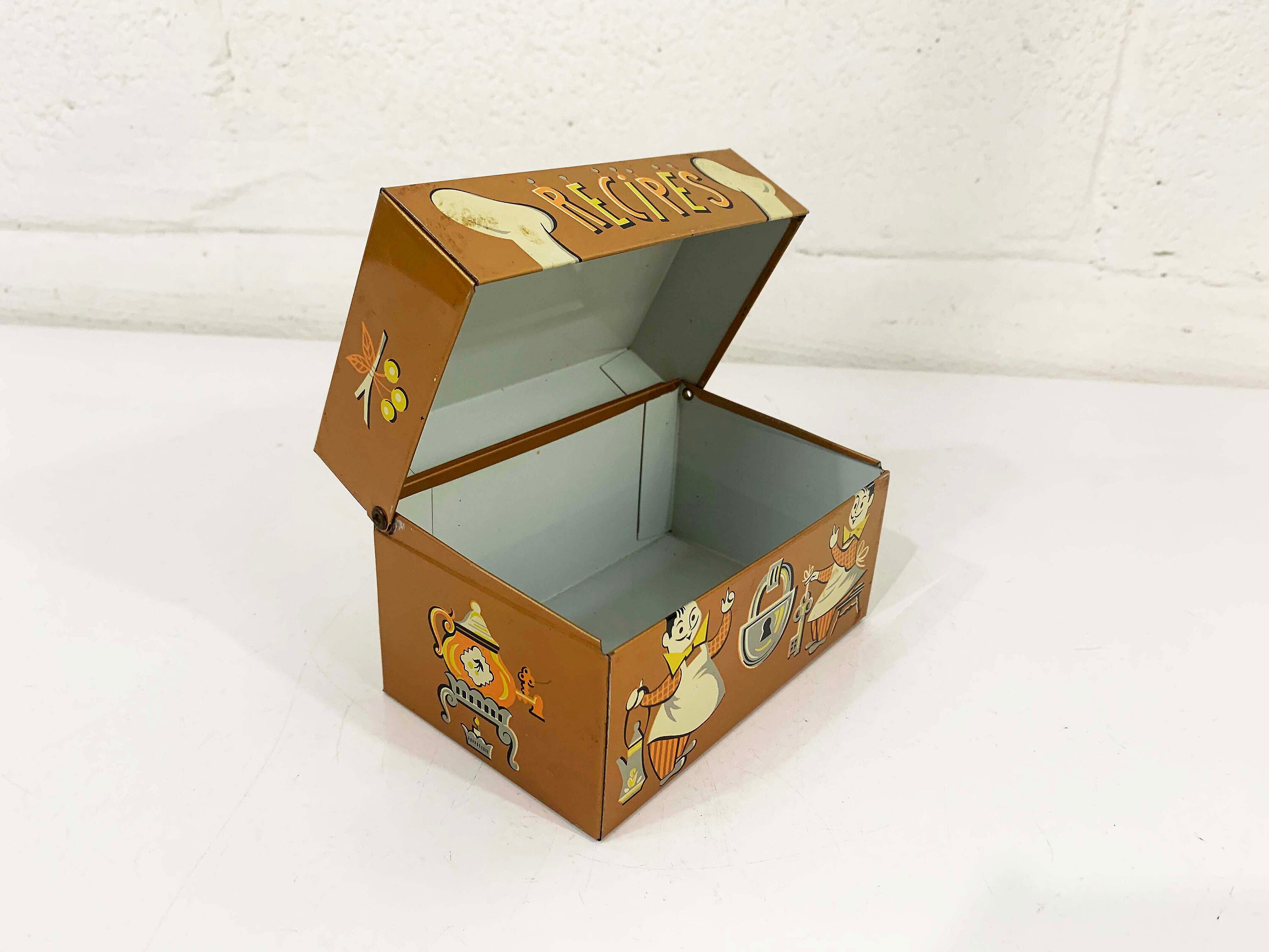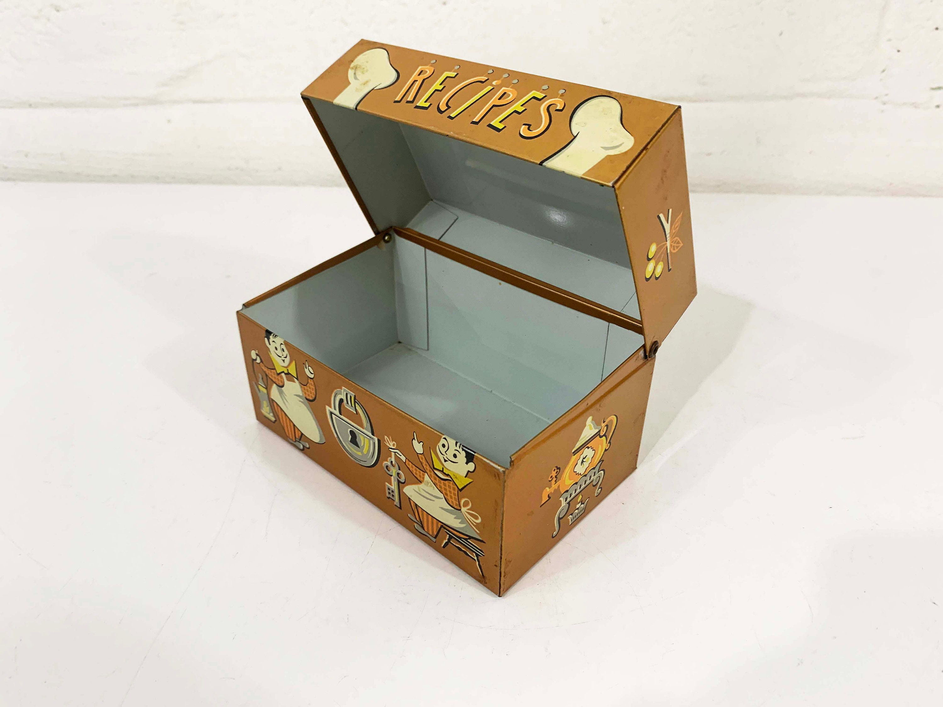 Super adorable metal recipe box in good condition. Would look so cute in your vintage kitchen! It is in excellent condition with no significant flaws. The box is approximately 5 1/4 inches long, 3 1/4 inches wide, and 3 1/2 inches tall.