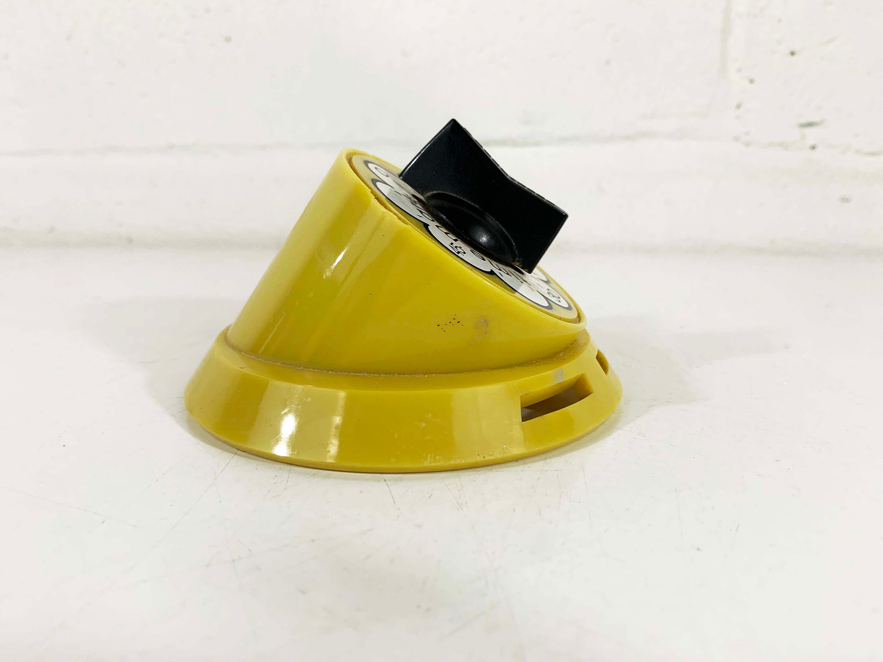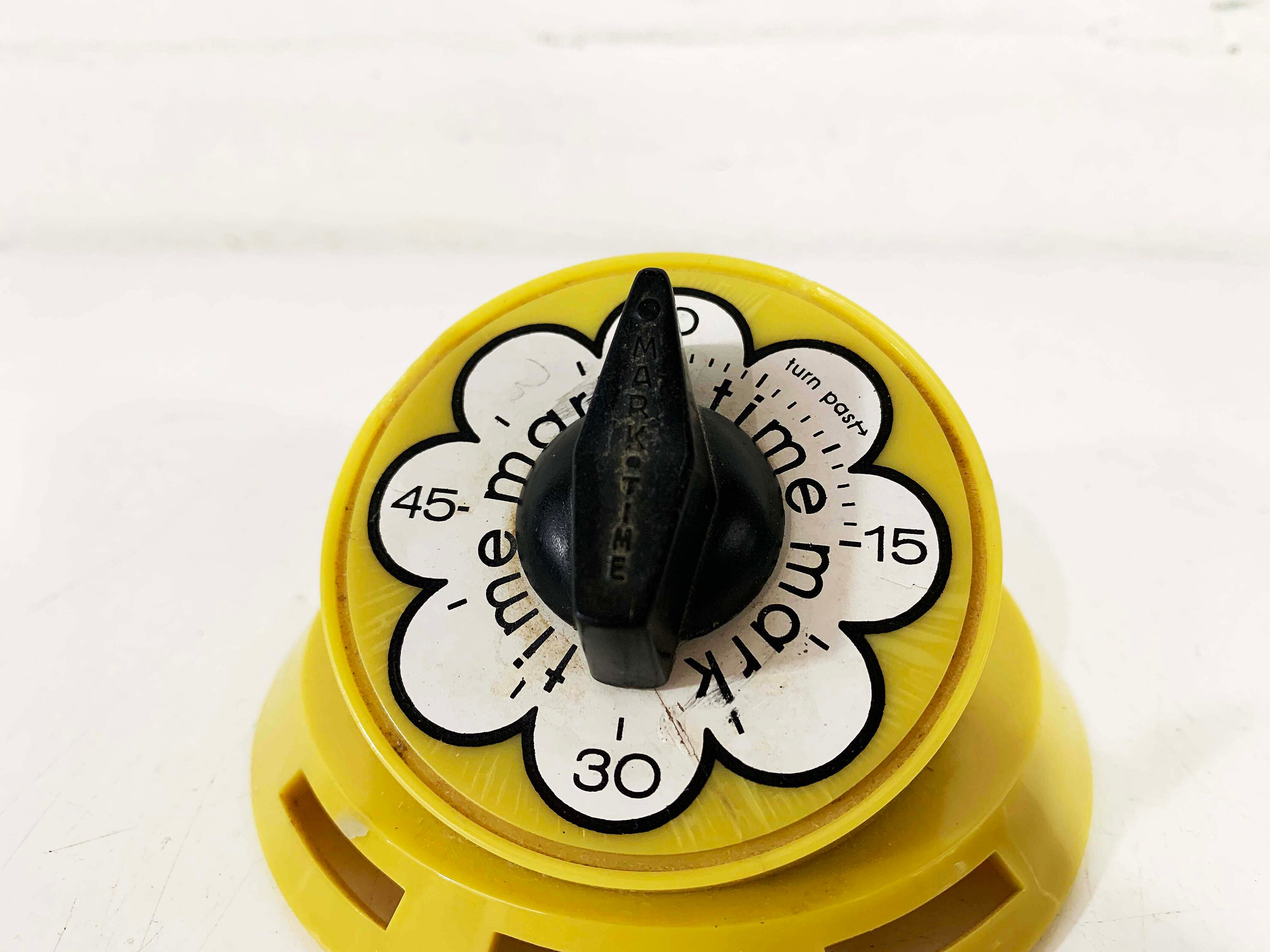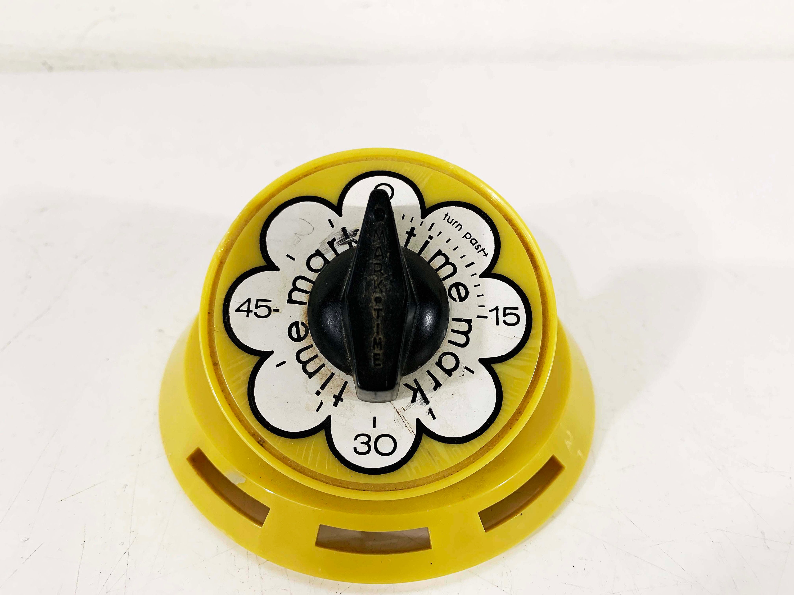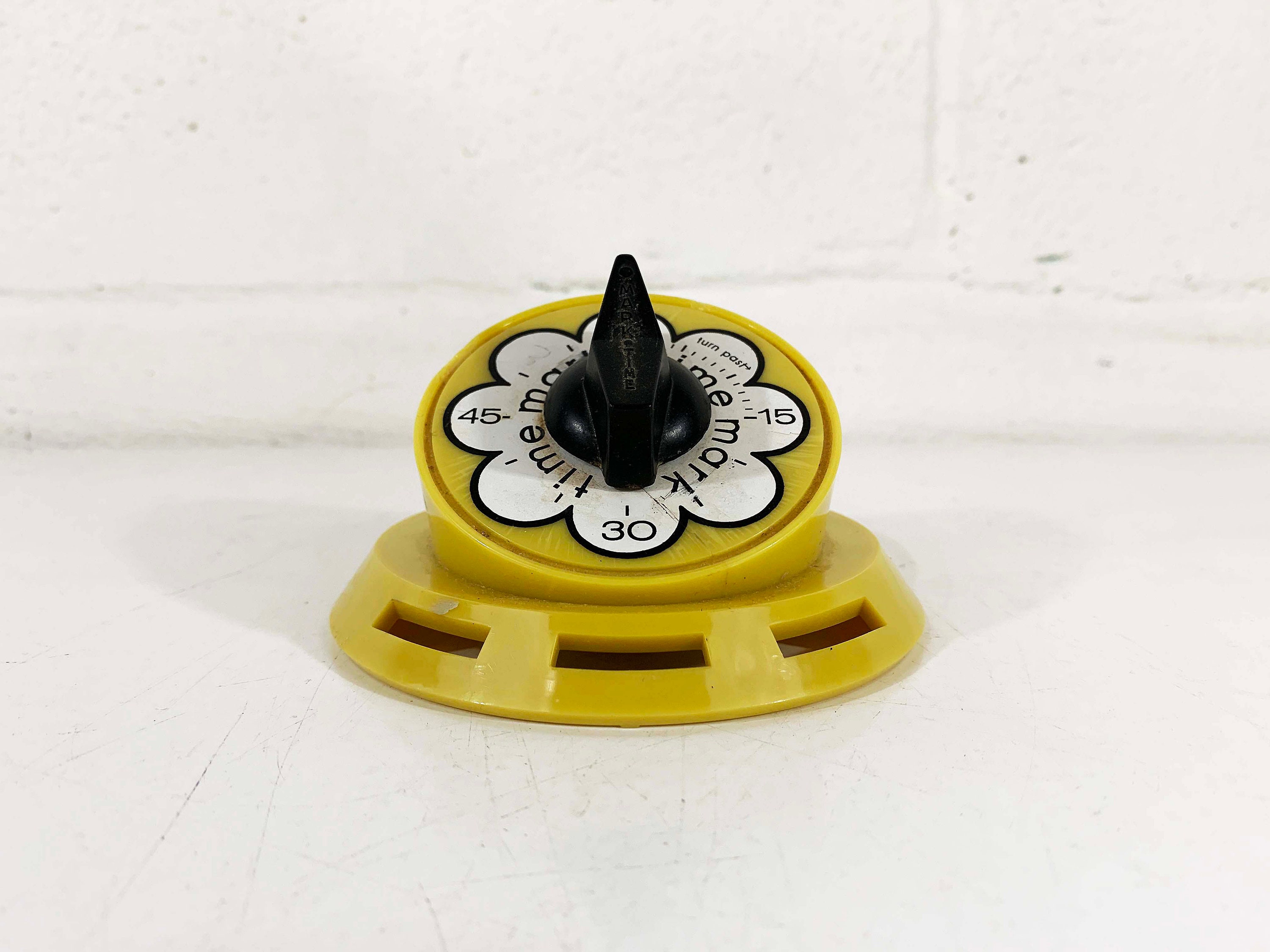 Super cute kitschy kitchen timer from the 70s! The timer is in good condition and the mechanics seem to work properly. Perfect for a vintage-inspired home or kitchen! The timer is approximately 2 1/2 inches tall and 4 1/4 inches wide.
