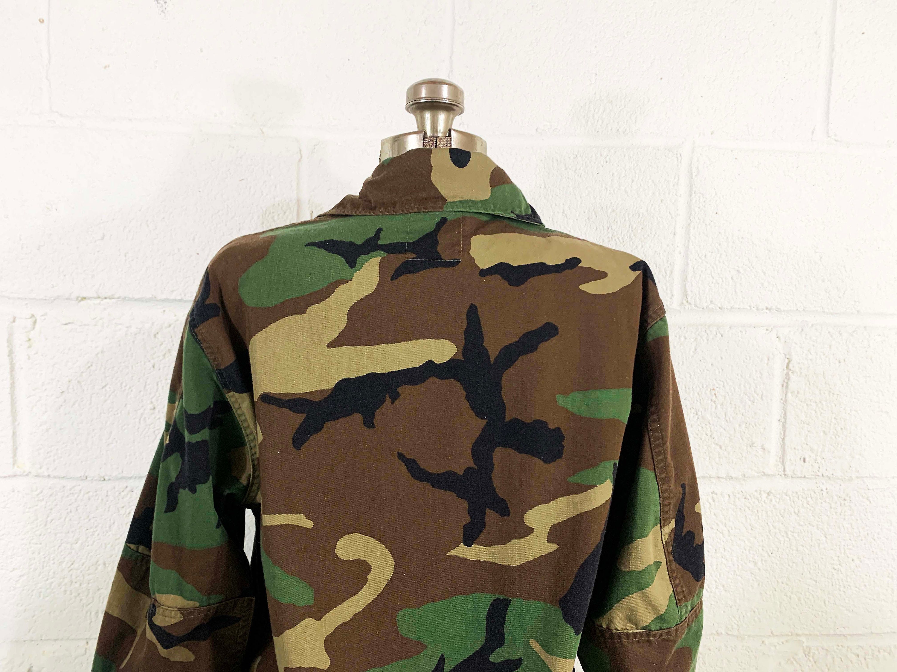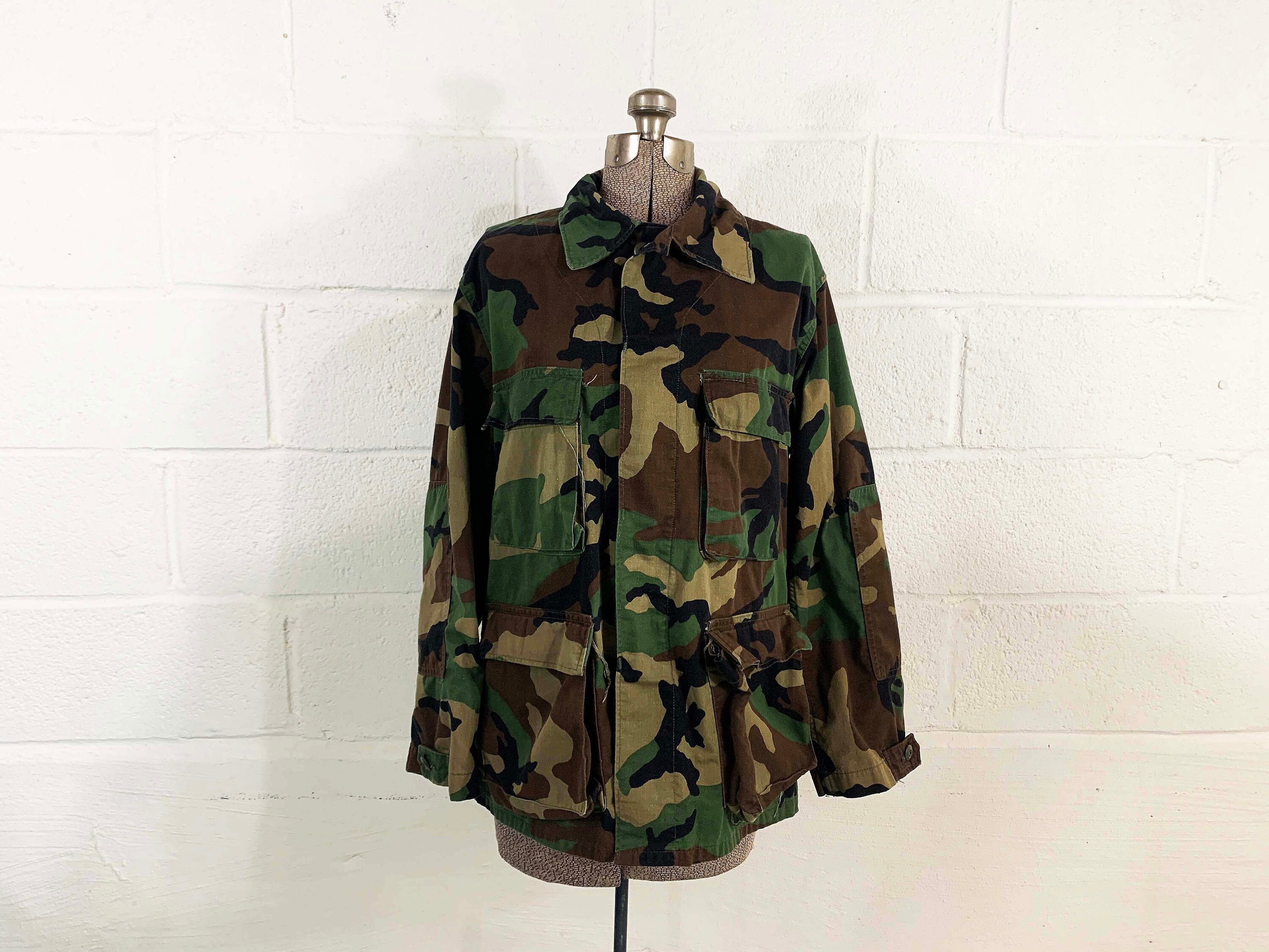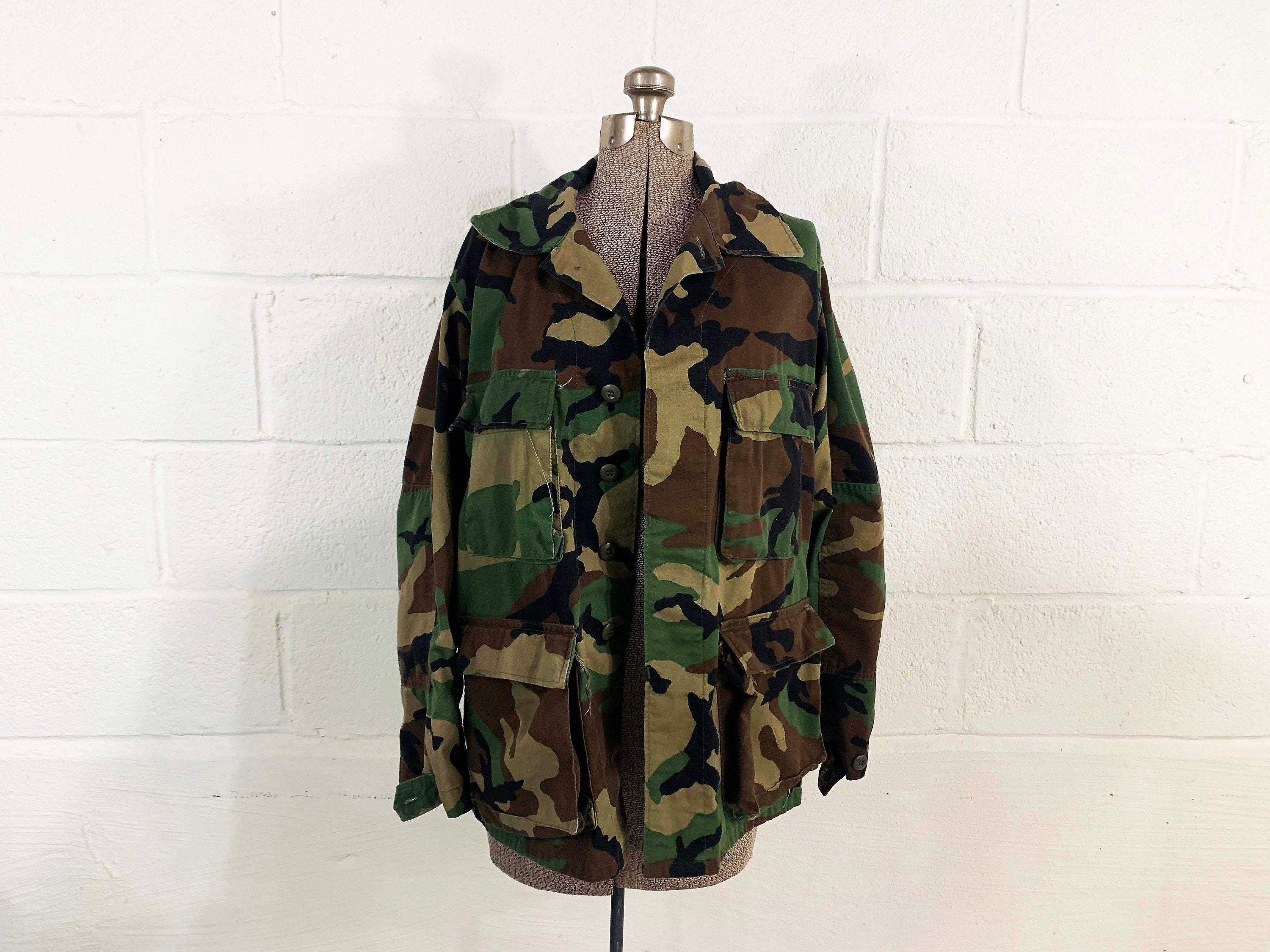 Awesome vintage Army camo canvas jacket. Jacket is in great vintage shape with a couple of loose threads. Button front with a collar. Fabric has NO stretch.
