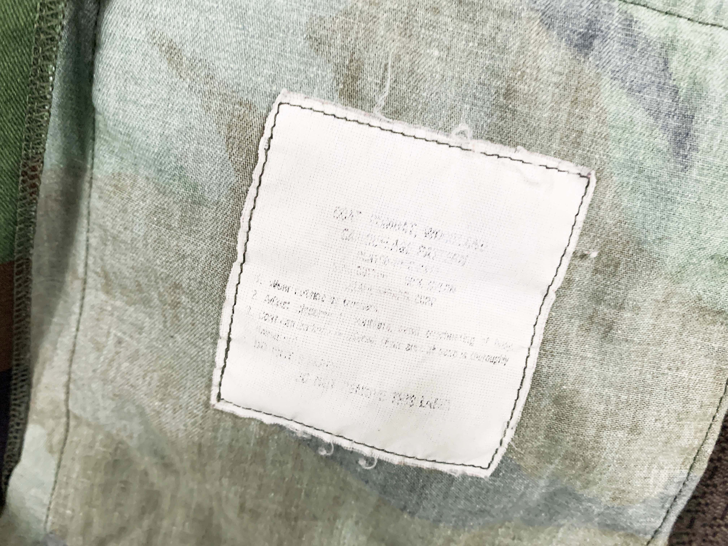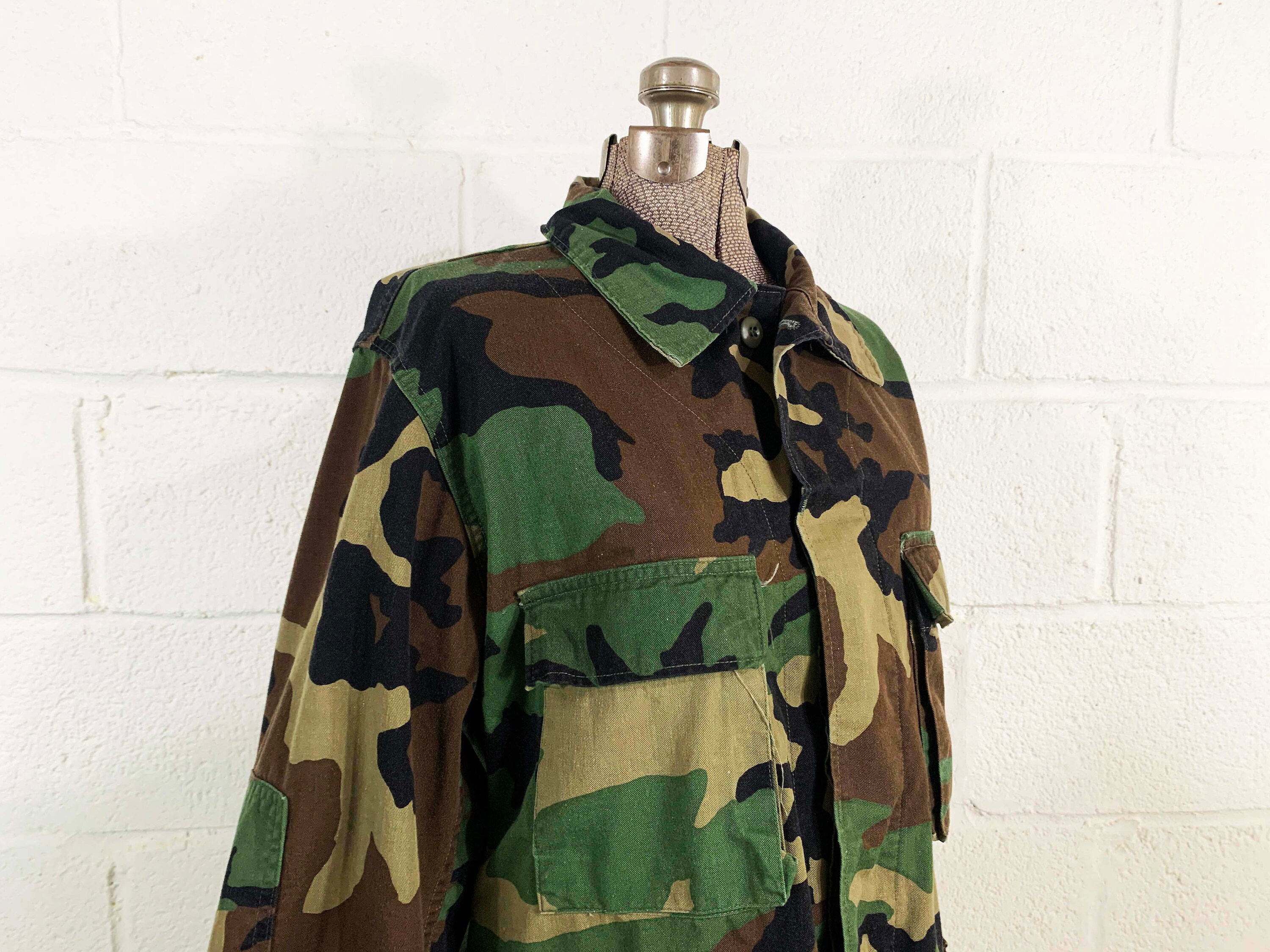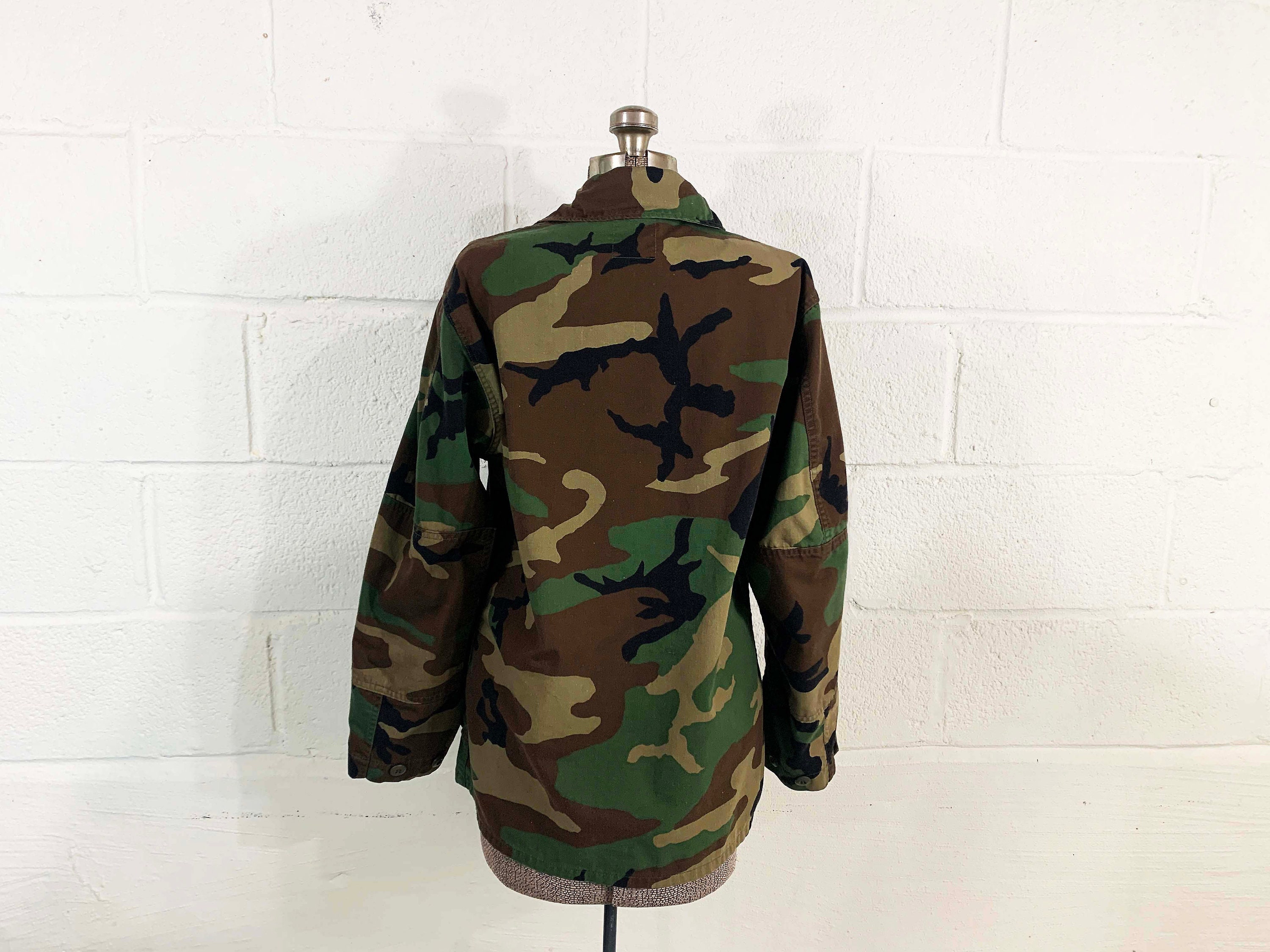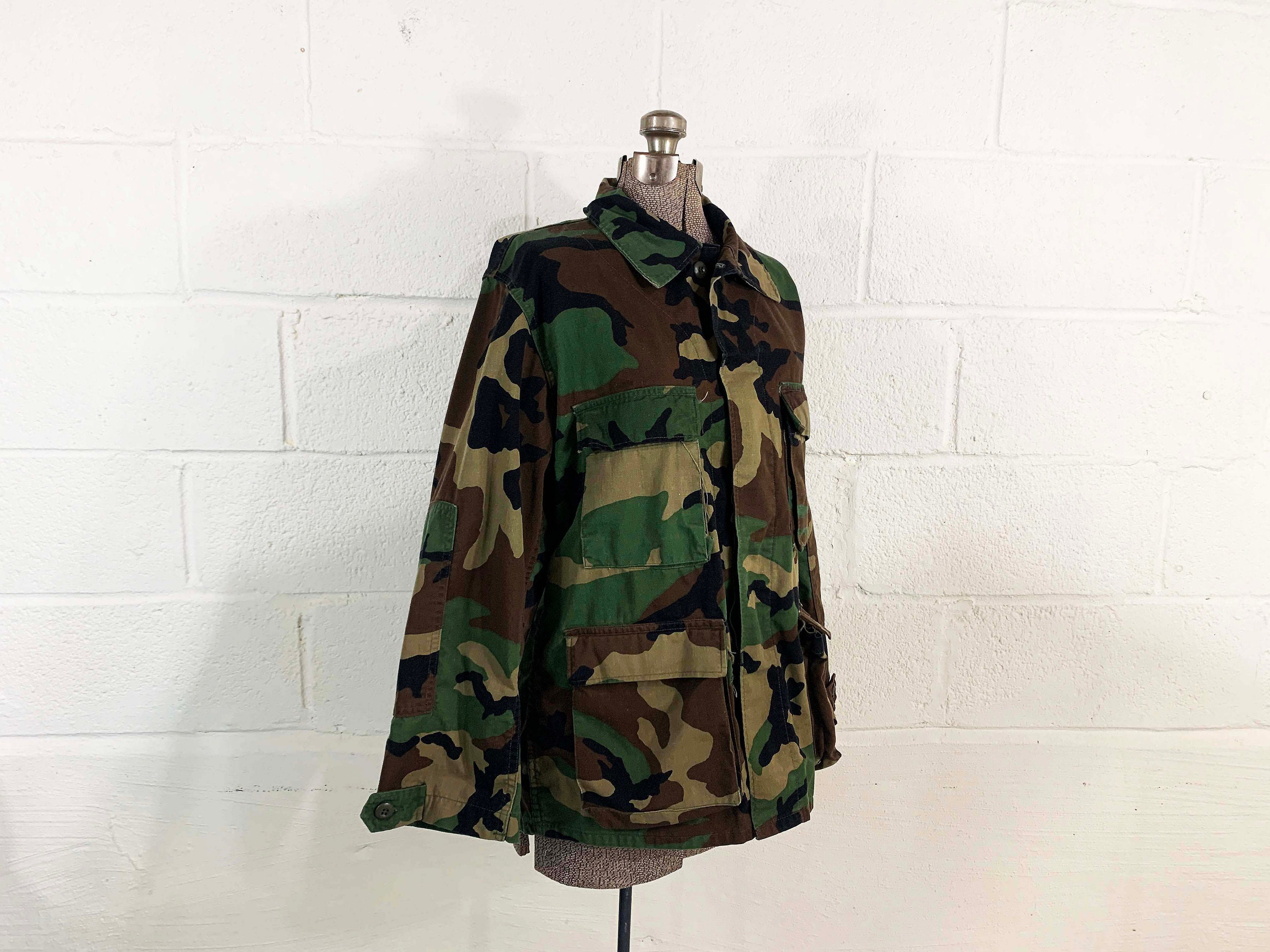 Awesome vintage Army camo canvas jacket. Jacket is in great vintage shape with a couple of loose threads. Button front with a collar. Fabric has NO stretch.