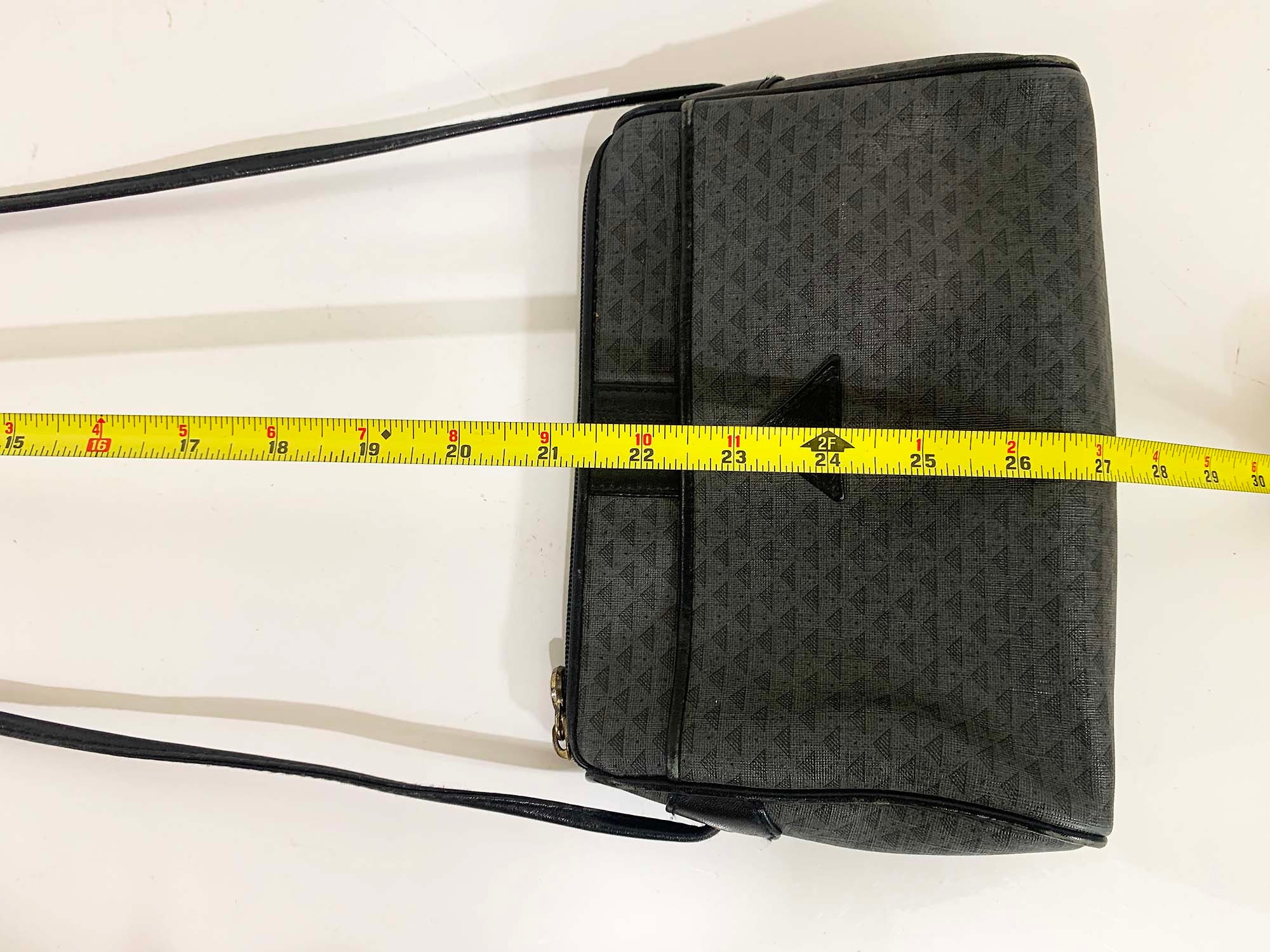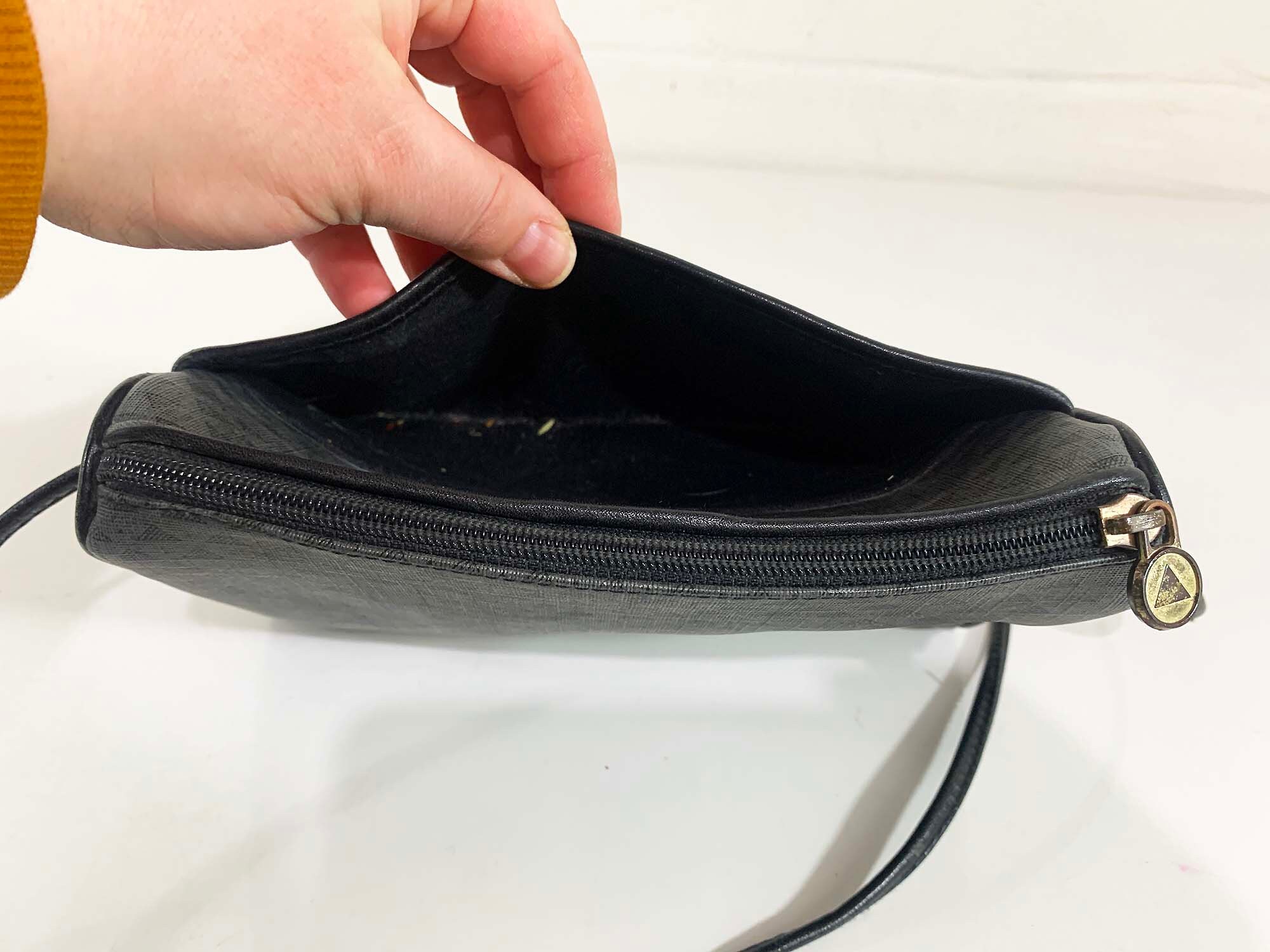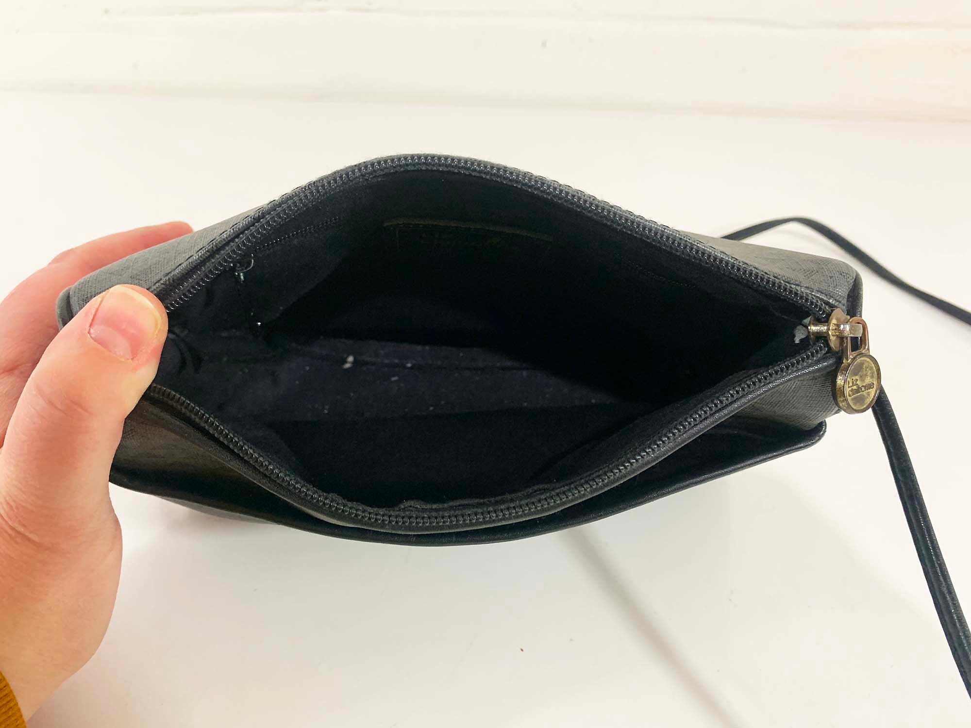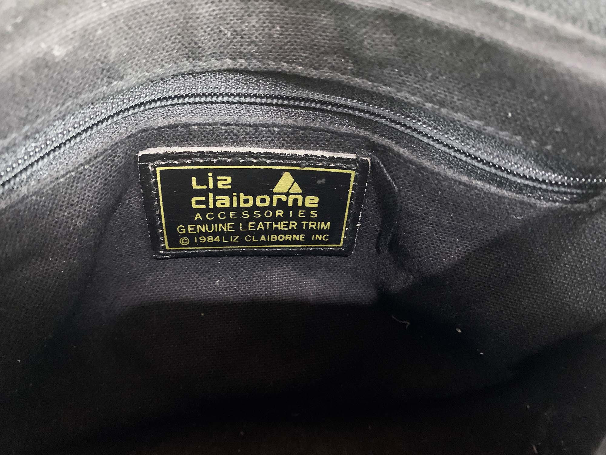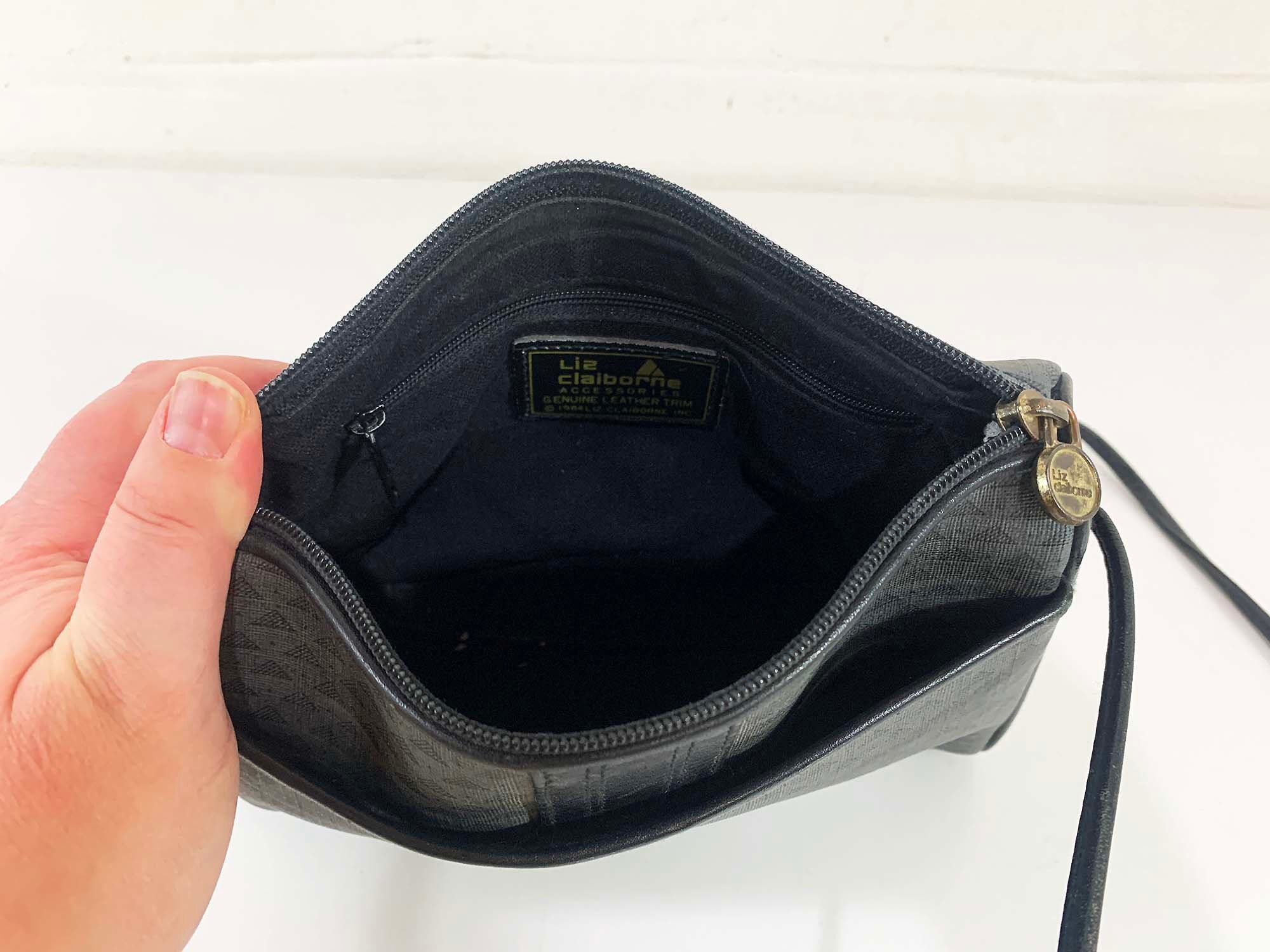 Classic 80s Liz Claiborne crossbody purse! In good vintage condition with some scuffs and a few small scratches. It has a pocket in the front, and a zipper pocket on the inside. There is a zipper closure at the top. When the purse is closed its approximately 9 inches wide and 6 inches tall. The strap is approximately 21 inches from the shoulder to the top of the purse.