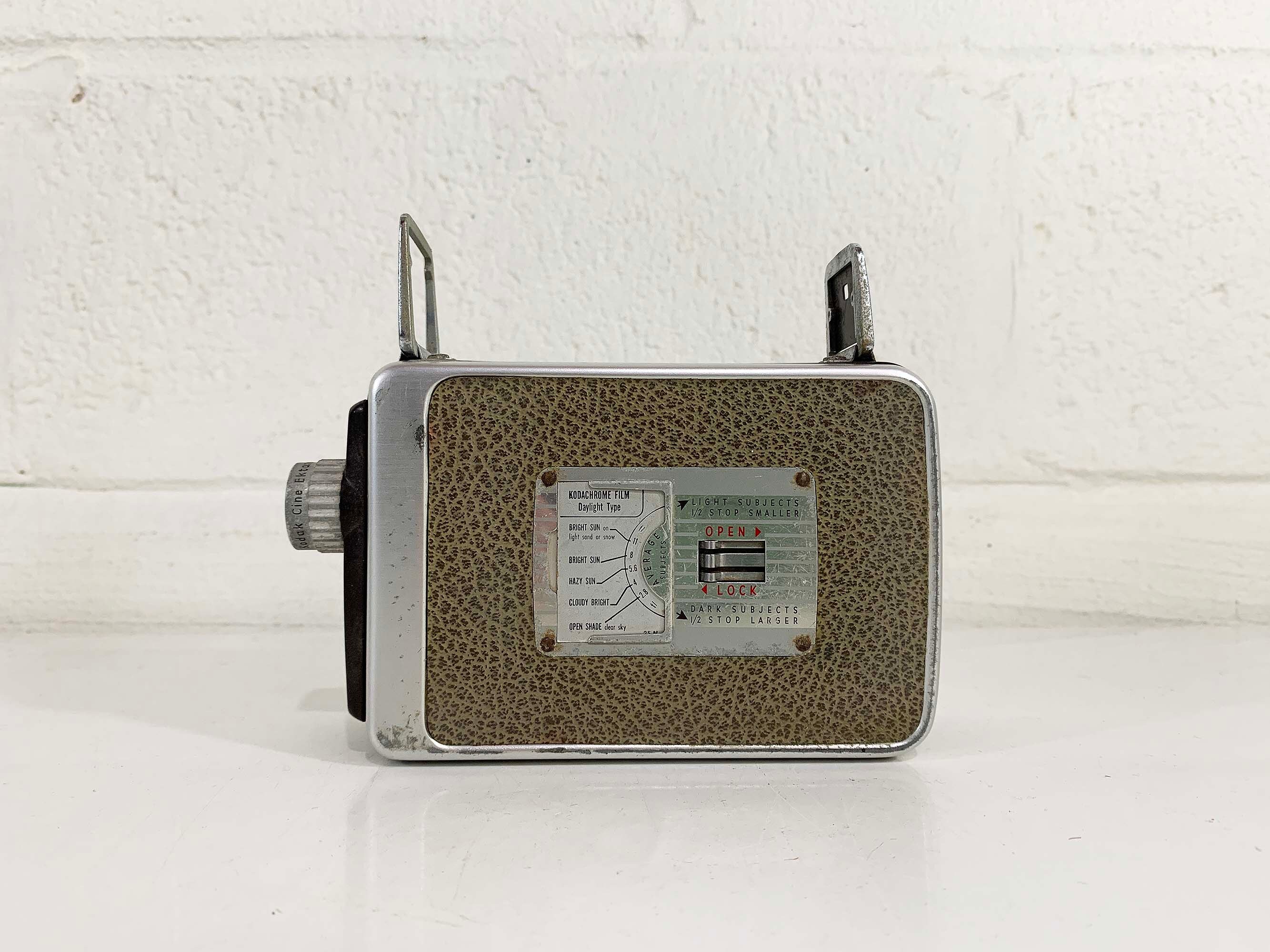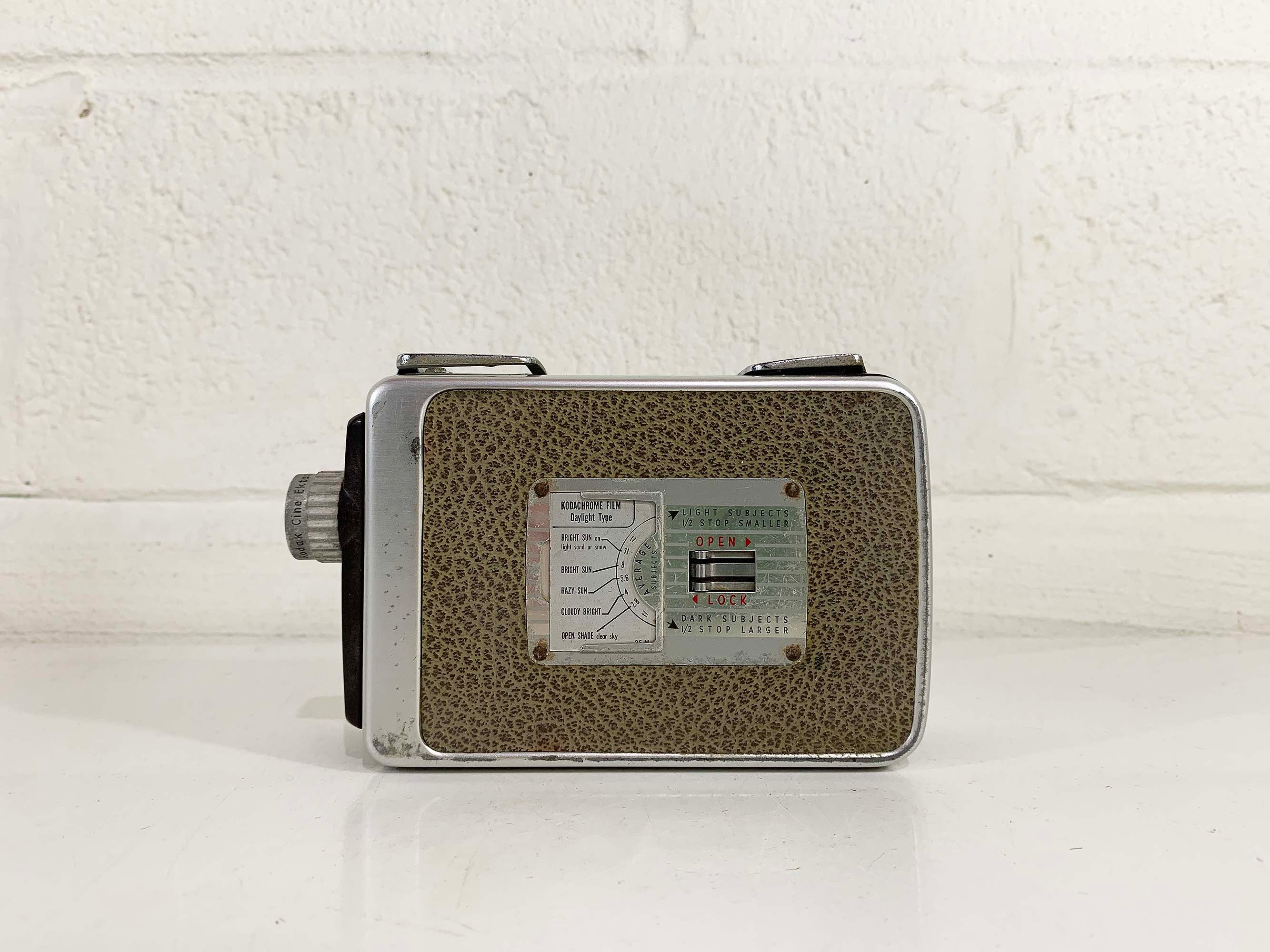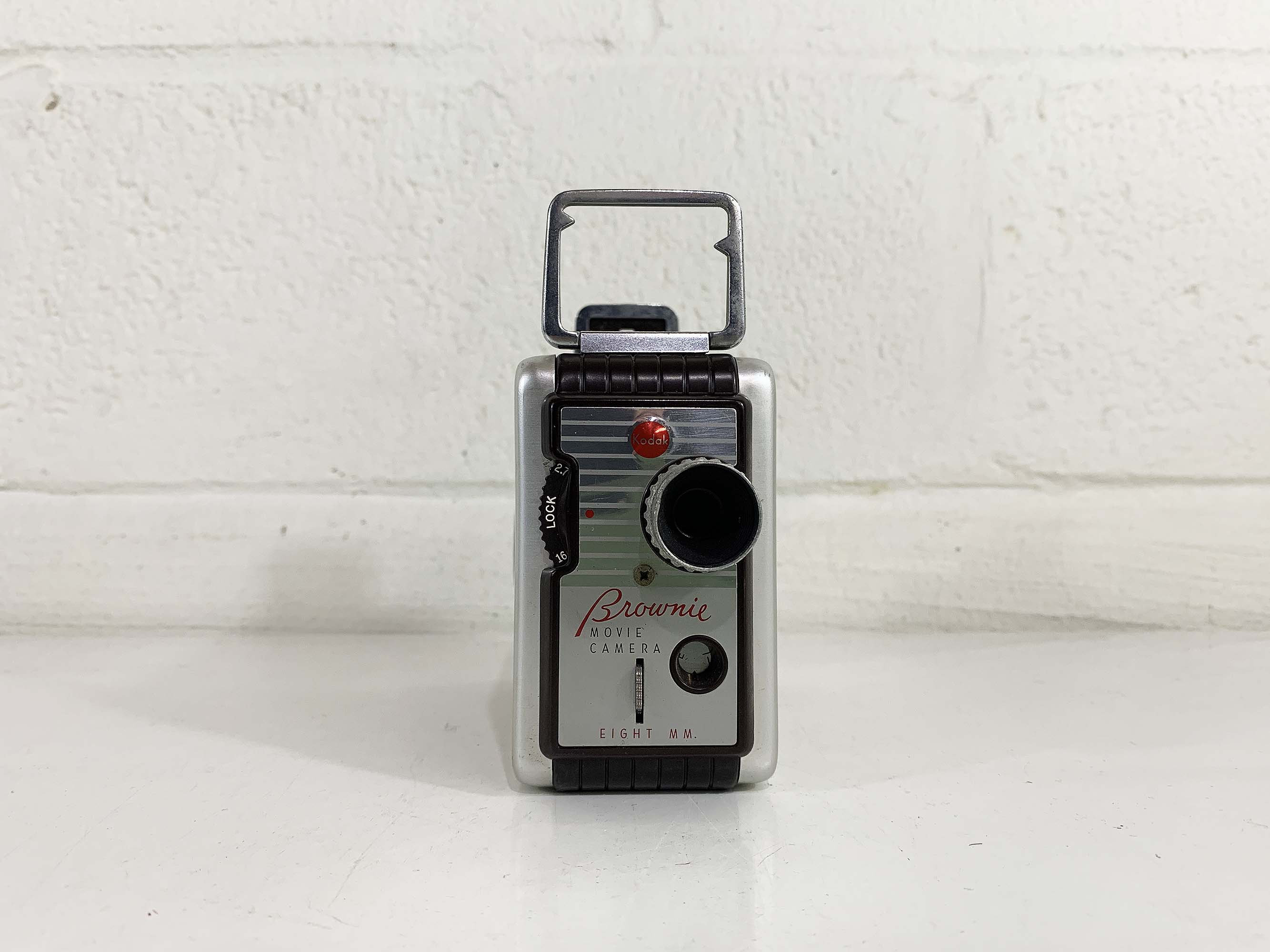 Cute Kodak Brownie 8mm movie camera. A great way to add vintage flair to your home on a bookcase or shelf! It's in good vintage condition with some light all over scuffs and scrapes. I cannot guarantee that the camera works but it would make an excellent display piece! I wasn't able to open the camera so I'm not sure what it looks like inside.