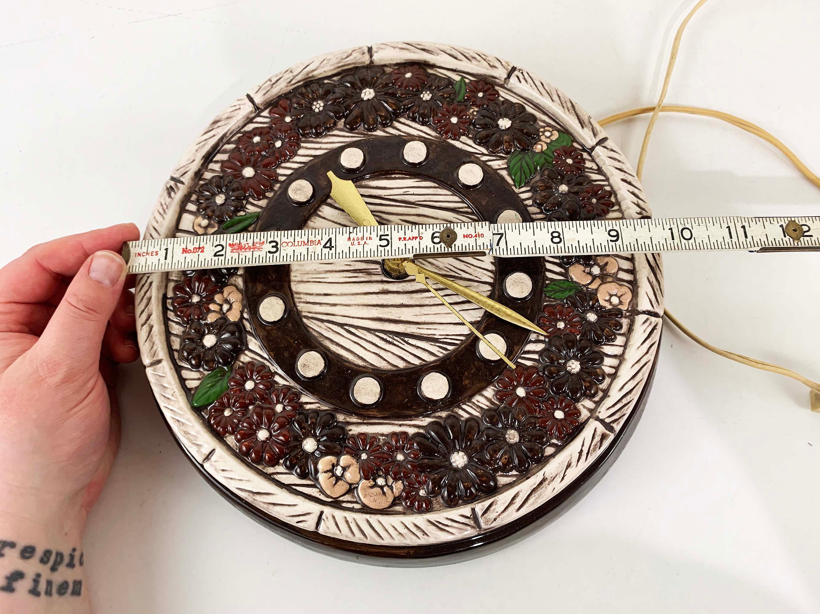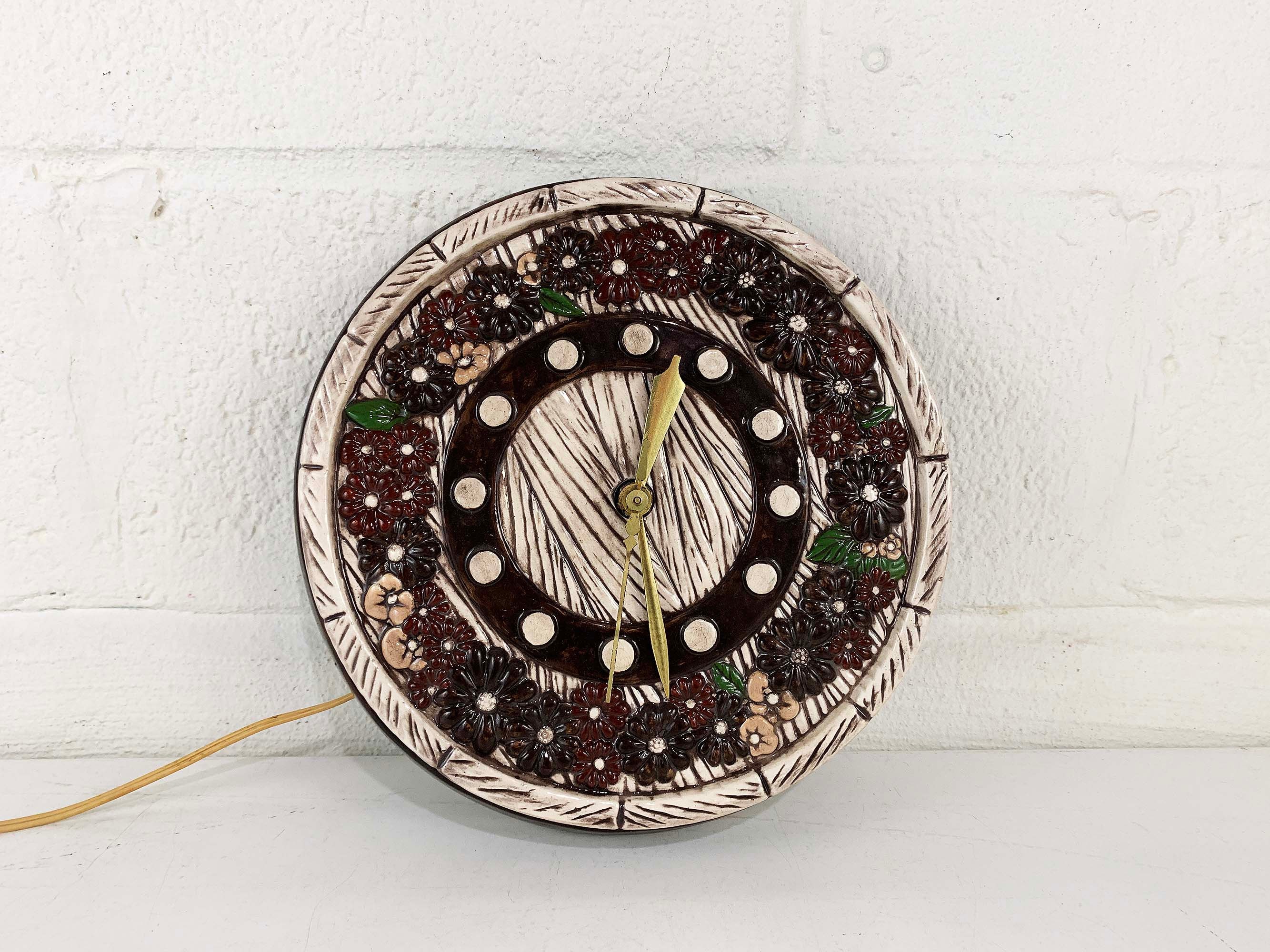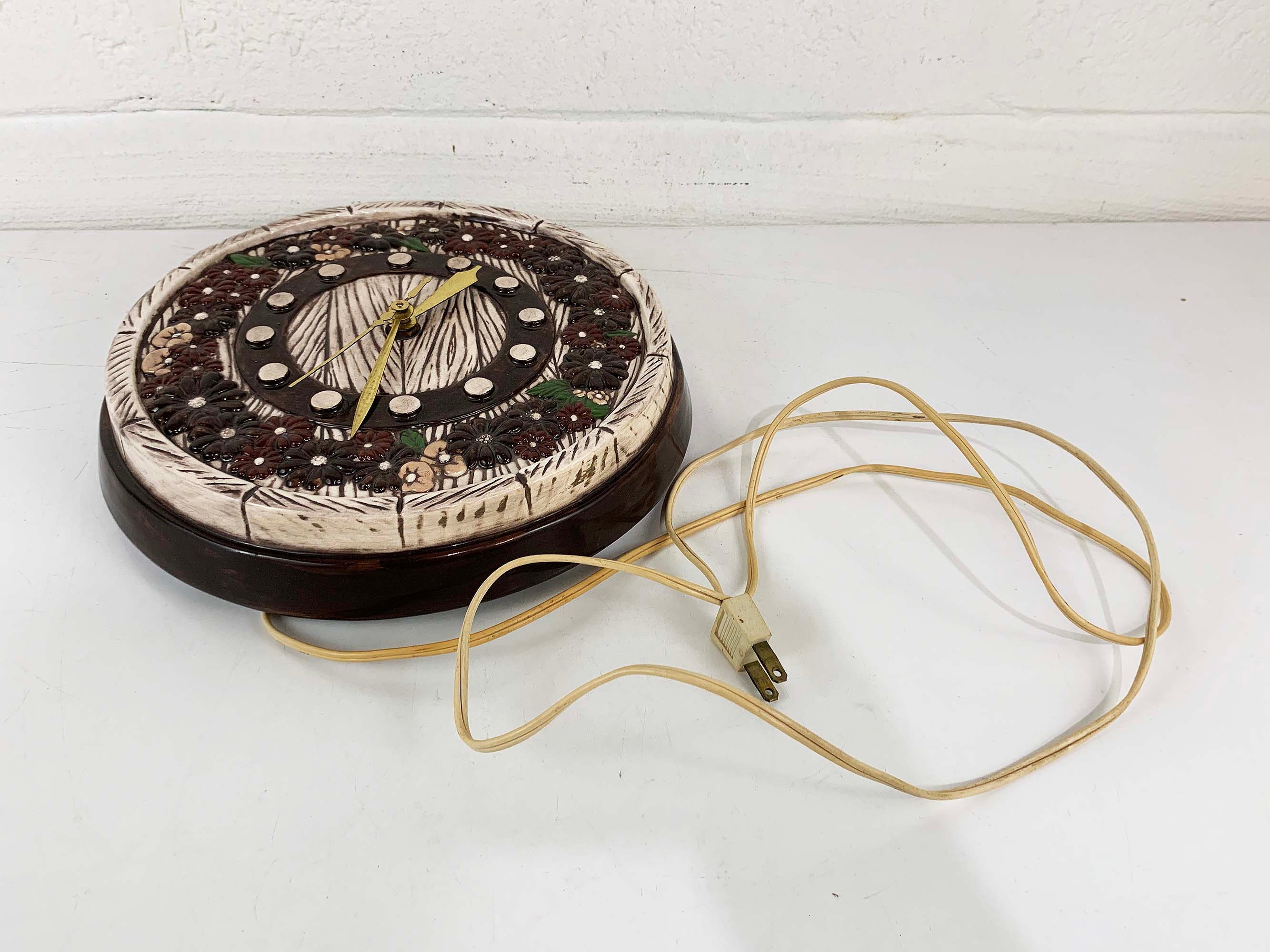 Super cute kitschy floral round ceramic wall clock. It plugs into the wall for power. Not sure if it keeps time properly but the hands do move. Perfect for a vintage-inspired home or kitchen! The wall clock is approximately 9 1/2 inches in diameter.
