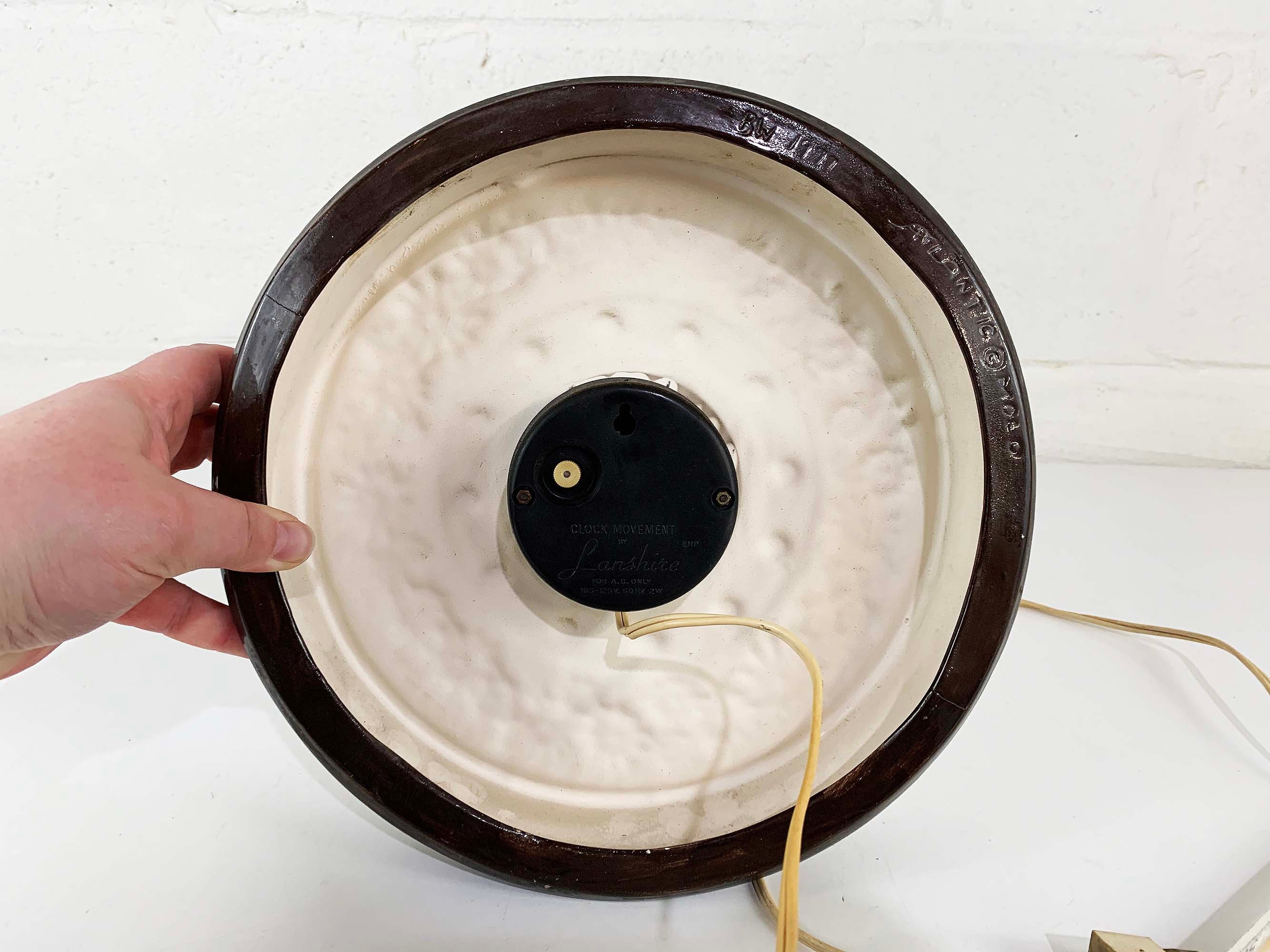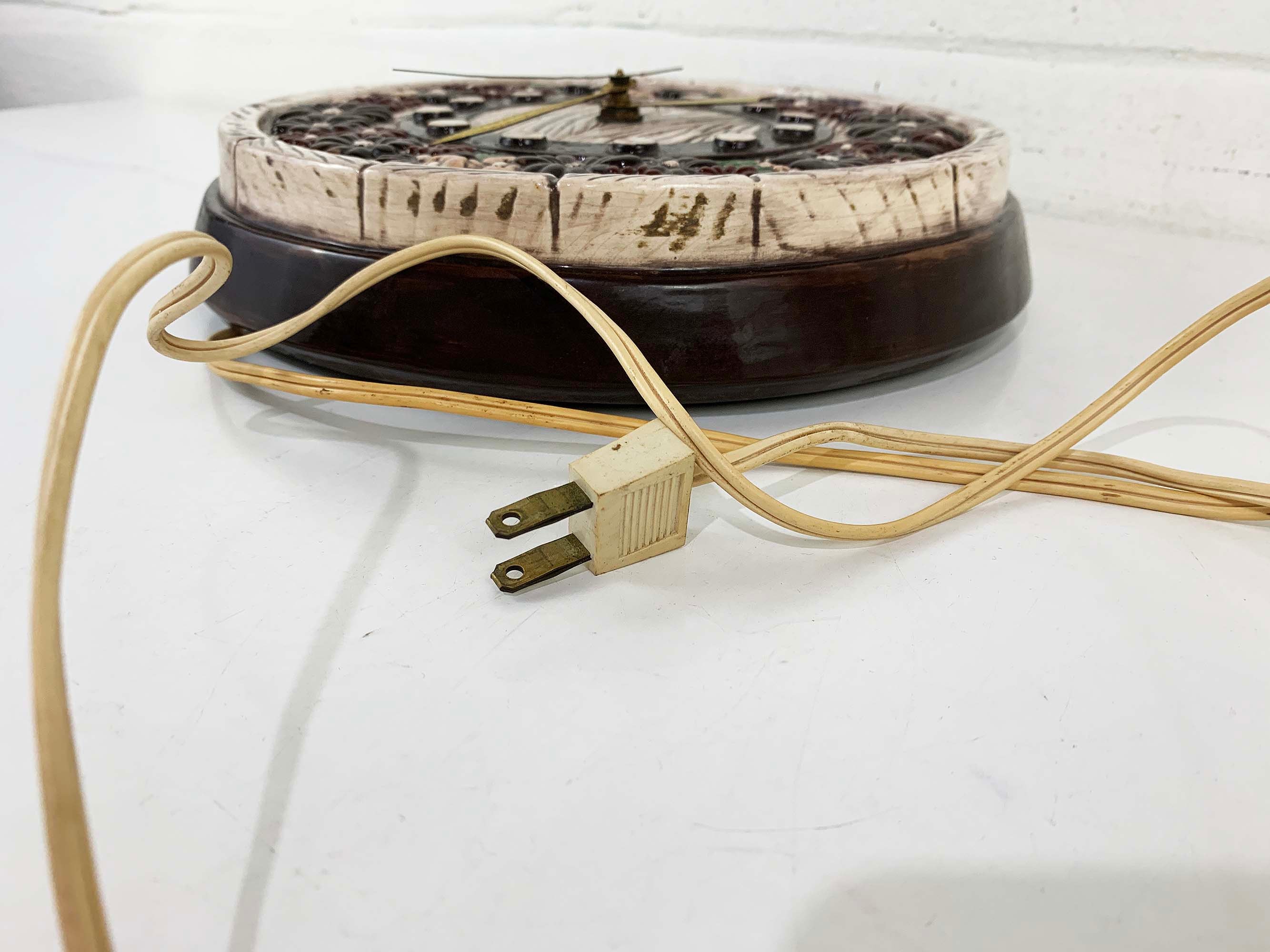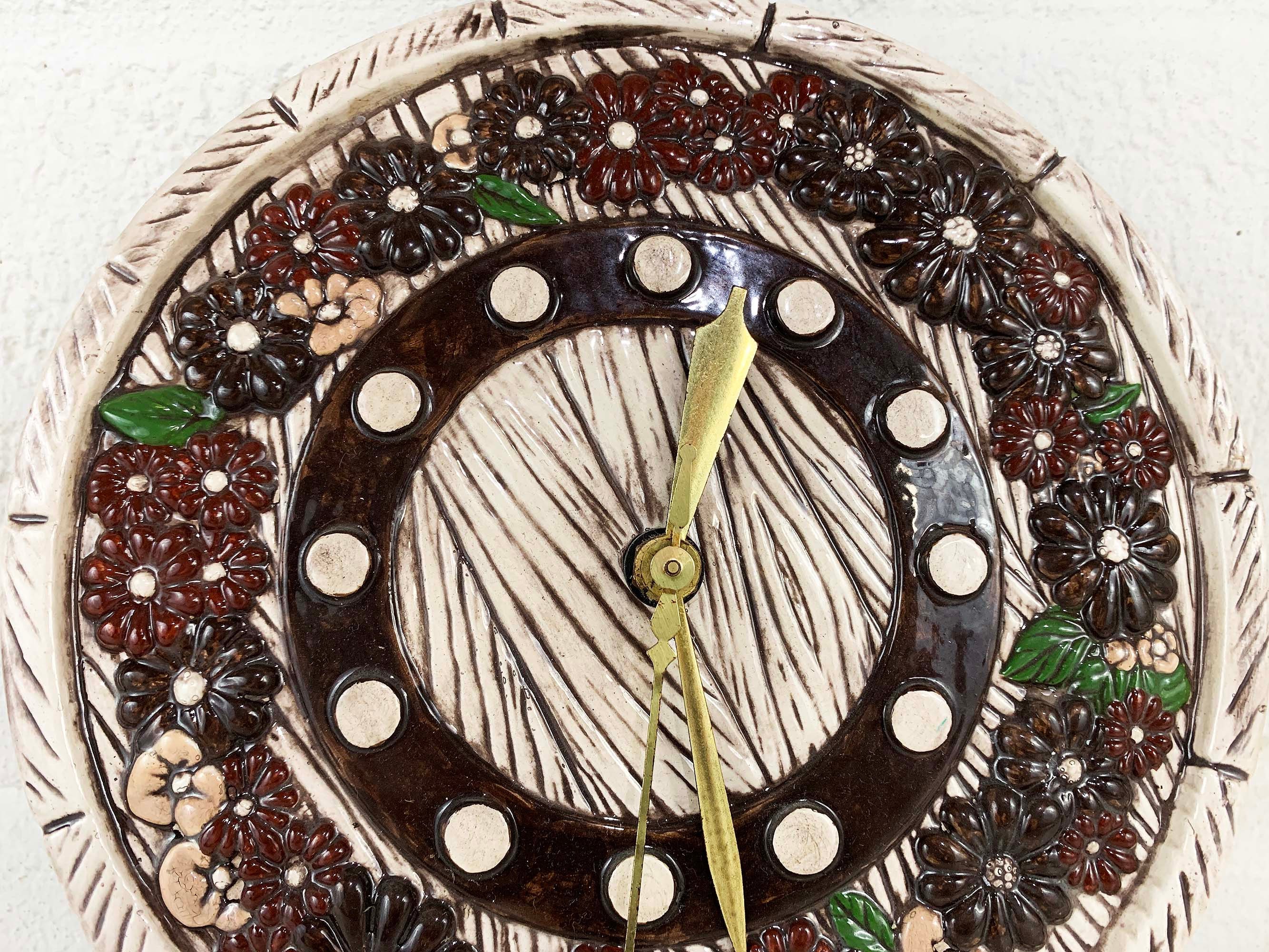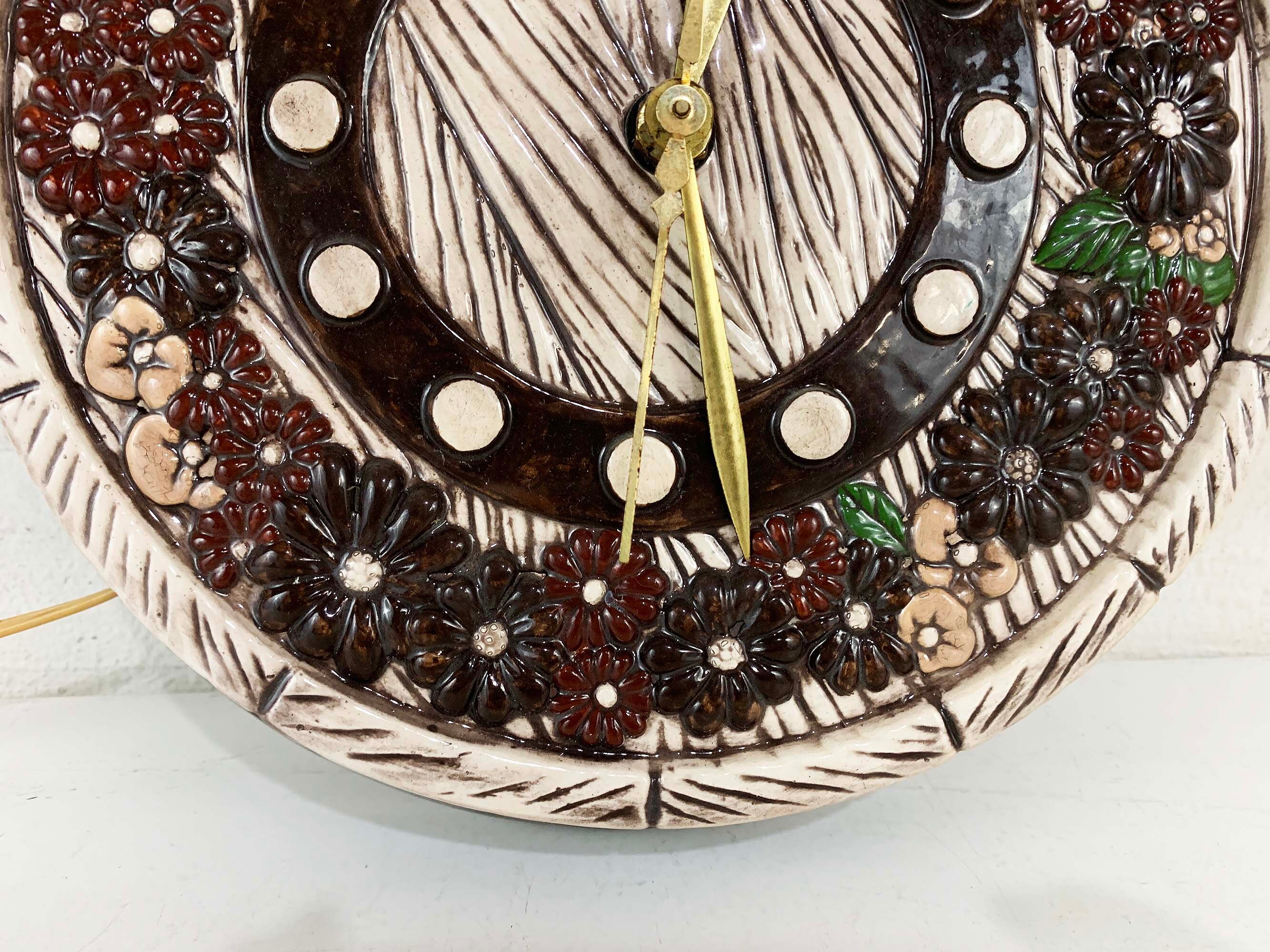 Super cute kitschy floral round ceramic wall clock. It plugs into the wall for power. Not sure if it keeps time properly but the hands do move. Perfect for a vintage-inspired home or kitchen! The wall clock is approximately 9 1/2 inches in diameter.