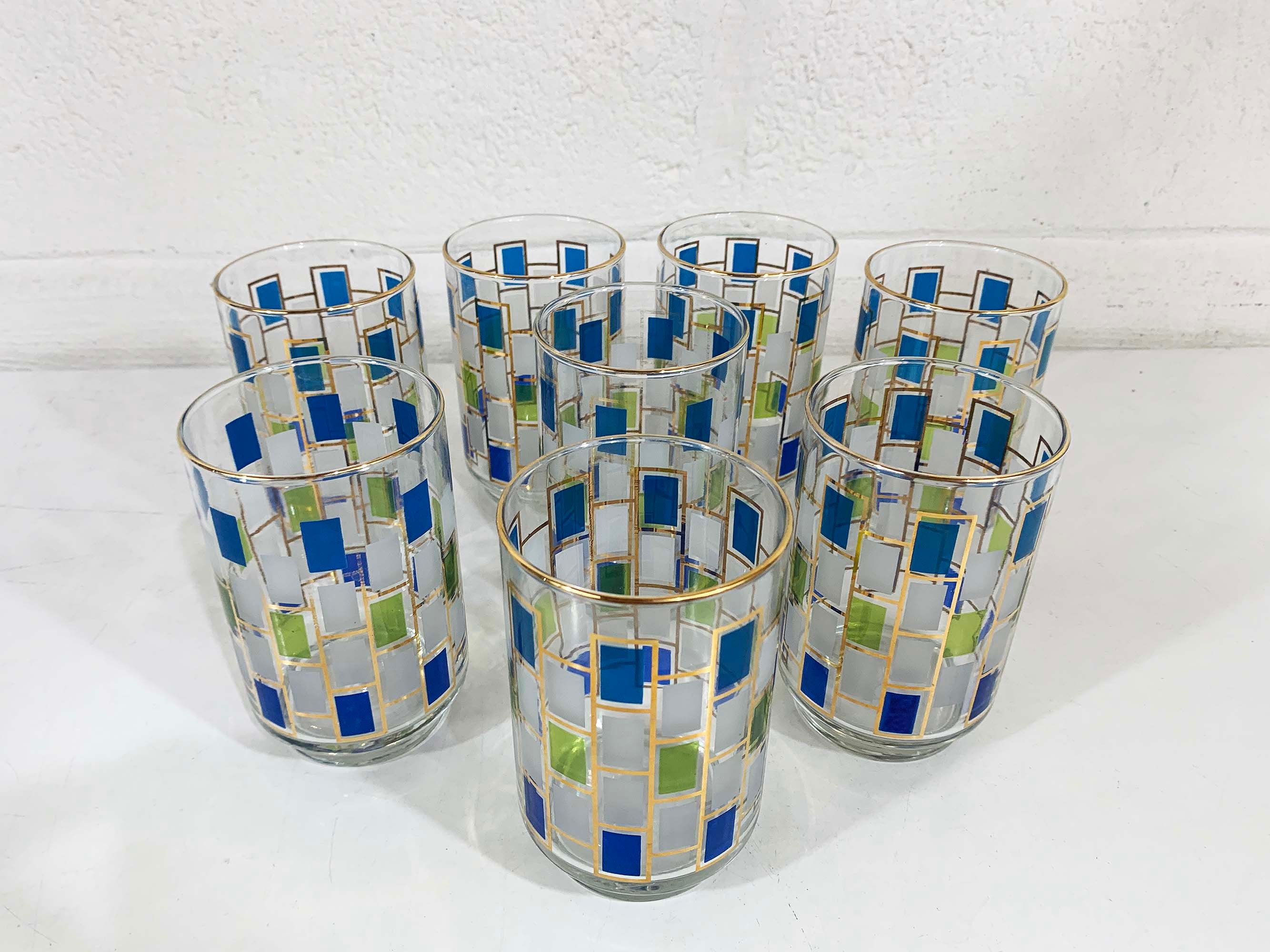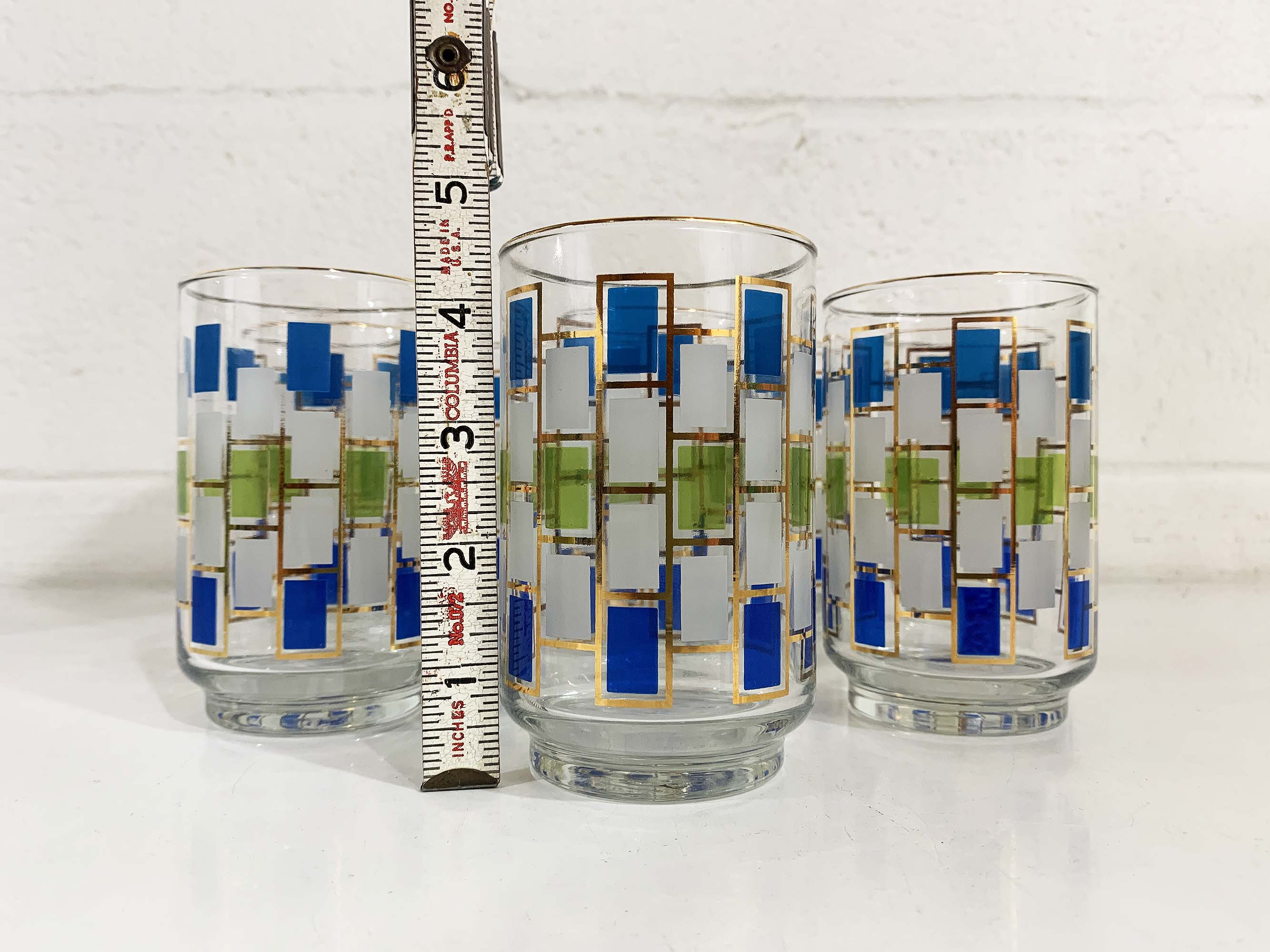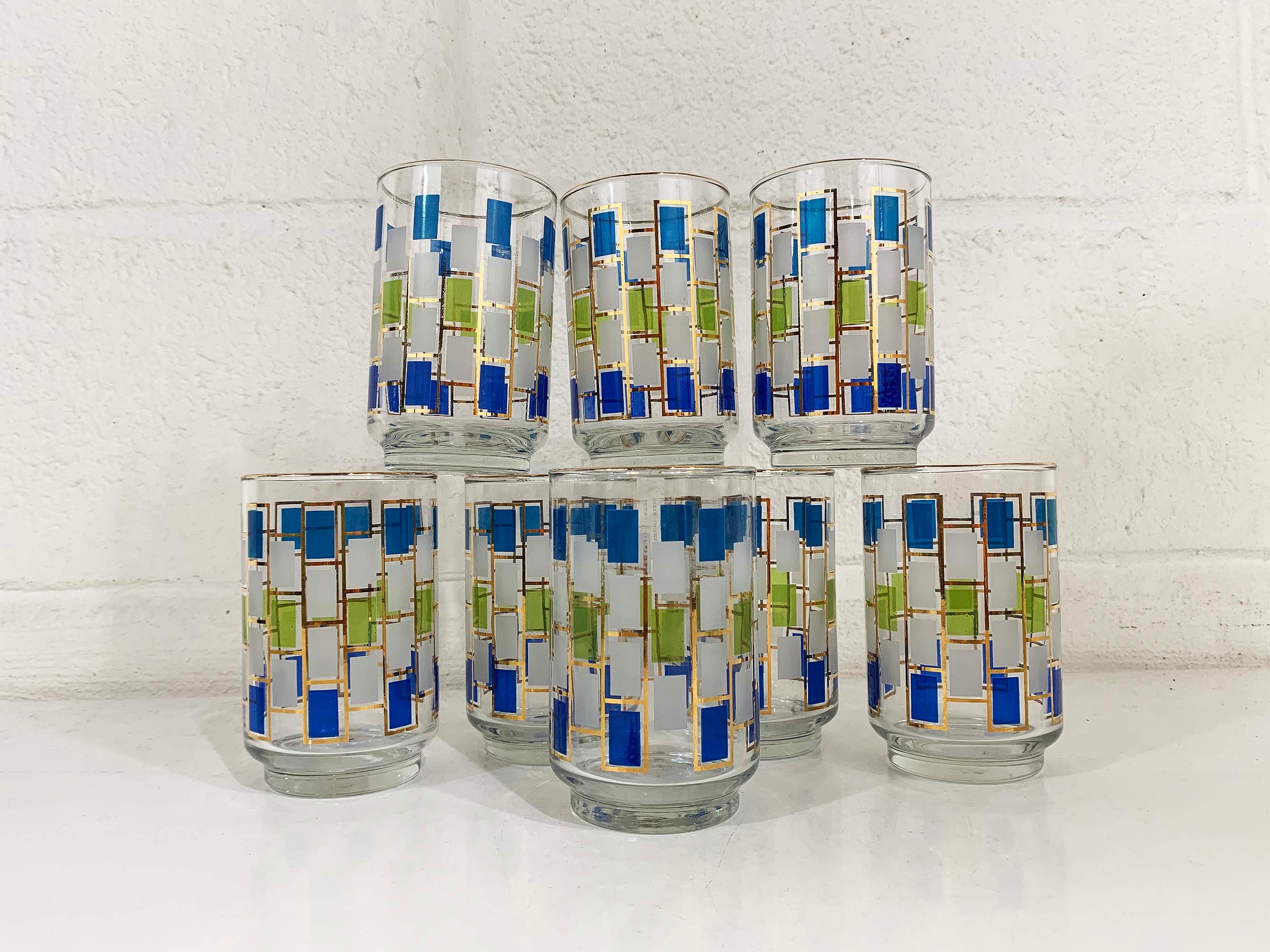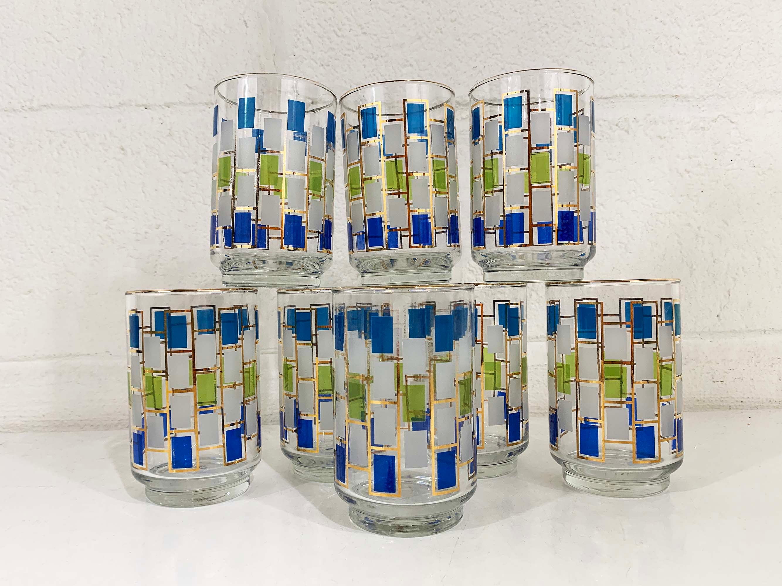 Vintage set of 8 geometric pattern green, blue, and gold glasses. Perfect addition to any bar or vintage kitchen! All are in good vintage condition - the gold paint has come off in some areas on a few of the glasses - please be sure to inspect all photos. Each glass is 5 1/2 inches tall and 2 3/4 inches in diameter at the top. They each hold approximately 12 ounces of liquid when filled to the brim.