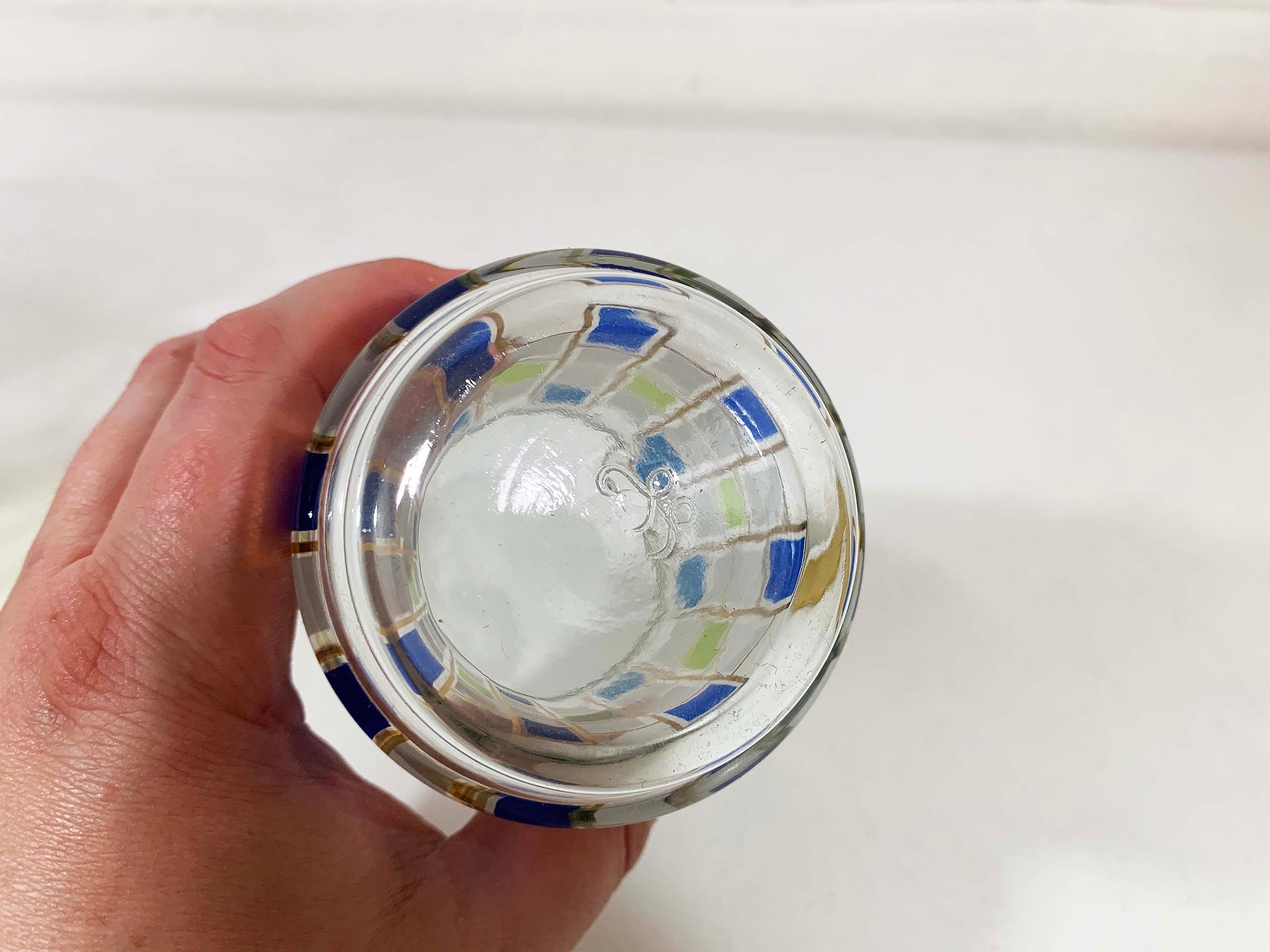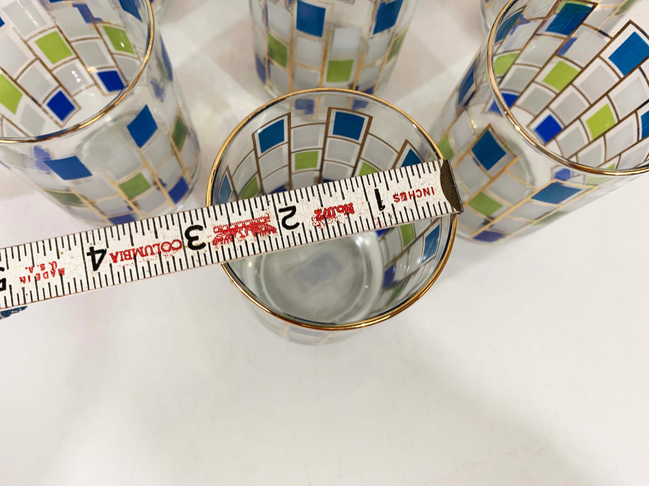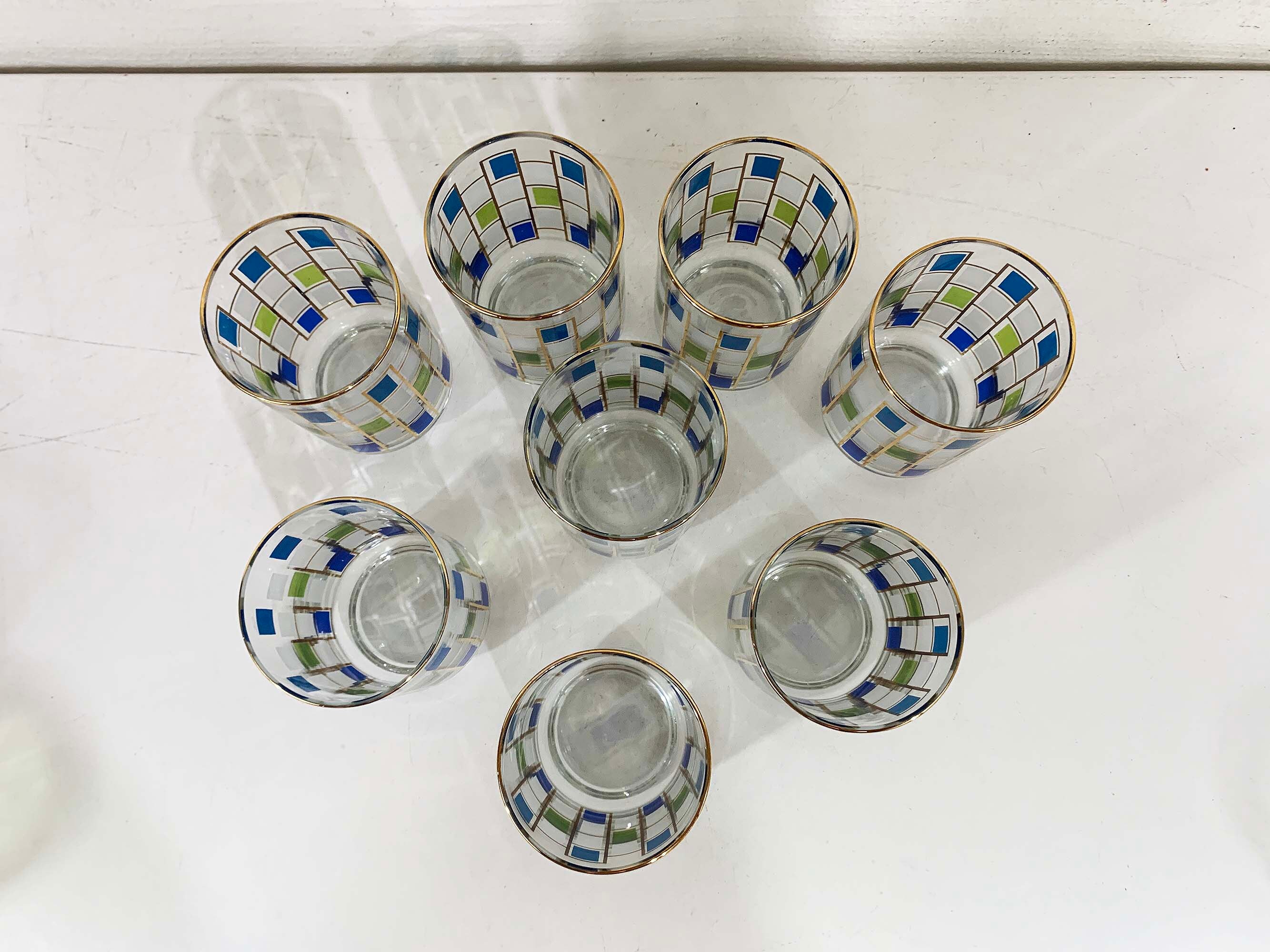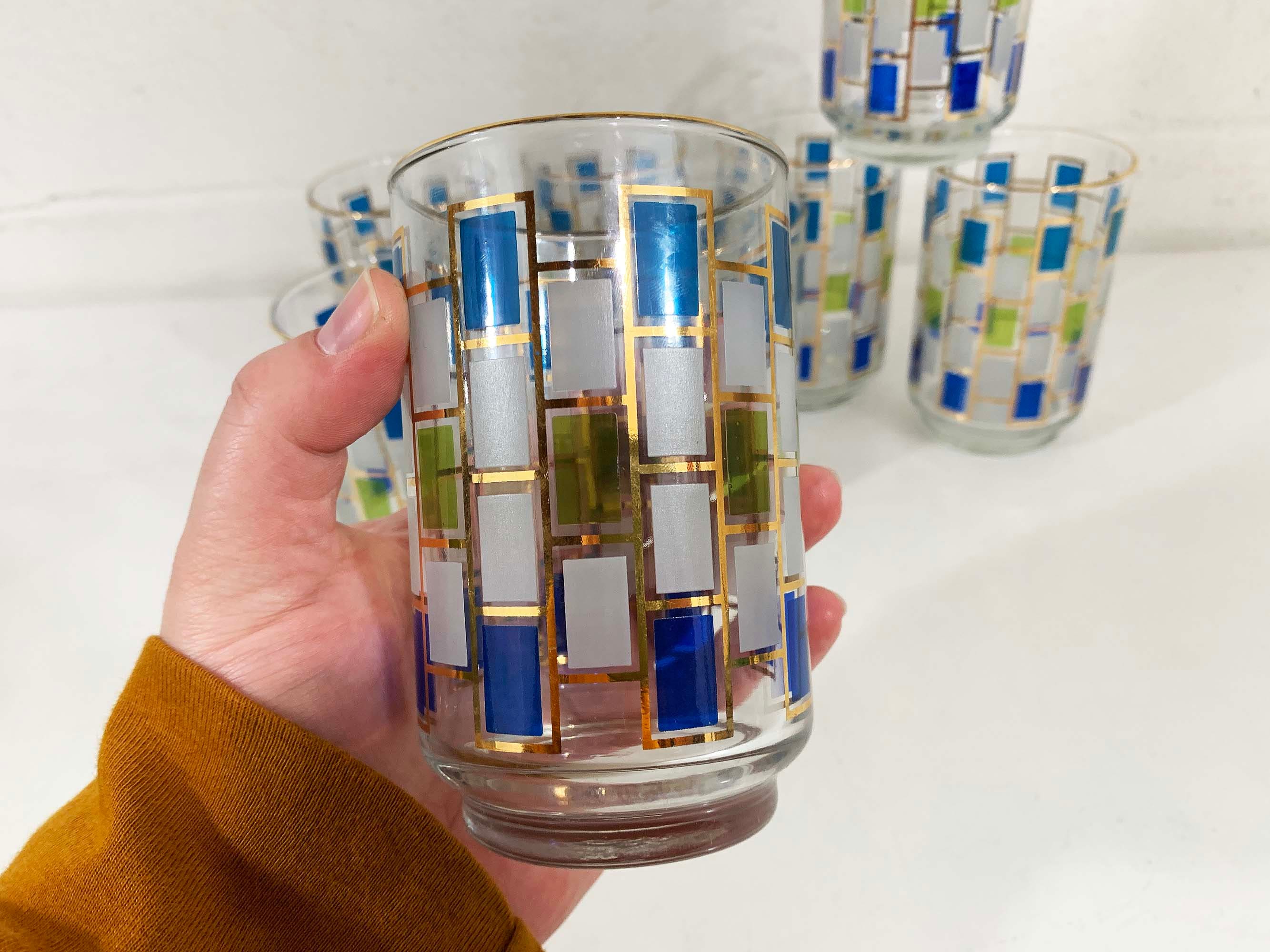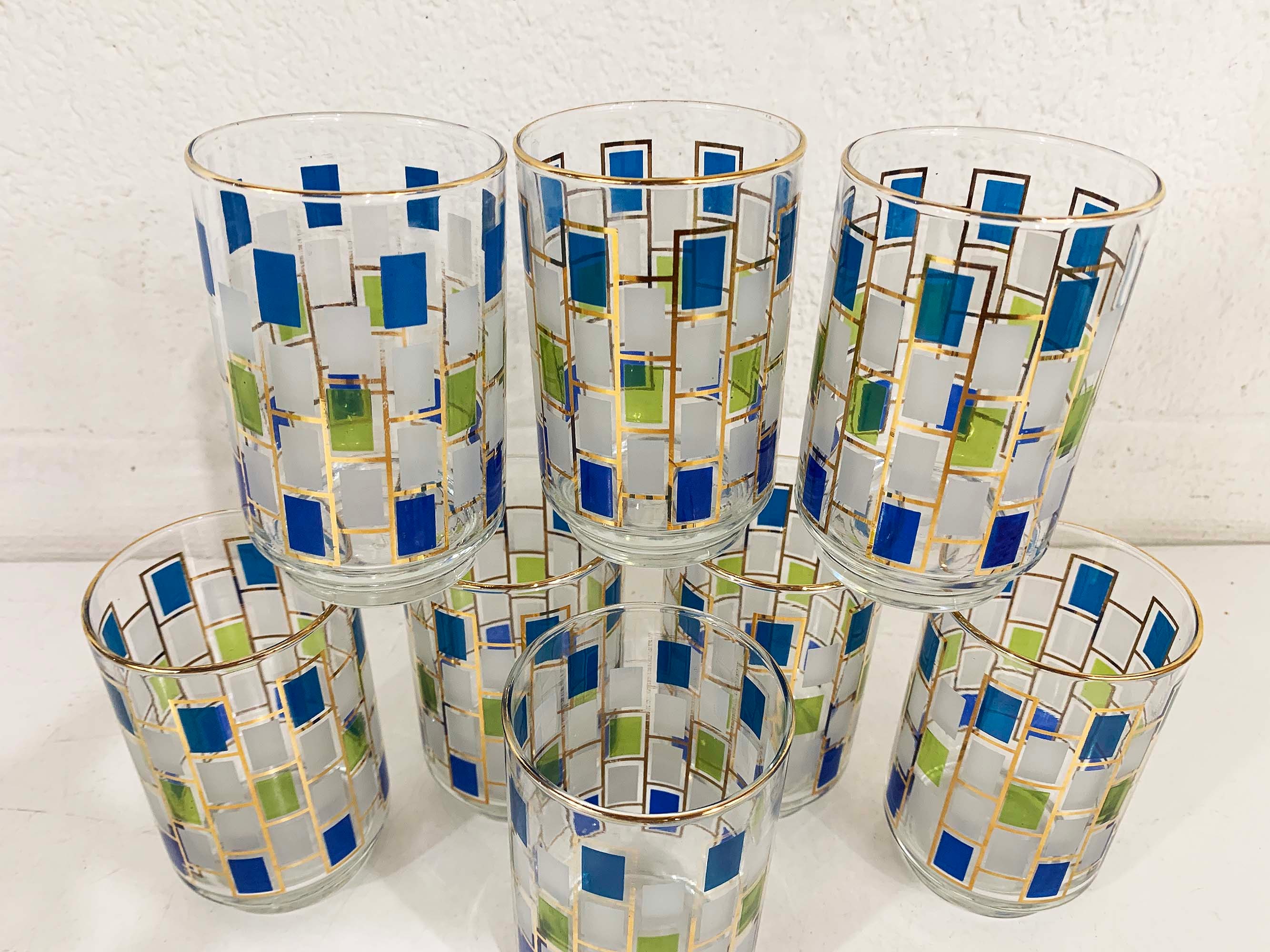 Vintage set of 8 geometric pattern green, blue, and gold glasses. Perfect addition to any bar or vintage kitchen! All are in good vintage condition - the gold paint has come off in some areas on a few of the glasses - please be sure to inspect all photos. Each glass is 5 1/2 inches tall and 2 3/4 inches in diameter at the top. They each hold approximately 12 ounces of liquid when filled to the brim.