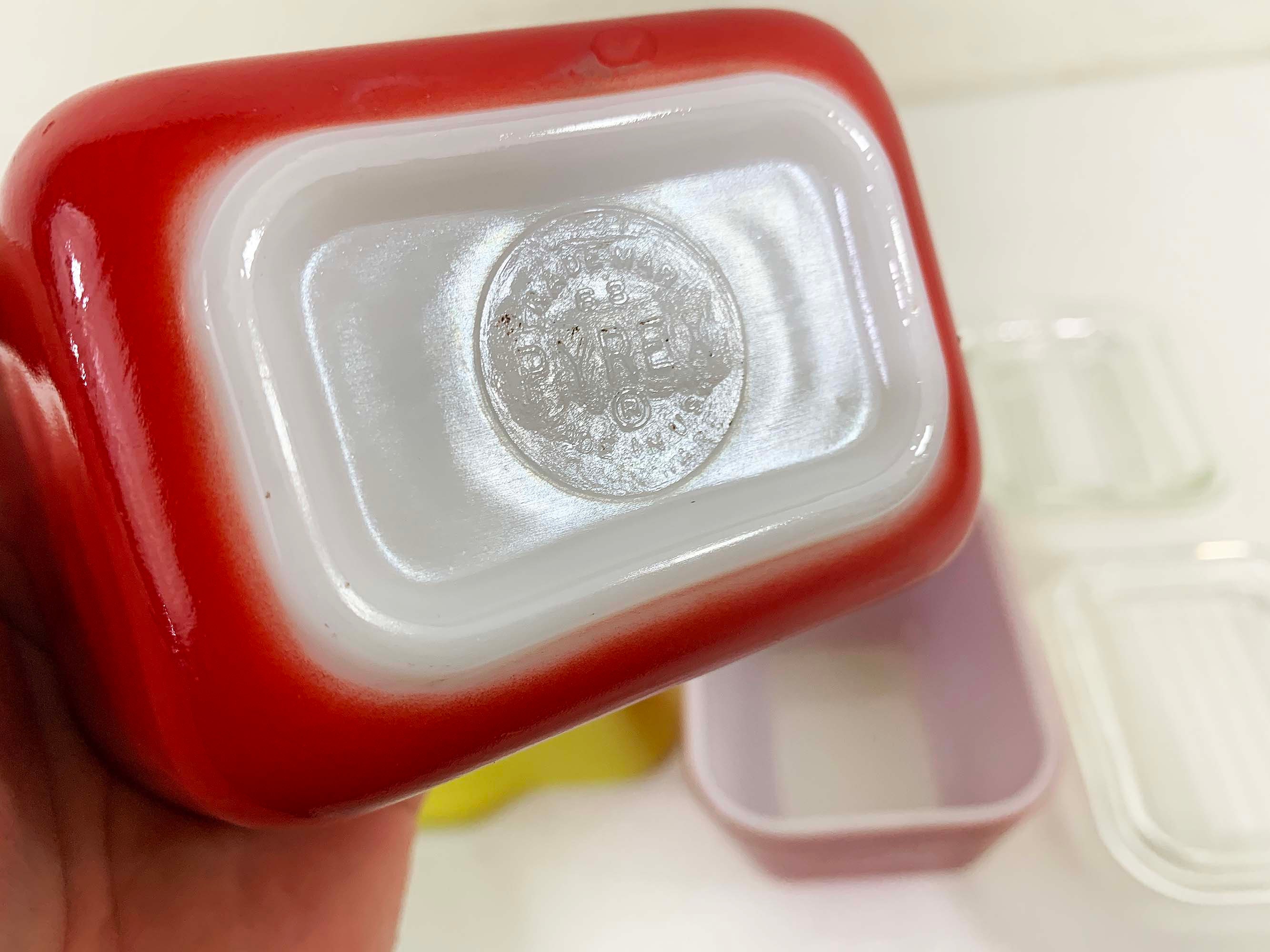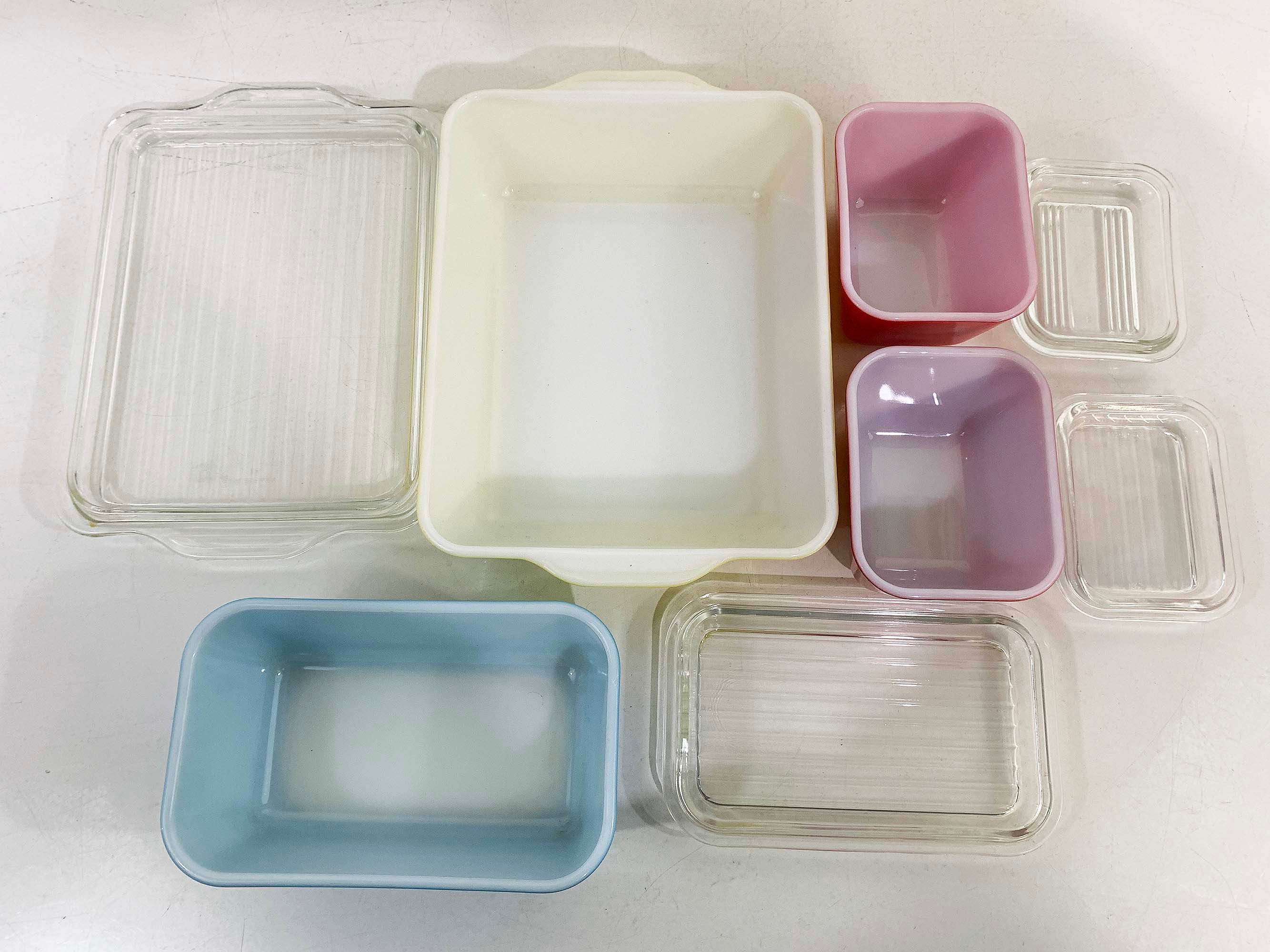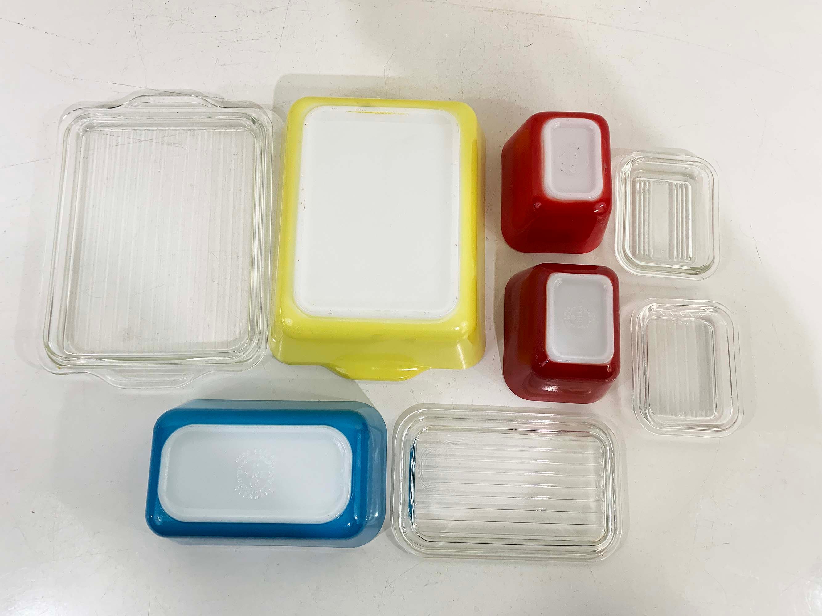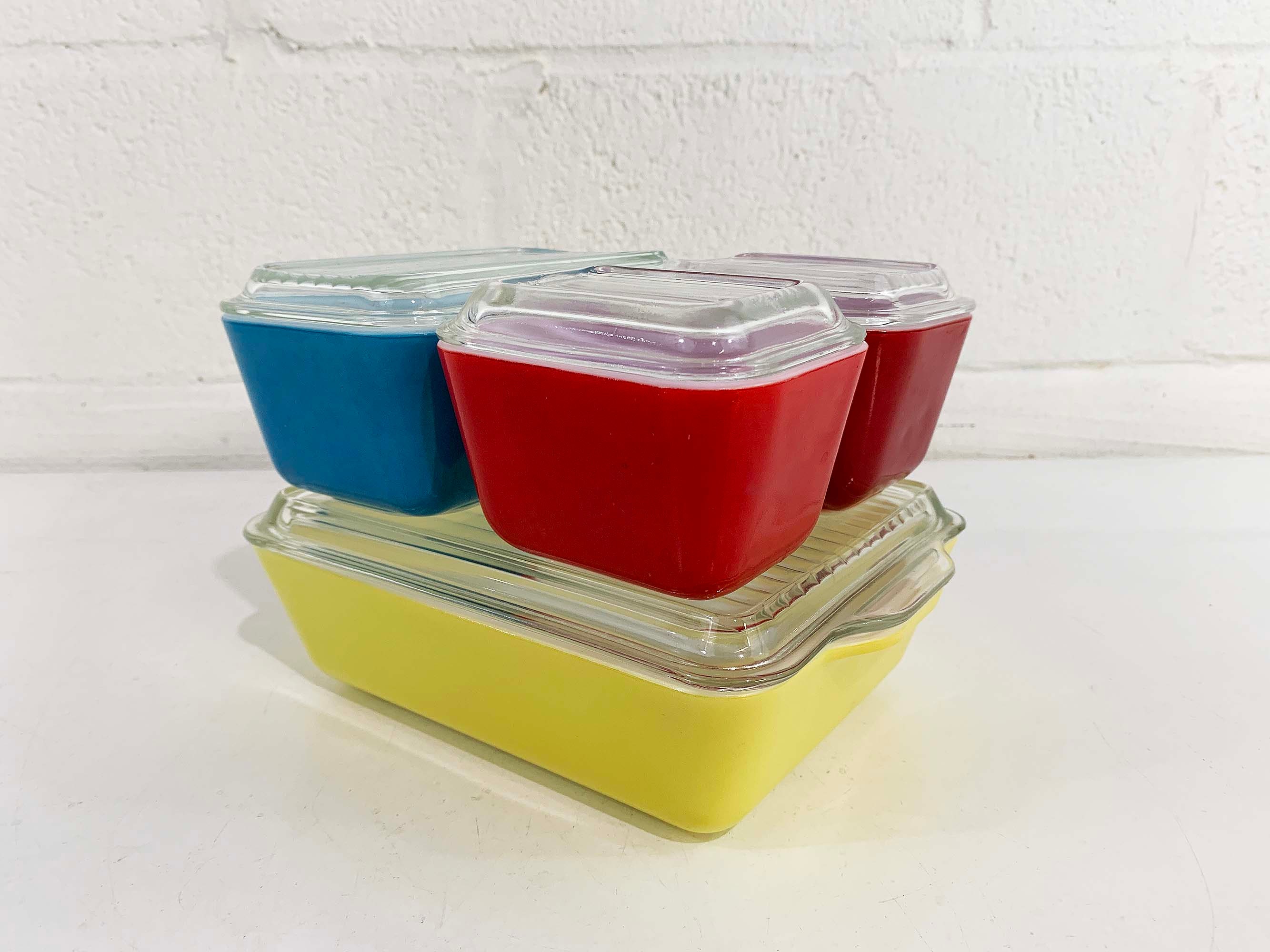 Classic vintage Pyrex primary refrigerator dishes set with their matching lids! All four dishes and their matching lids are in excellent vintage condition - the paint colors are still very vibrant and shiny. There are a few tiny specs where the paint has come off but this set is really in amazing condition for it's age.