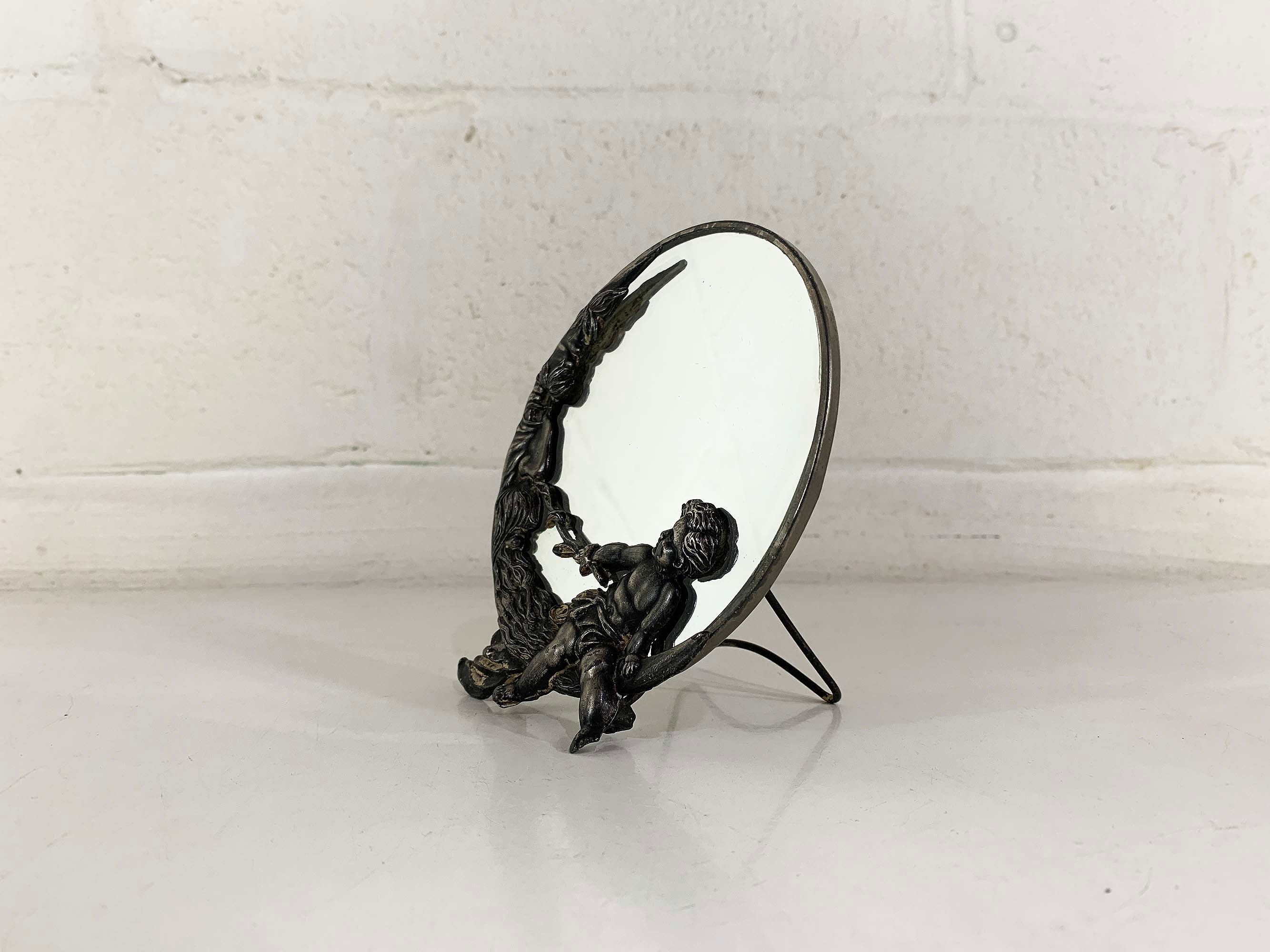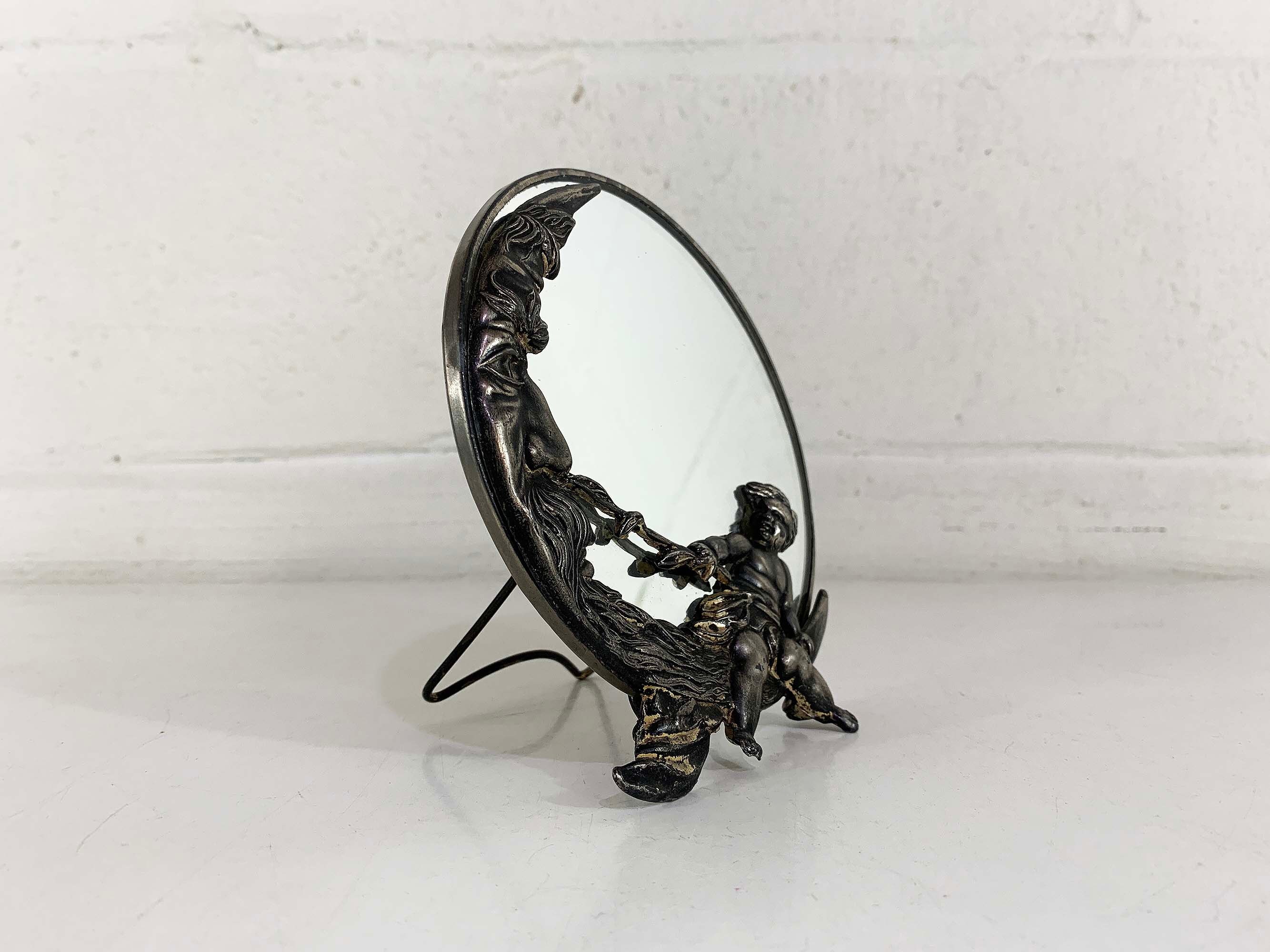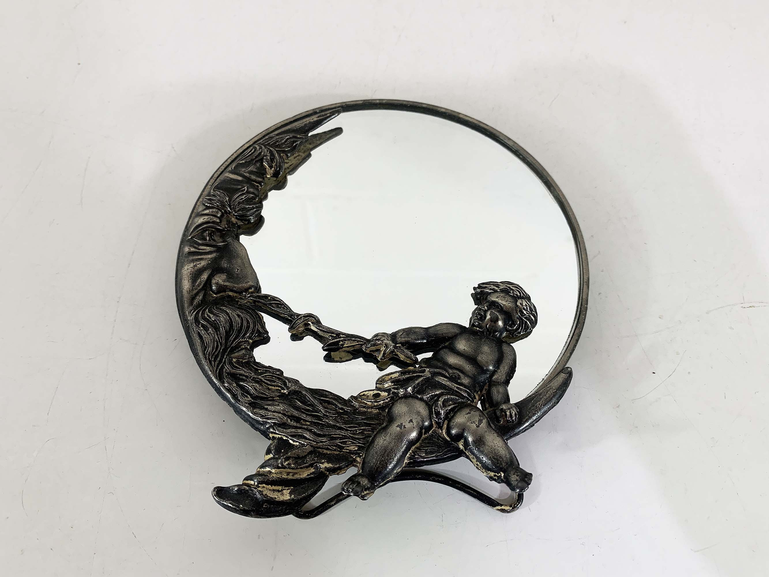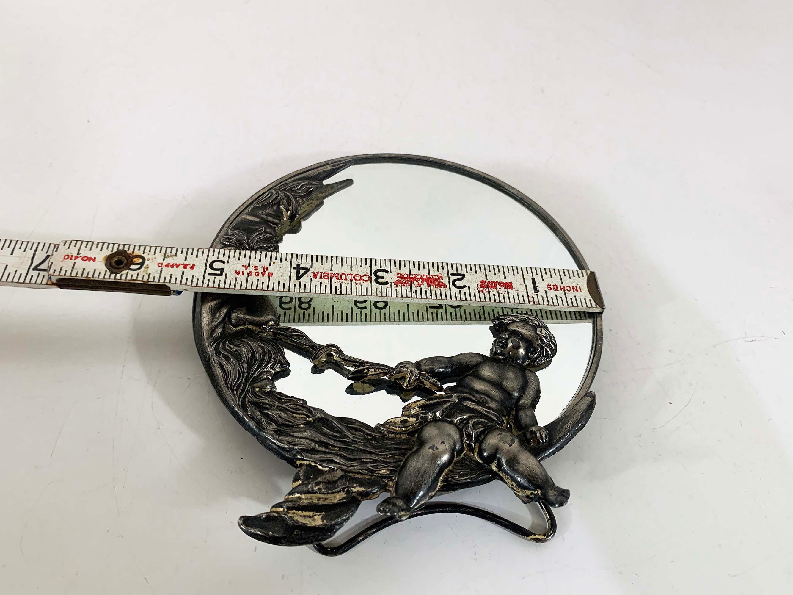 Lovely cherub and crescent moon ceramic vanity round mirror. It is approximately 5 inches in diameter. The metal around the mirror has come apart a bit and the mirror shifts inside of the moon frame. It is in good vintage condition.
