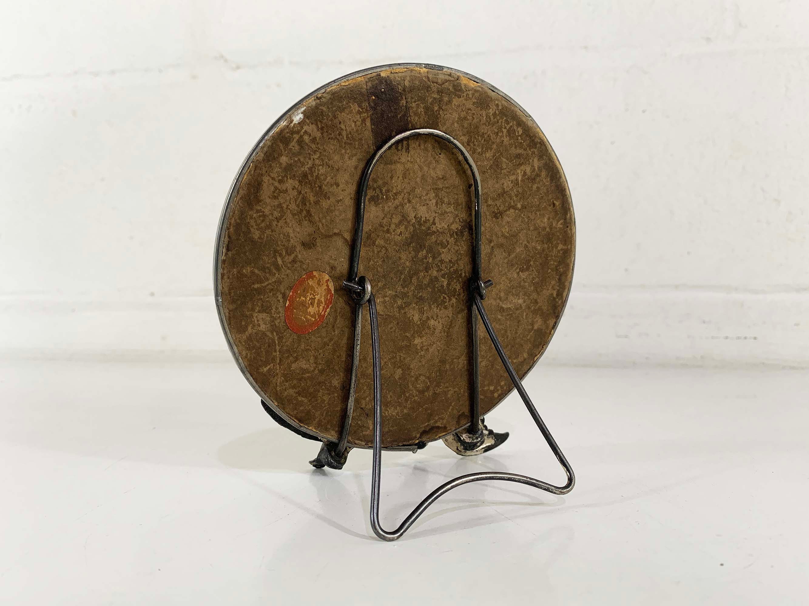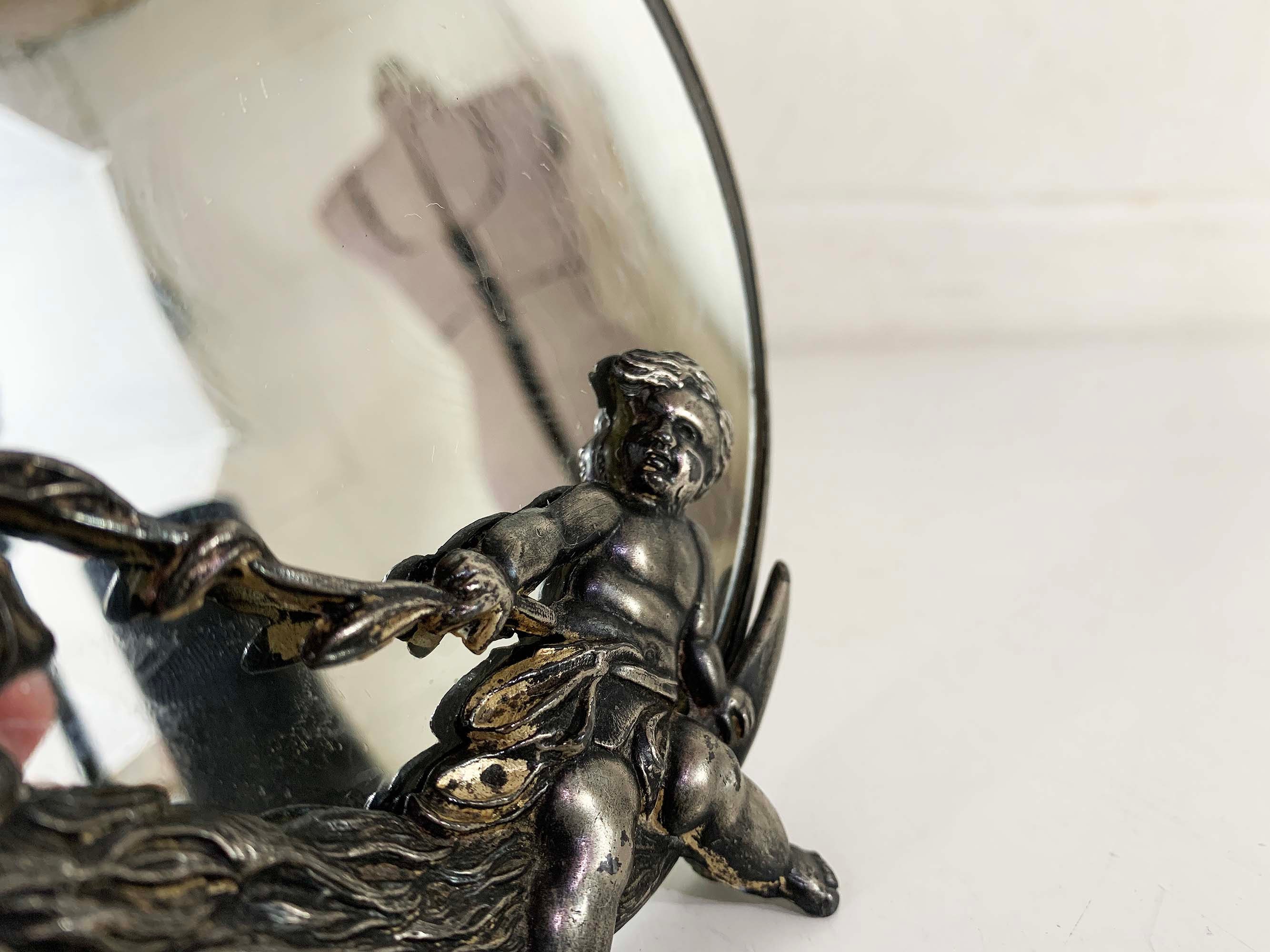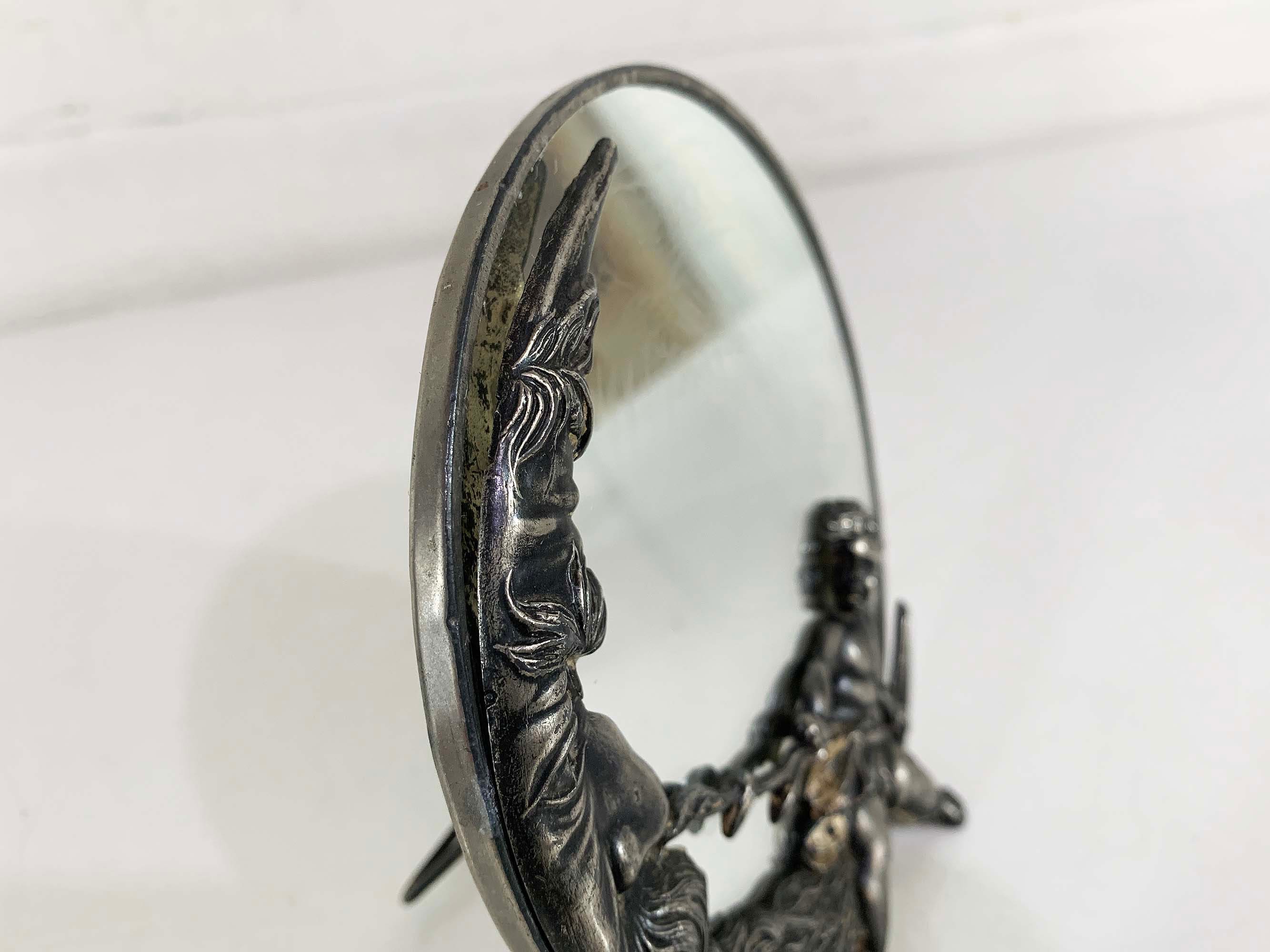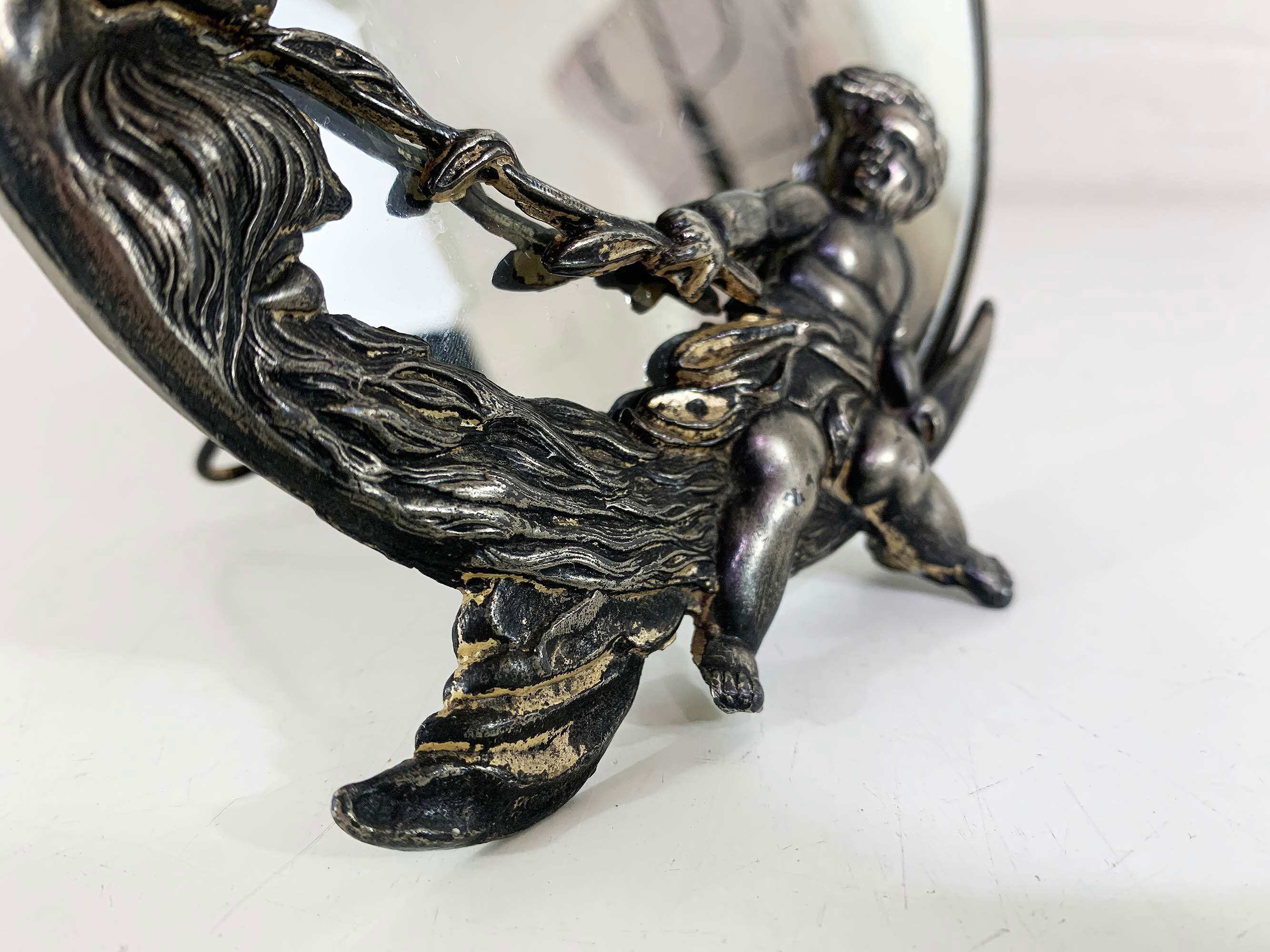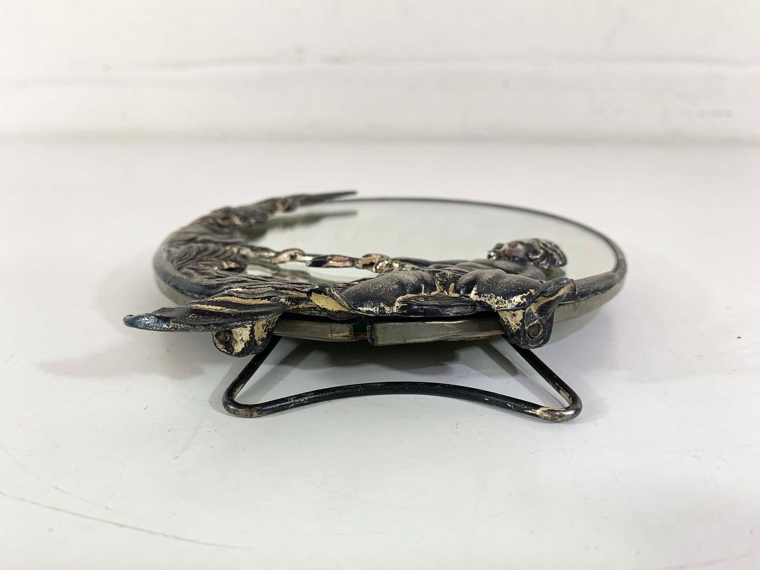 Lovely cherub and crescent moon ceramic vanity round mirror. It is approximately 5 inches in diameter. The metal around the mirror has come apart a bit and the mirror shifts inside of the moon frame. It is in good vintage condition.