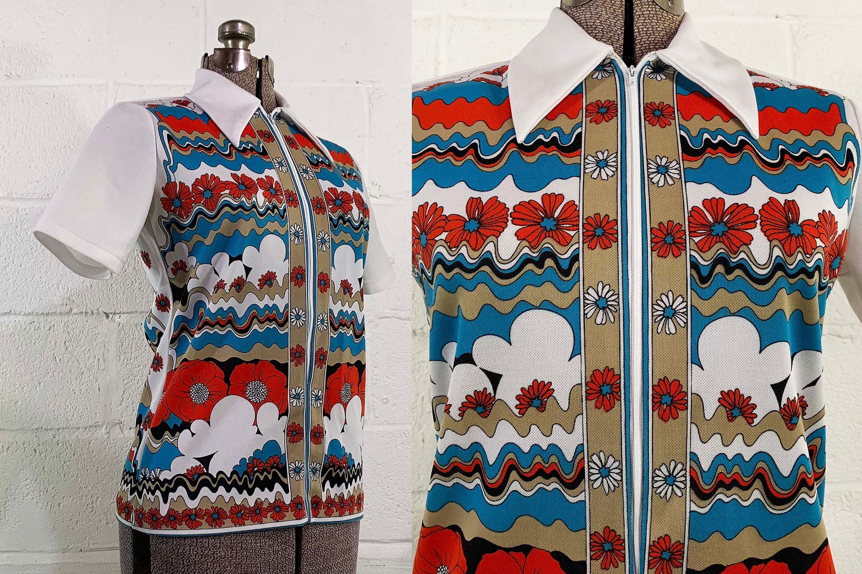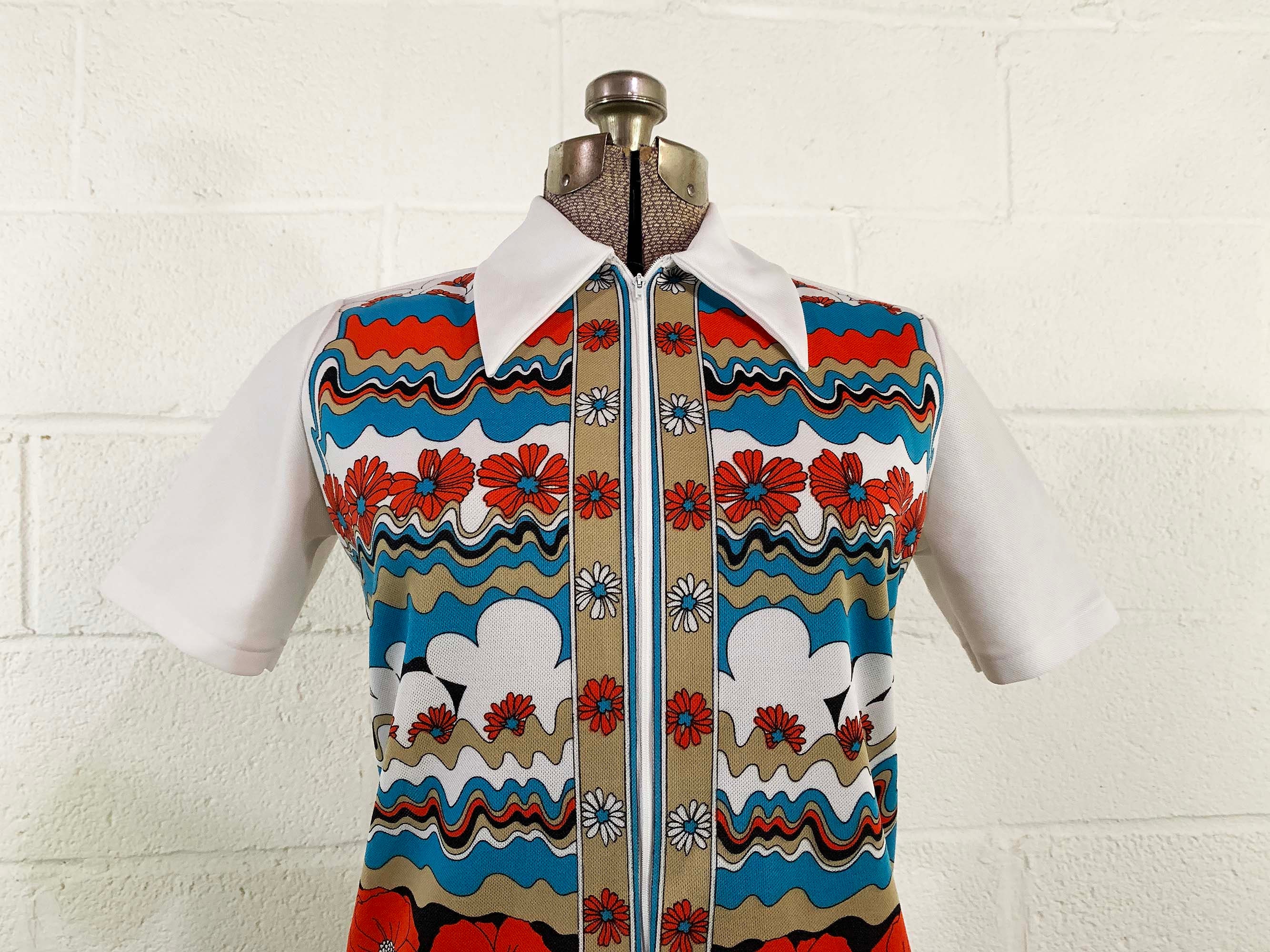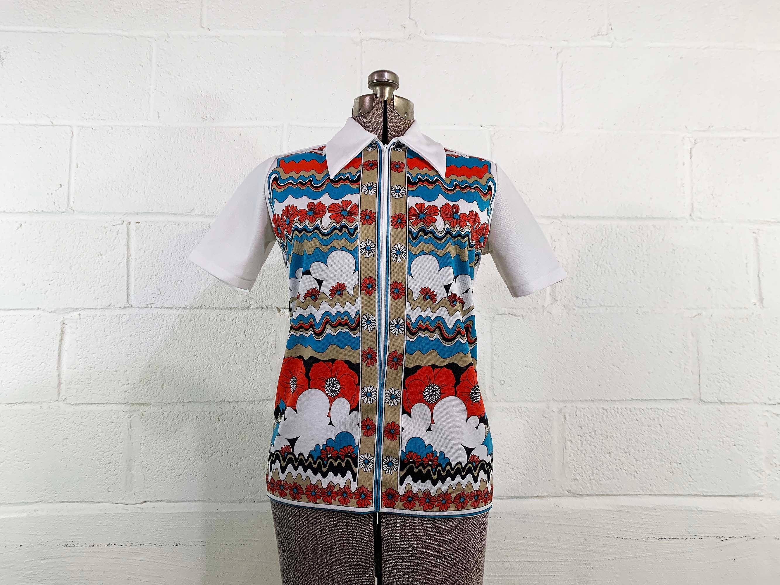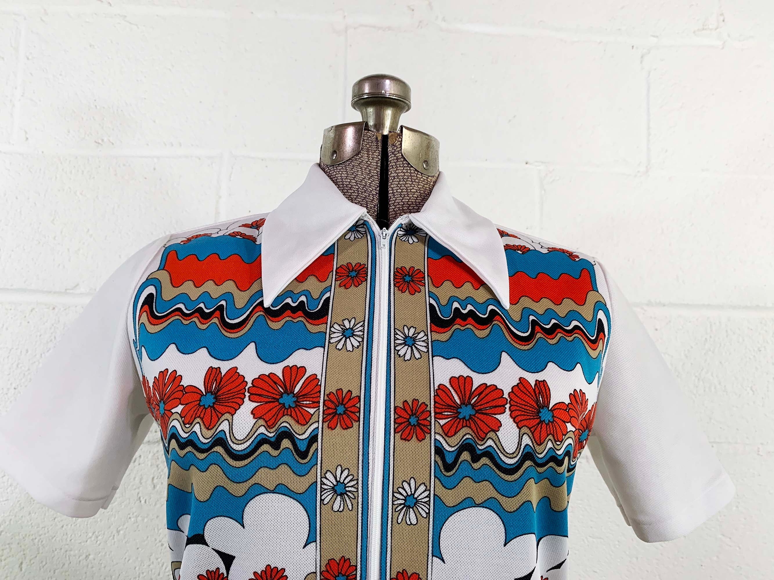 Very cool flower power short sleeve floral zip front shirt! It's in excellent vintage shape with no significant wear. Fabric has slight stretch.