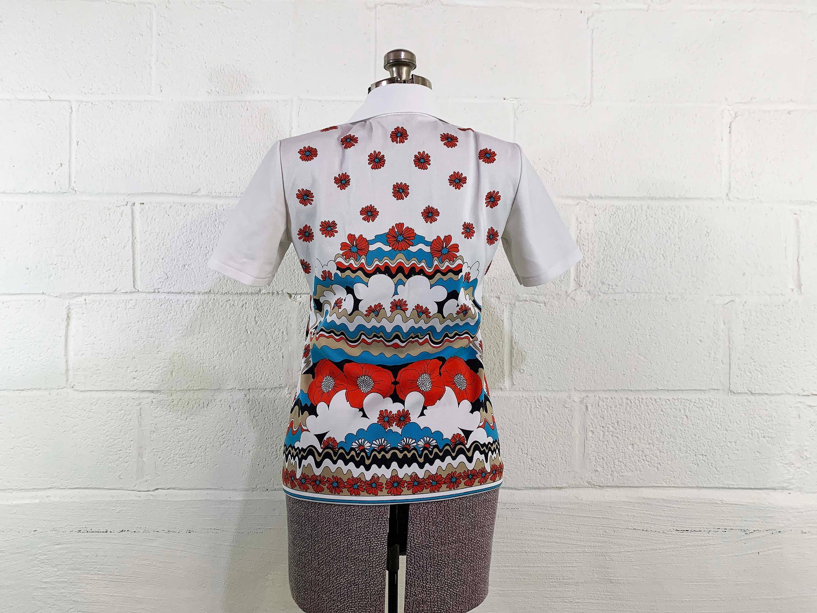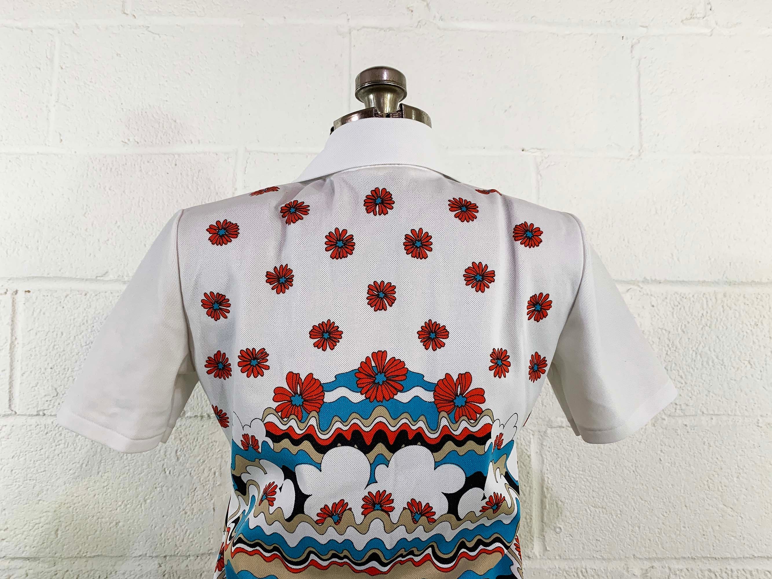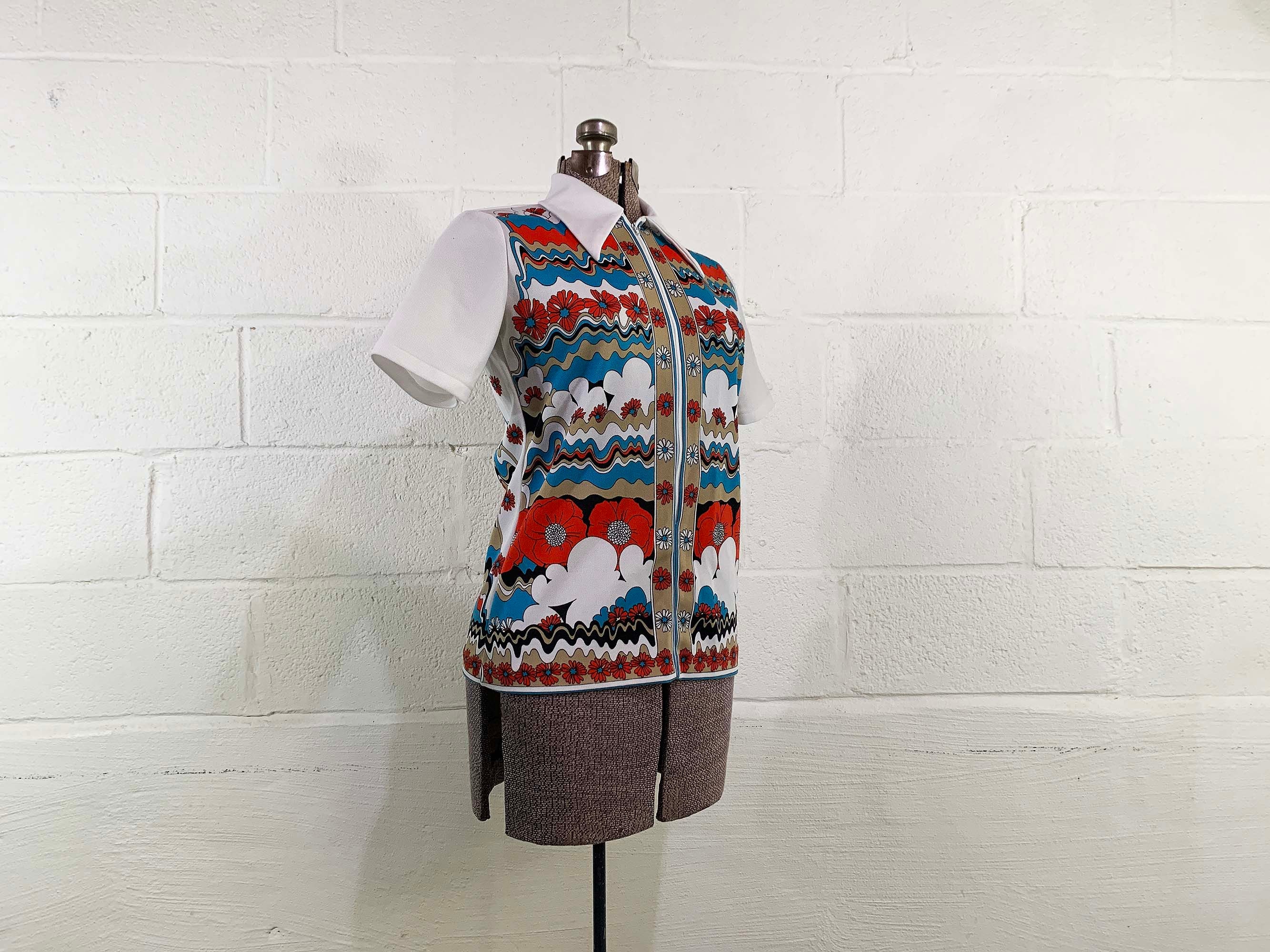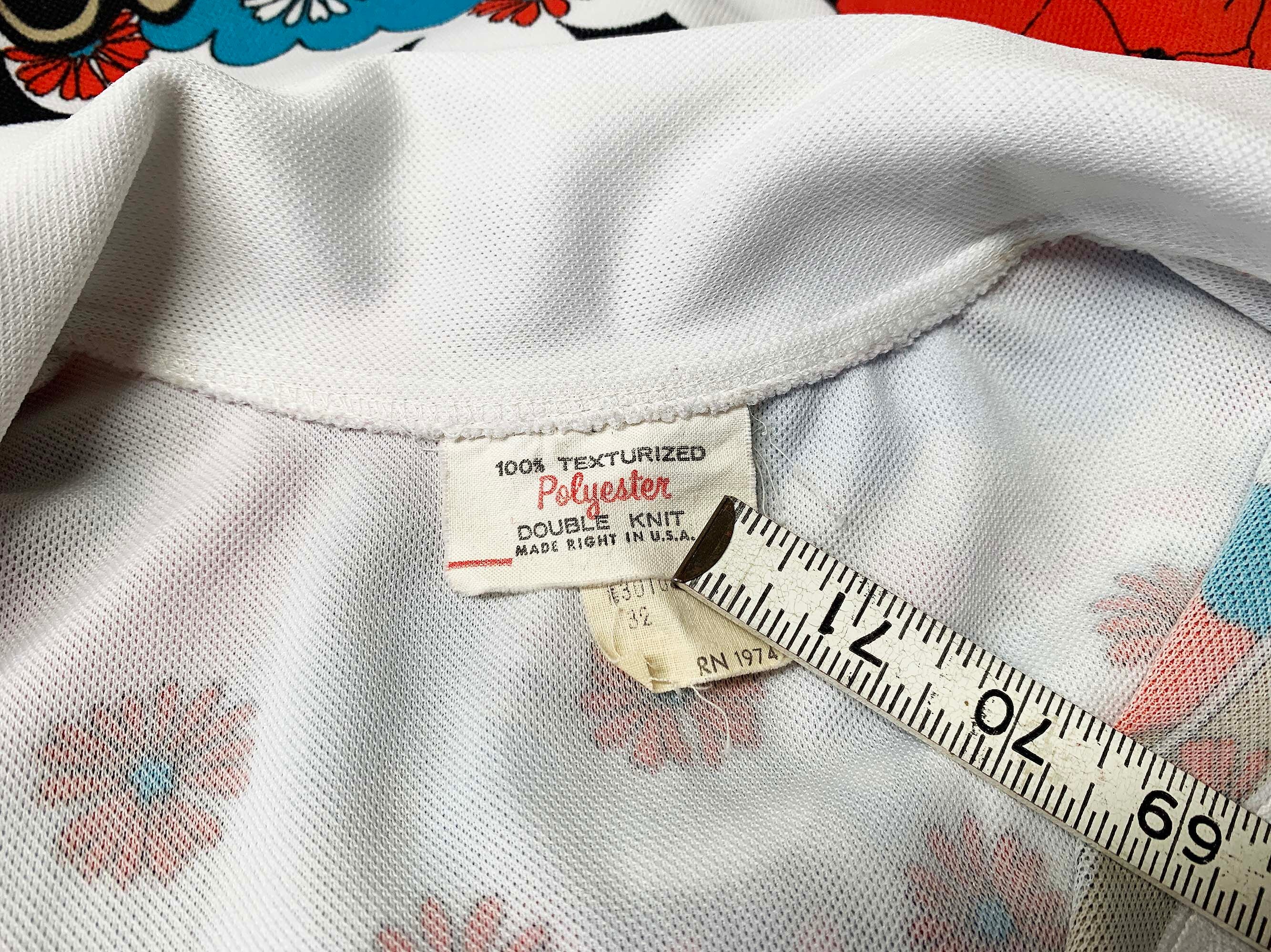 Very cool flower power short sleeve floral zip front shirt! It's in excellent vintage shape with no significant wear. Fabric has slight stretch.