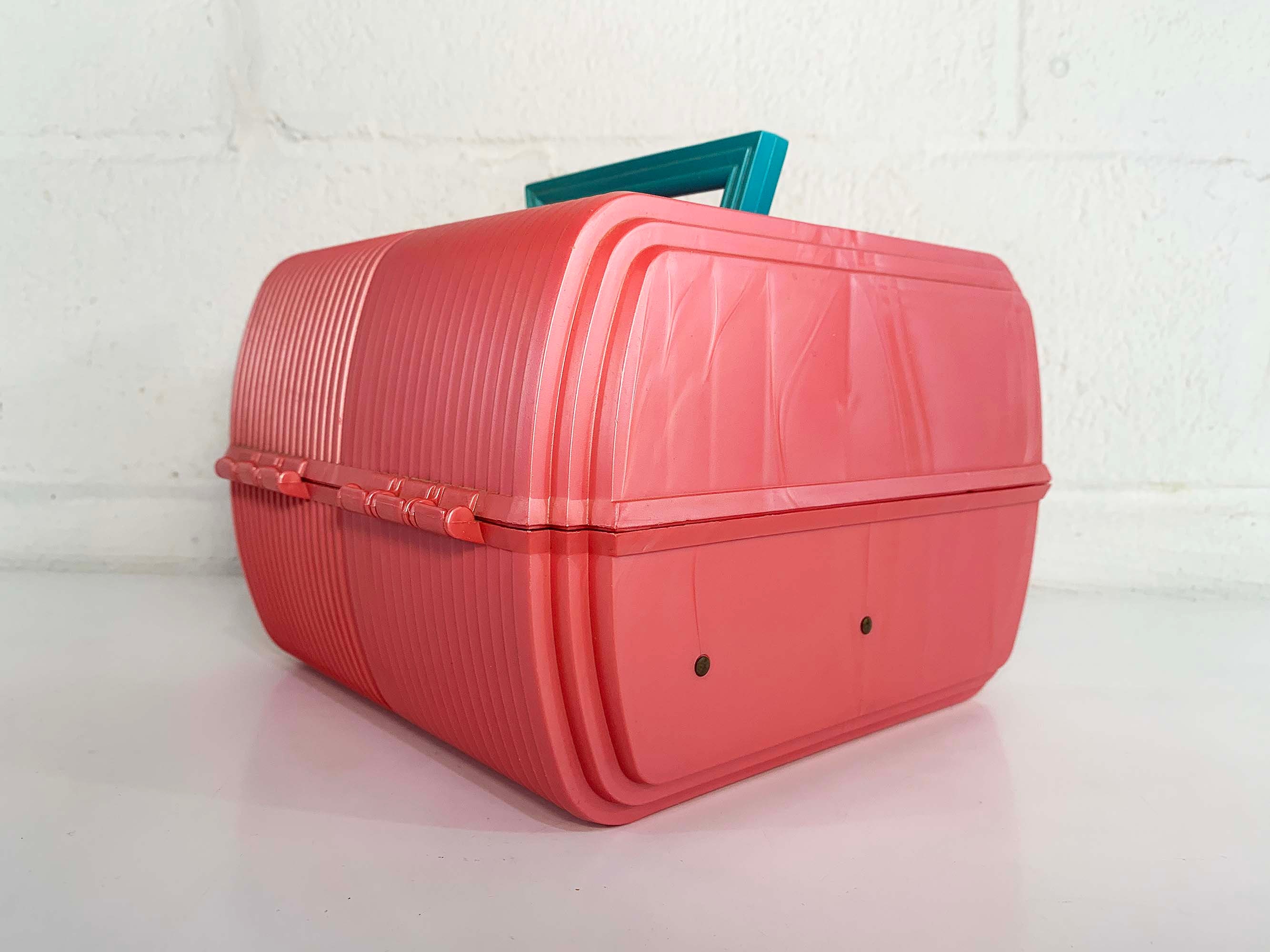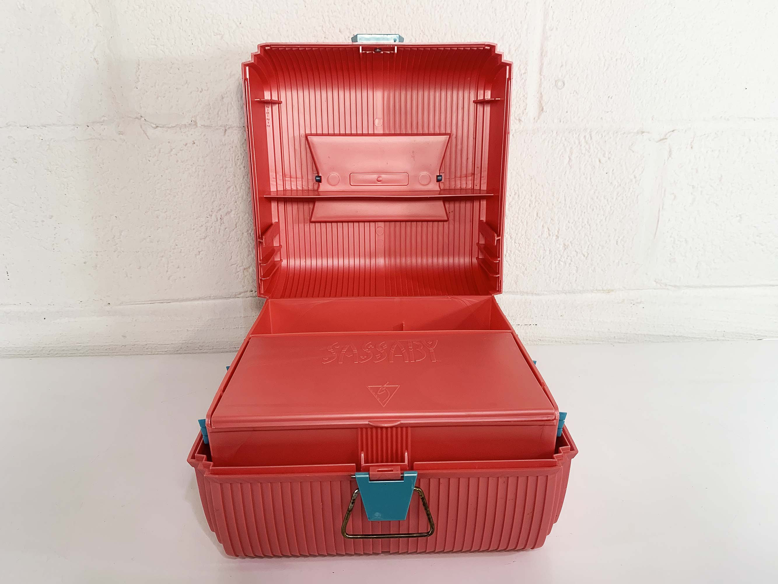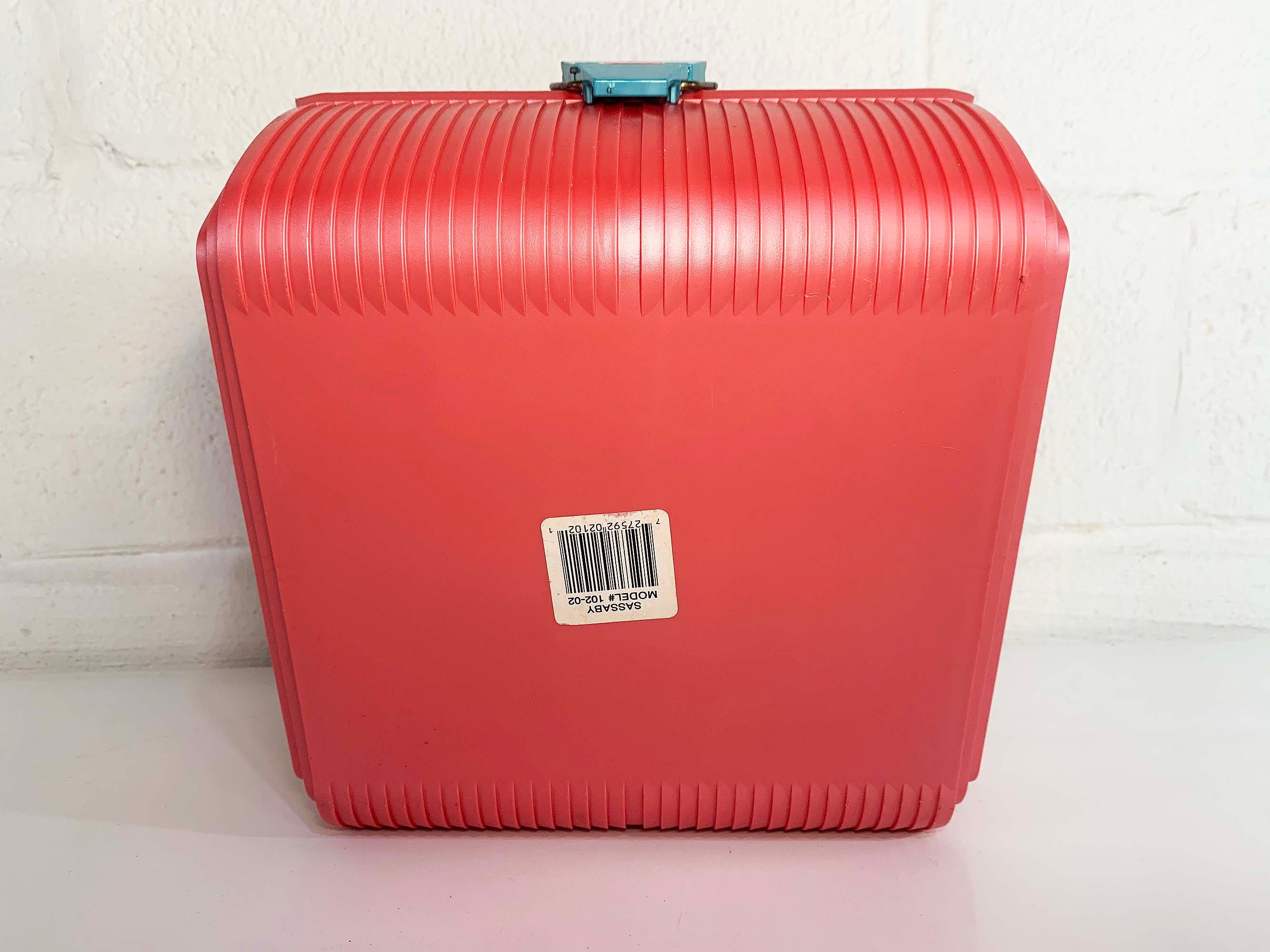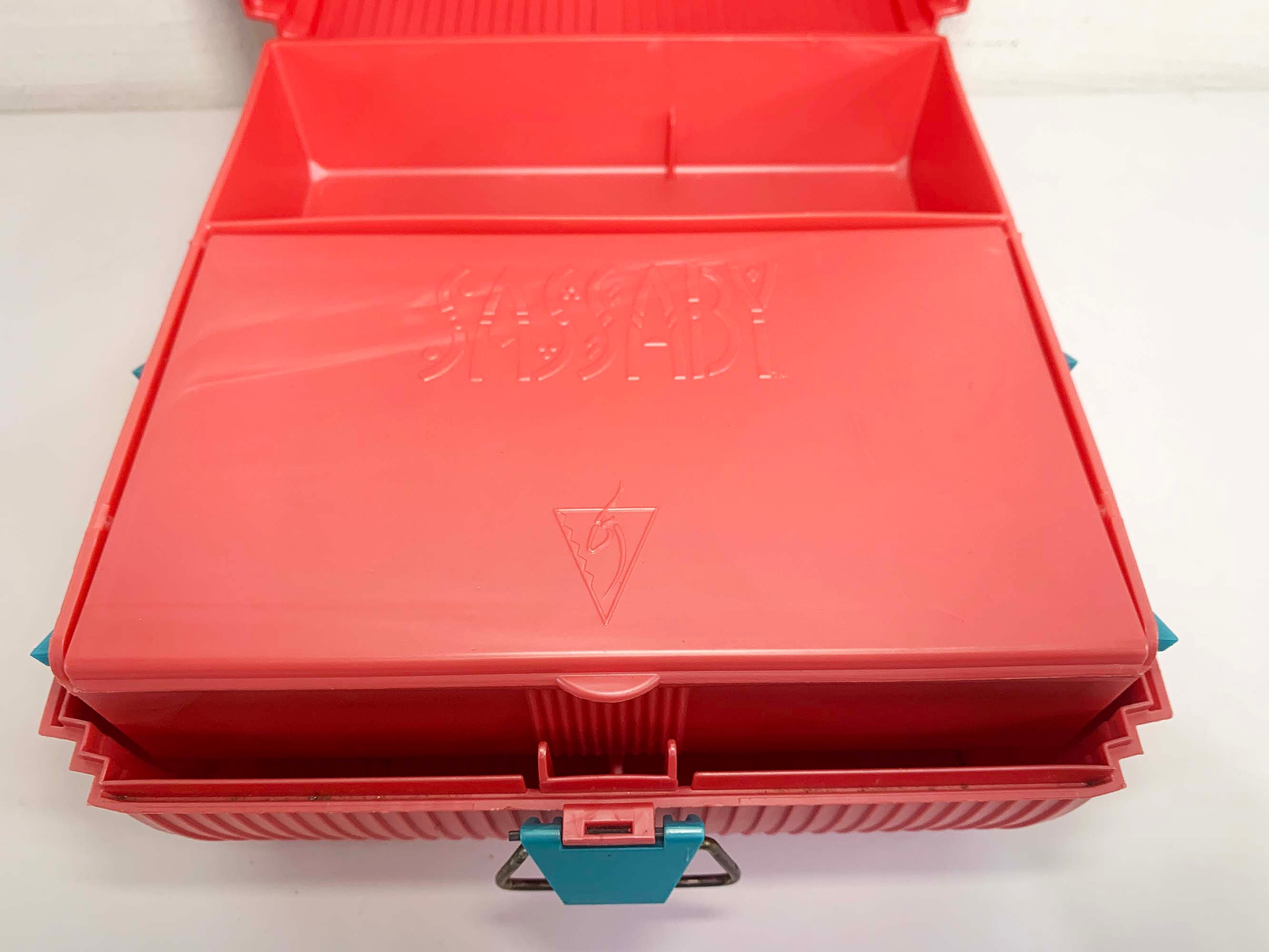 Great retro Sassaby makeup case from the 90s! Perfect for storing and organizing makeup, jewelry, or supplies! In great vintage condition with some scuffs and scratches here and there. The box measures approximately 9 inches wide, 7 inches tall, and 9 inches deep.