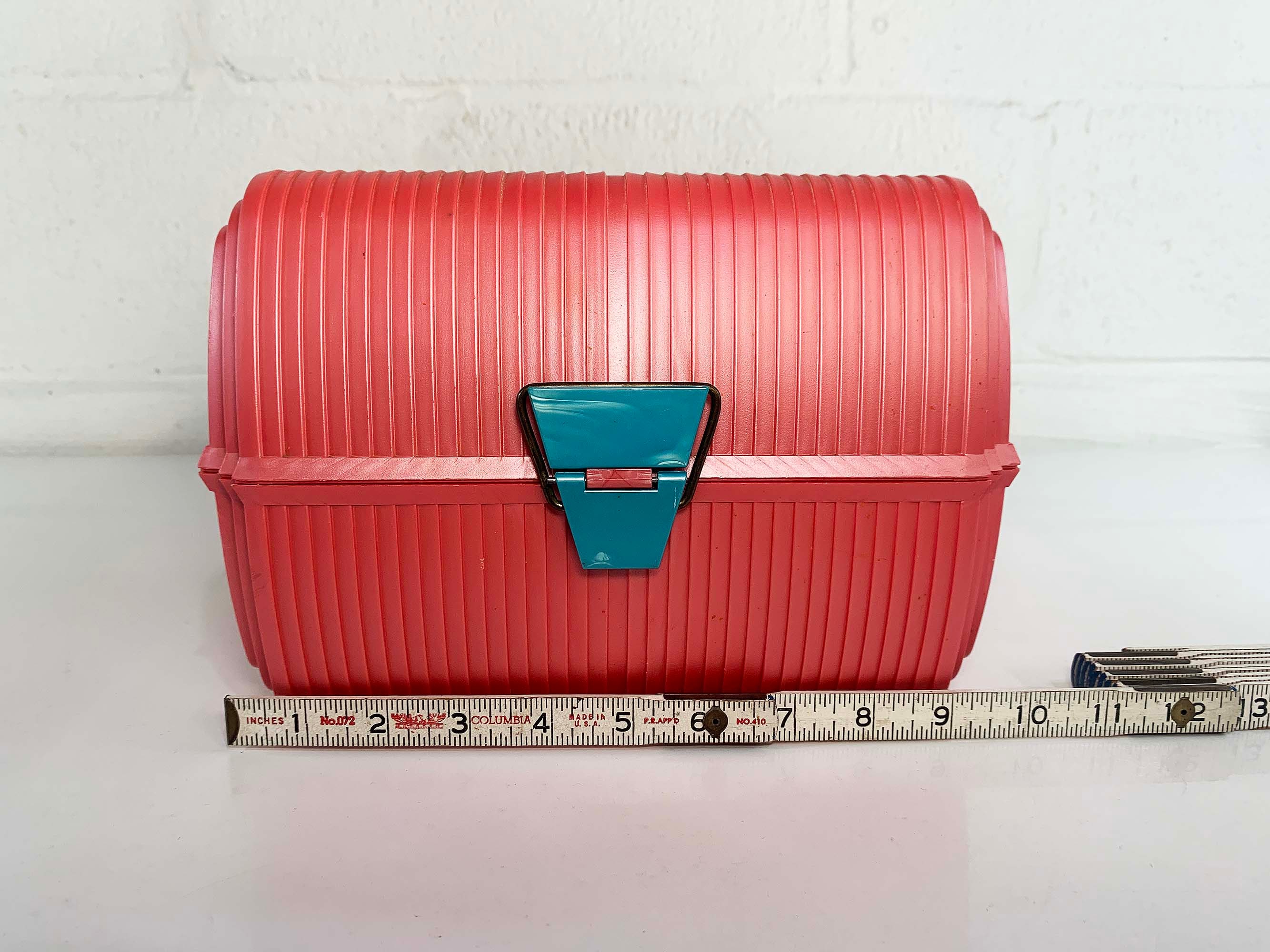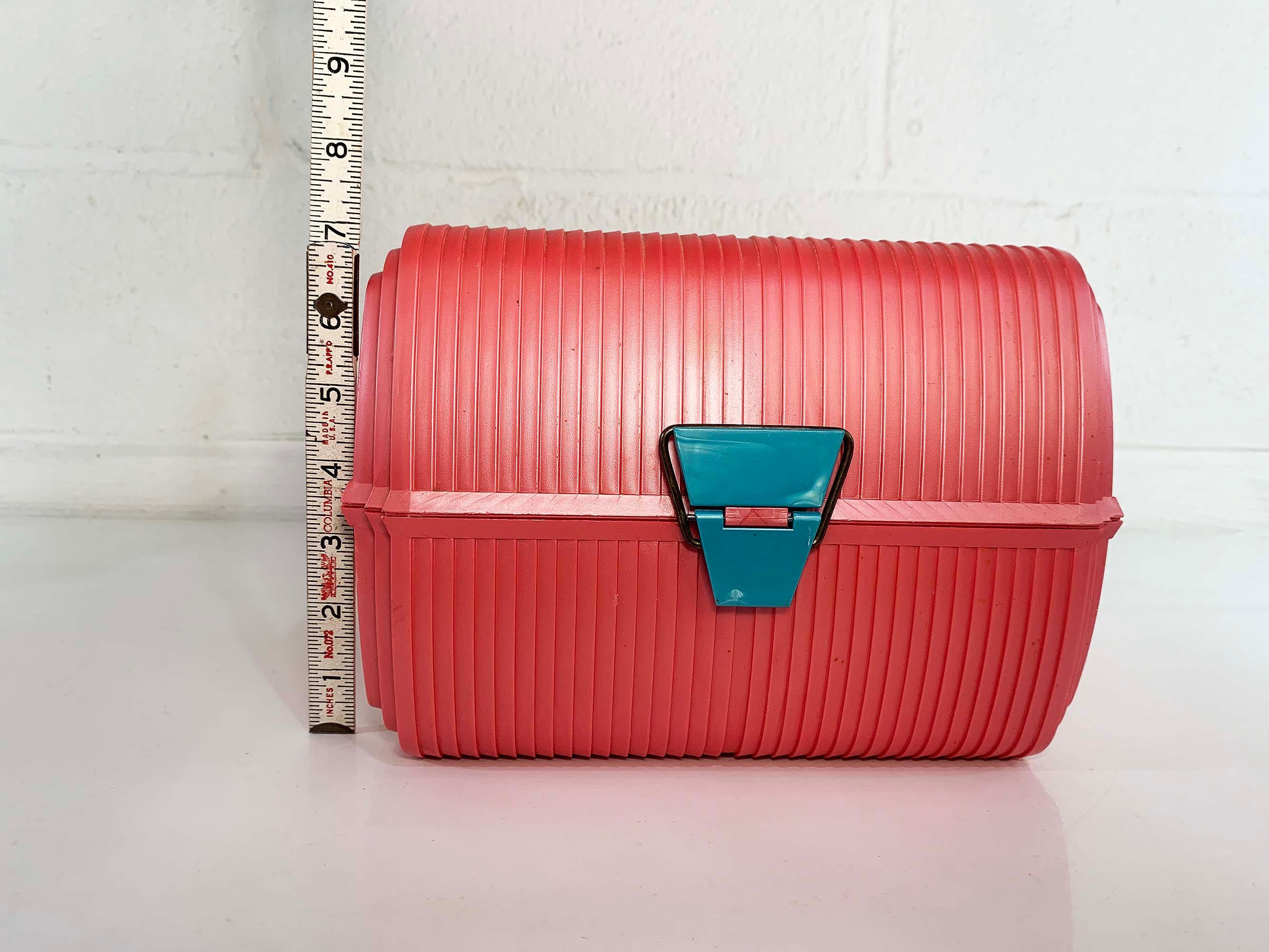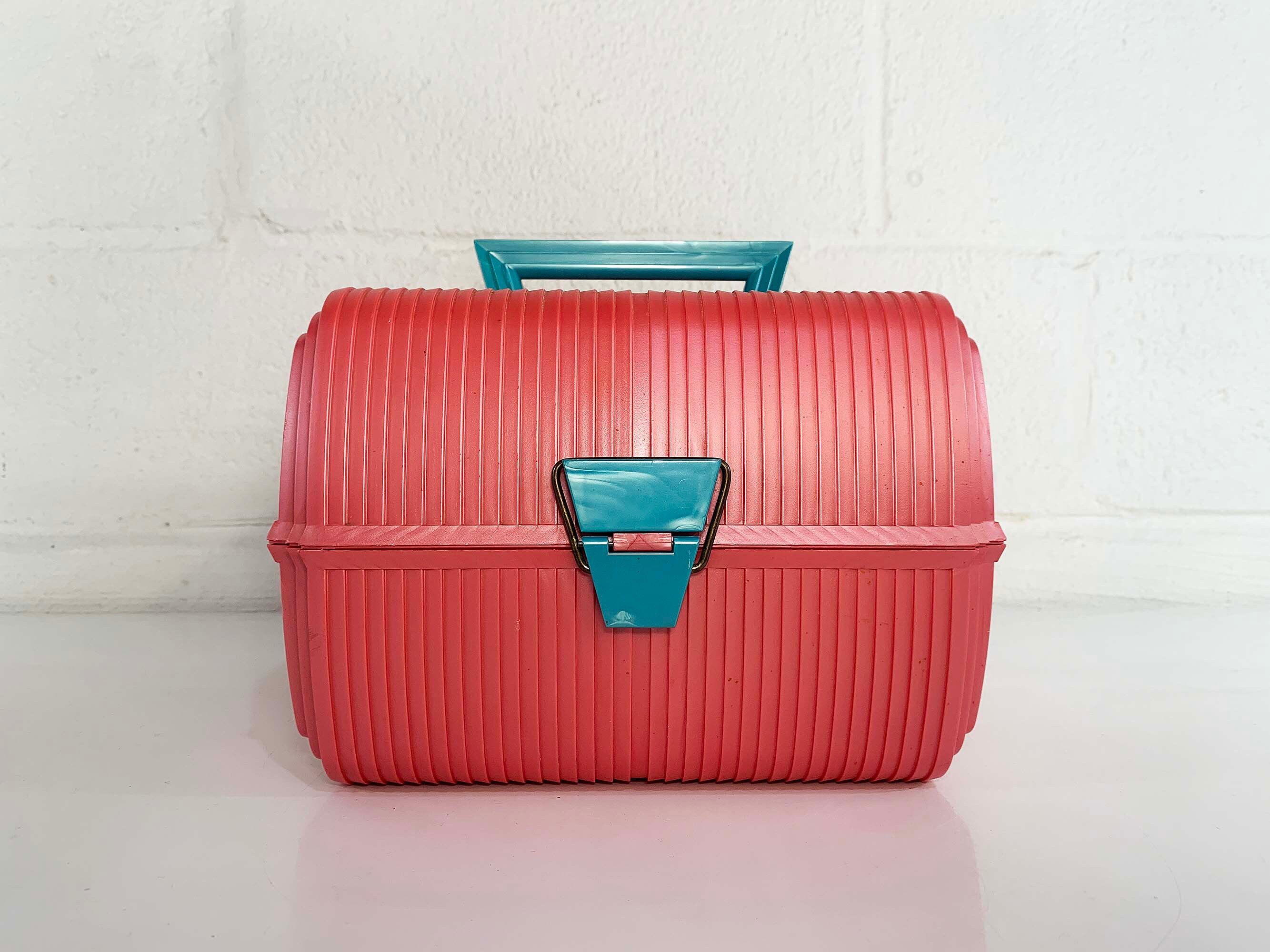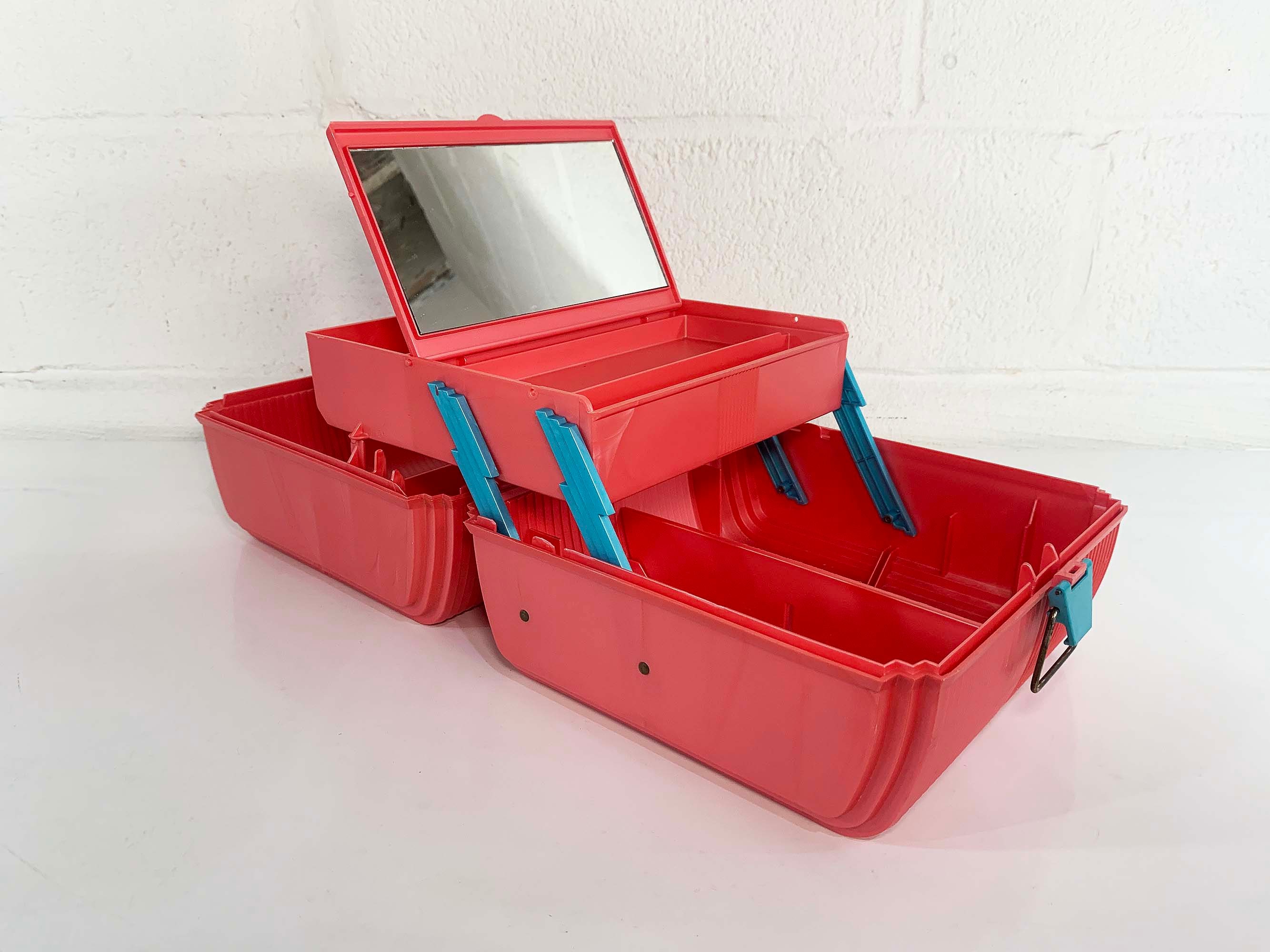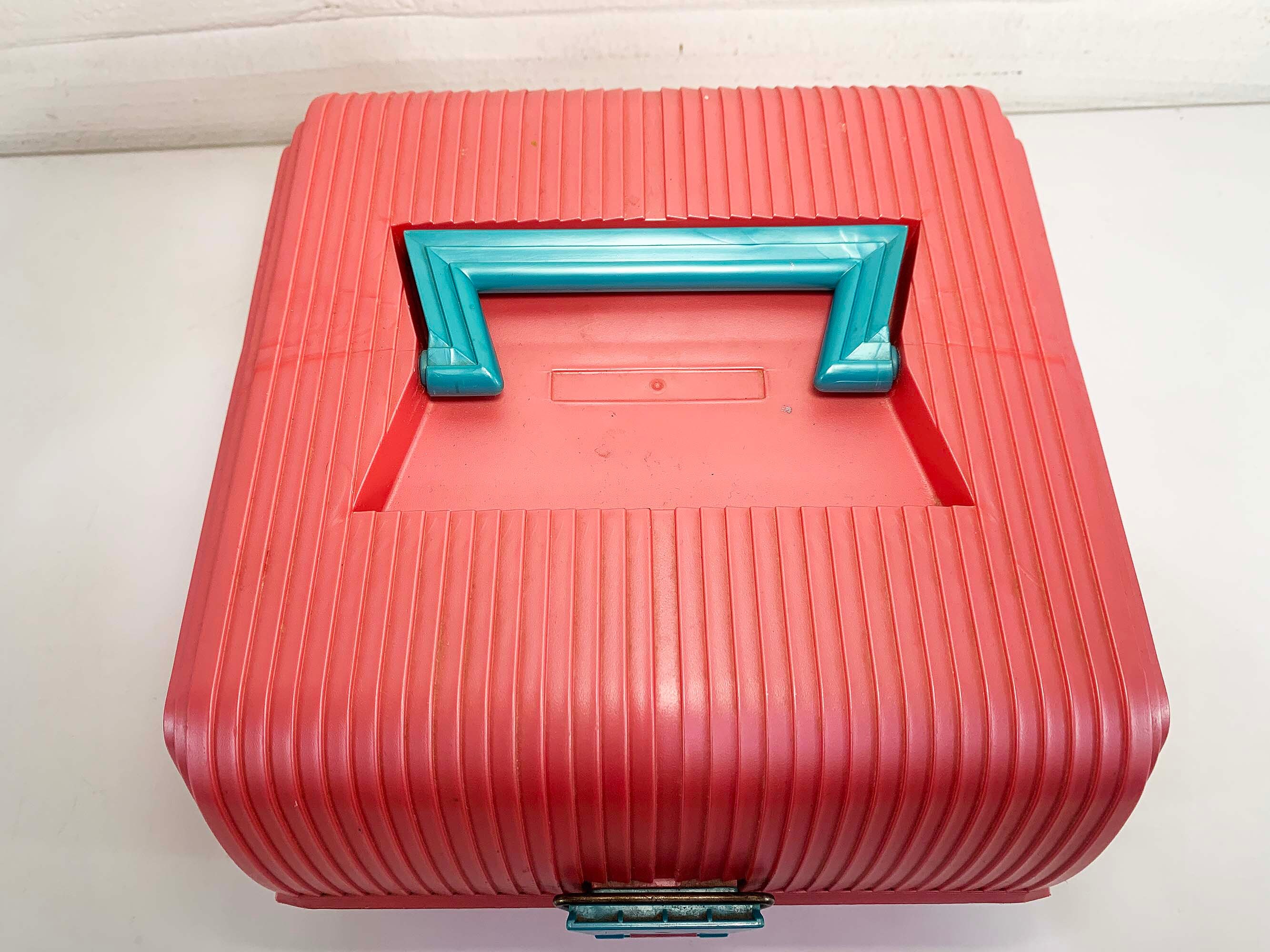 Great retro Sassaby makeup case from the 90s! Perfect for storing and organizing makeup, jewelry, or supplies! In great vintage condition with some scuffs and scratches here and there. The box measures approximately 9 inches wide, 7 inches tall, and 9 inches deep.