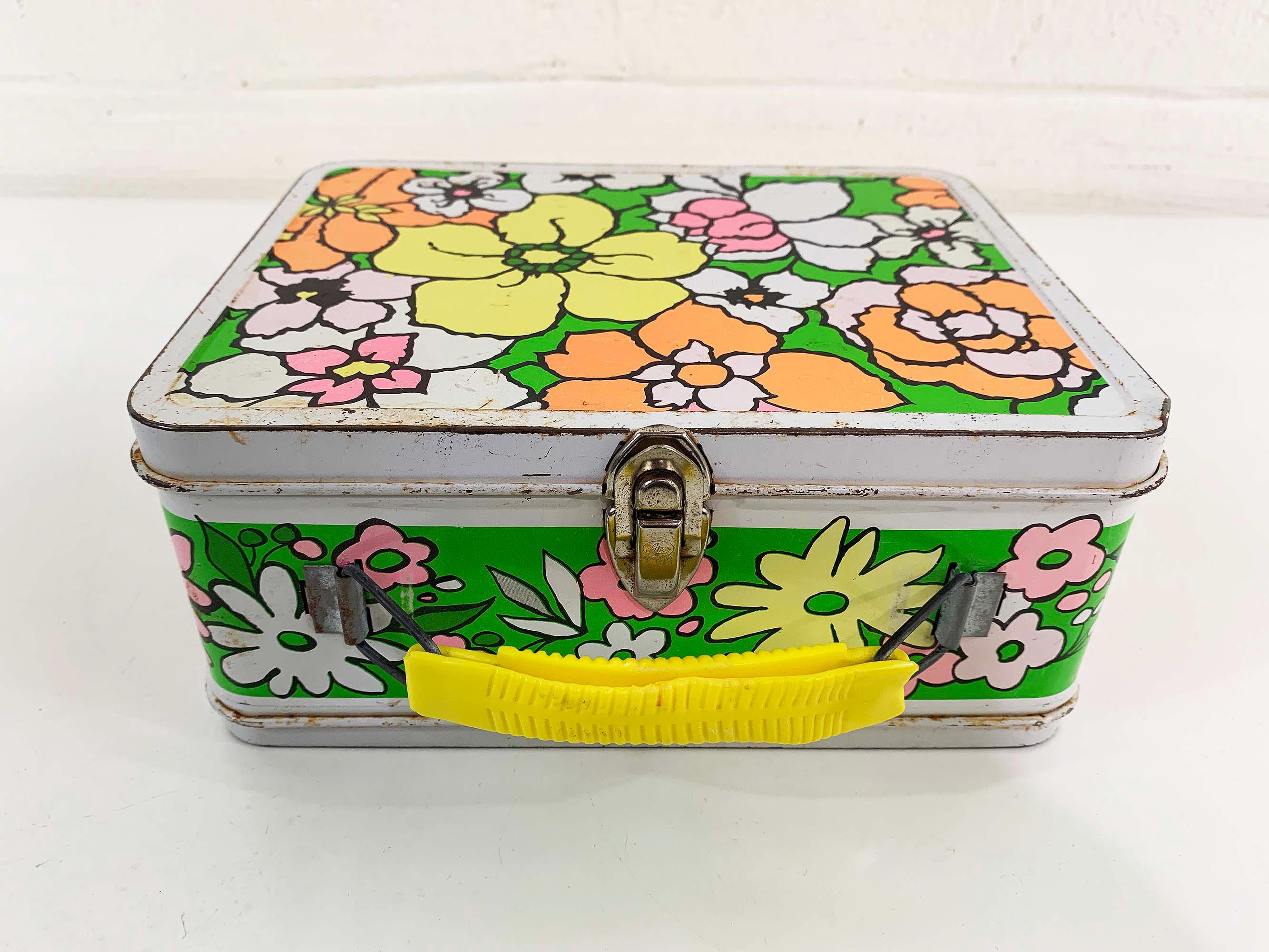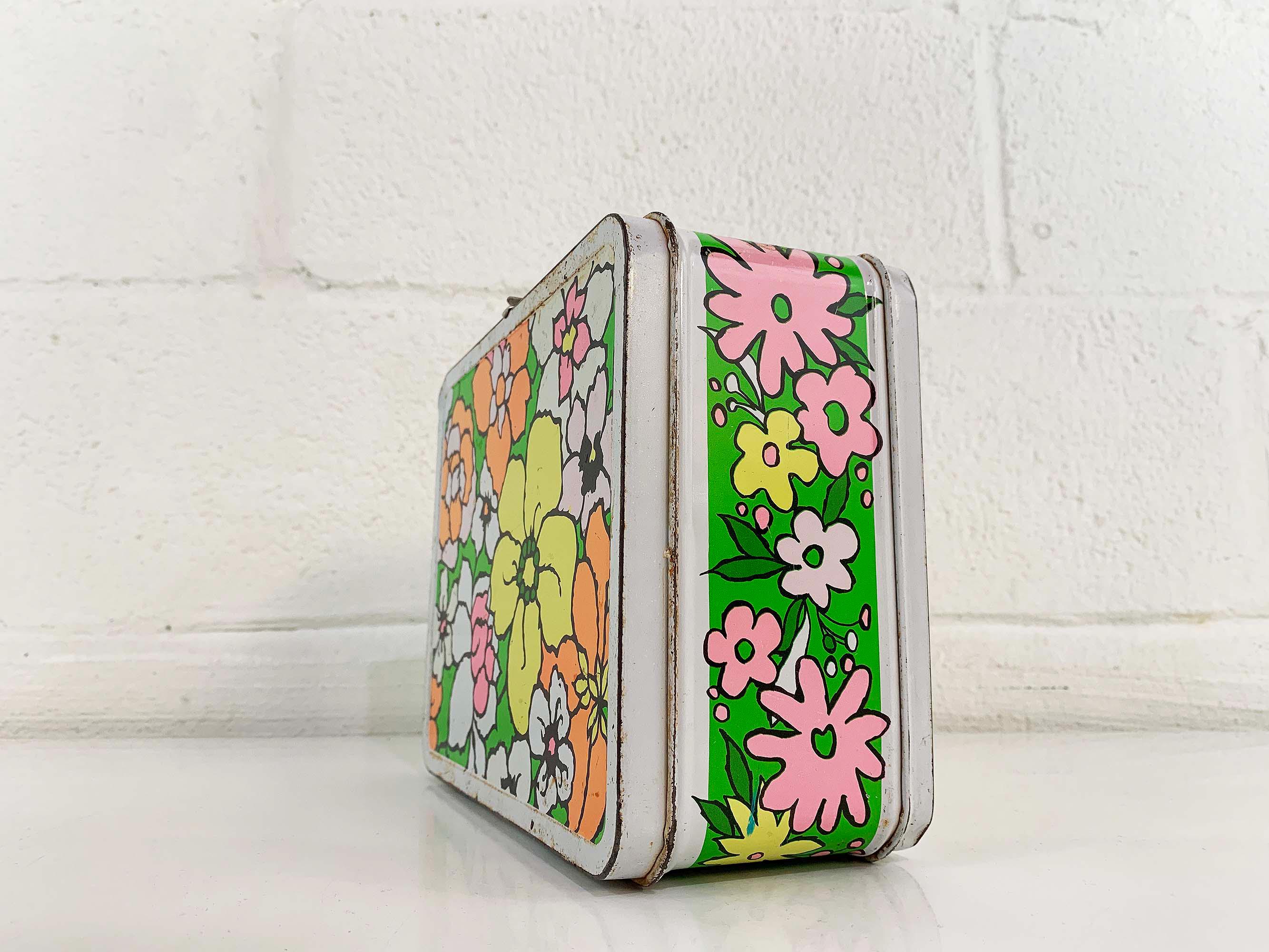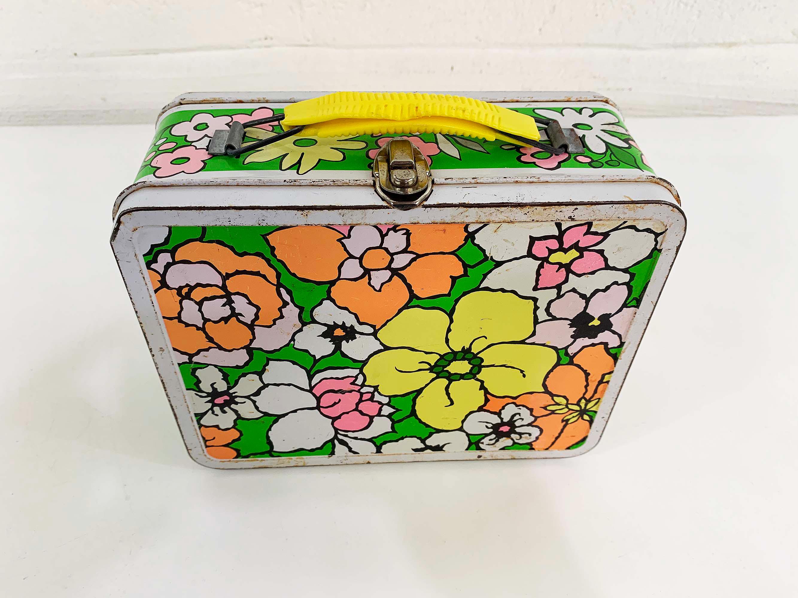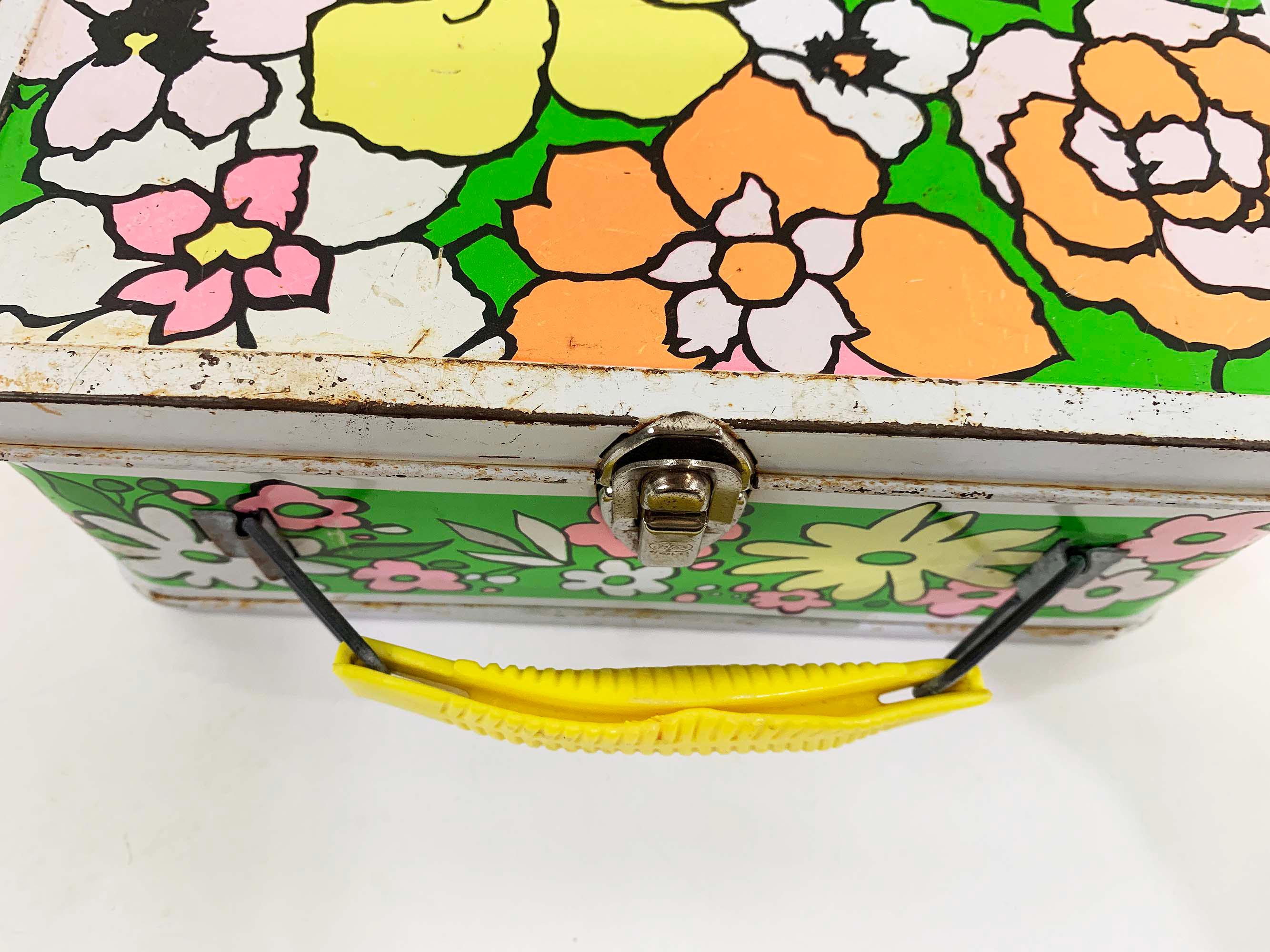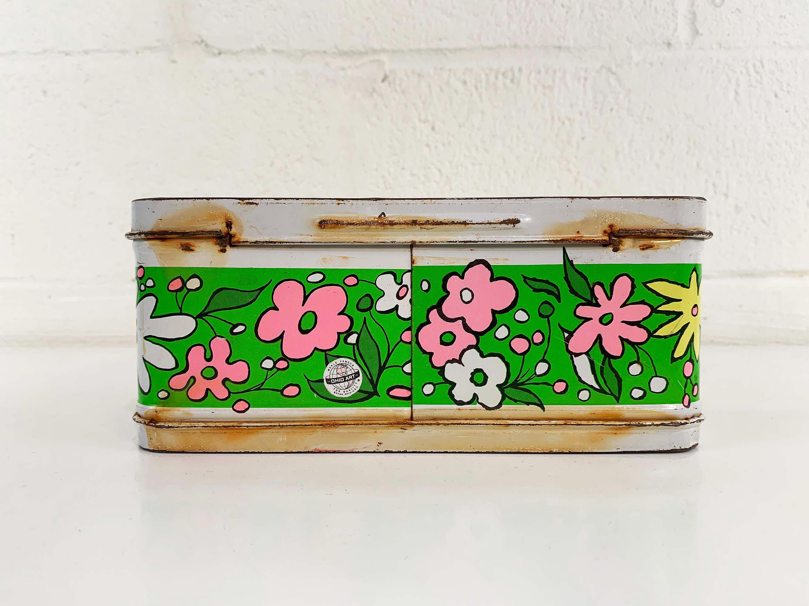 Very groovy bright floral lunch box made by Ohio Art. In fair condition with some all over rust, scuffs, scratches, and wear. The lunch box is about 4 inches tall, 8 1/2 inches wide, and 6 1/2 inches deep.