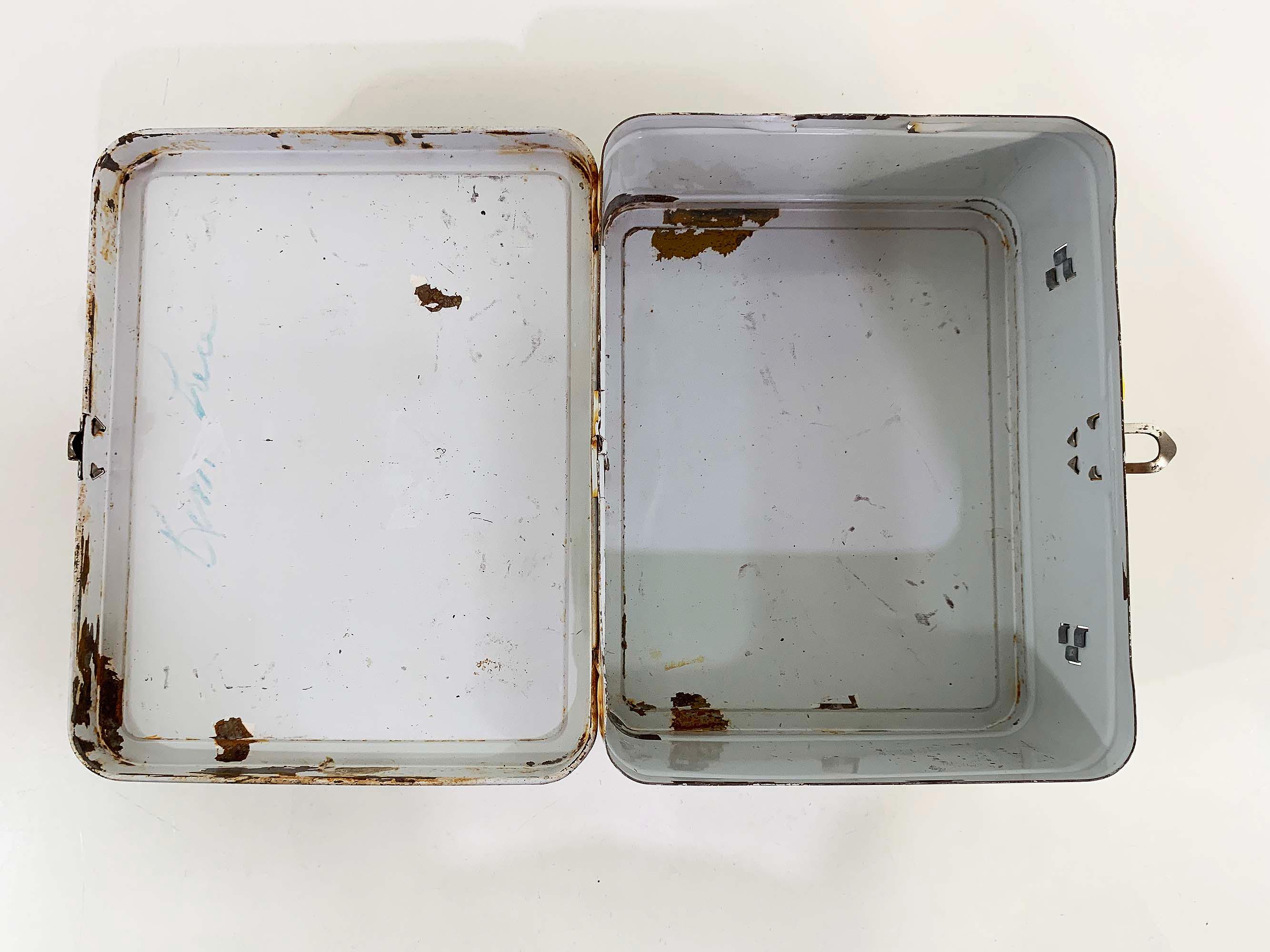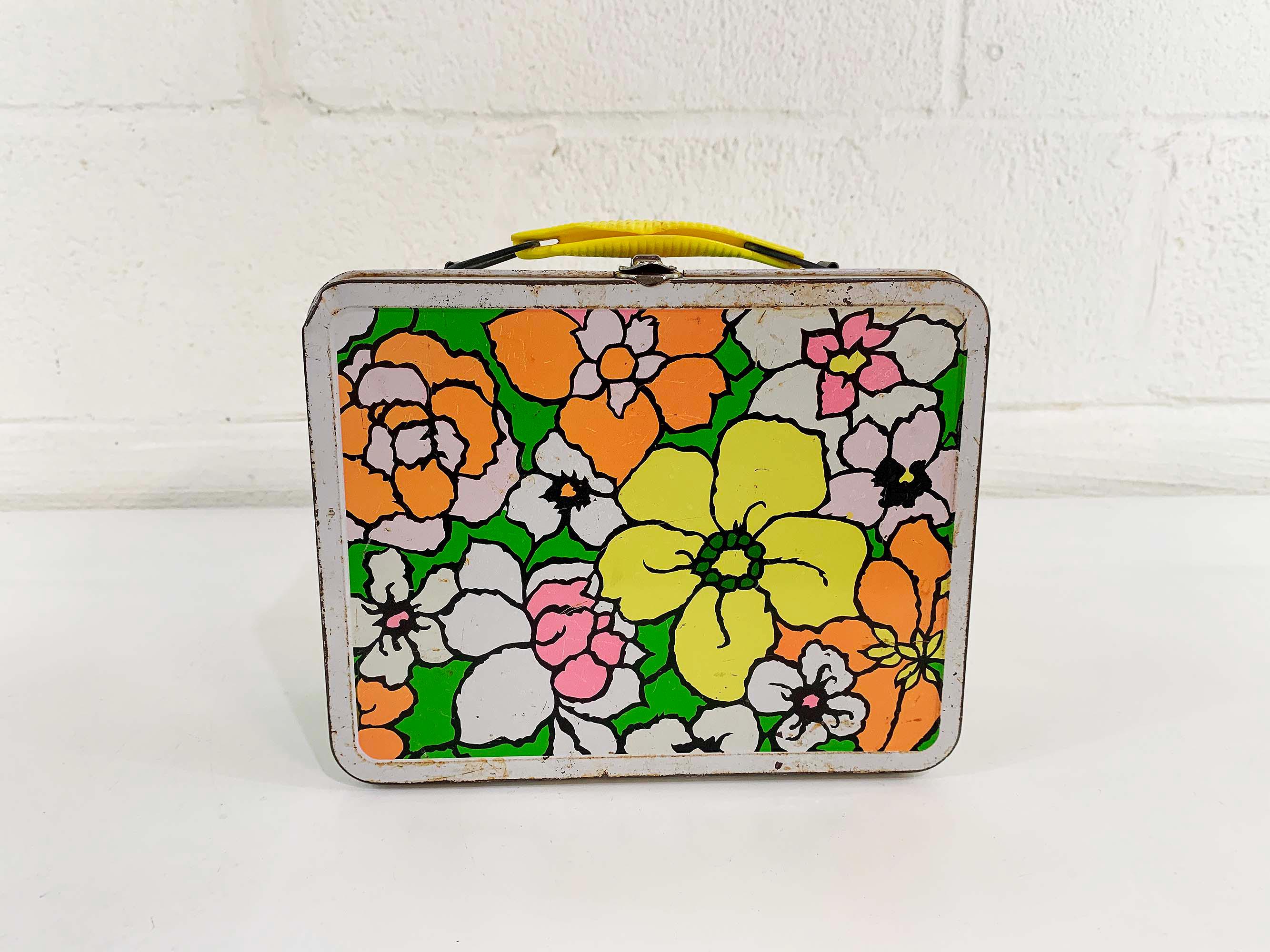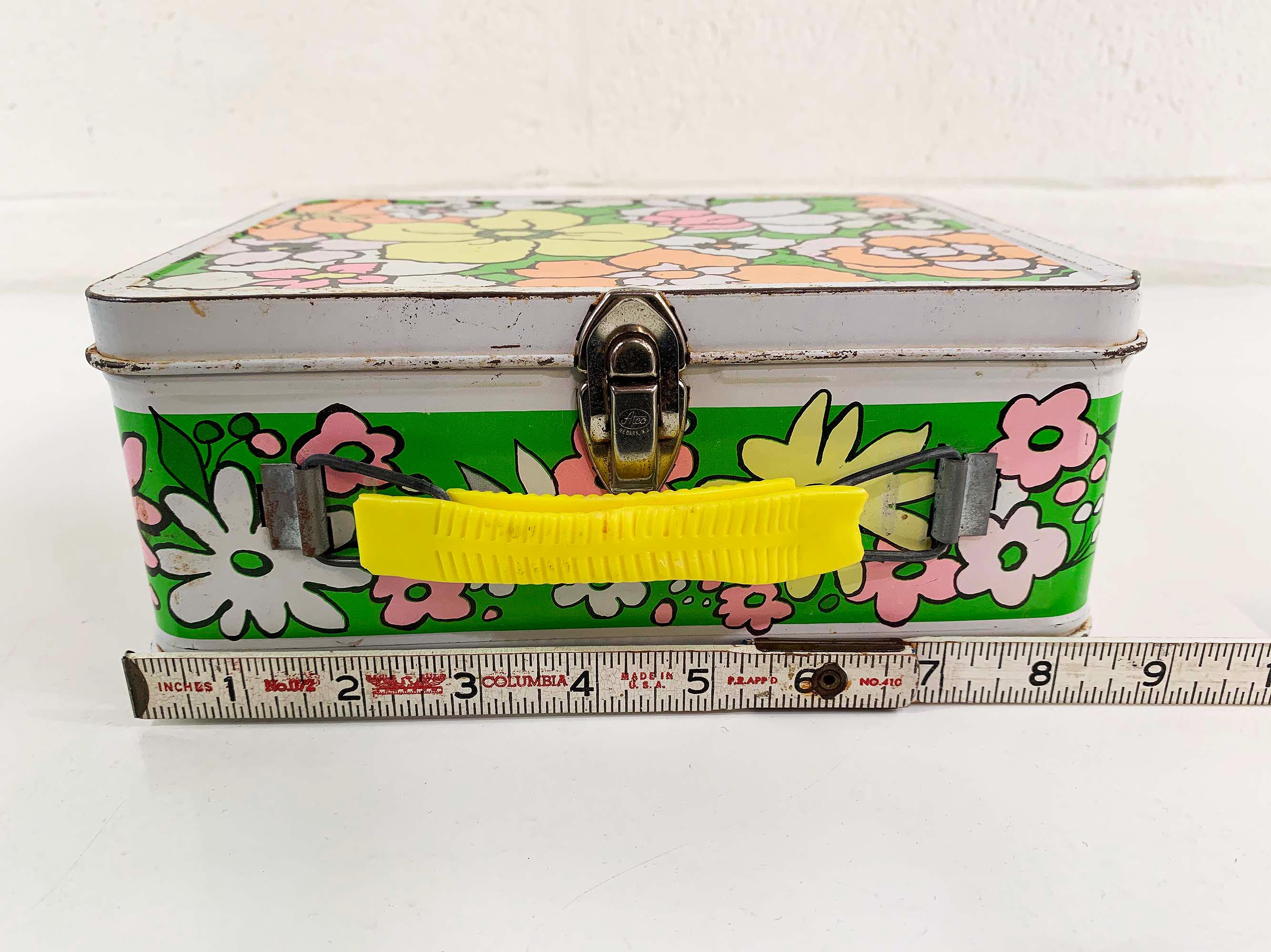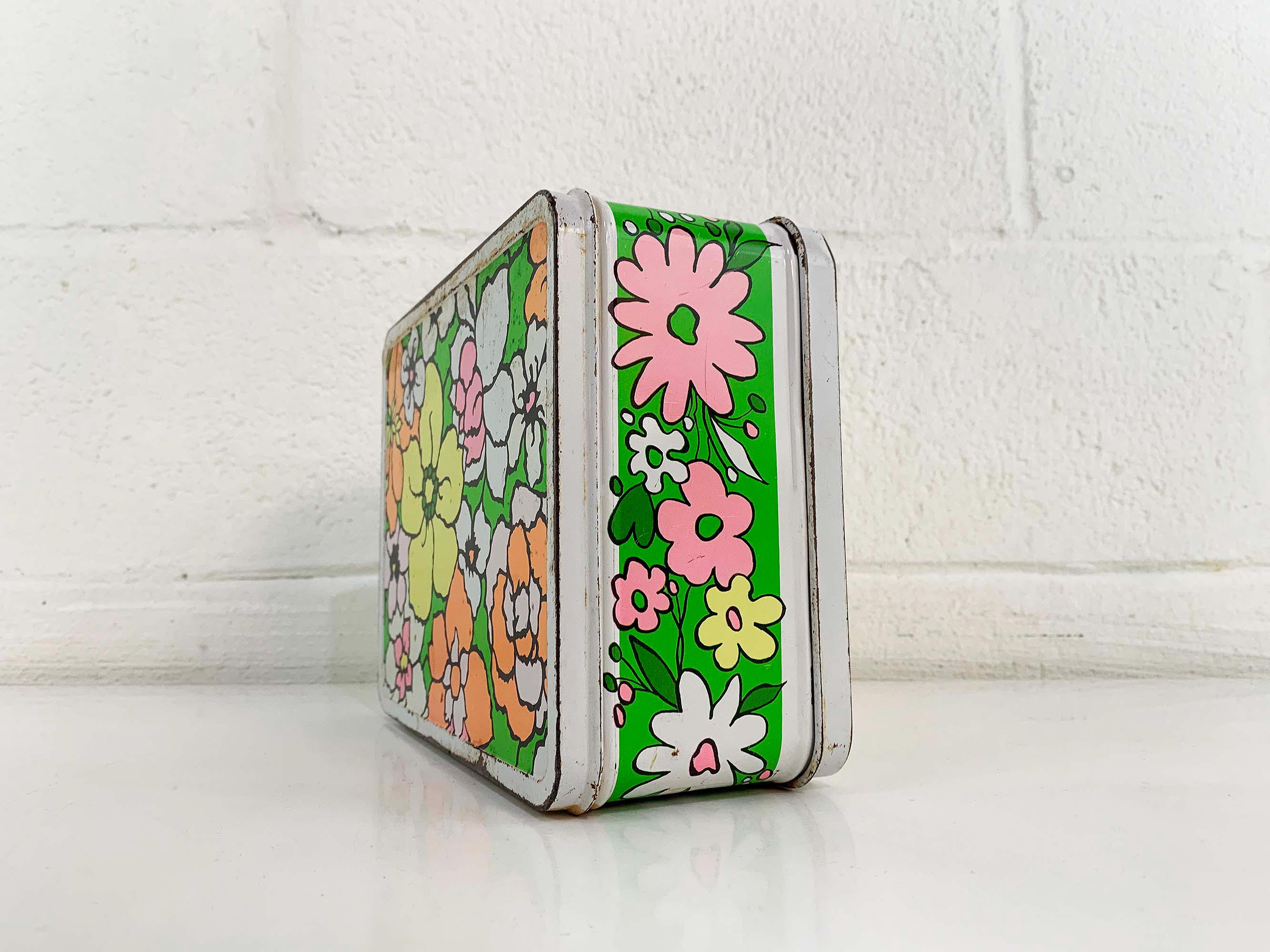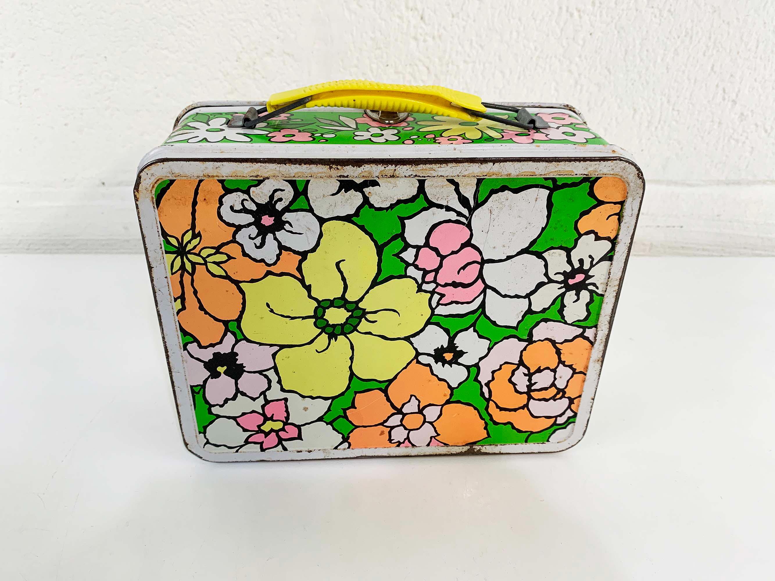 Very groovy bright floral lunch box made by Ohio Art. In fair condition with some all over rust, scuffs, scratches, and wear. The lunch box is about 4 inches tall, 8 1/2 inches wide, and 6 1/2 inches deep.