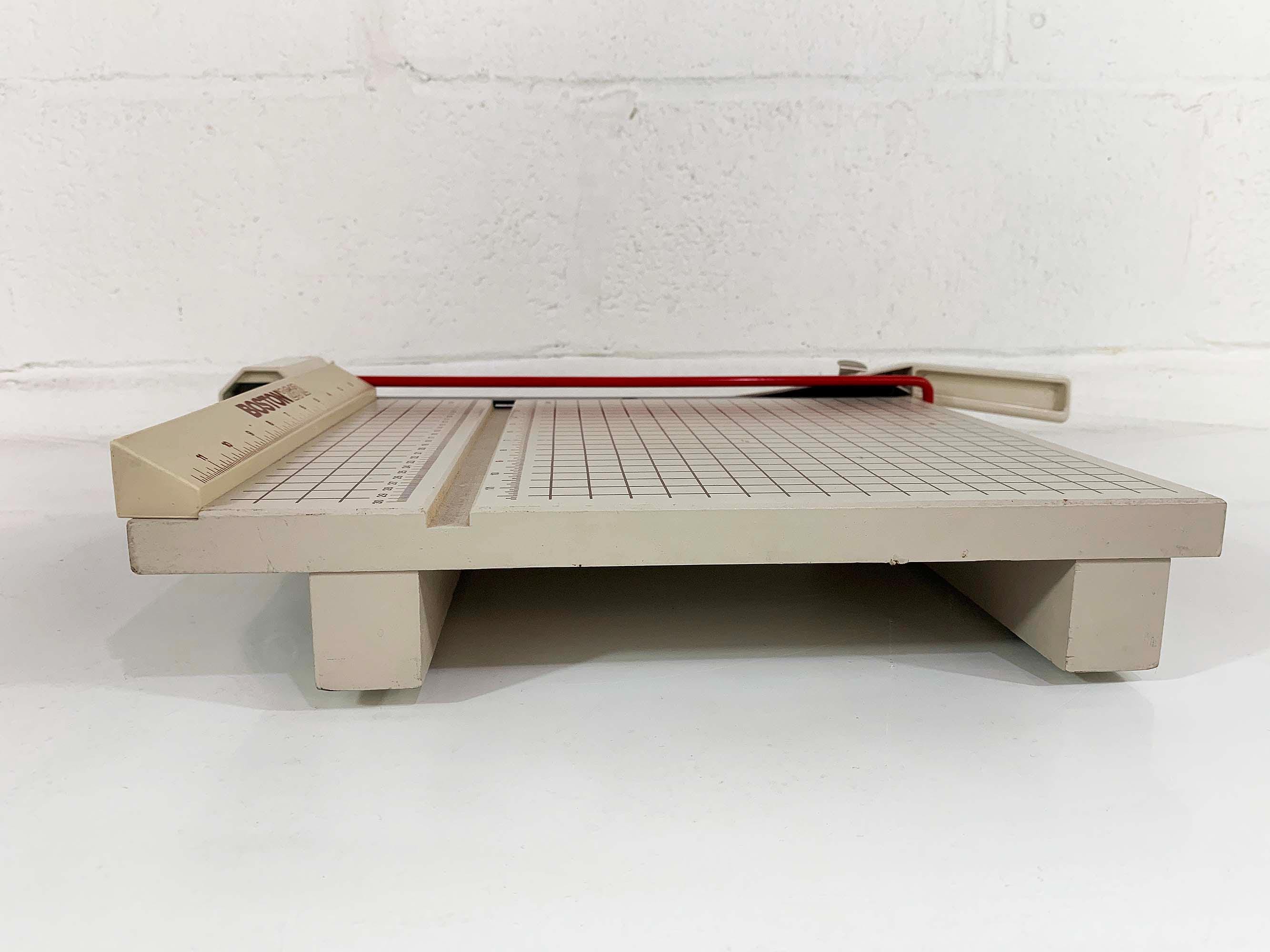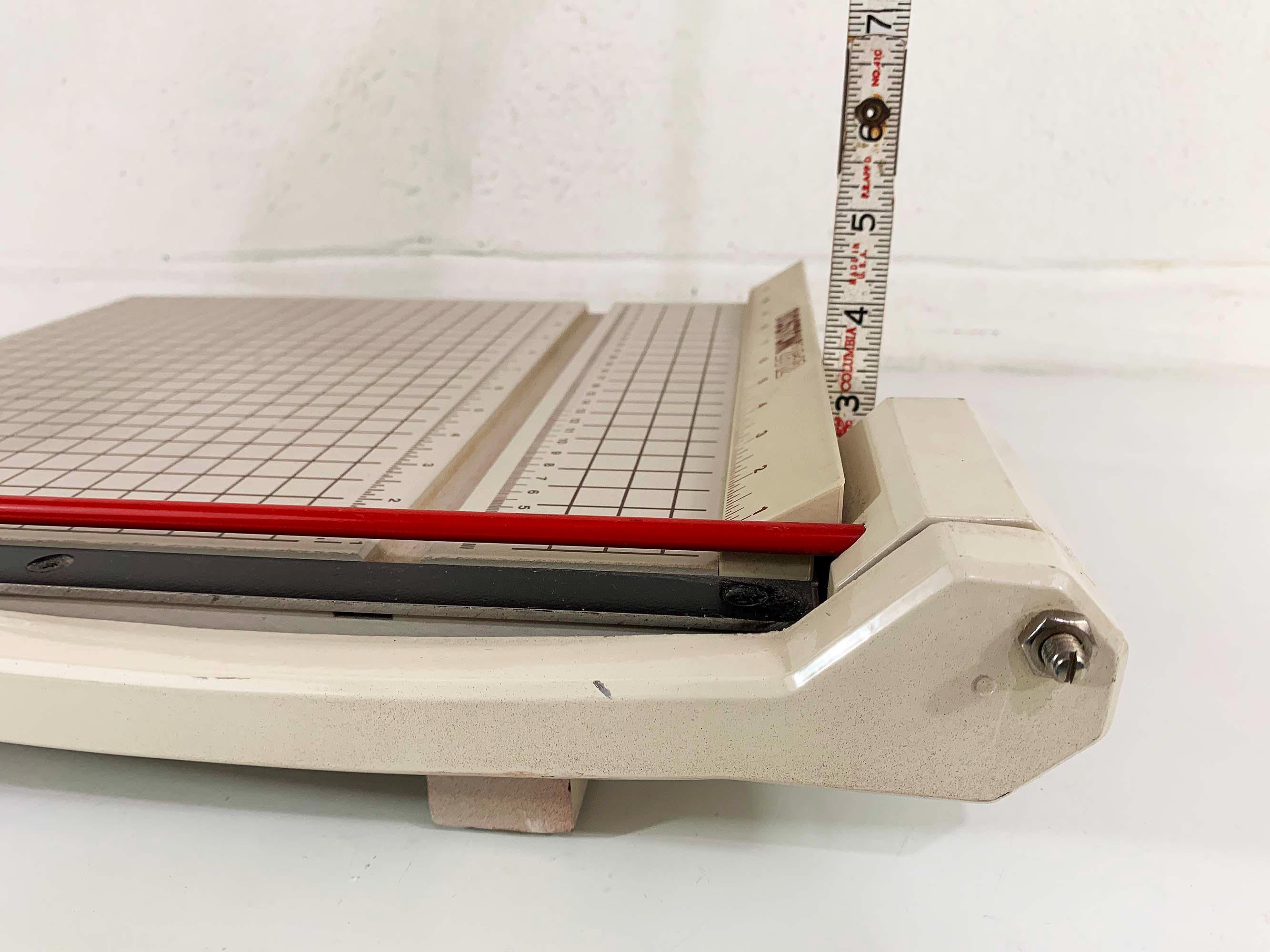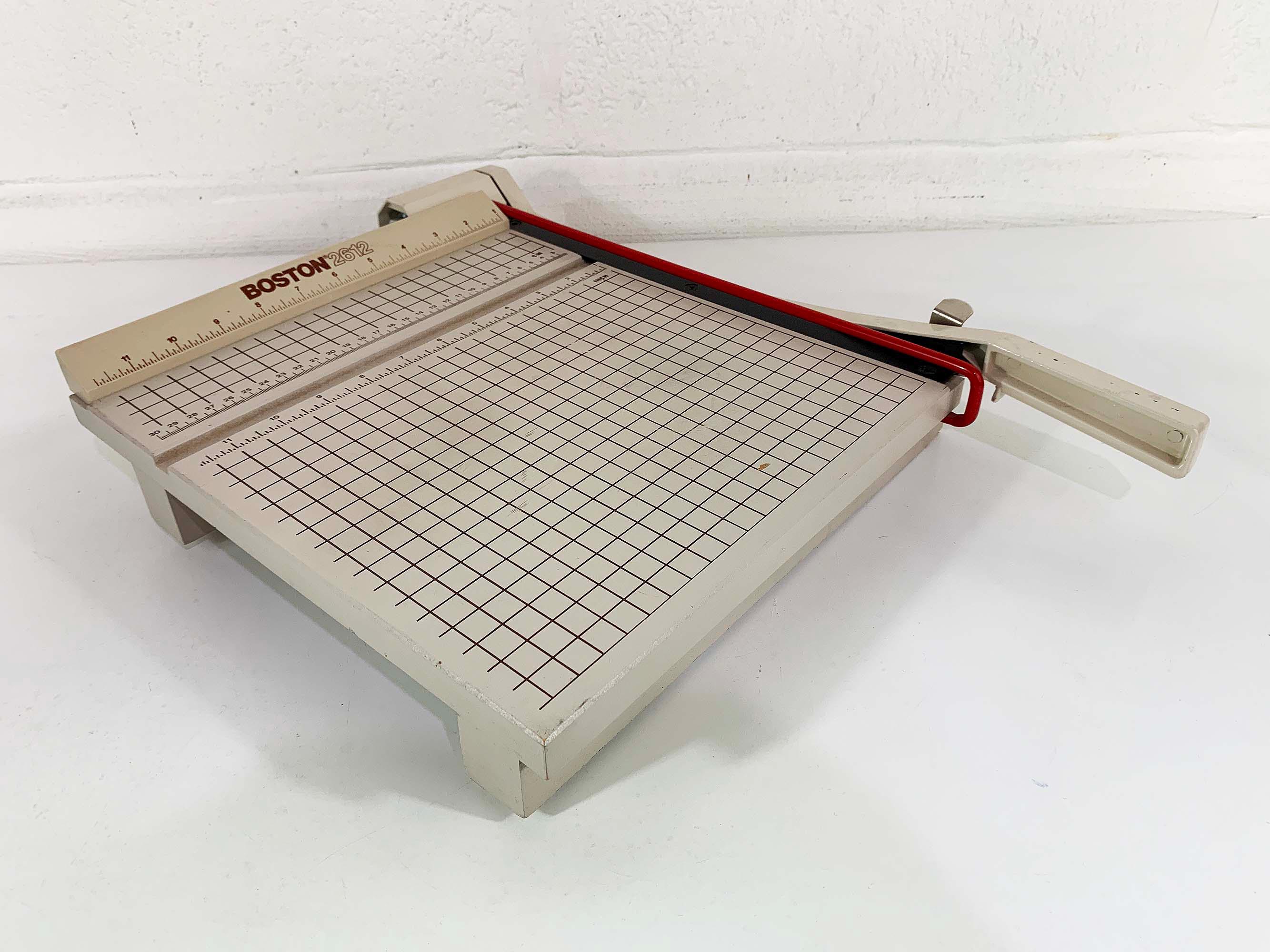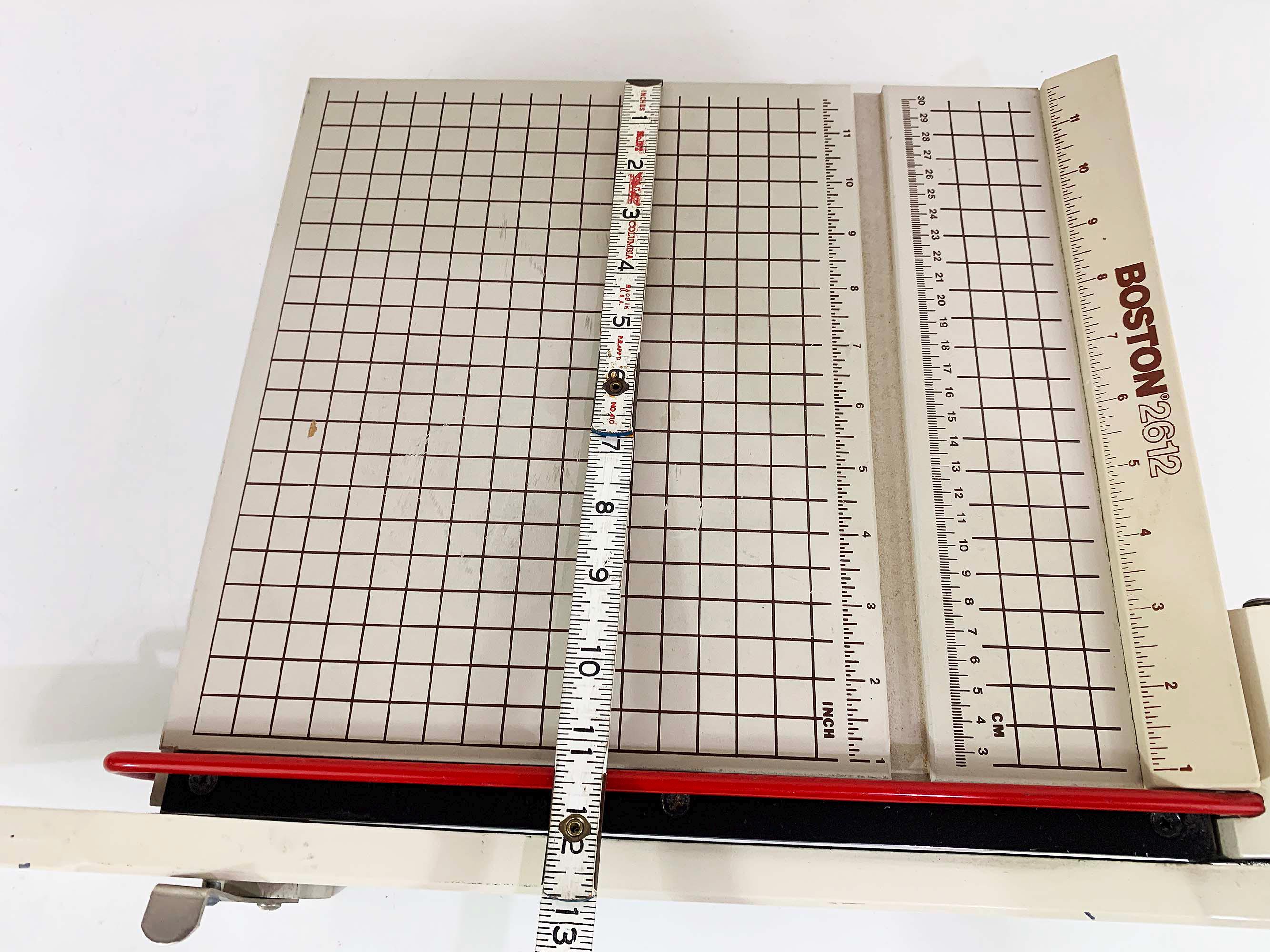 Heavy wooden and metal paper cutter made by Boston. Still works great! In excellent condition but it is missing a foot pad so it sits unevenly. The flat surface where the paper sits is approximately 12 inches tall and 11 inches wide.