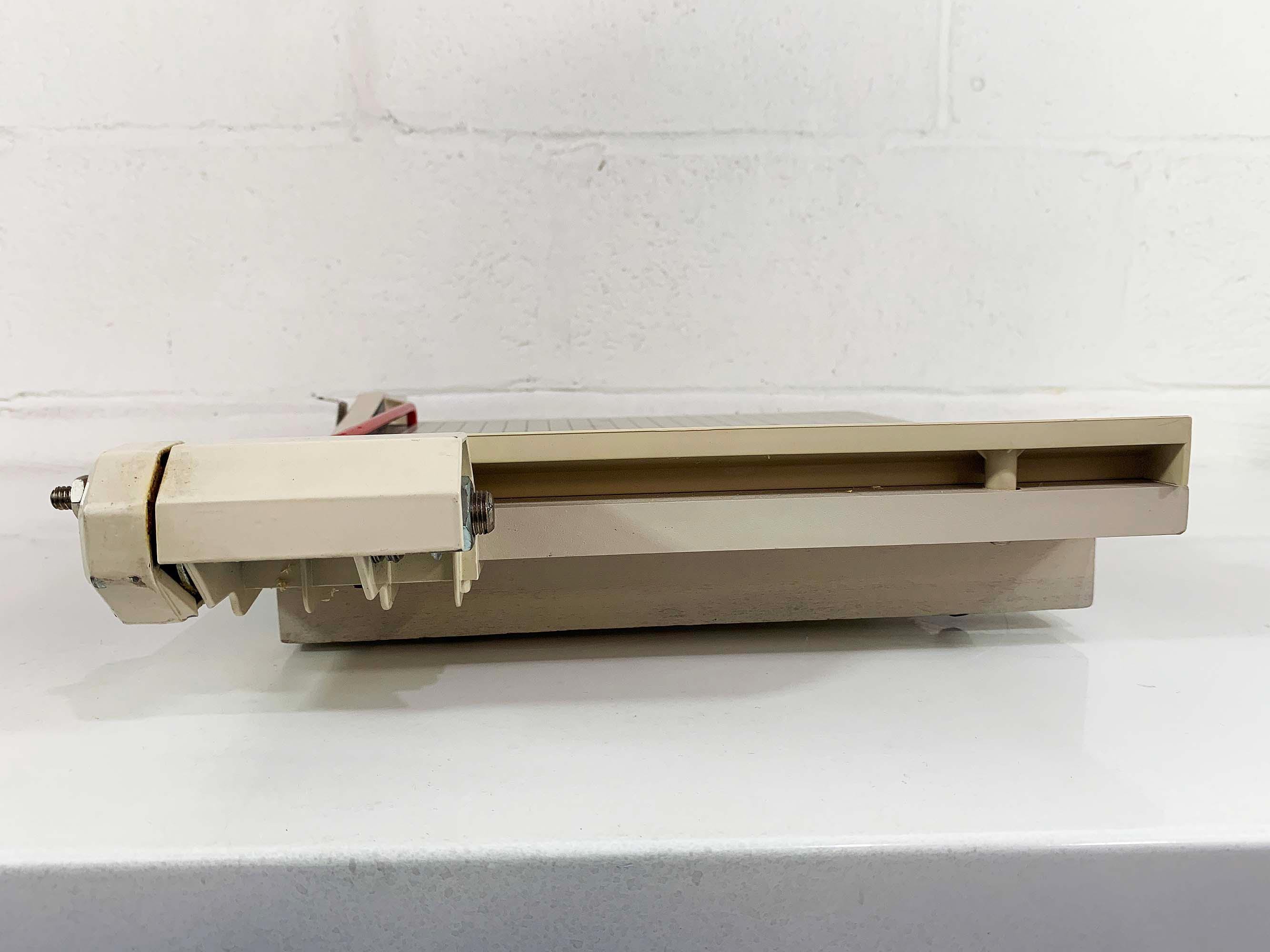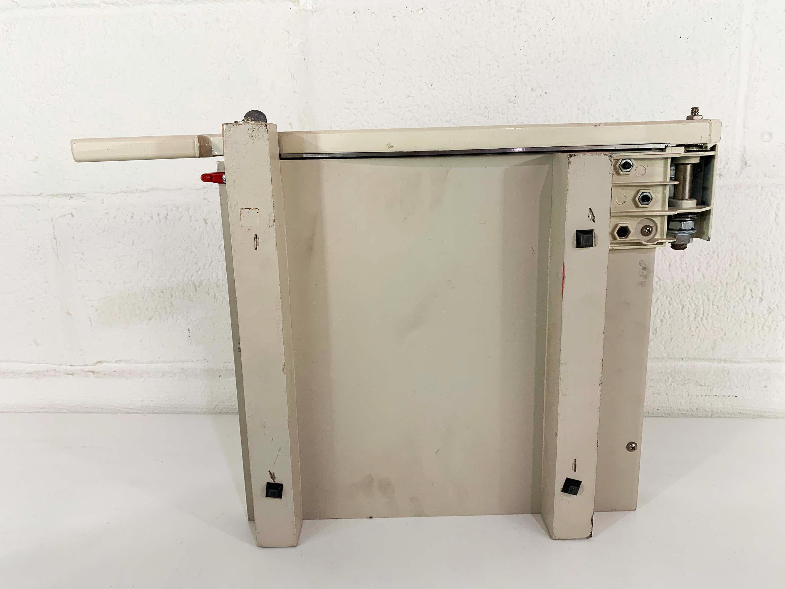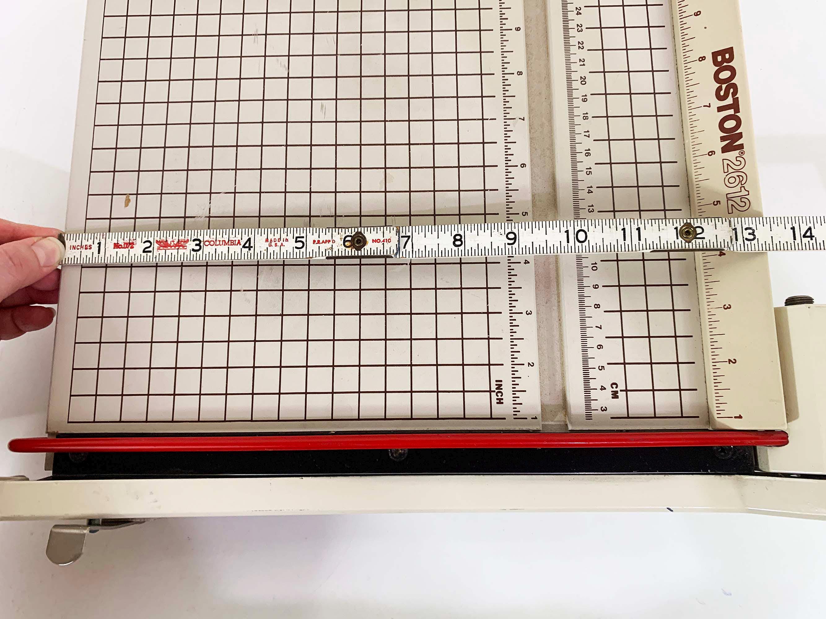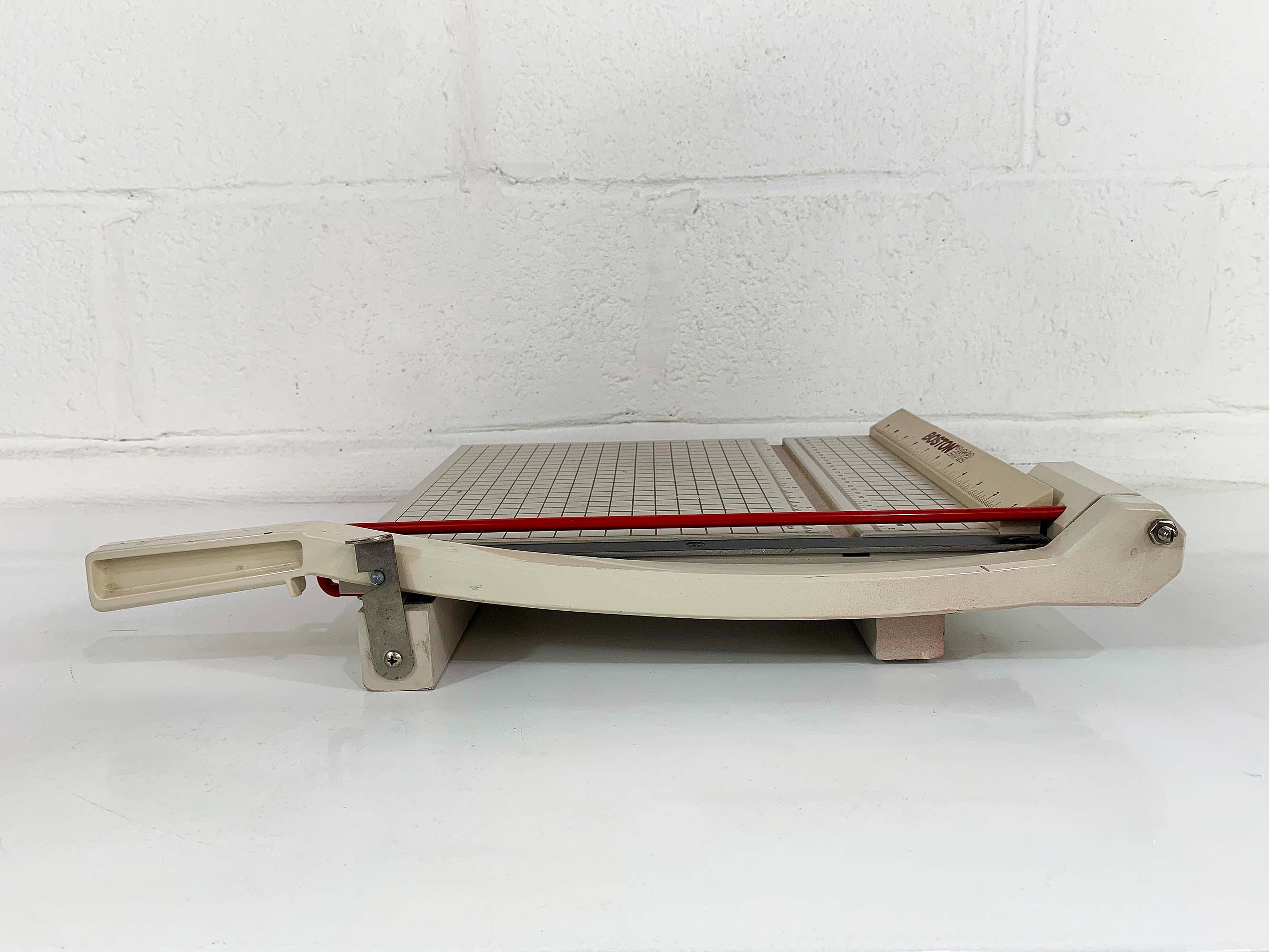 Heavy wooden and metal paper cutter made by Boston. Still works great! In excellent condition but it is missing a foot pad so it sits unevenly. The flat surface where the paper sits is approximately 12 inches tall and 11 inches wide.