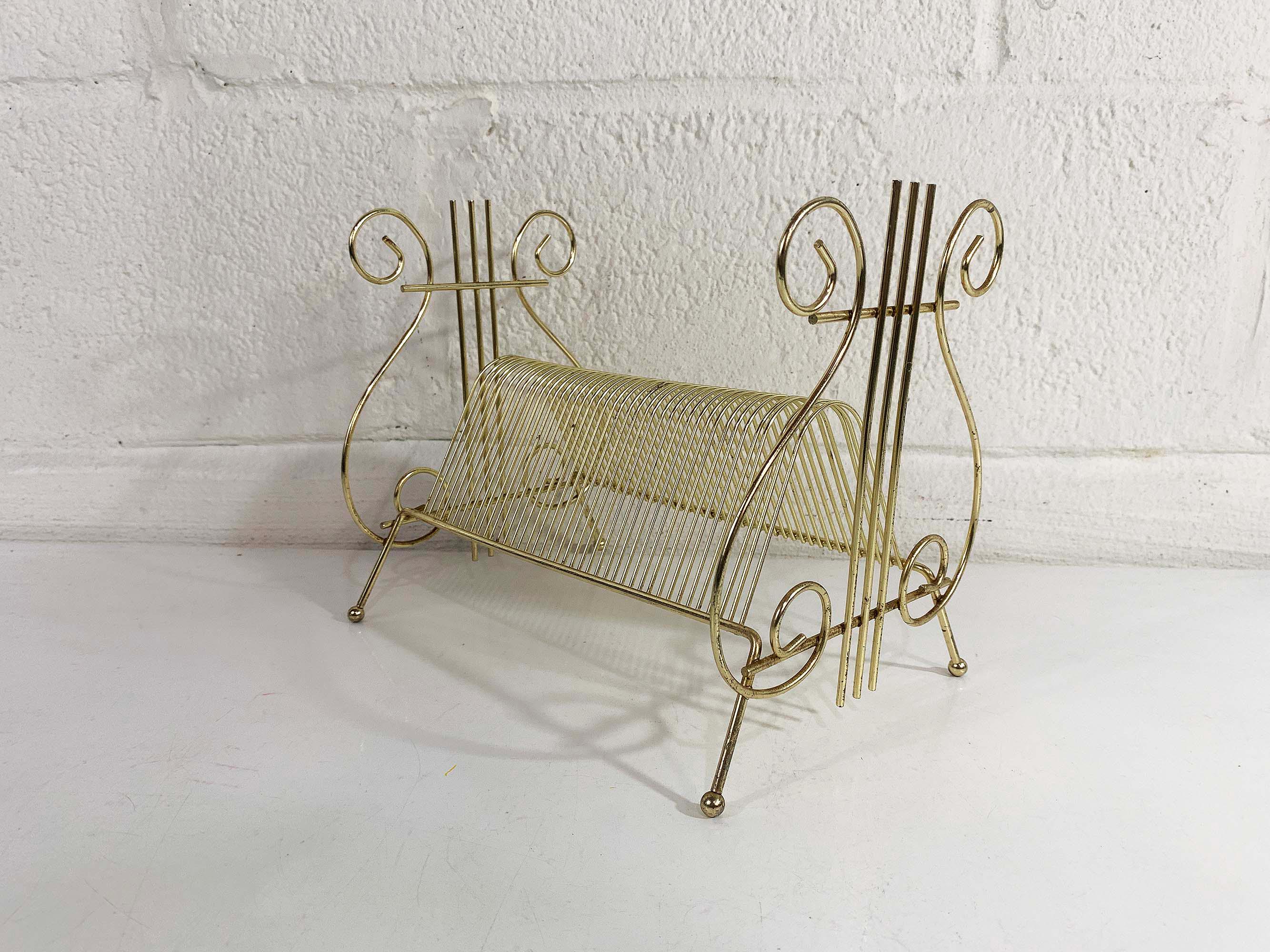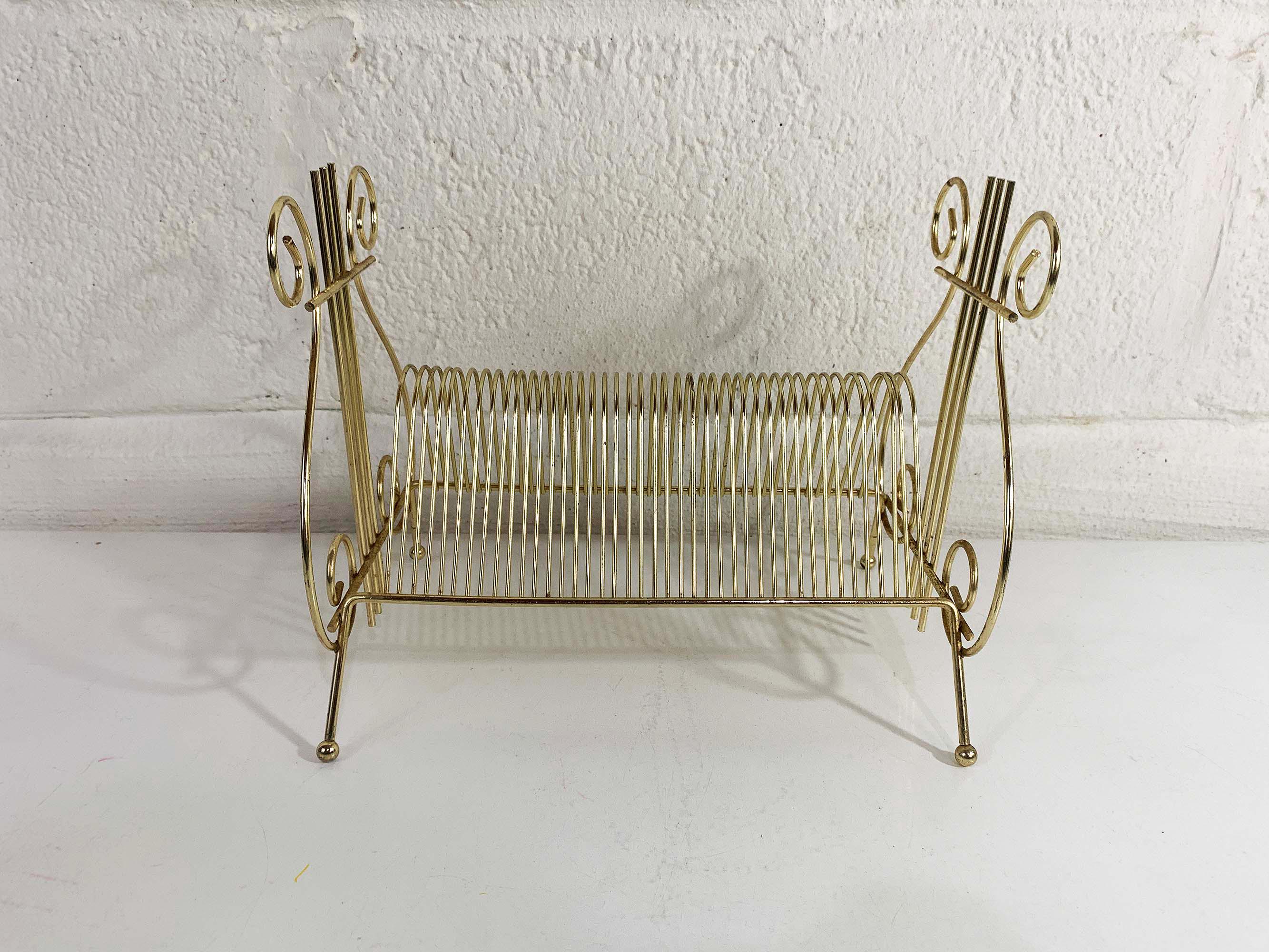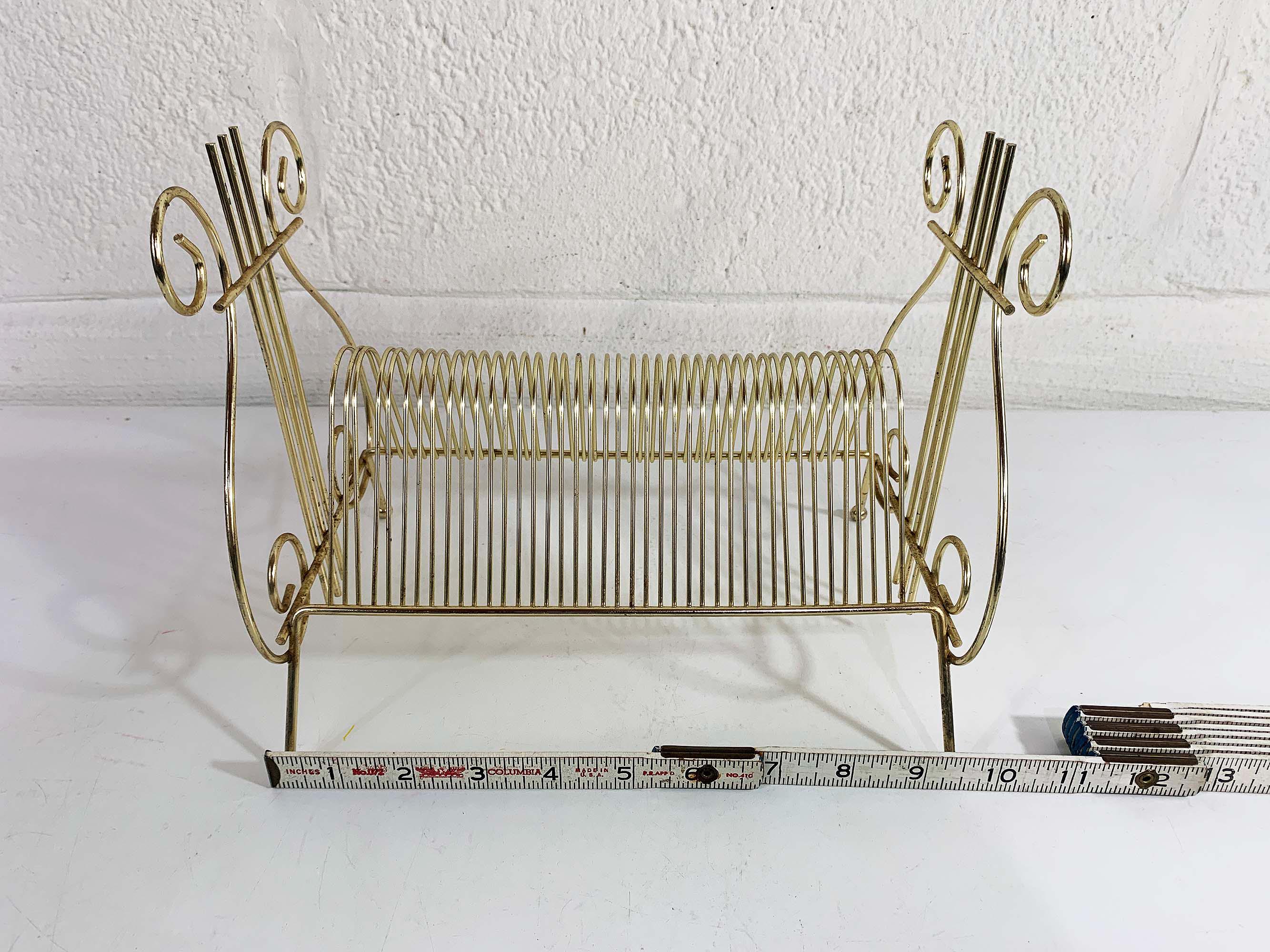 Super cool golden metal 45 record rack. Can be used to hold a variety of items but these were originally made to hold 7 inch records. Good overall condition some all over rust and wear. The rack is 9 inches long, 6 1/2 inches wide, and 7 1/2 inches tall.