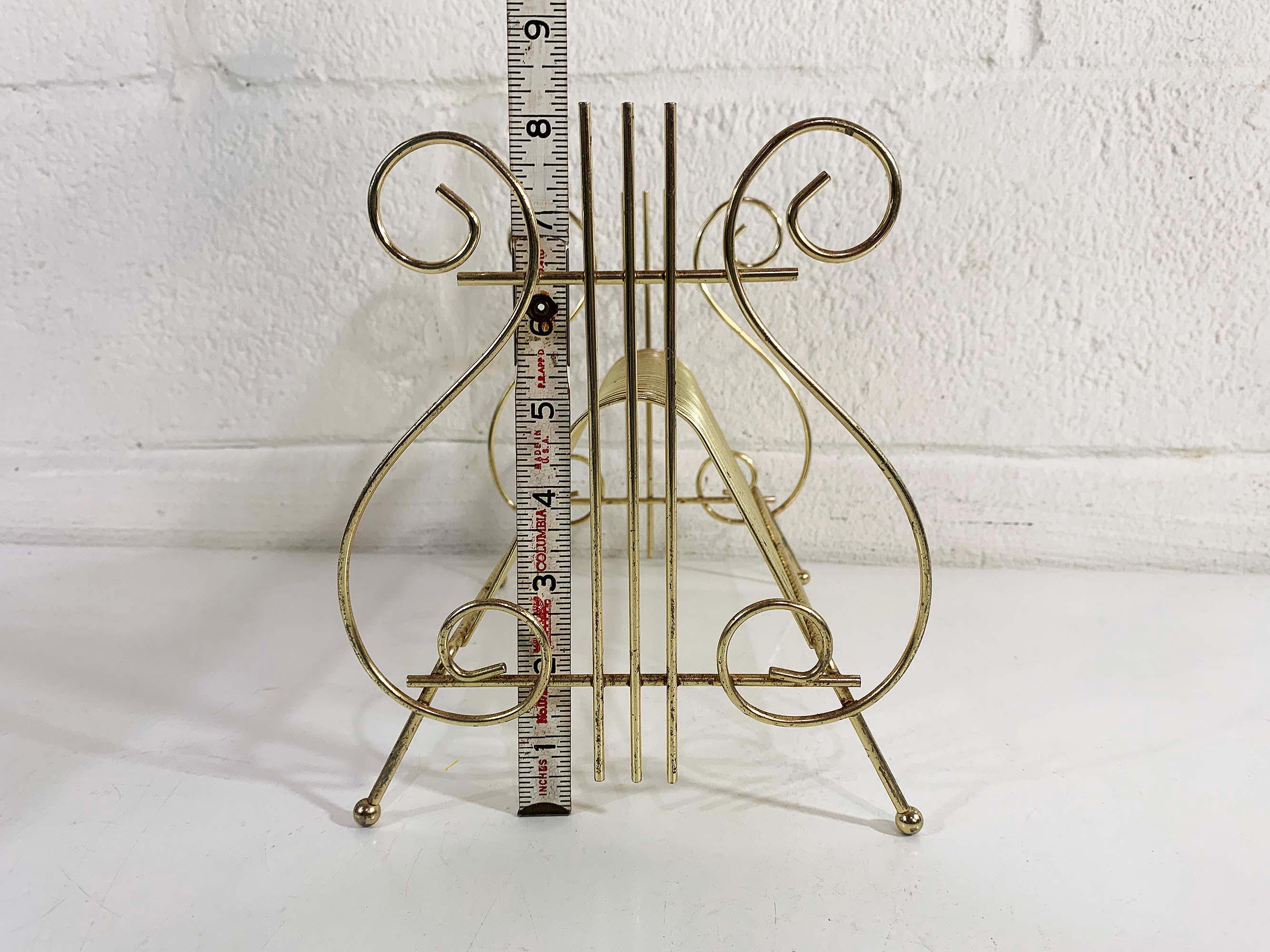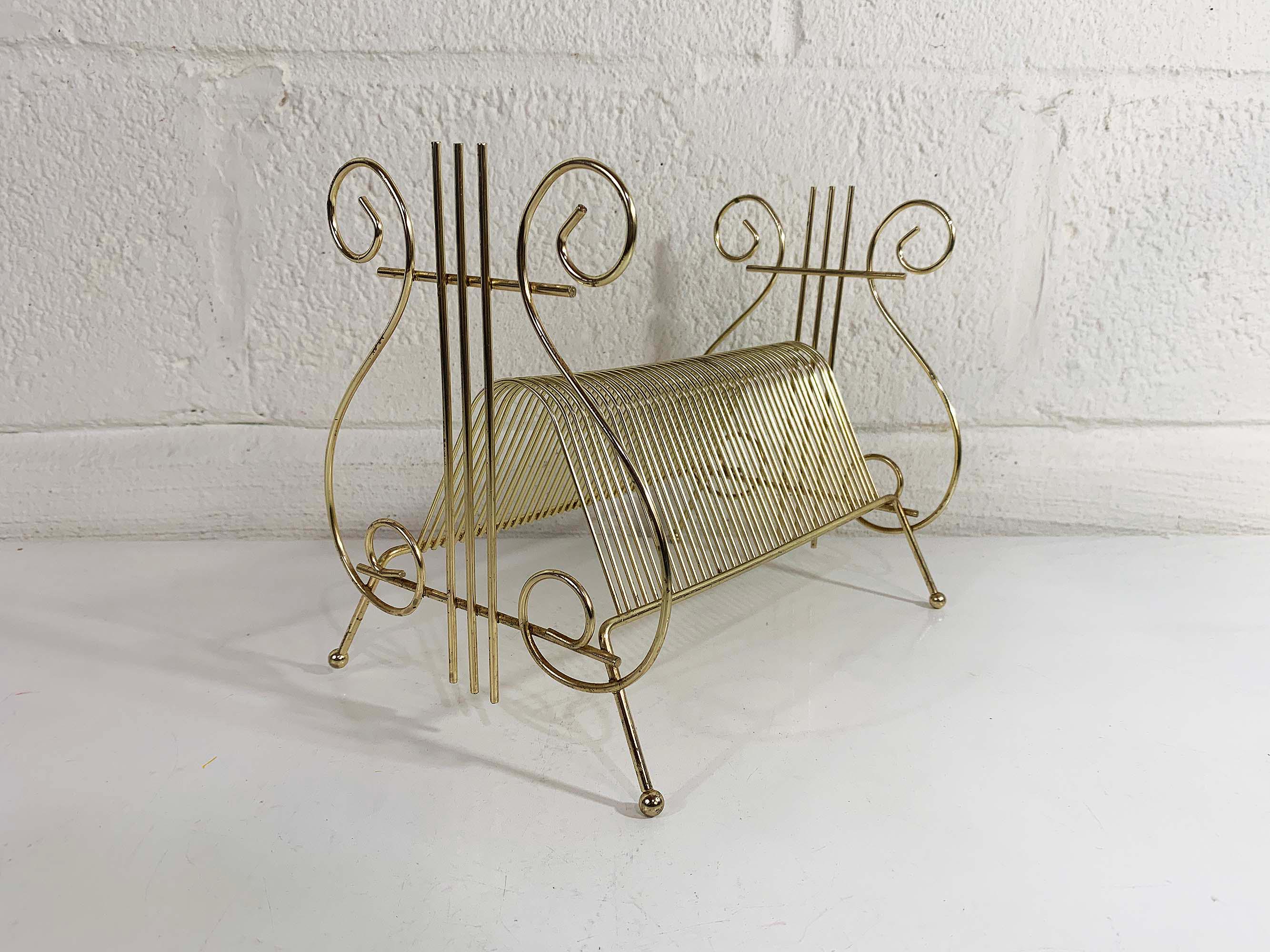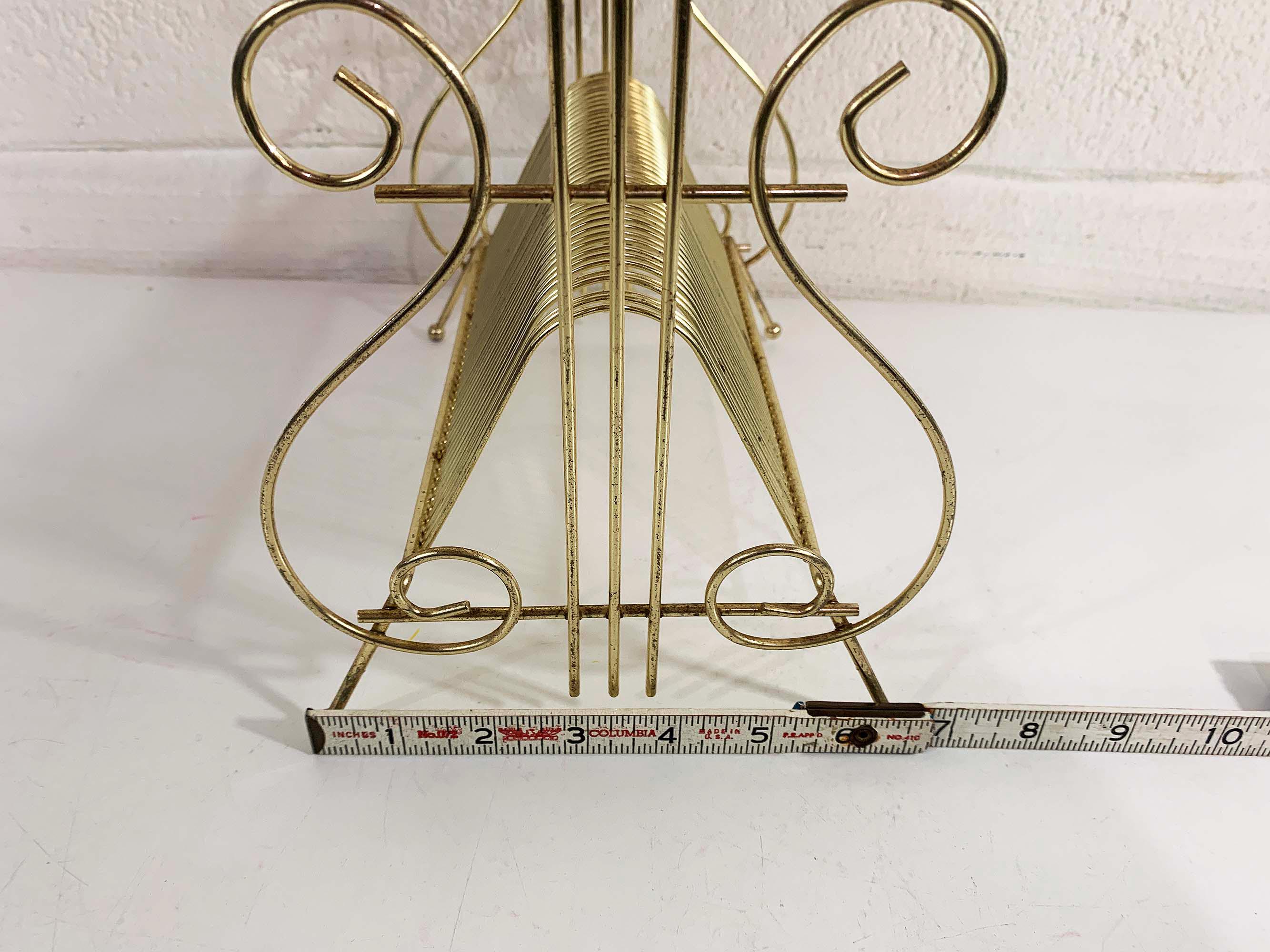 Super cool golden metal 45 record rack. Can be used to hold a variety of items but these were originally made to hold 7 inch records. Good overall condition some all over rust and wear. The rack is 9 inches long, 6 1/2 inches wide, and 7 1/2 inches tall.