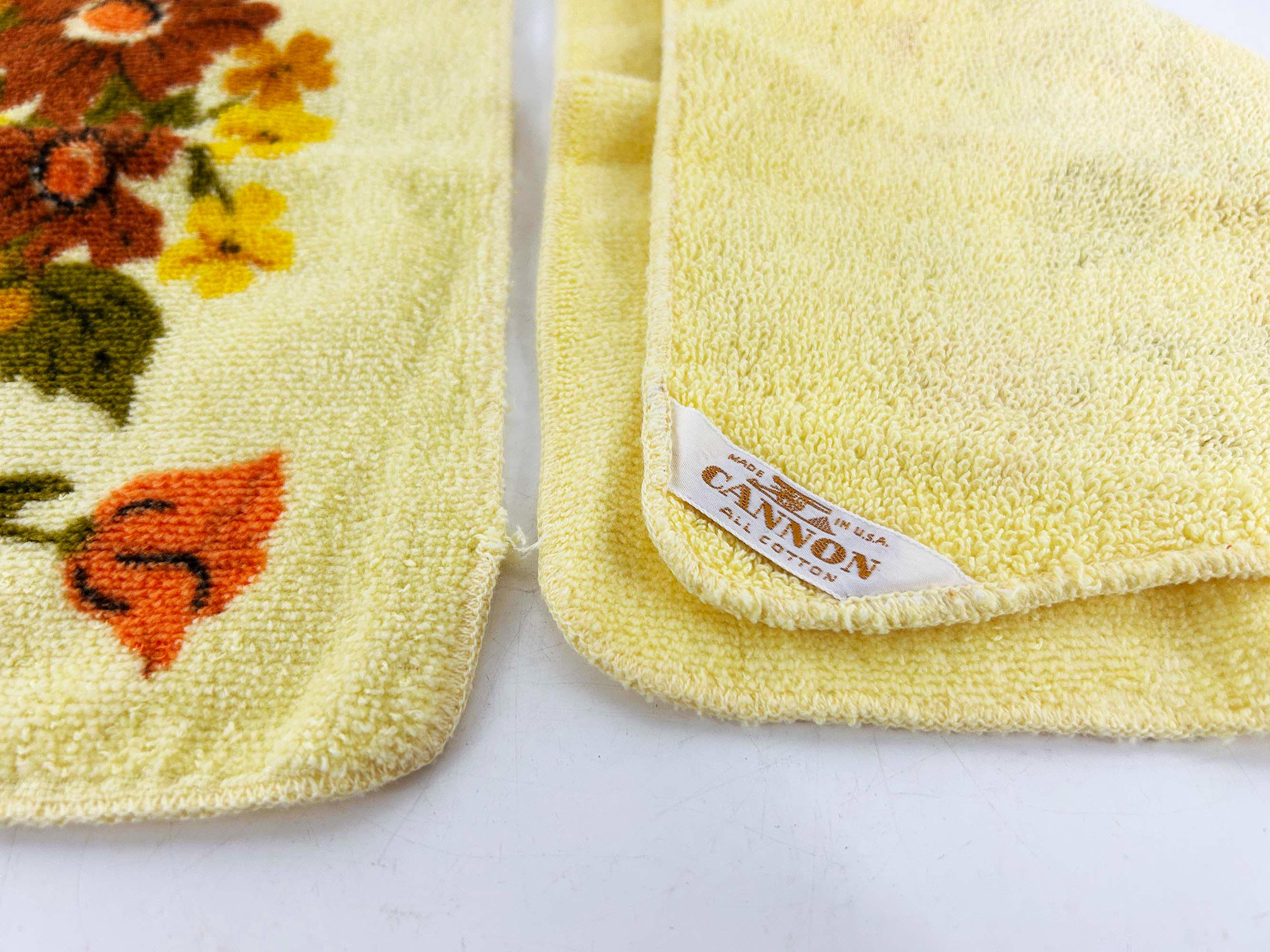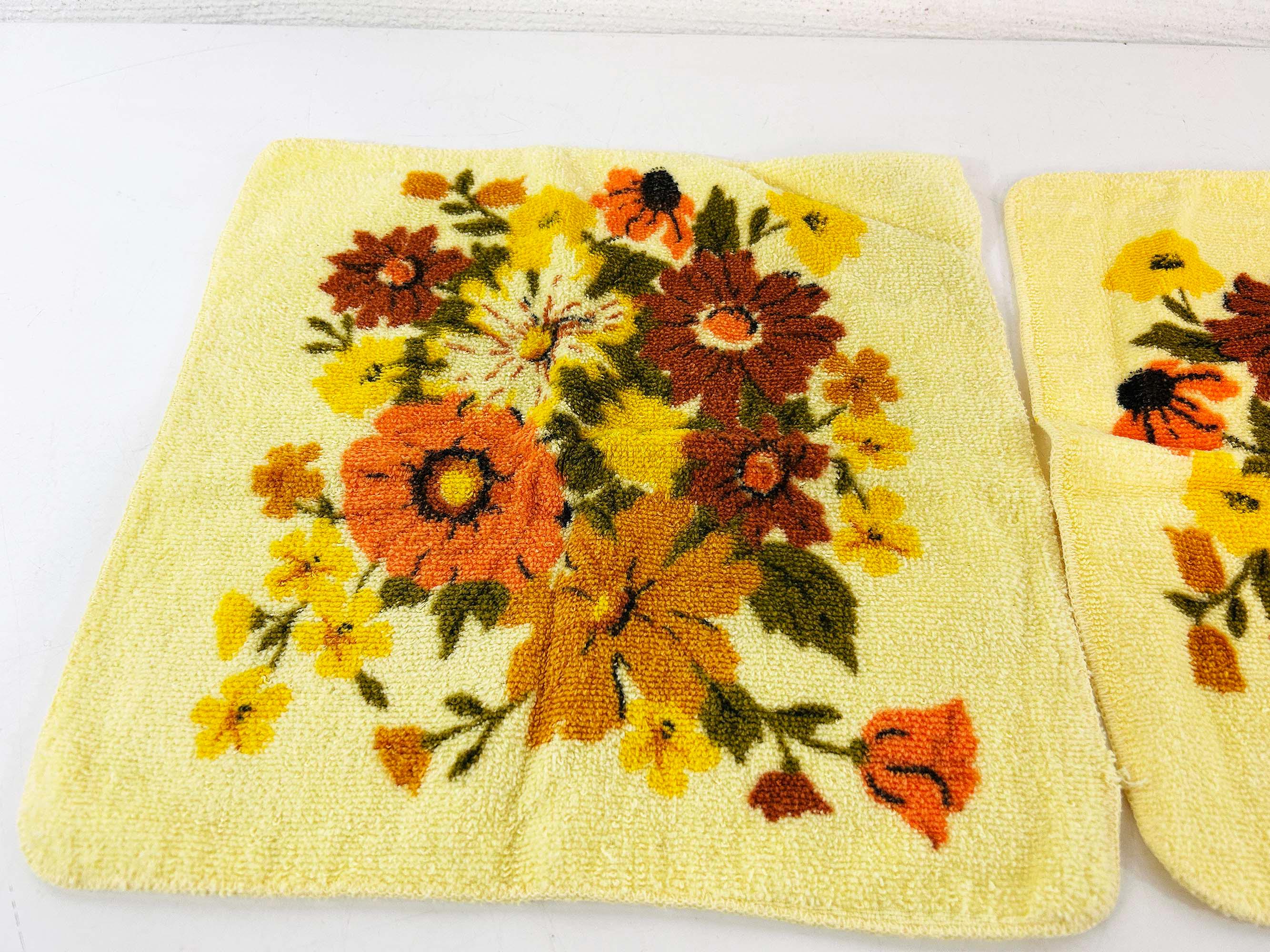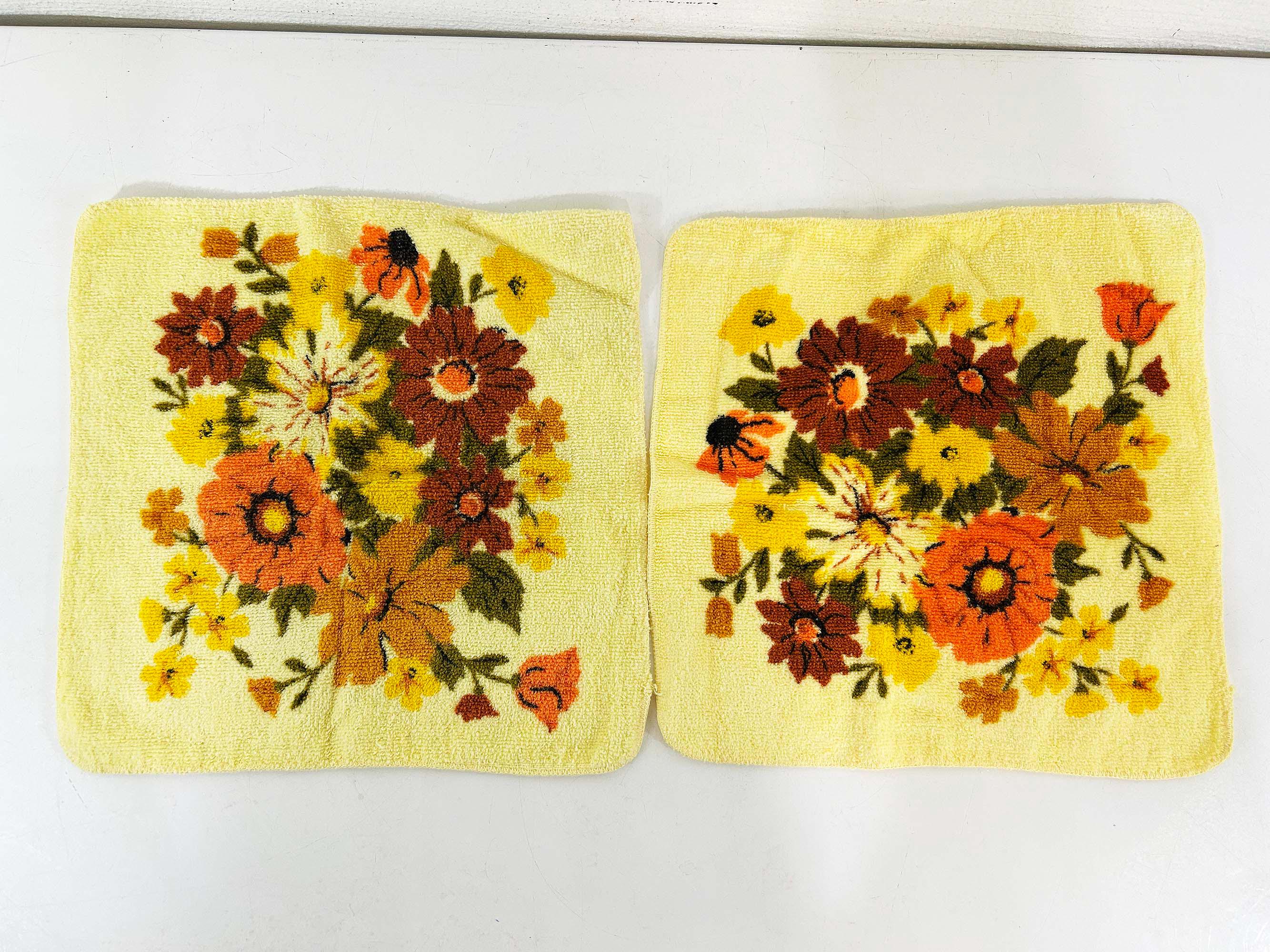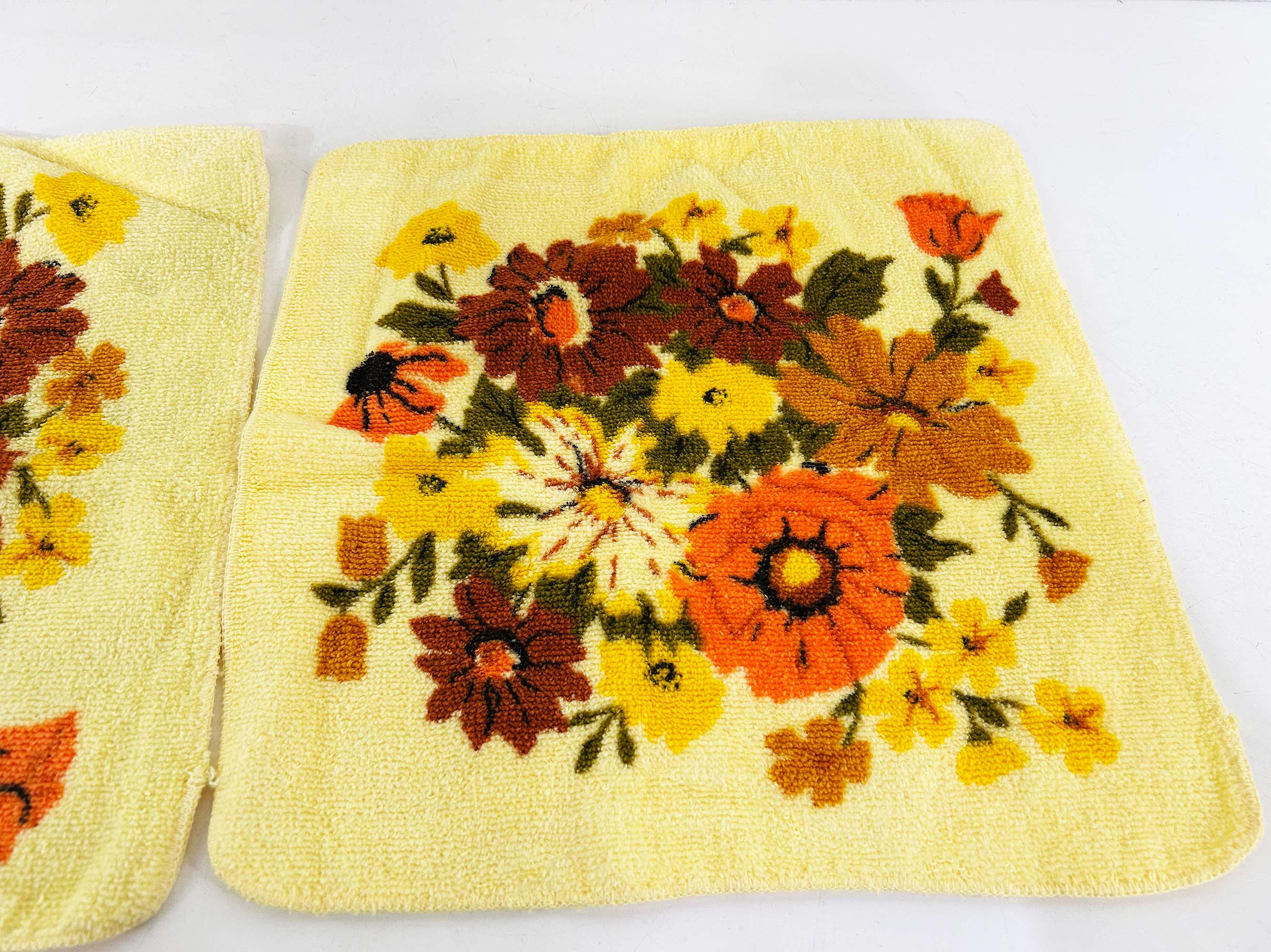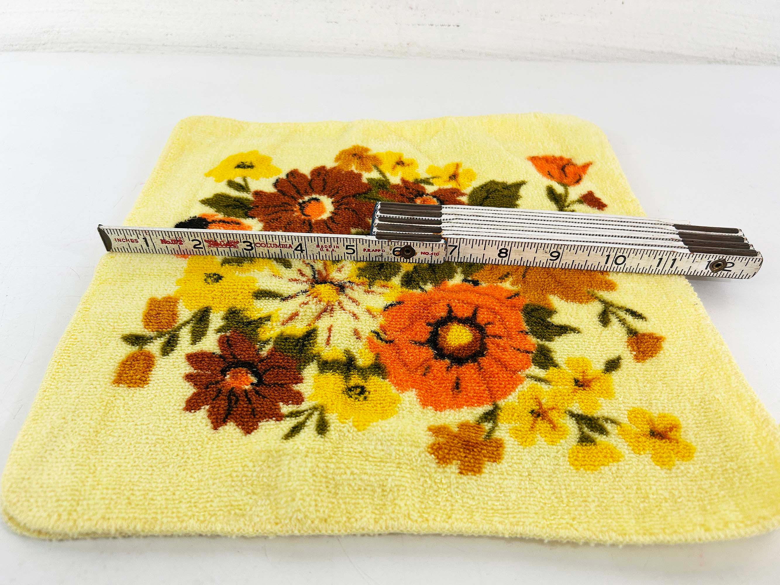 Super cute set of 2 yellow and orange floral washcloths - perfect for your vintage bathroom! Each towel is approximately 11 1/2 inches square.