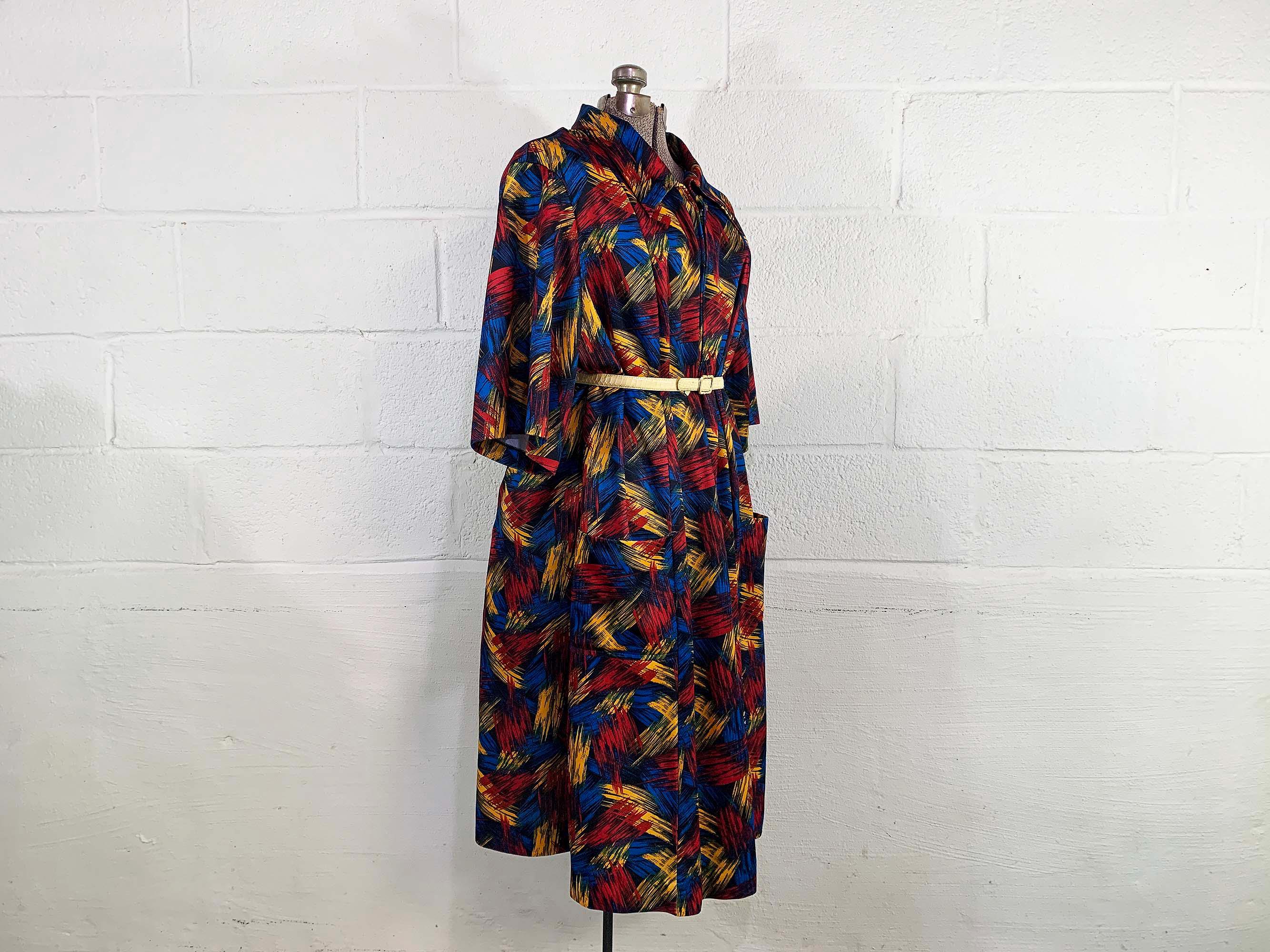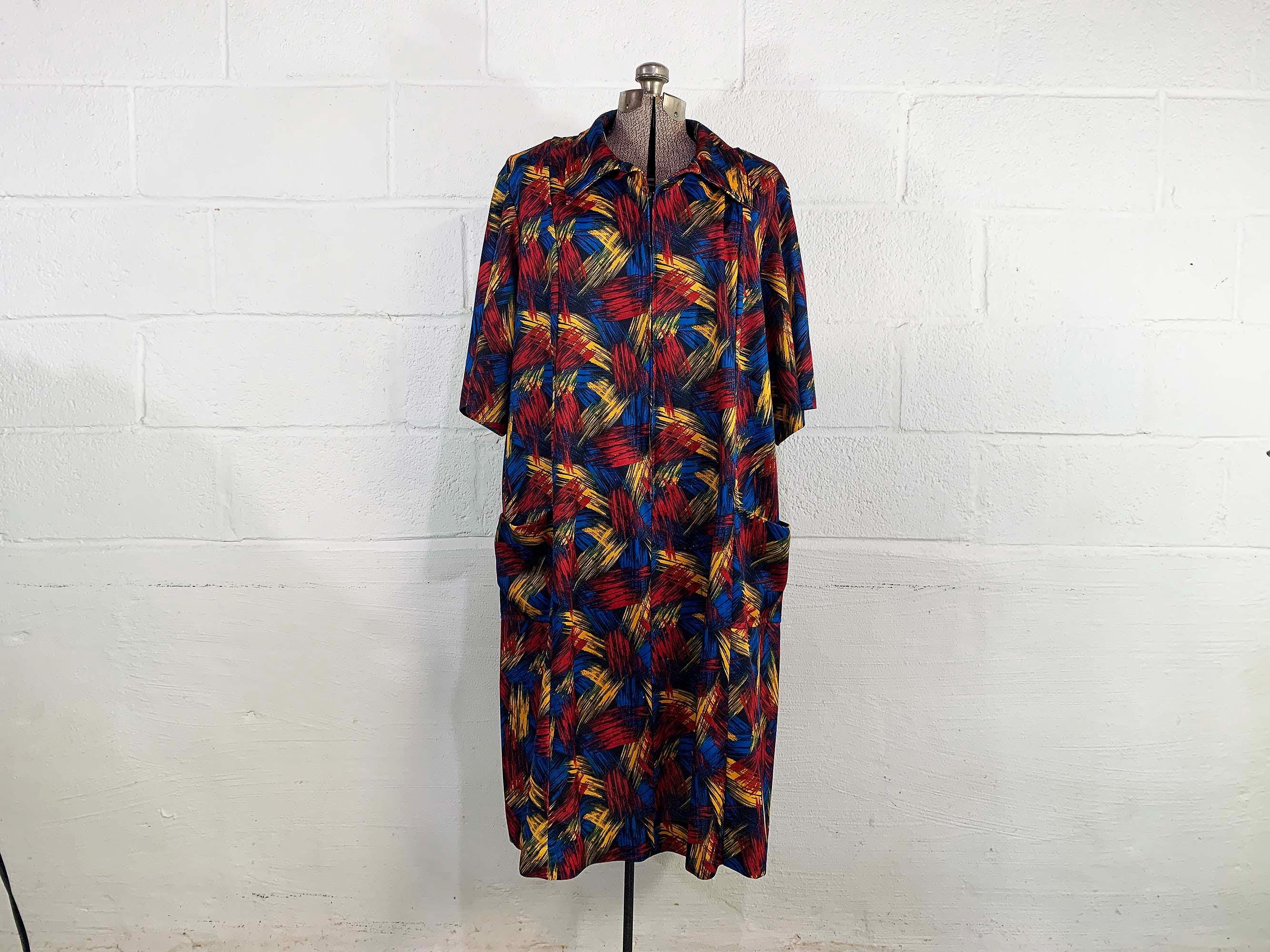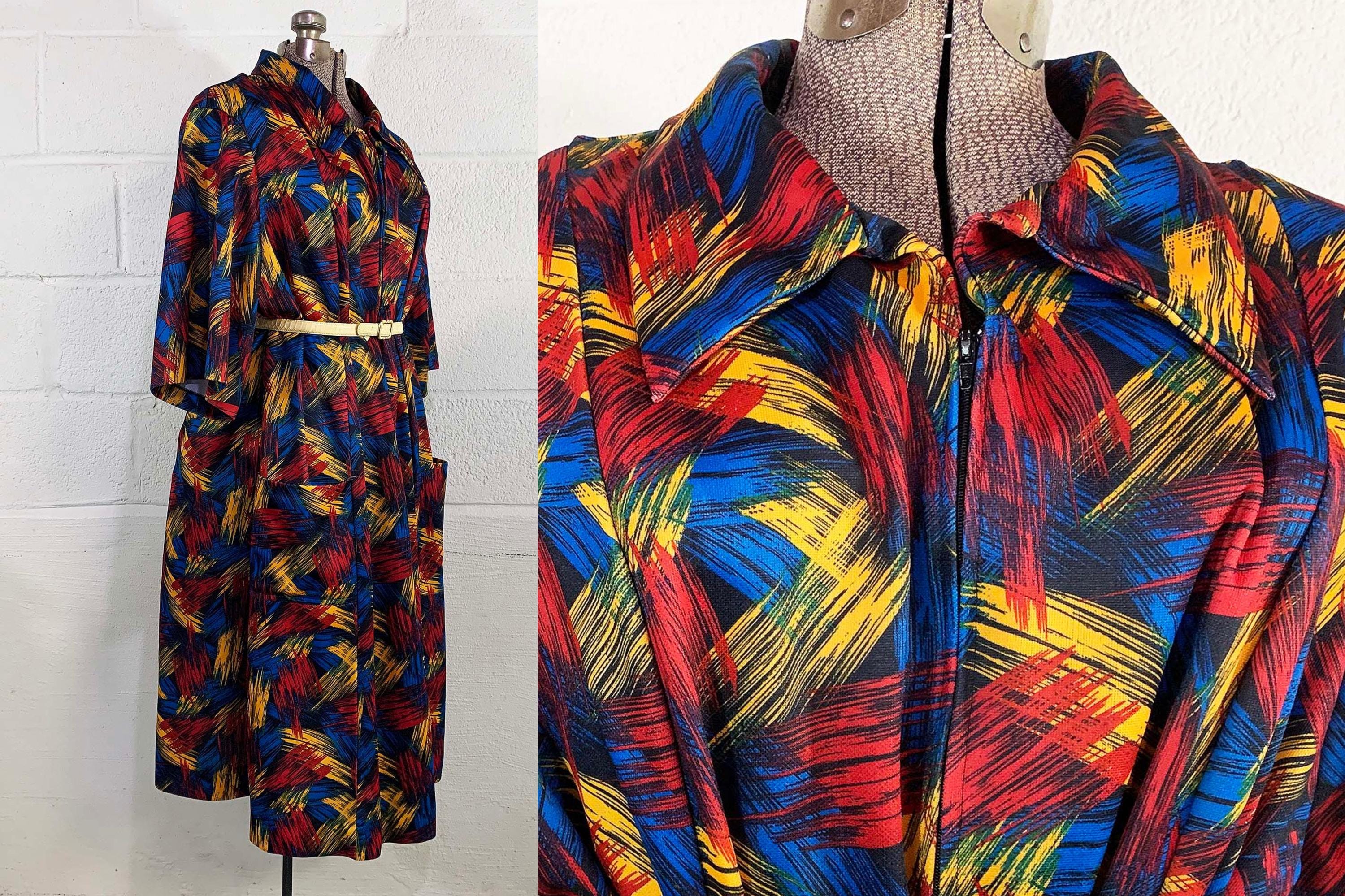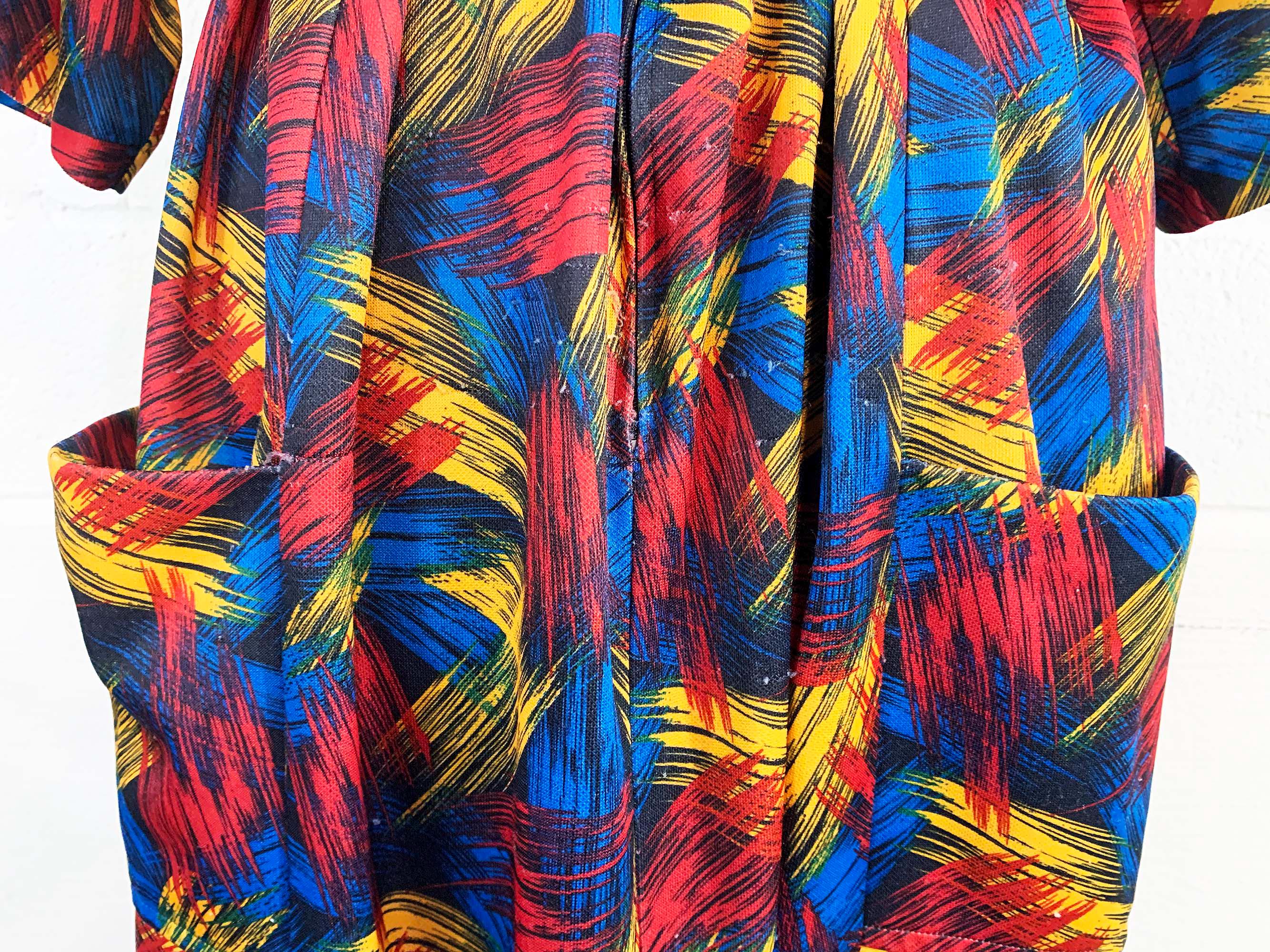Lovely paint brush patterned short sleeve dress. It has two patch pockets, dagger collar, and a half zipper in the front. Fabric has stretch. There are a few snags and some pilling on the dress - please be sure to inspect all photos.