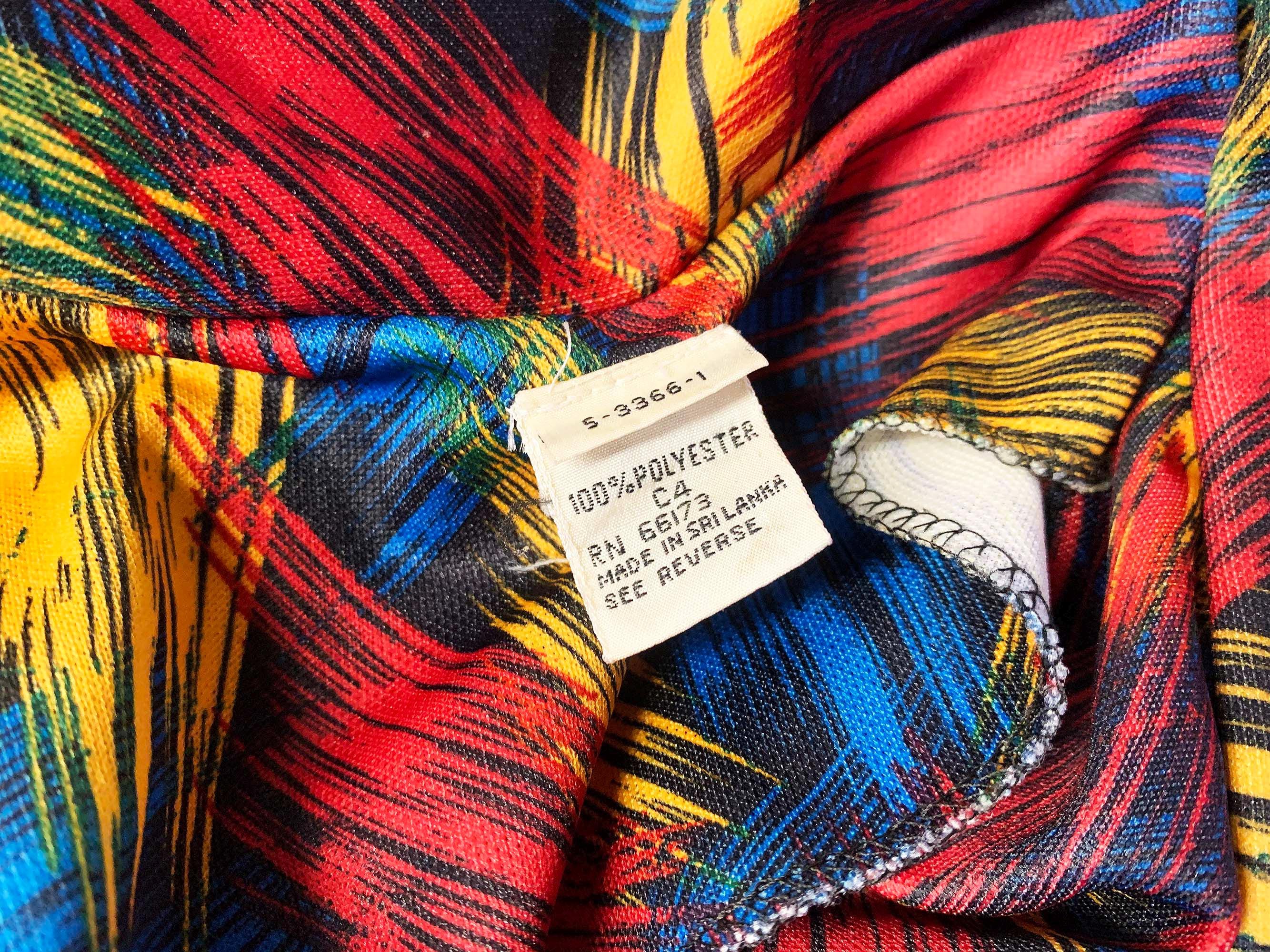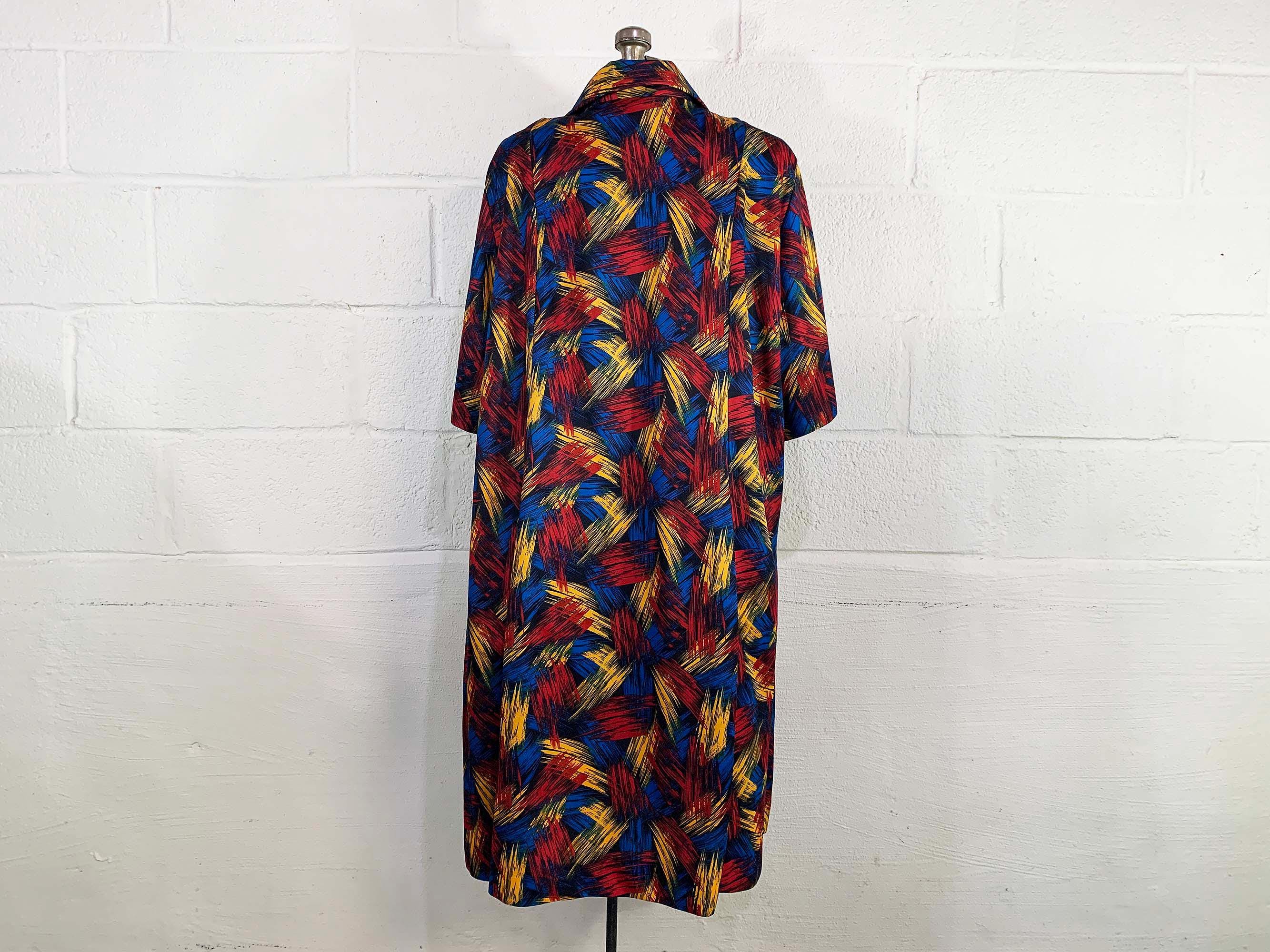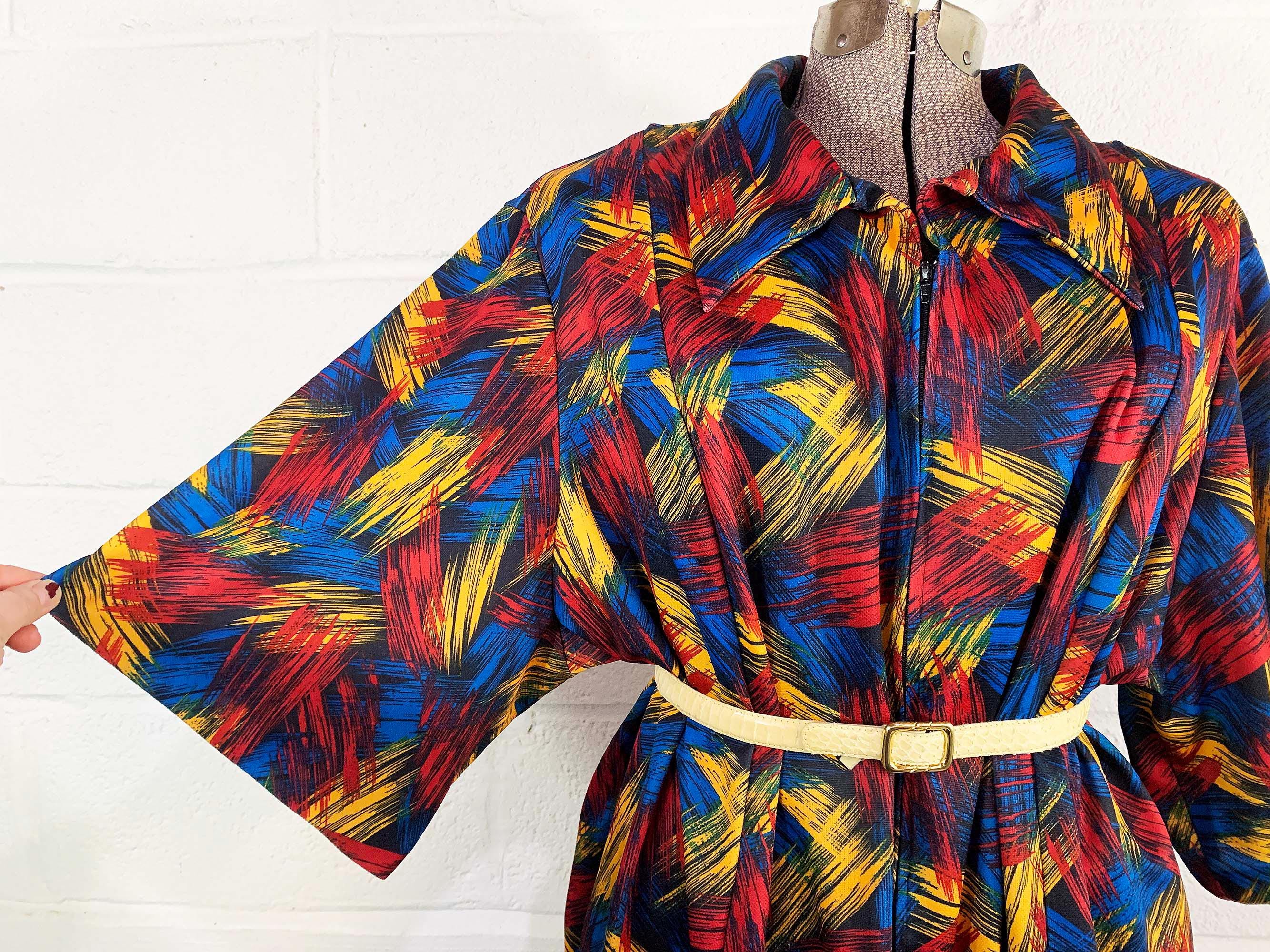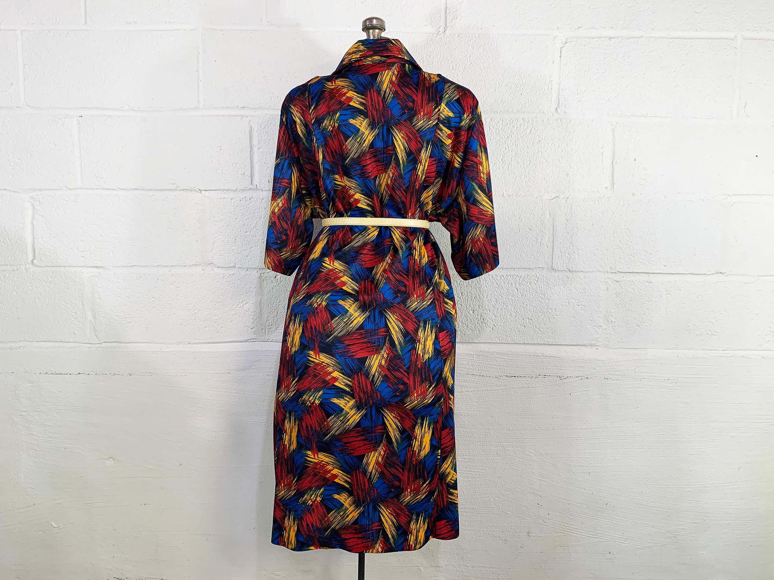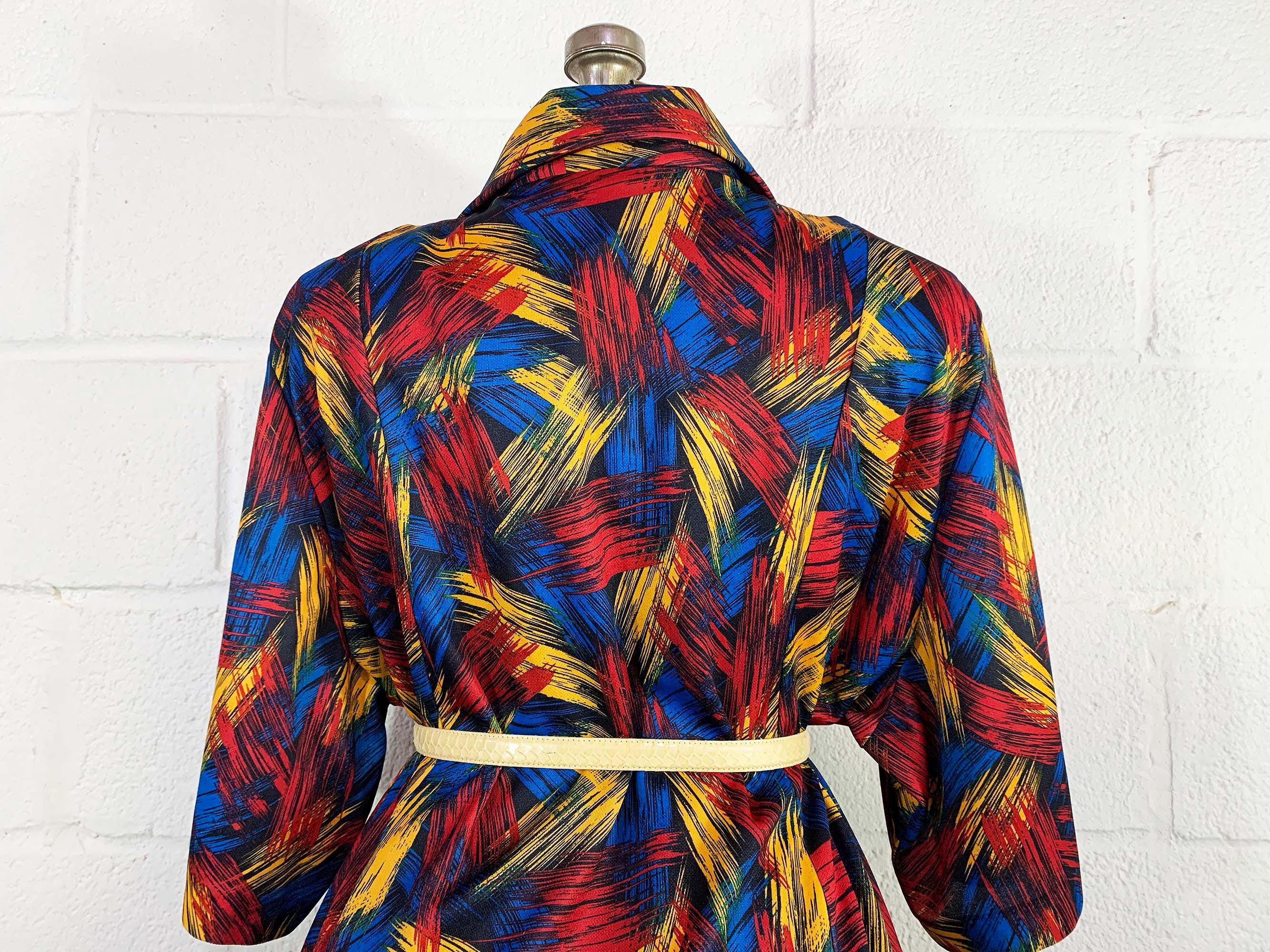 Lovely paint brush patterned short sleeve dress. It has two patch pockets, dagger collar, and a half zipper in the front. Fabric has stretch. There are a few snags and some pilling on the dress - please be sure to inspect all photos.