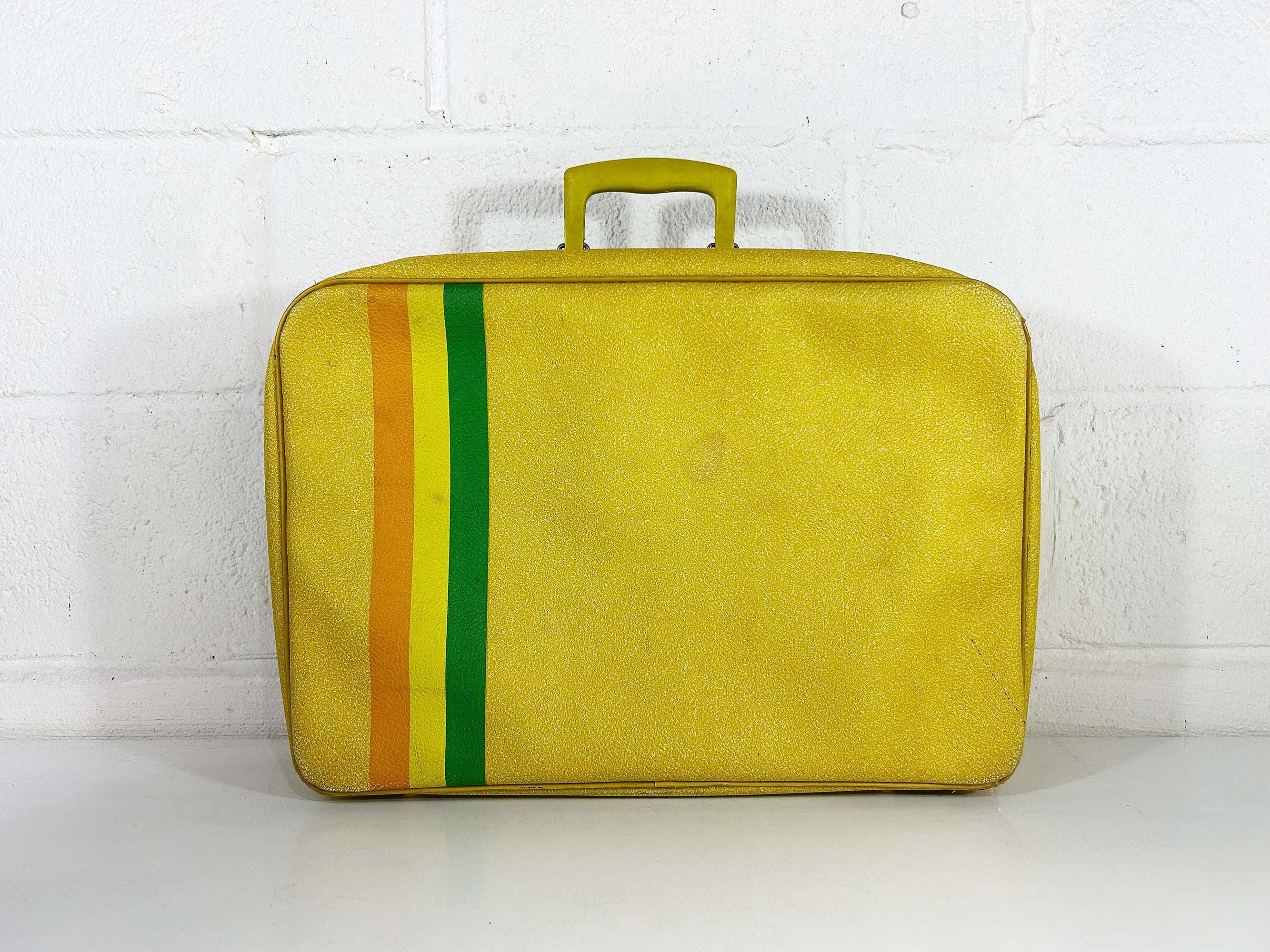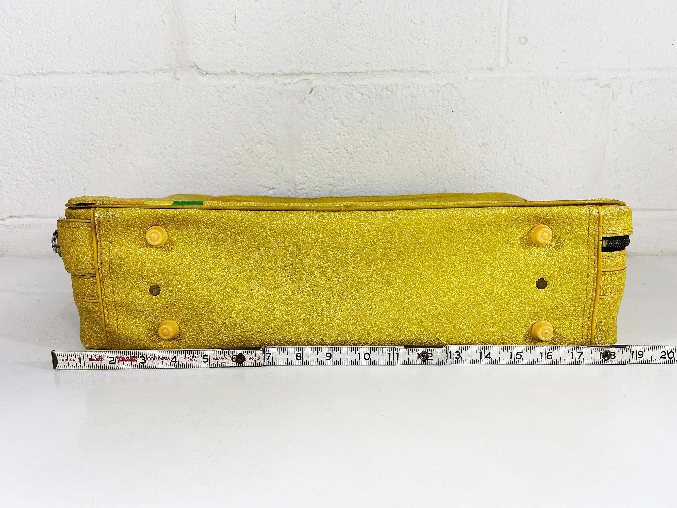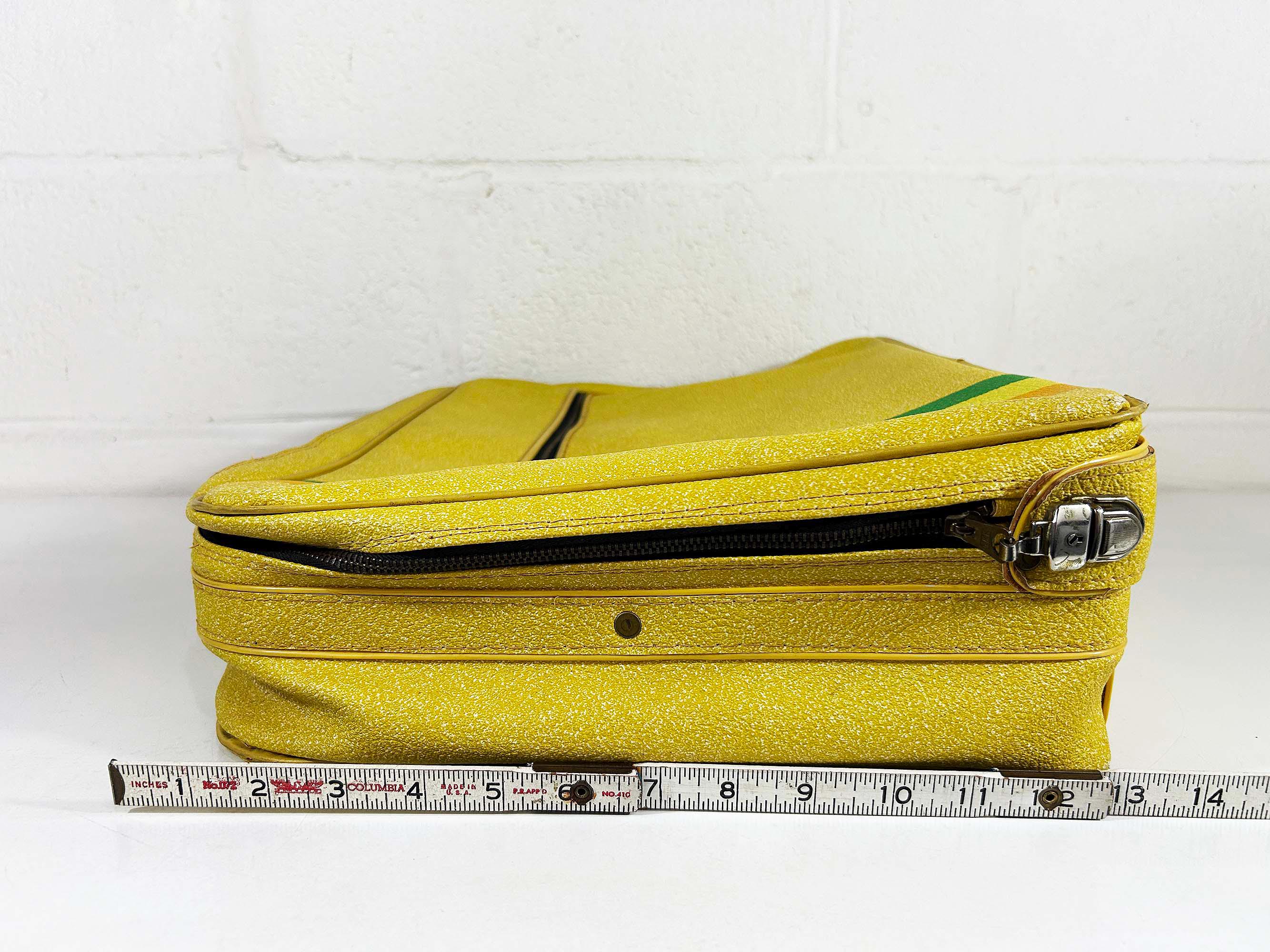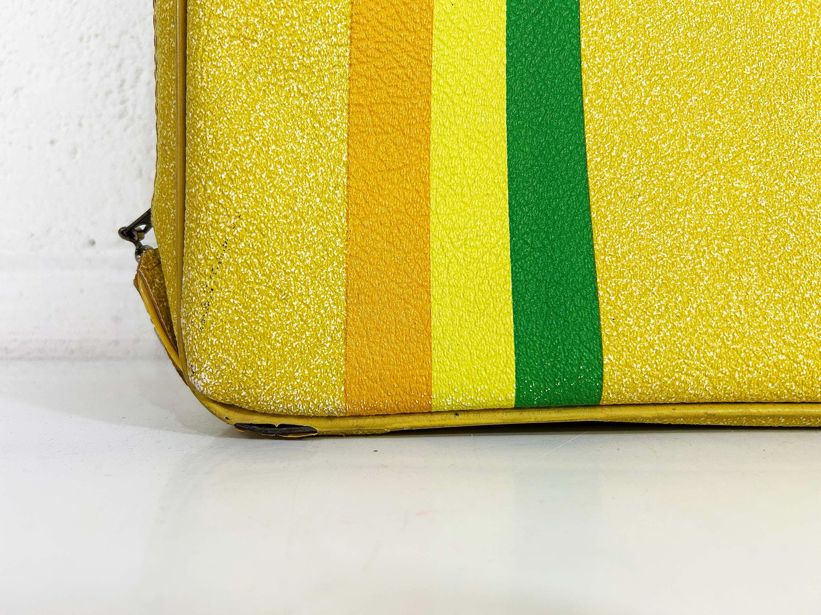 Vintage yellow striped vinyl travel bag, perfect for carrying everyday items or as an overnight bag. The bag is in good vintage condition with some minor wear from age and use - please be sure to inspect all photos. It is approximately 5 1/2 inches tall, 19 inches wide, and 13 inches deep.