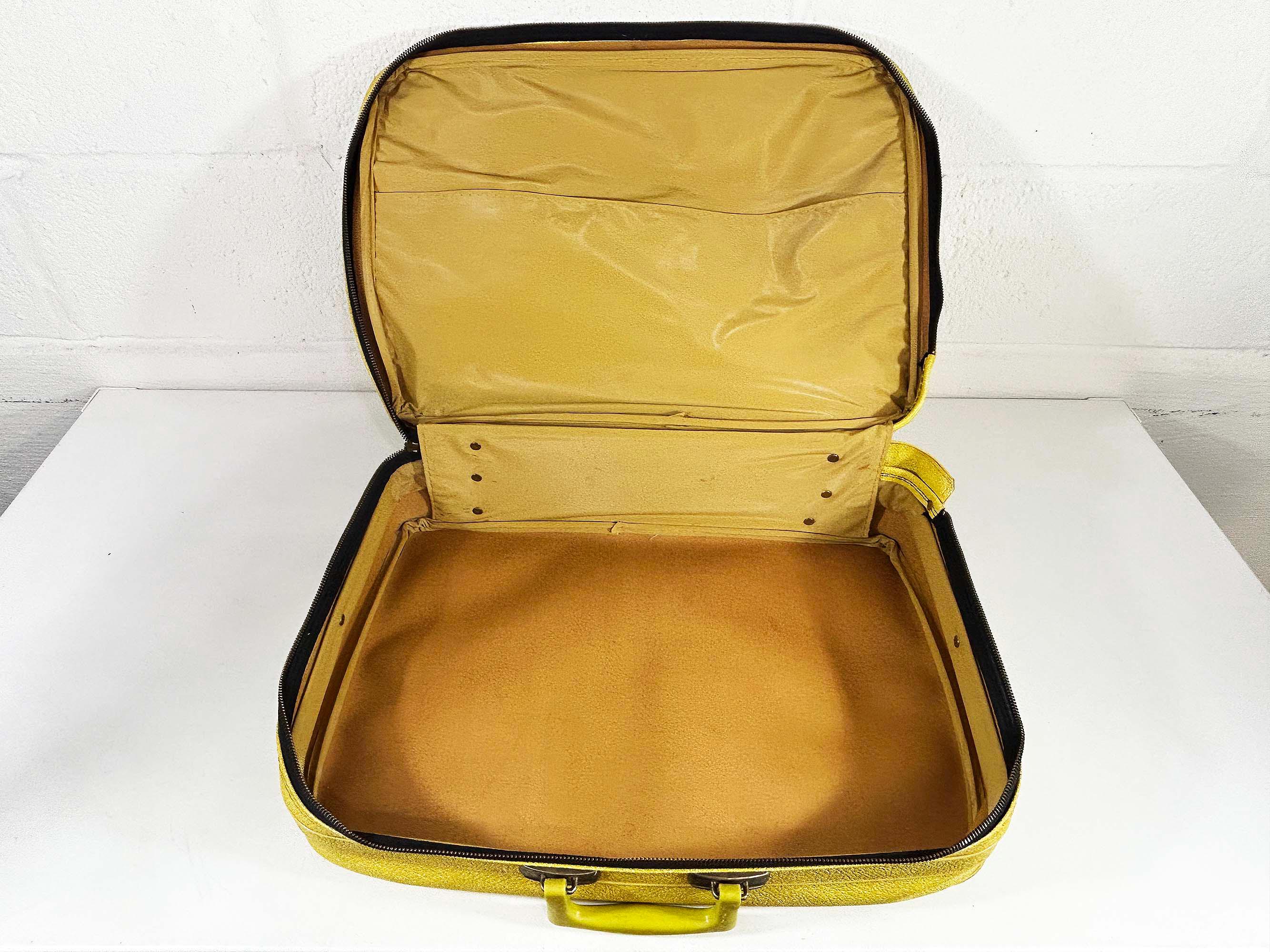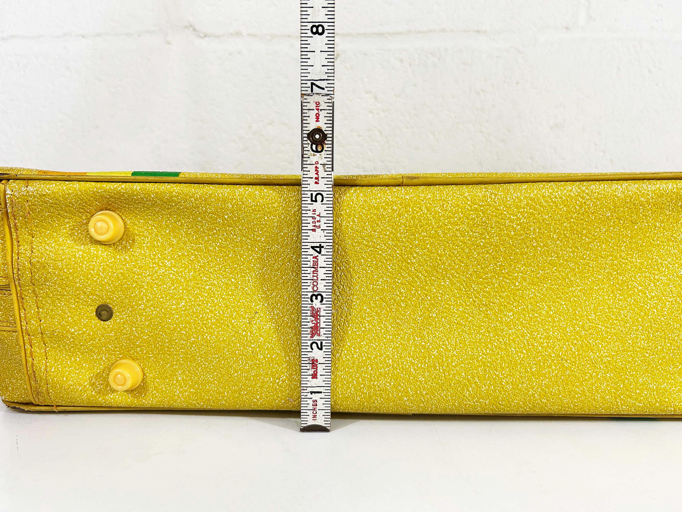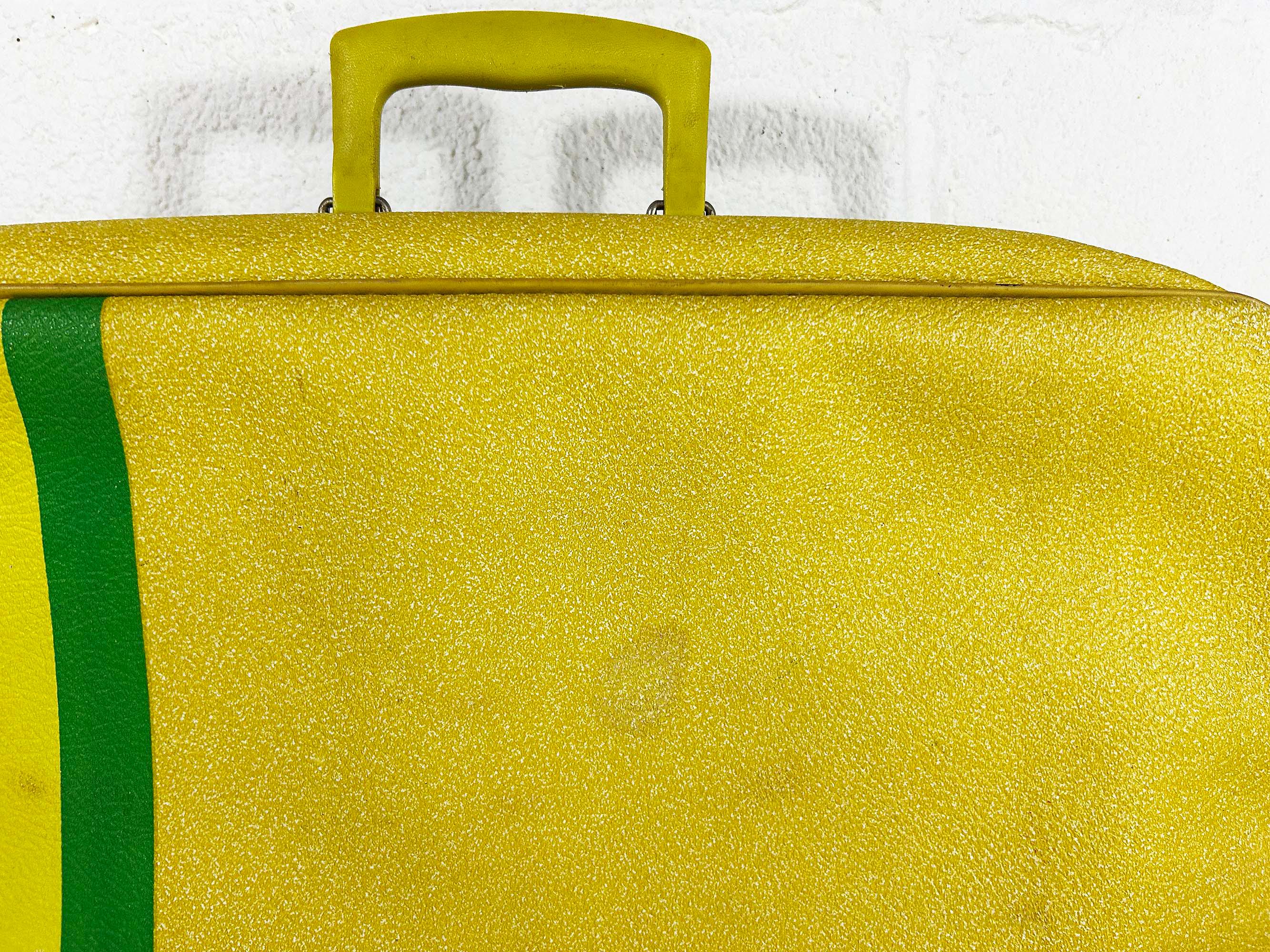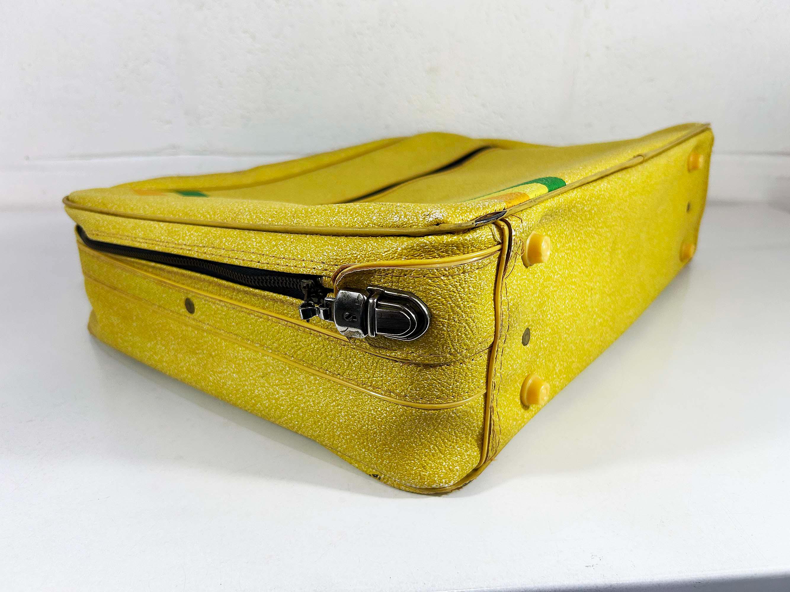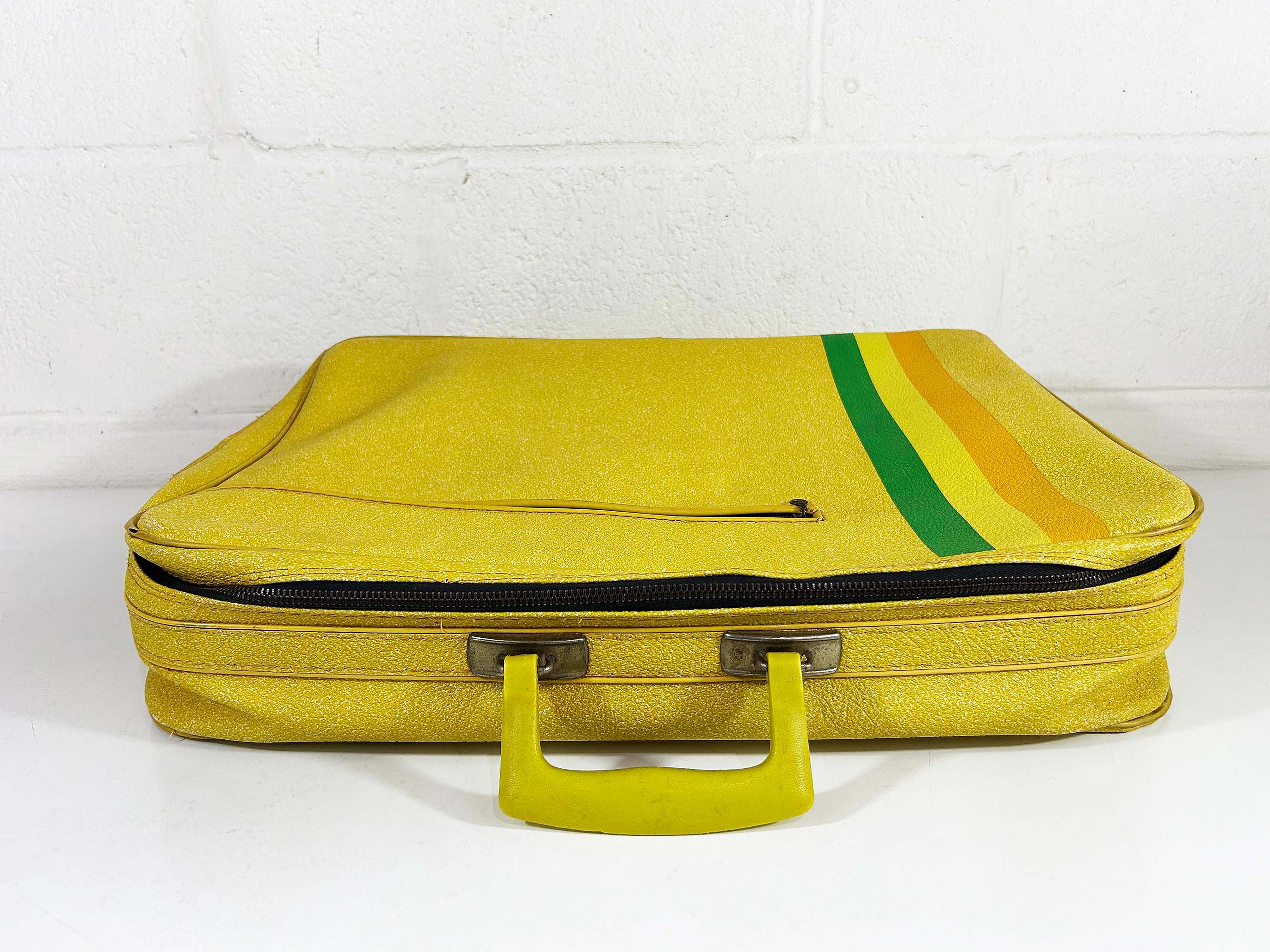 Vintage yellow striped vinyl travel bag, perfect for carrying everyday items or as an overnight bag. The bag is in good vintage condition with some minor wear from age and use - please be sure to inspect all photos. It is approximately 5 1/2 inches tall, 19 inches wide, and 13 inches deep.