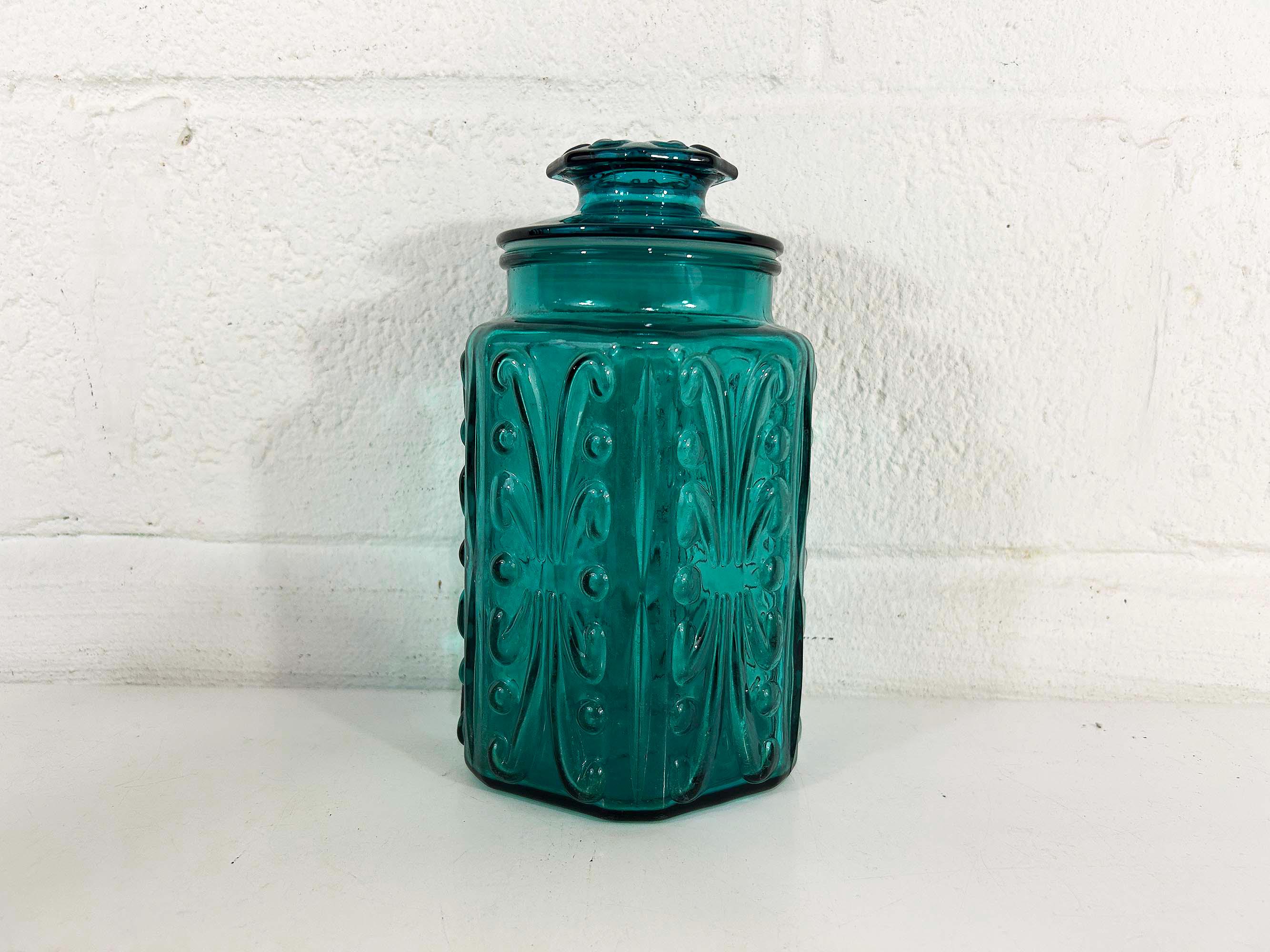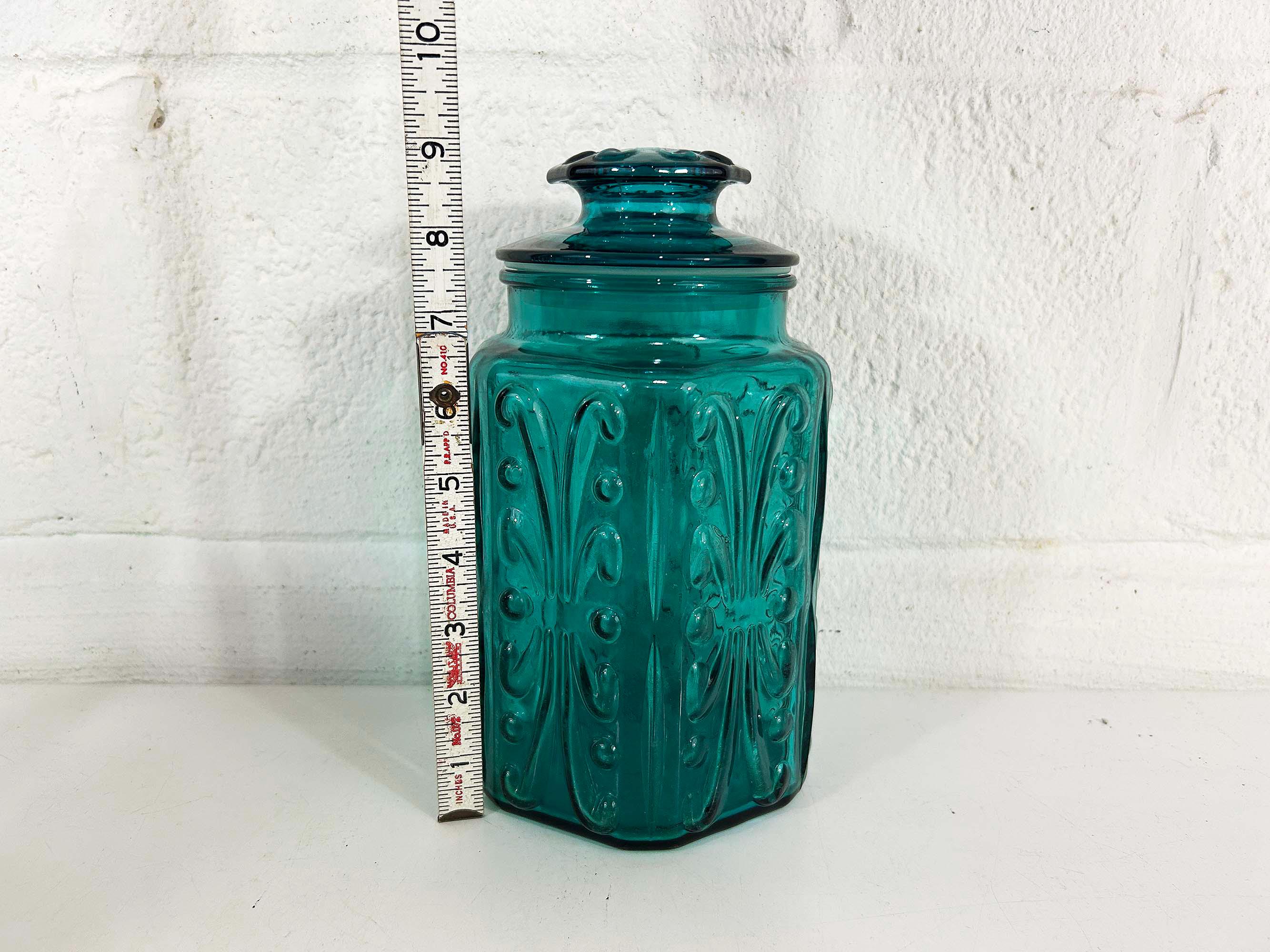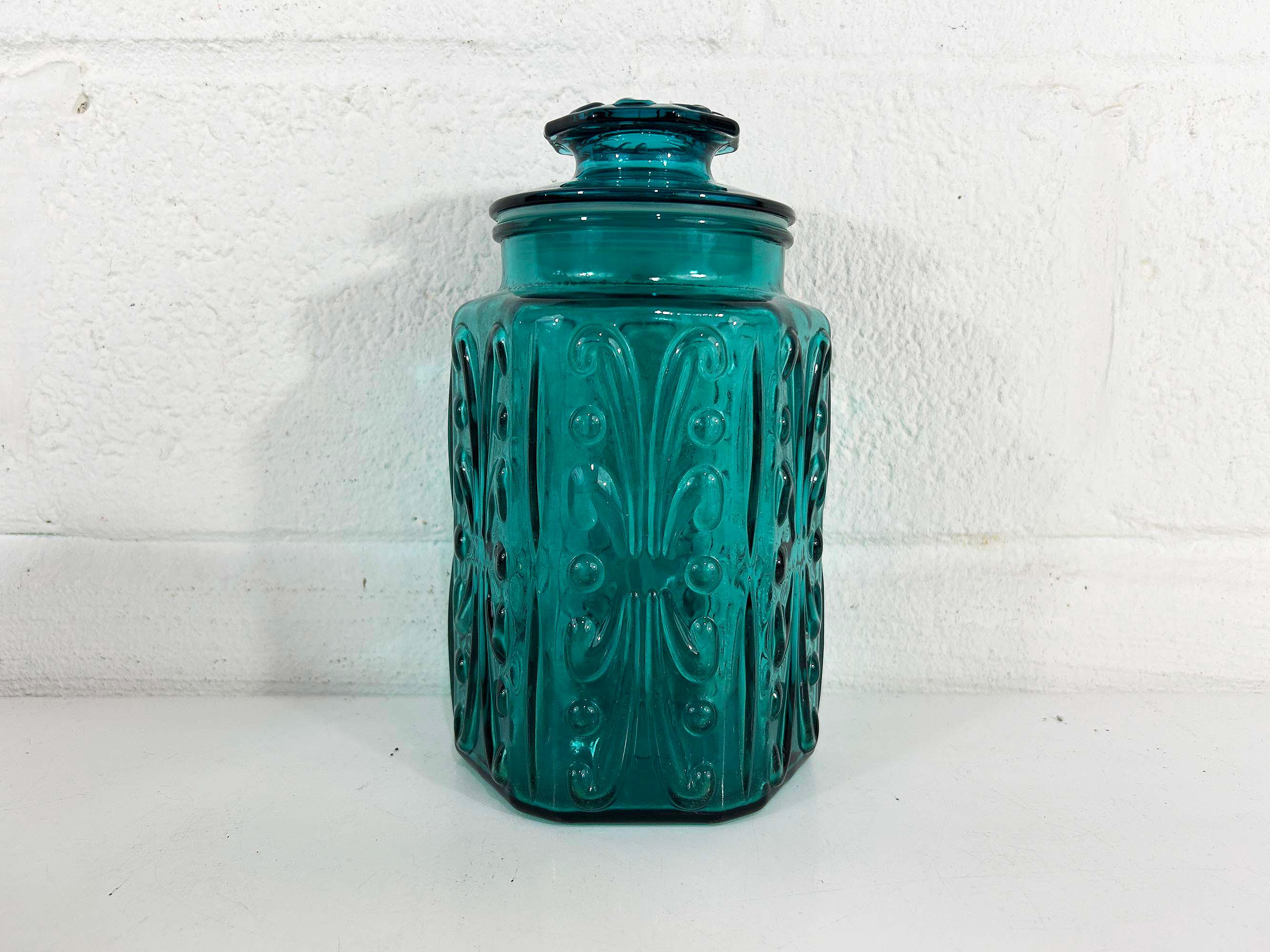 Super cute and useful kitchen glass canister! In good condition with no significant flaws. The inside of the lid has a plastic seal to keep items inside fresh. The canister is approximately 9 inches tall and 4 inches in diameter at the top.