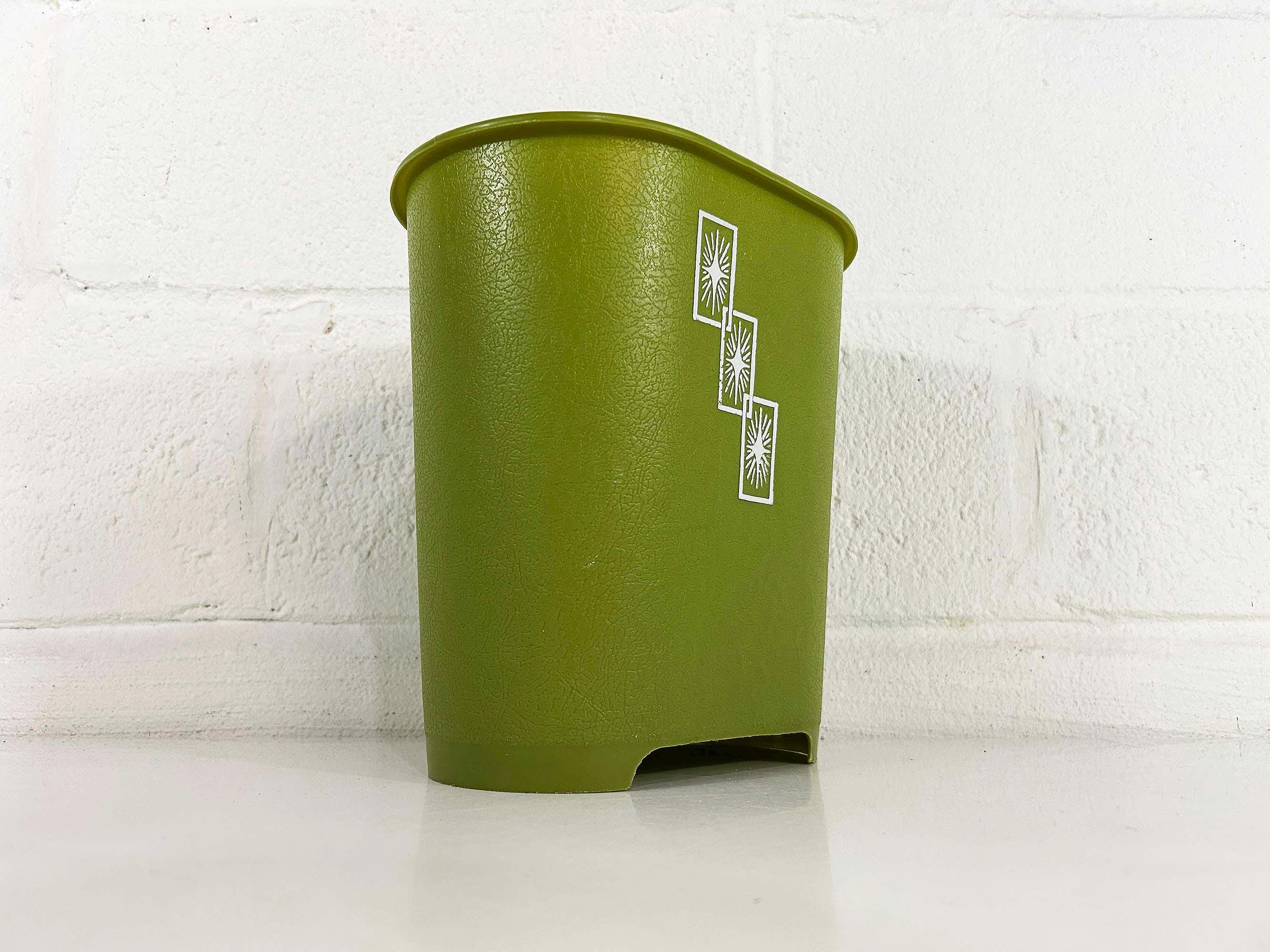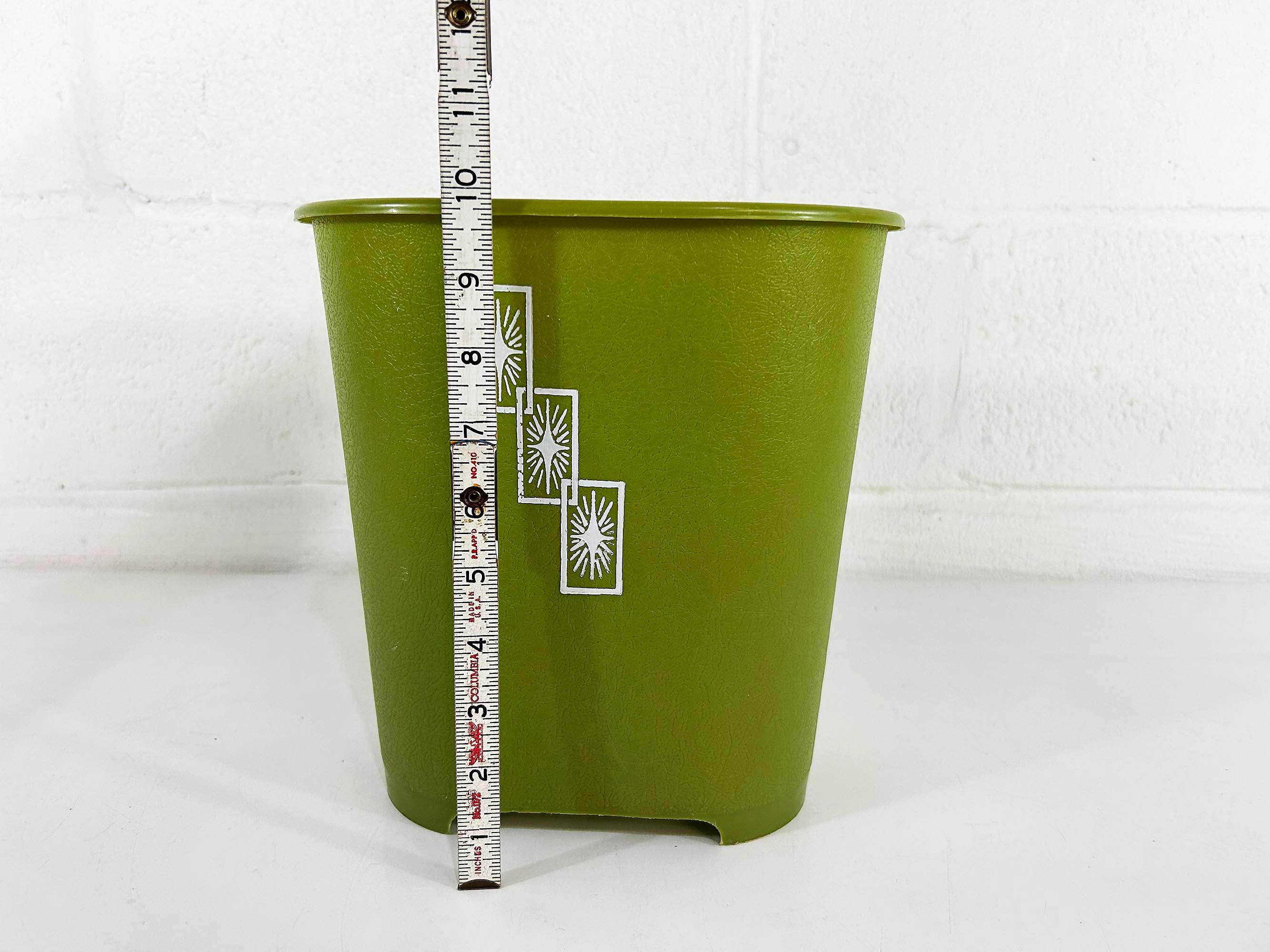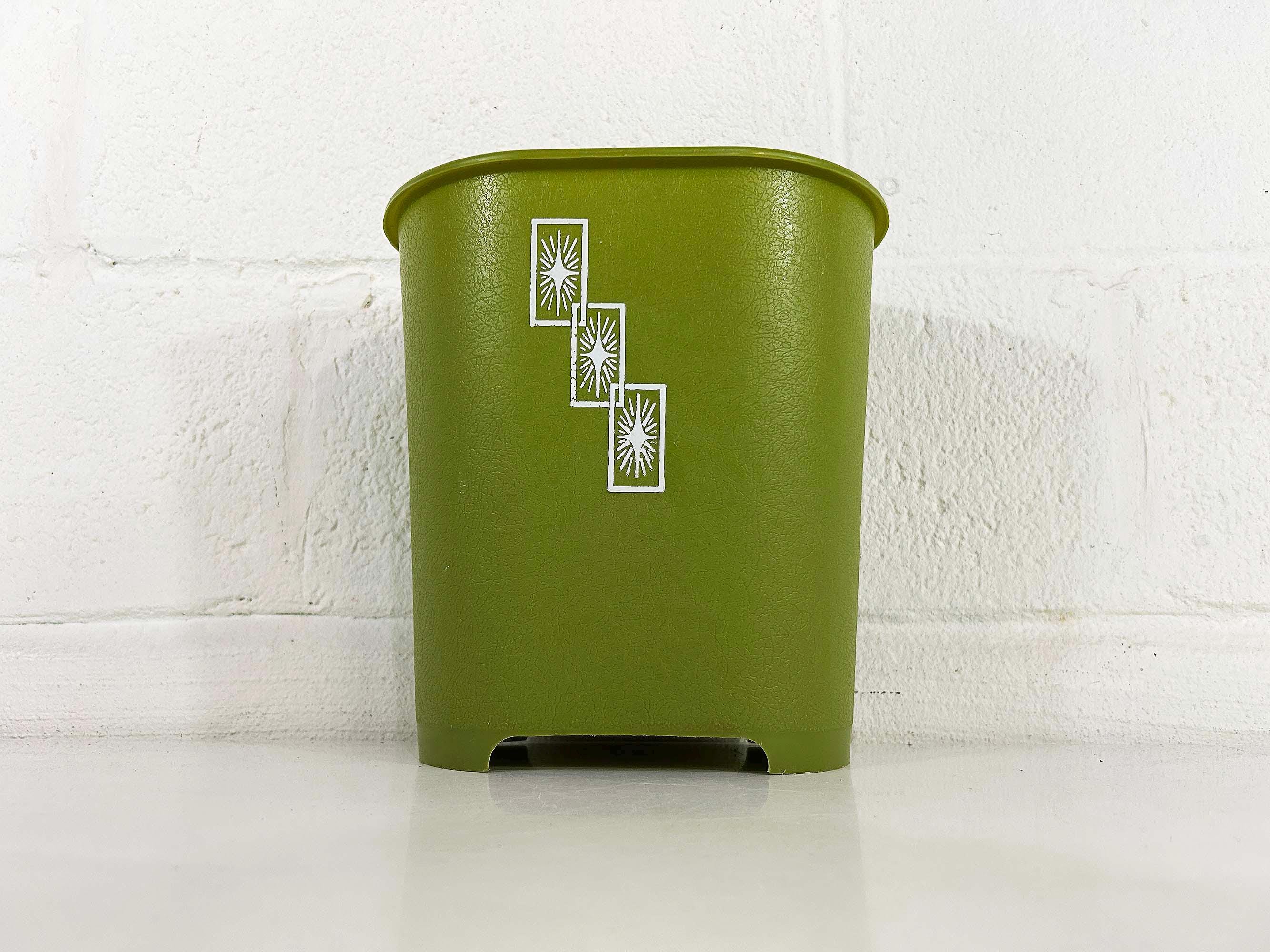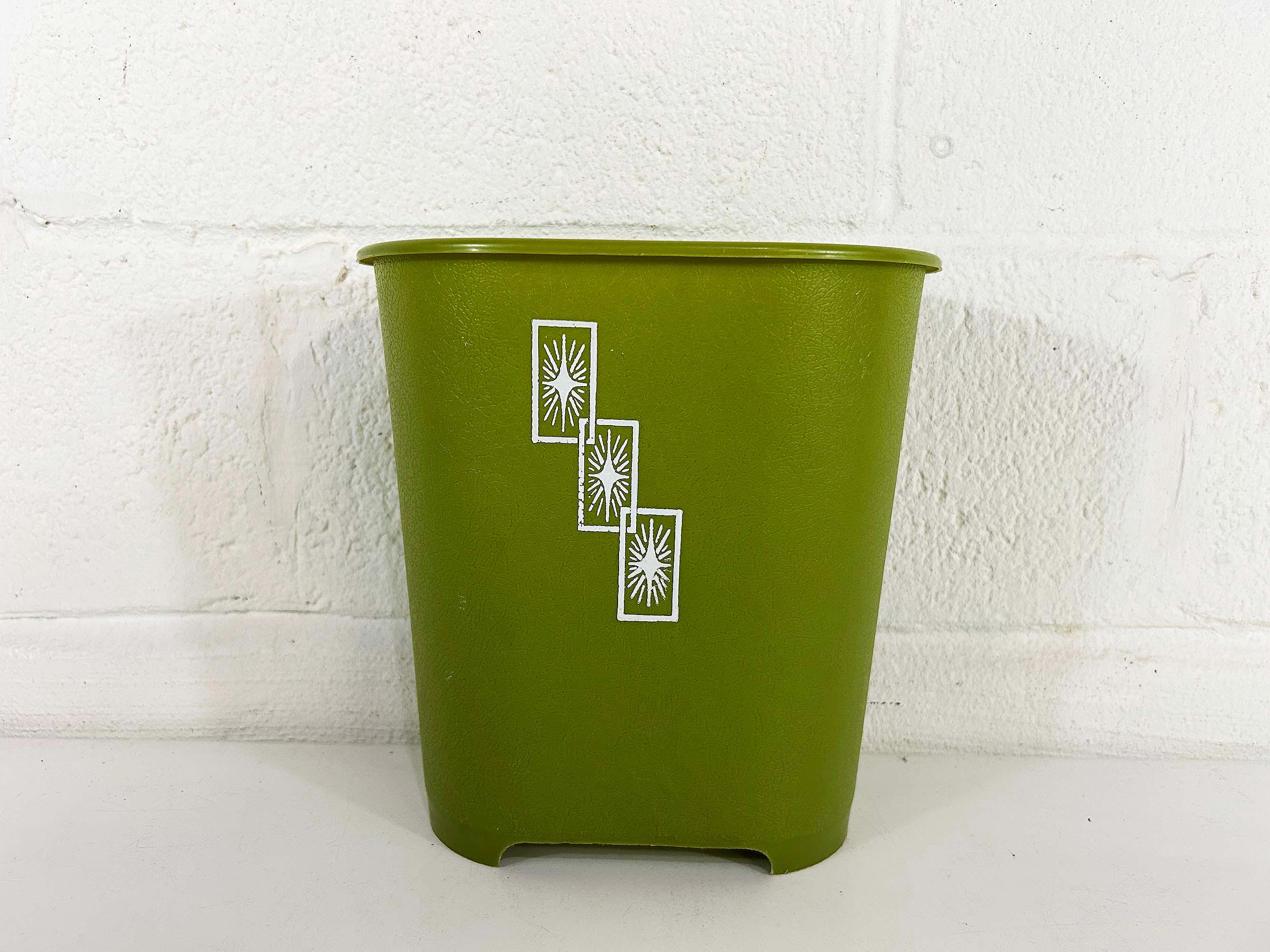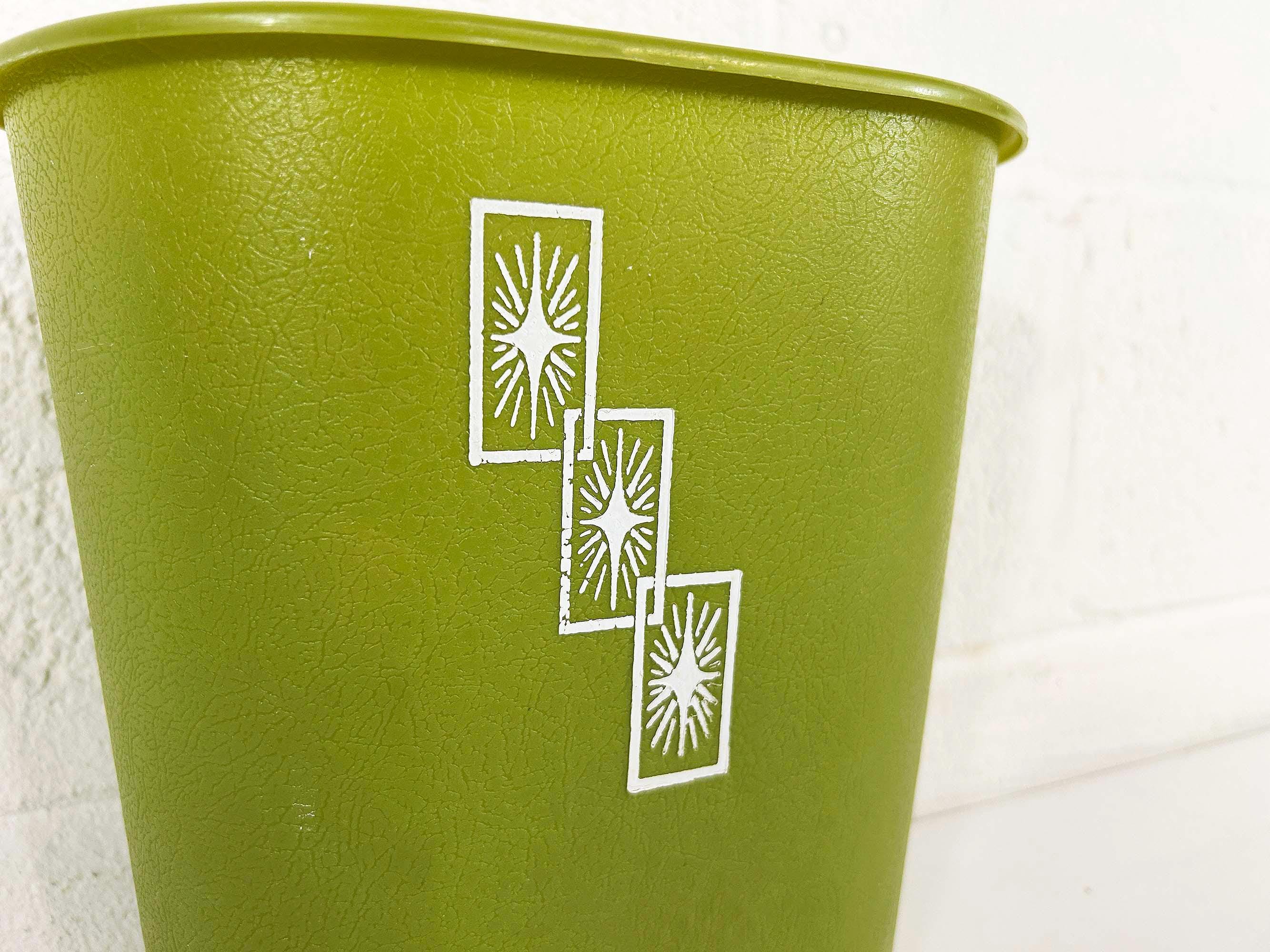 Adorable little green atomic plastic trash can. Great for a bathroom, office, or kid's room! In good vintage condition with some all over scuffs and scratches. The trash can is approximately 10 inches tall, 9 1/2 inches wide, and 6 1/2 inches deep.