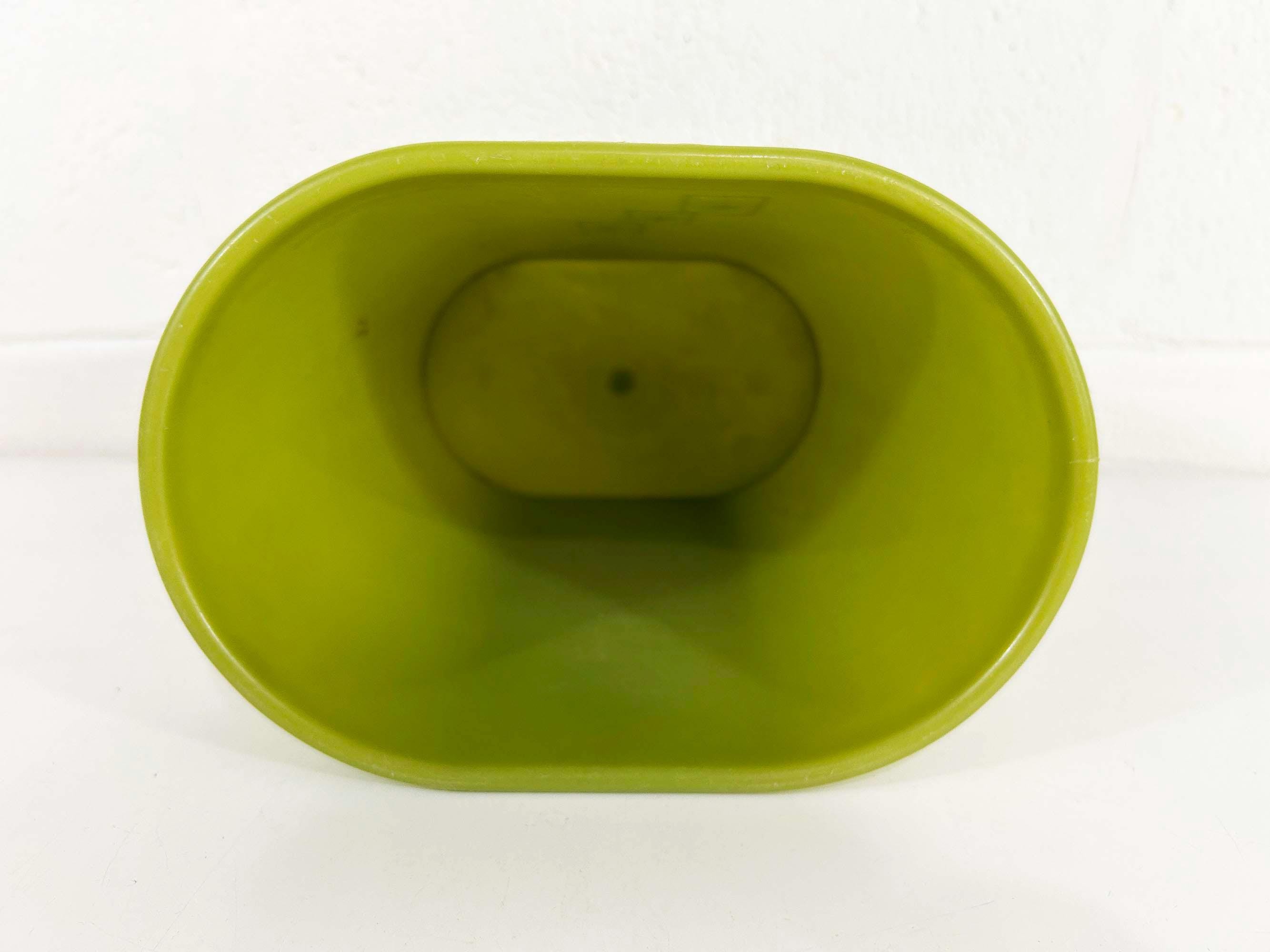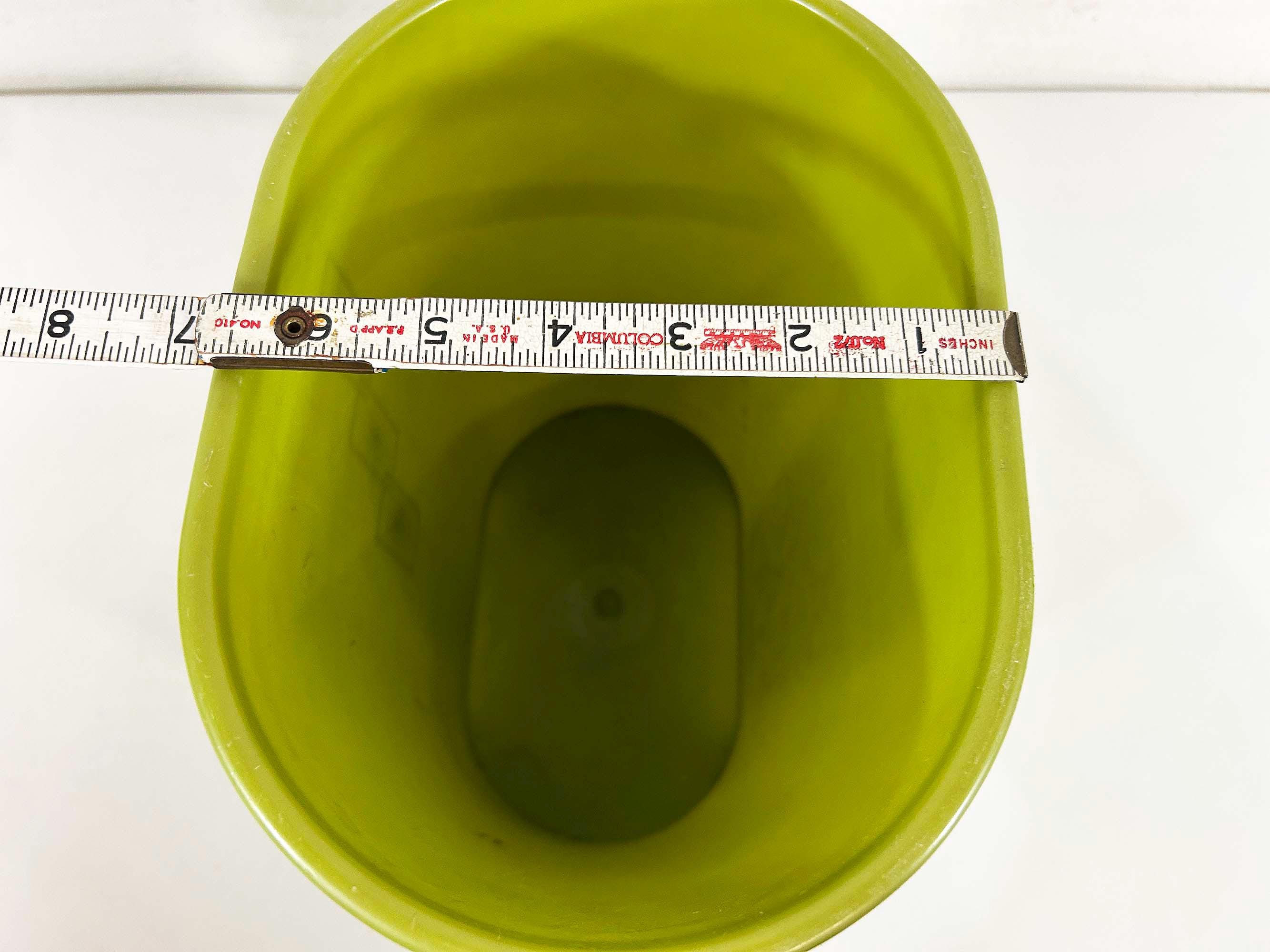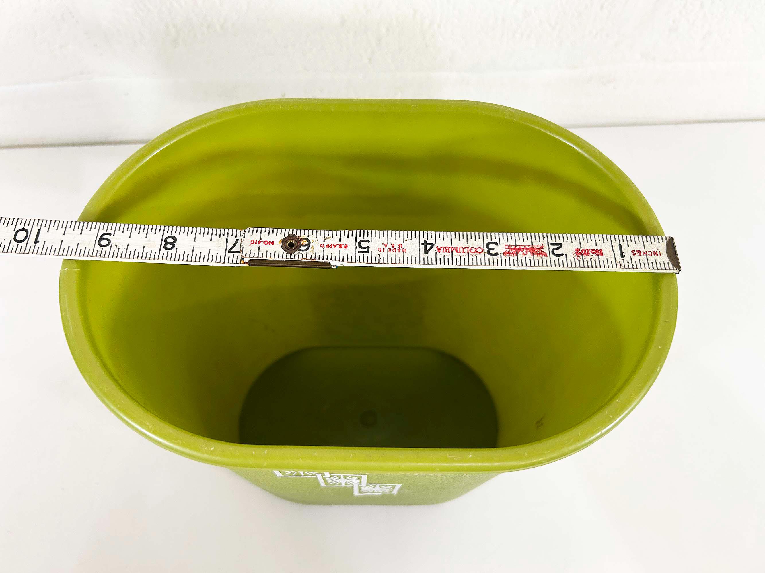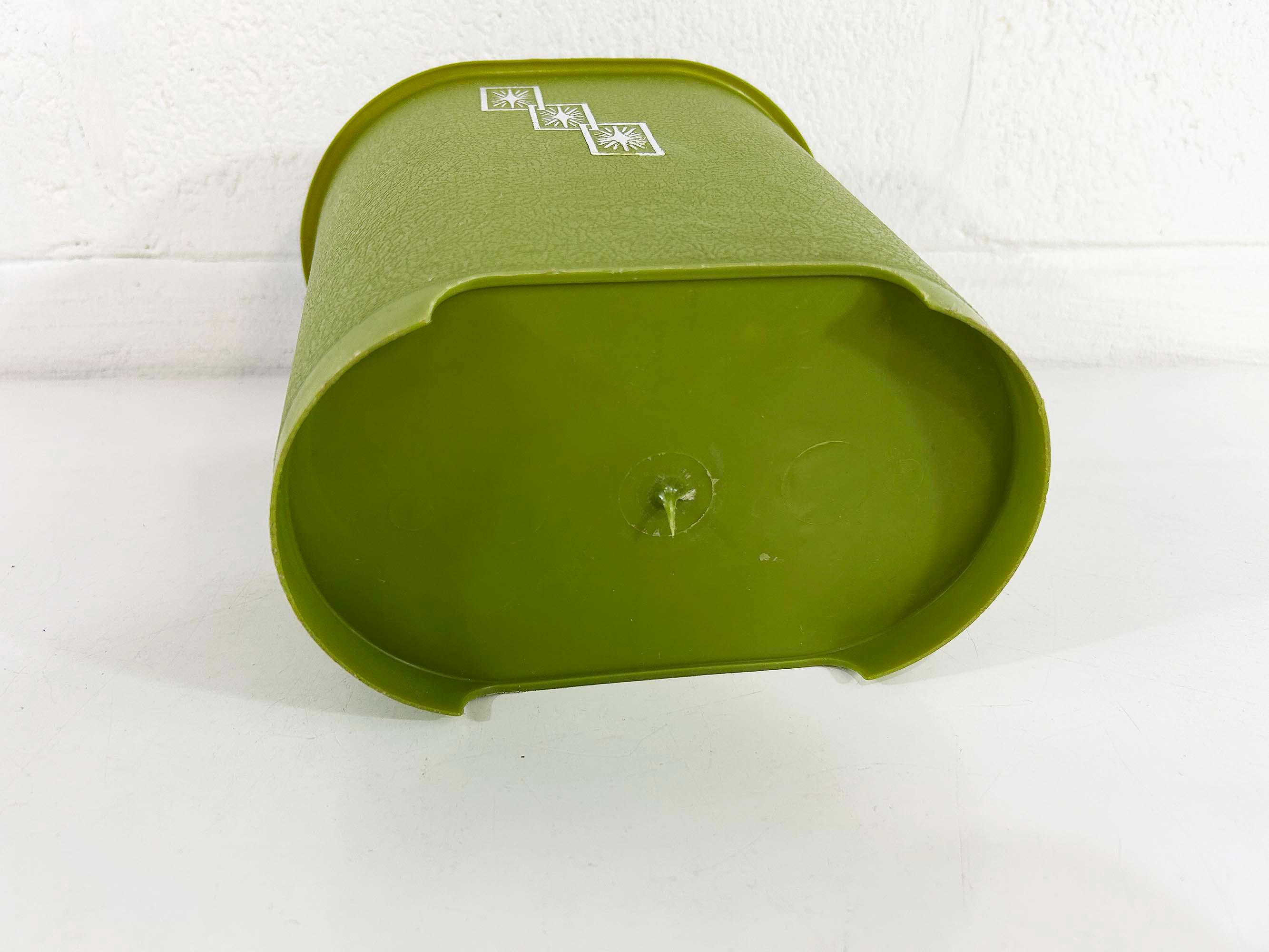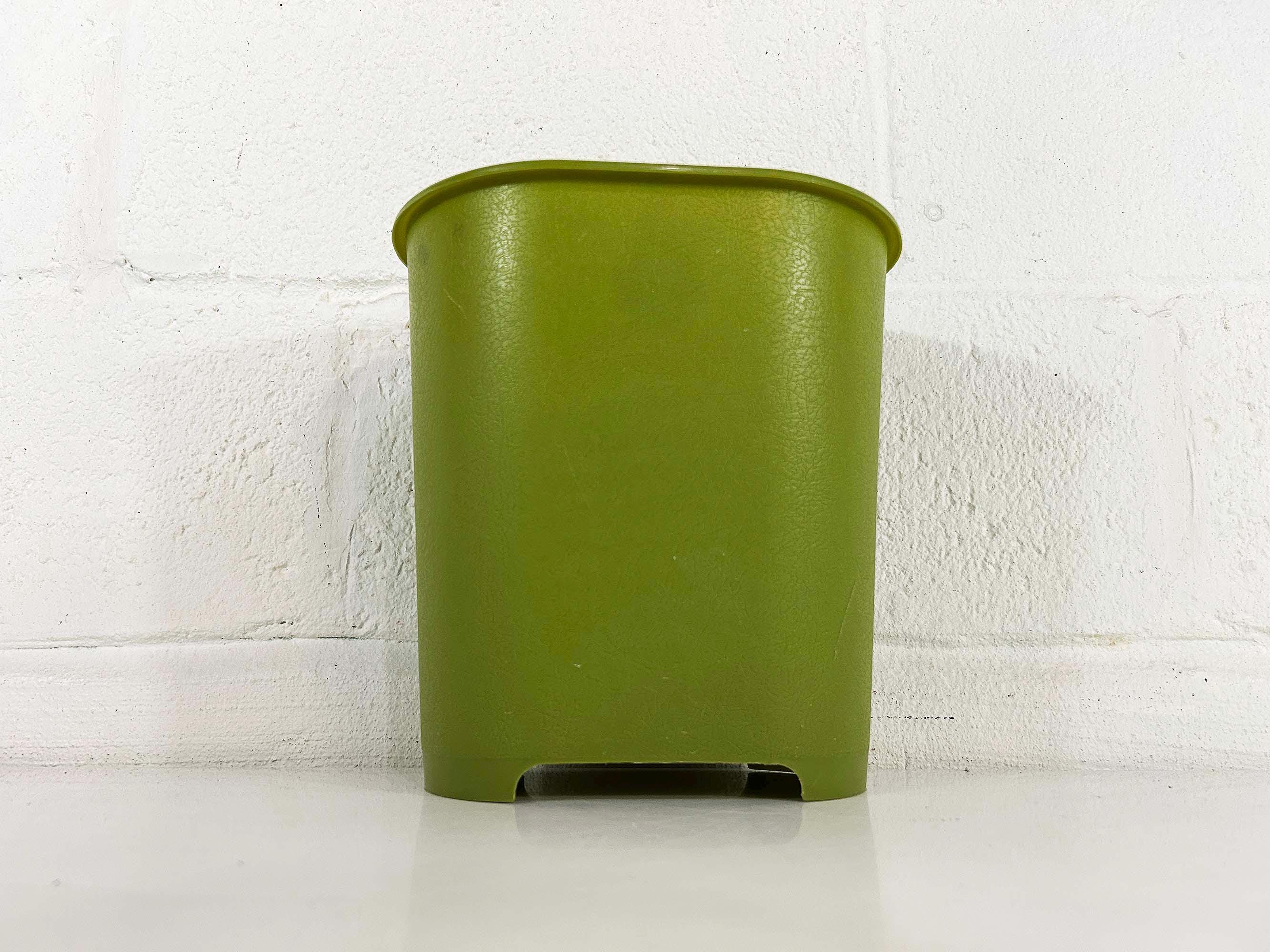 Adorable little green atomic plastic trash can. Great for a bathroom, office, or kid's room! In good vintage condition with some all over scuffs and scratches. The trash can is approximately 10 inches tall, 9 1/2 inches wide, and 6 1/2 inches deep.