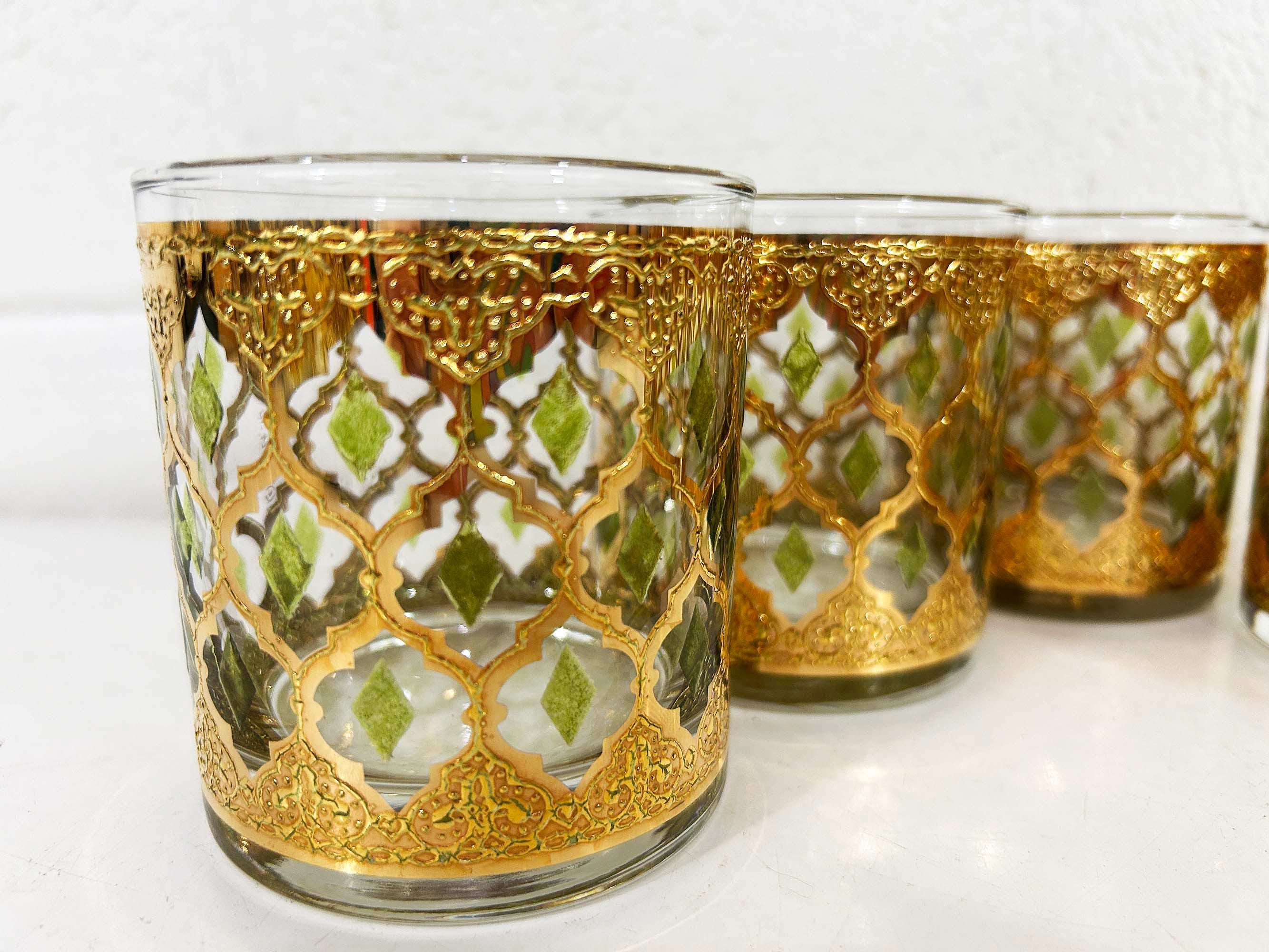 Beautiful set of 4 Culver Valencia Old Fashioned straight sided glasses in excellent condition. This Valencia pattern has a 22kt gold filigree pattern with green diamonds. Each glass is approximately 3 1/2 inches tall and 3 inches in diameter across the top. Each glass holds approximately 10 ounces of liquid.