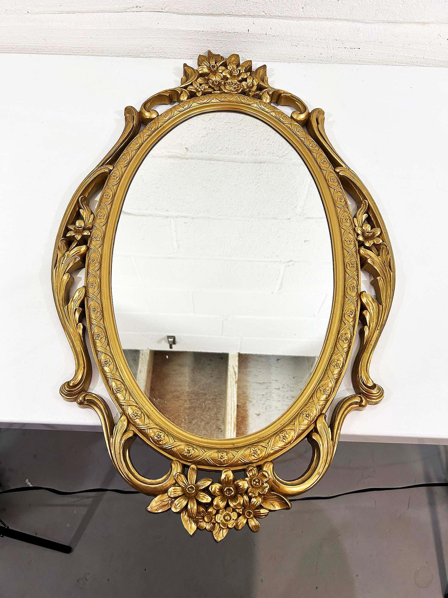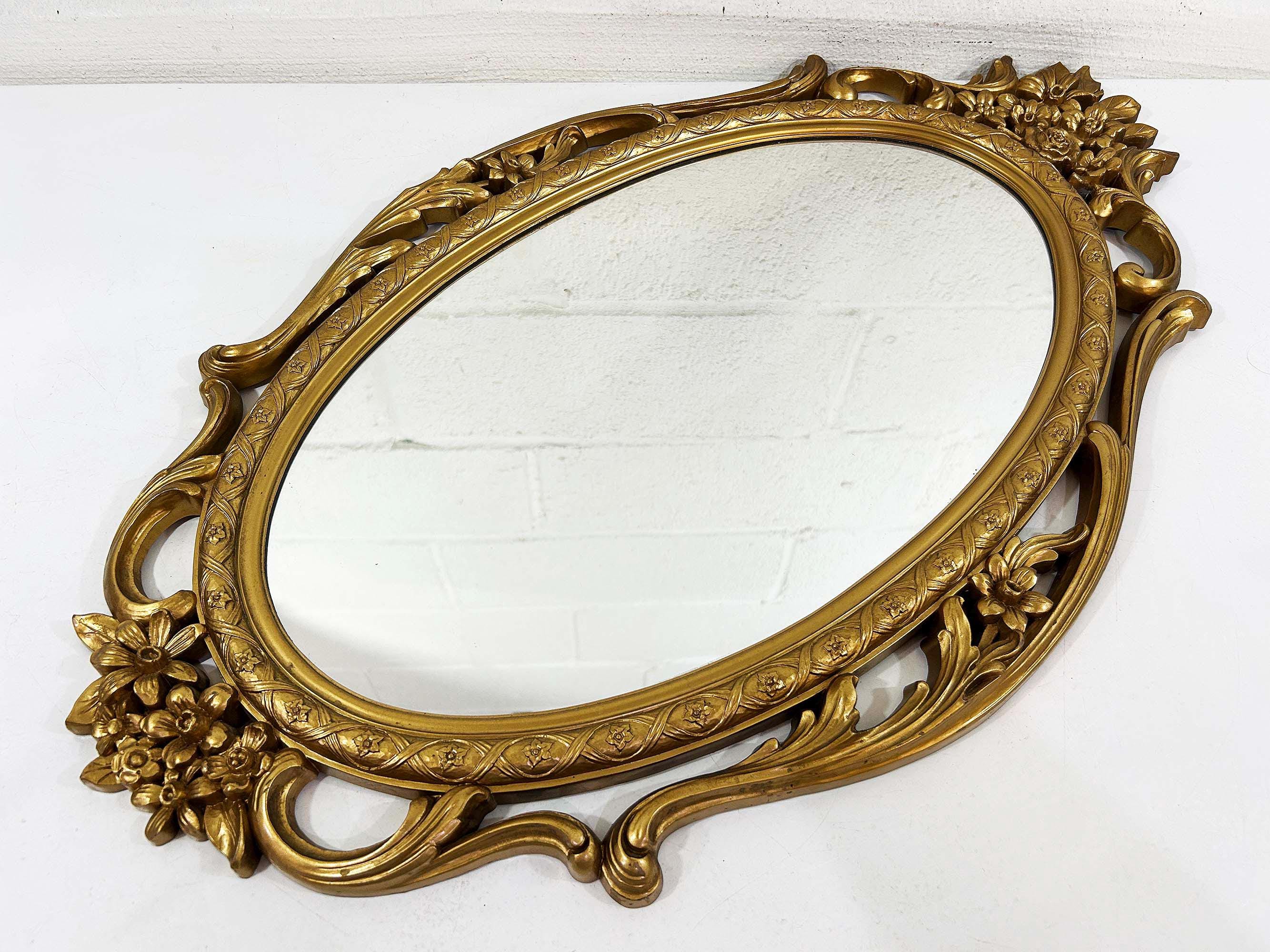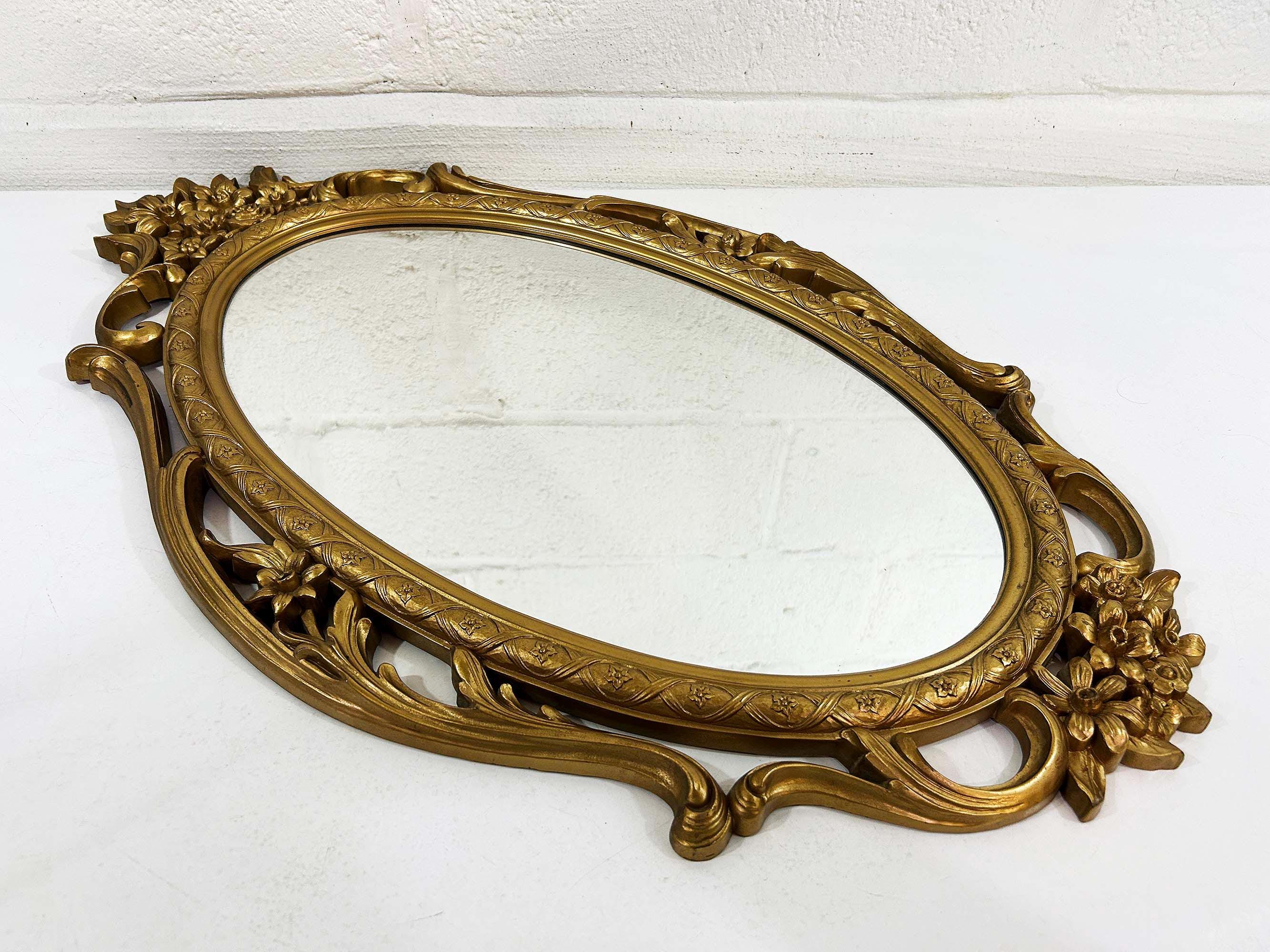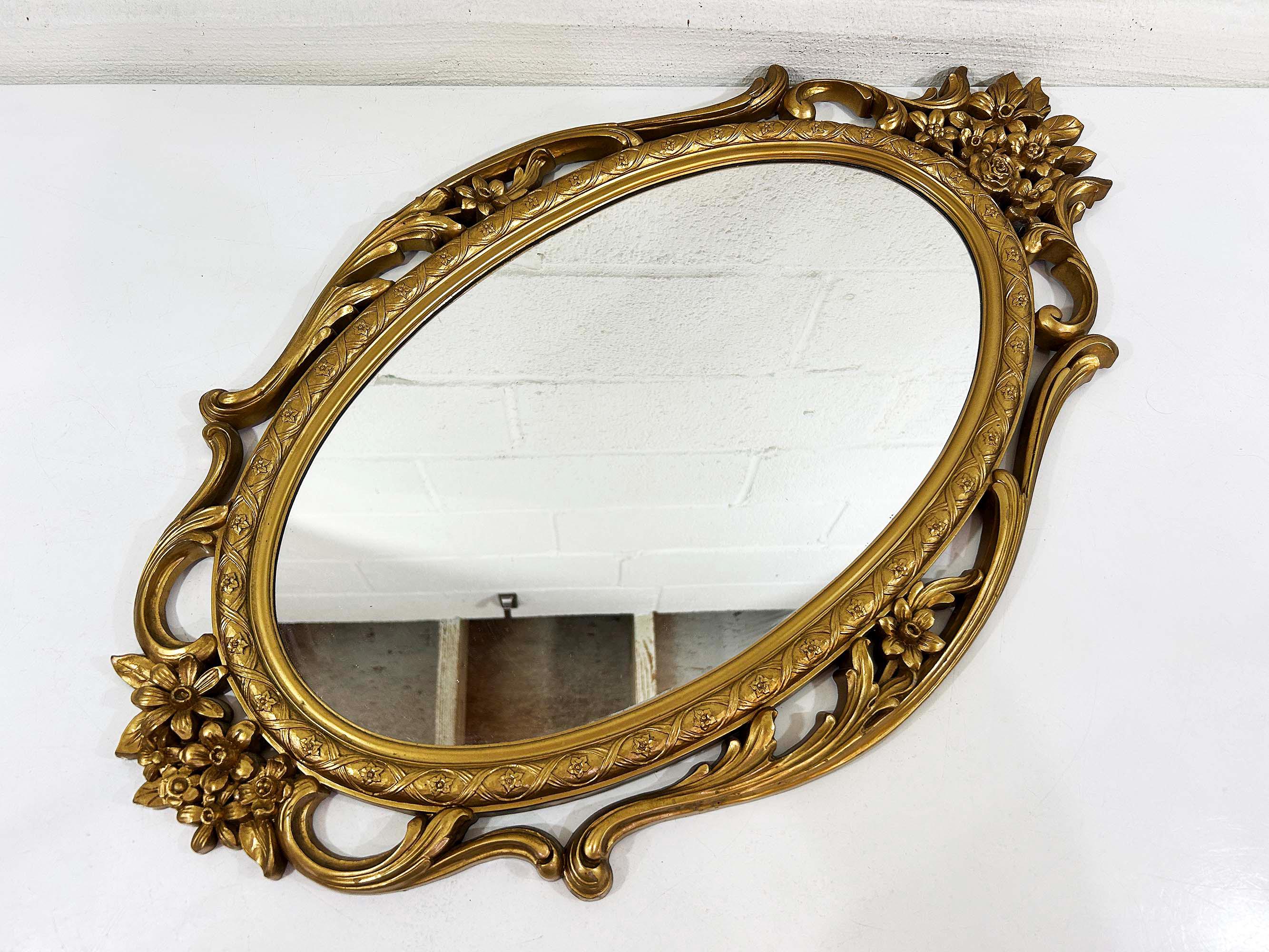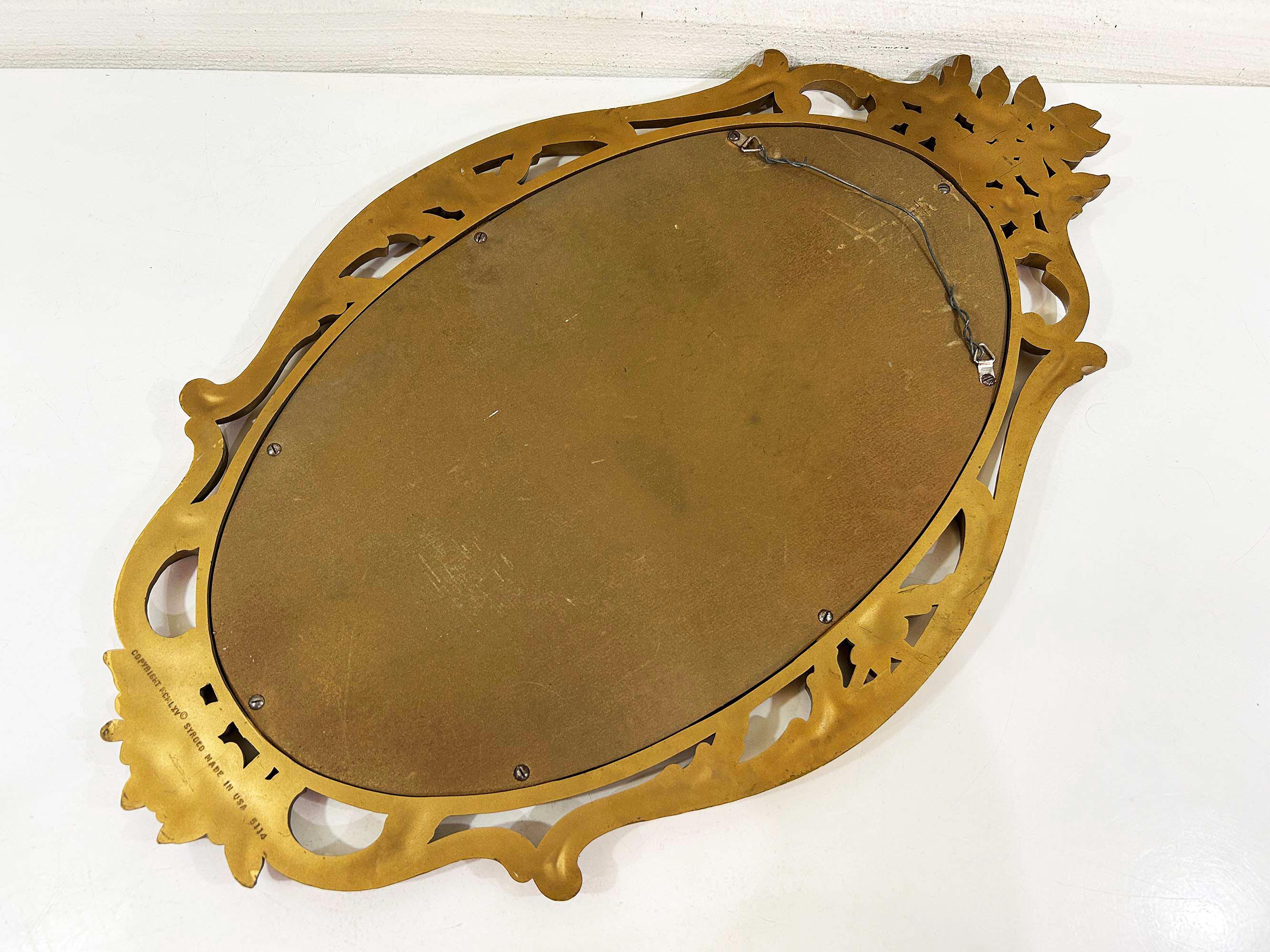 Lovely large gold oval Syroco framed mirror! The mirror is approximately 28 inches long and 17 inches wide across the center. It is in great vintage condition with some paint loss in a few areas on the gold frame. Marked Syroco and made in the USA with the date 1965 in Roman Numerals.