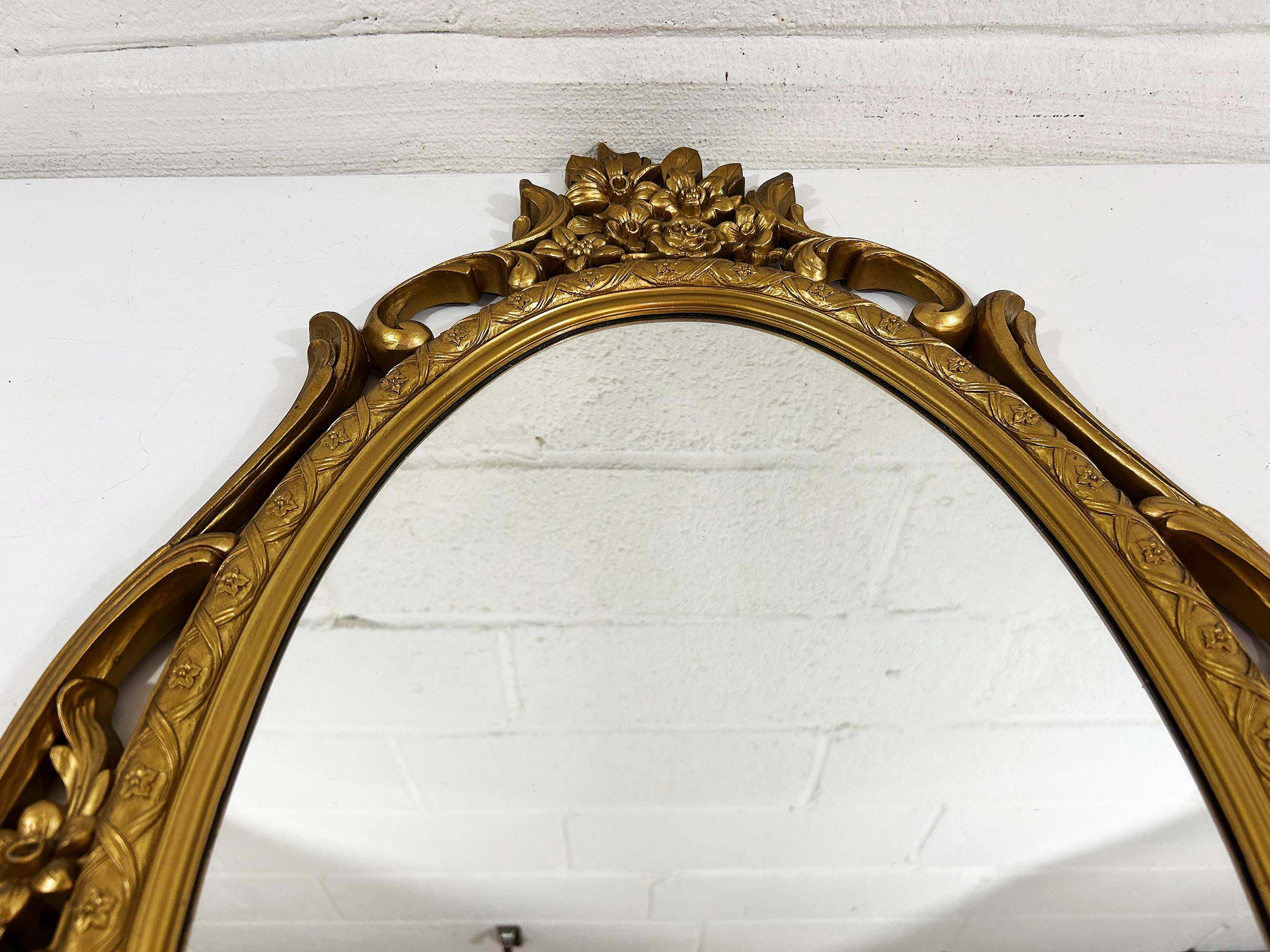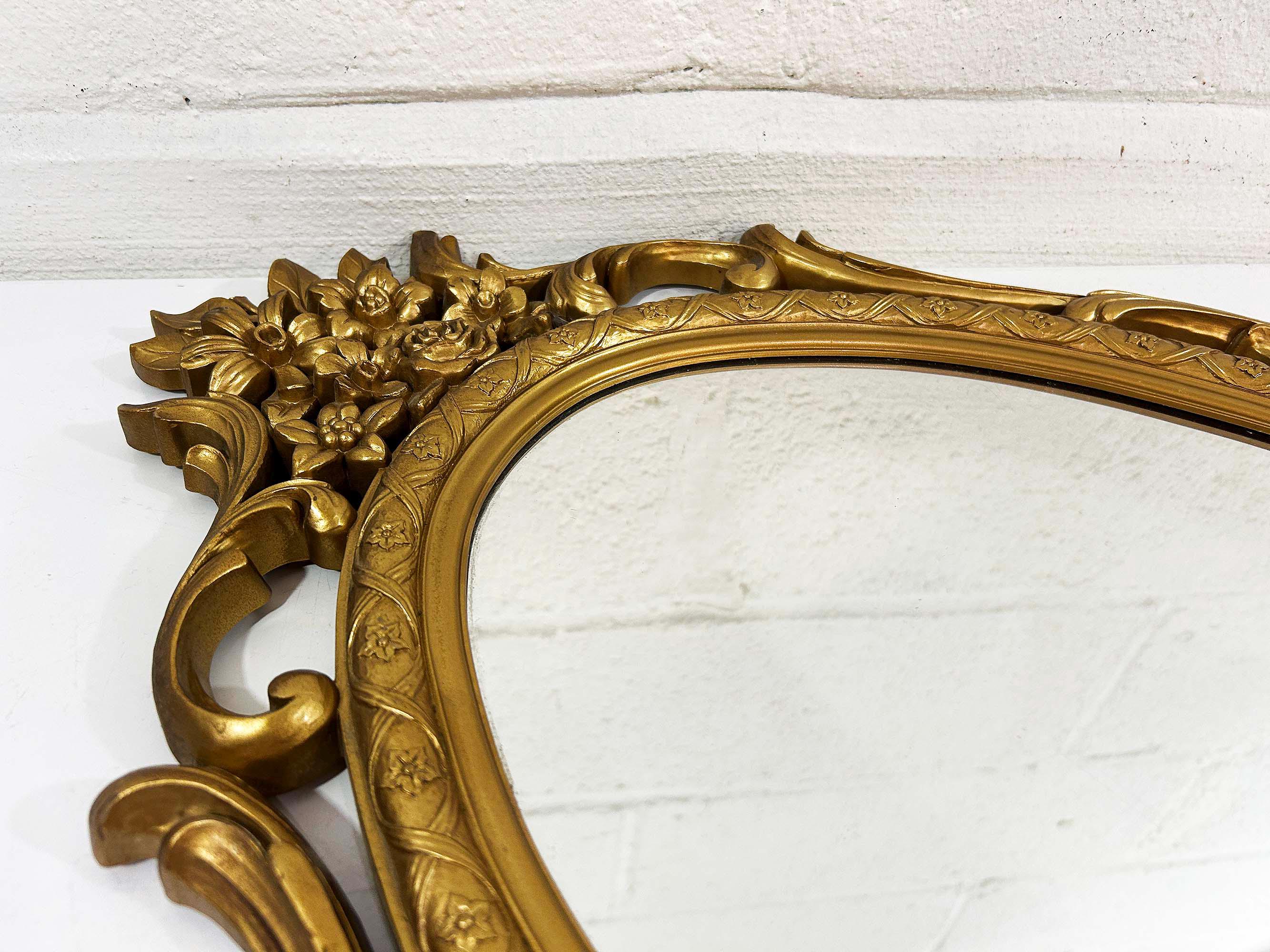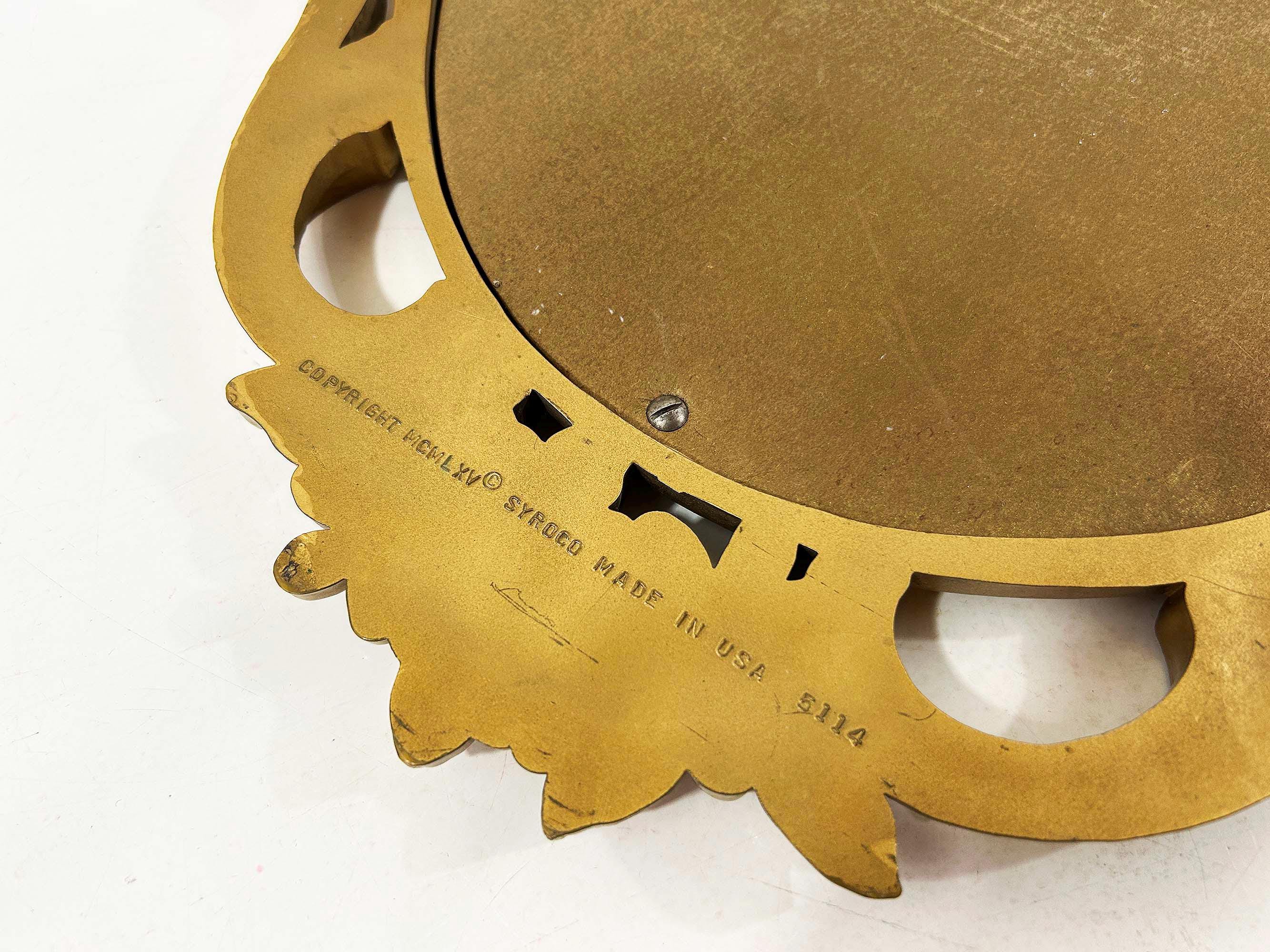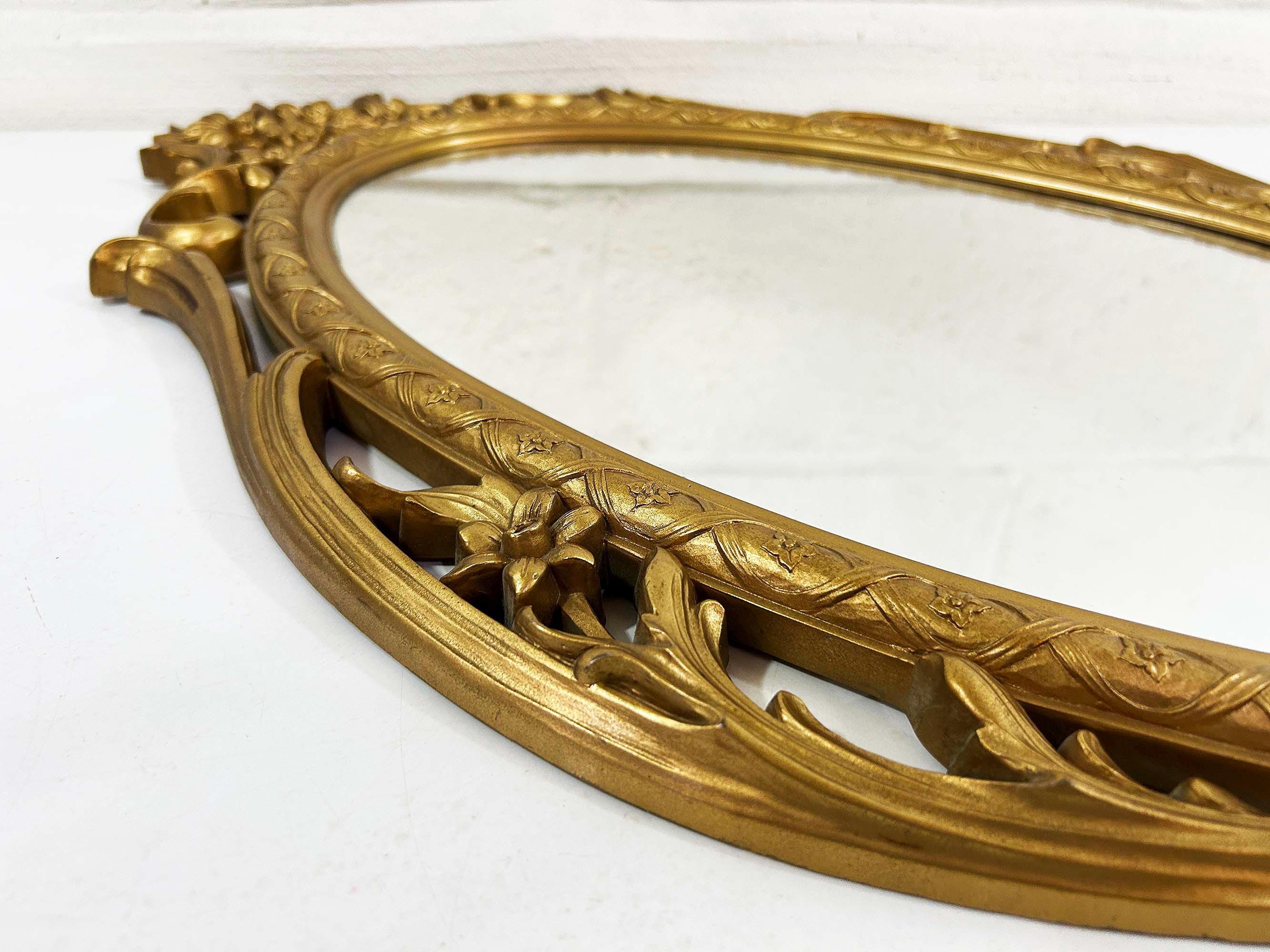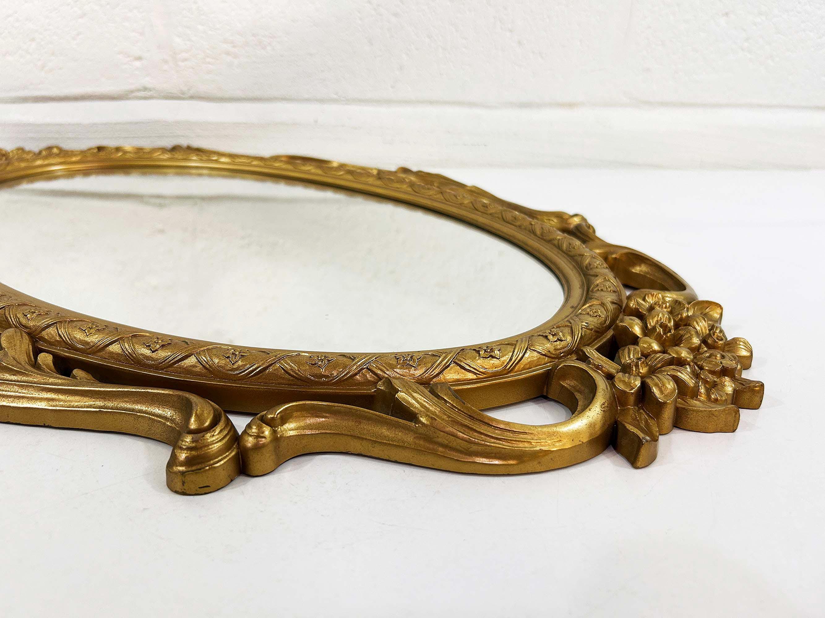 Lovely large gold oval Syroco framed mirror! The mirror is approximately 28 inches long and 17 inches wide across the center. It is in great vintage condition with some paint loss in a few areas on the gold frame. Marked Syroco and made in the USA with the date 1965 in Roman Numerals.