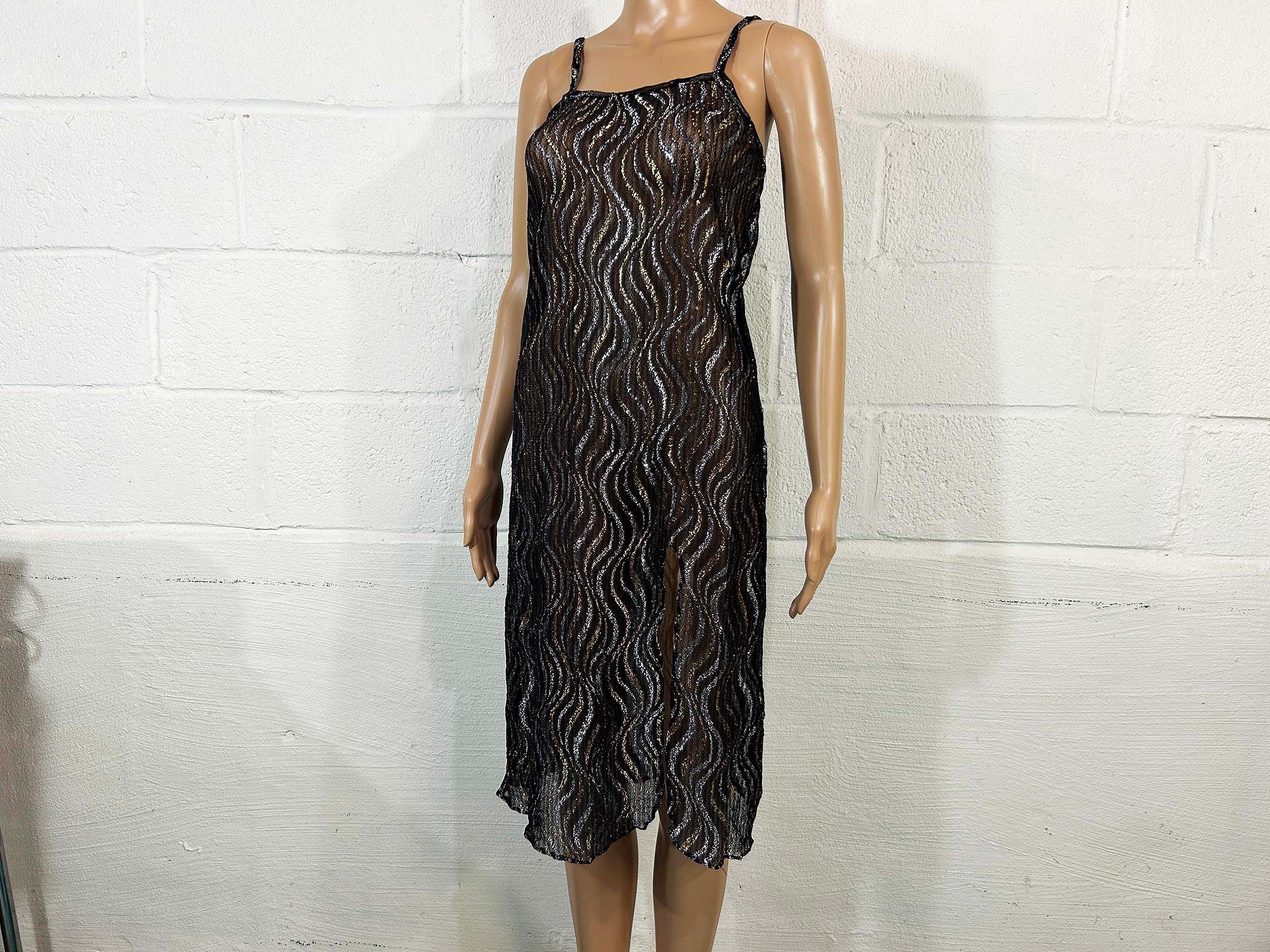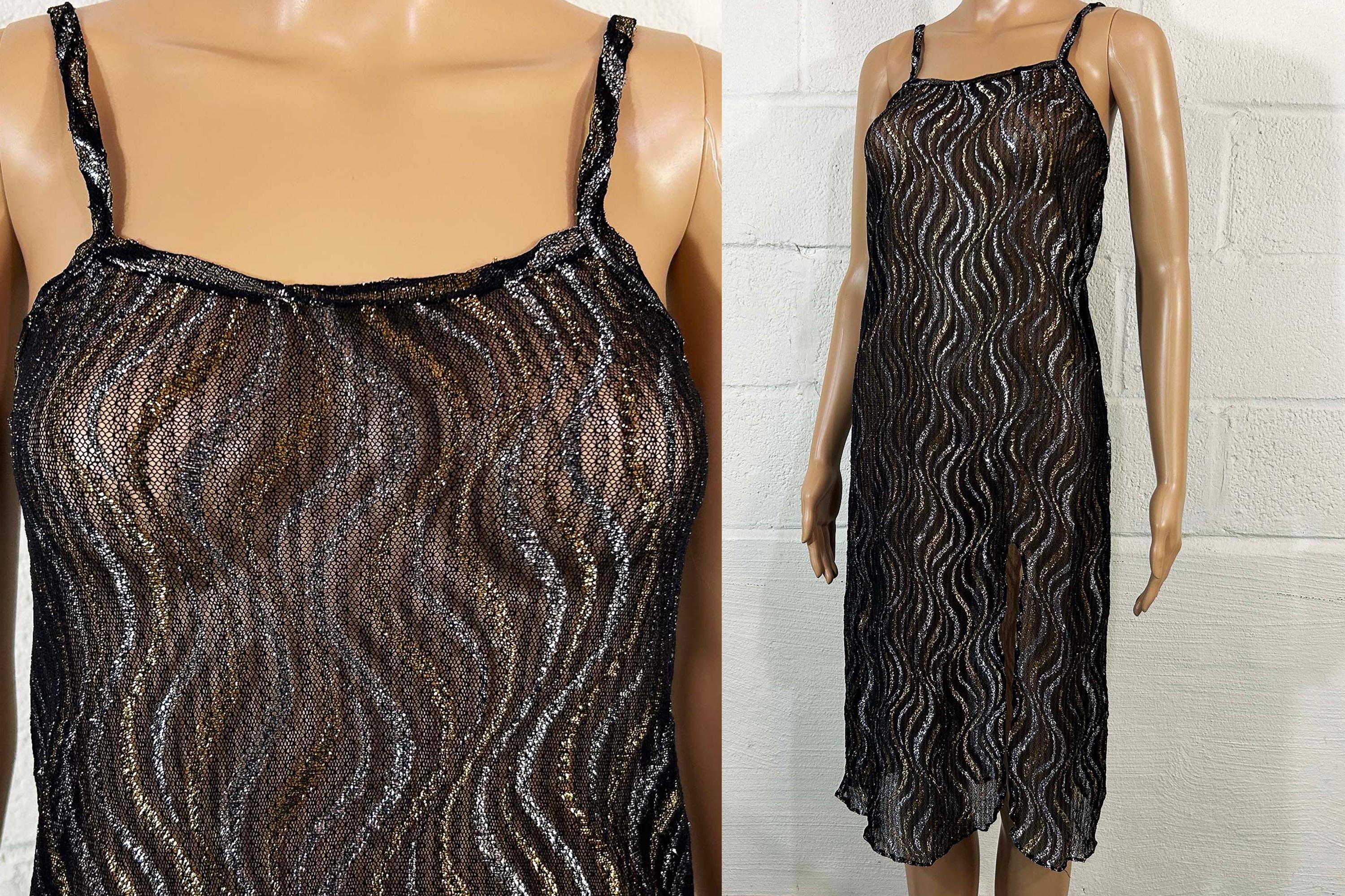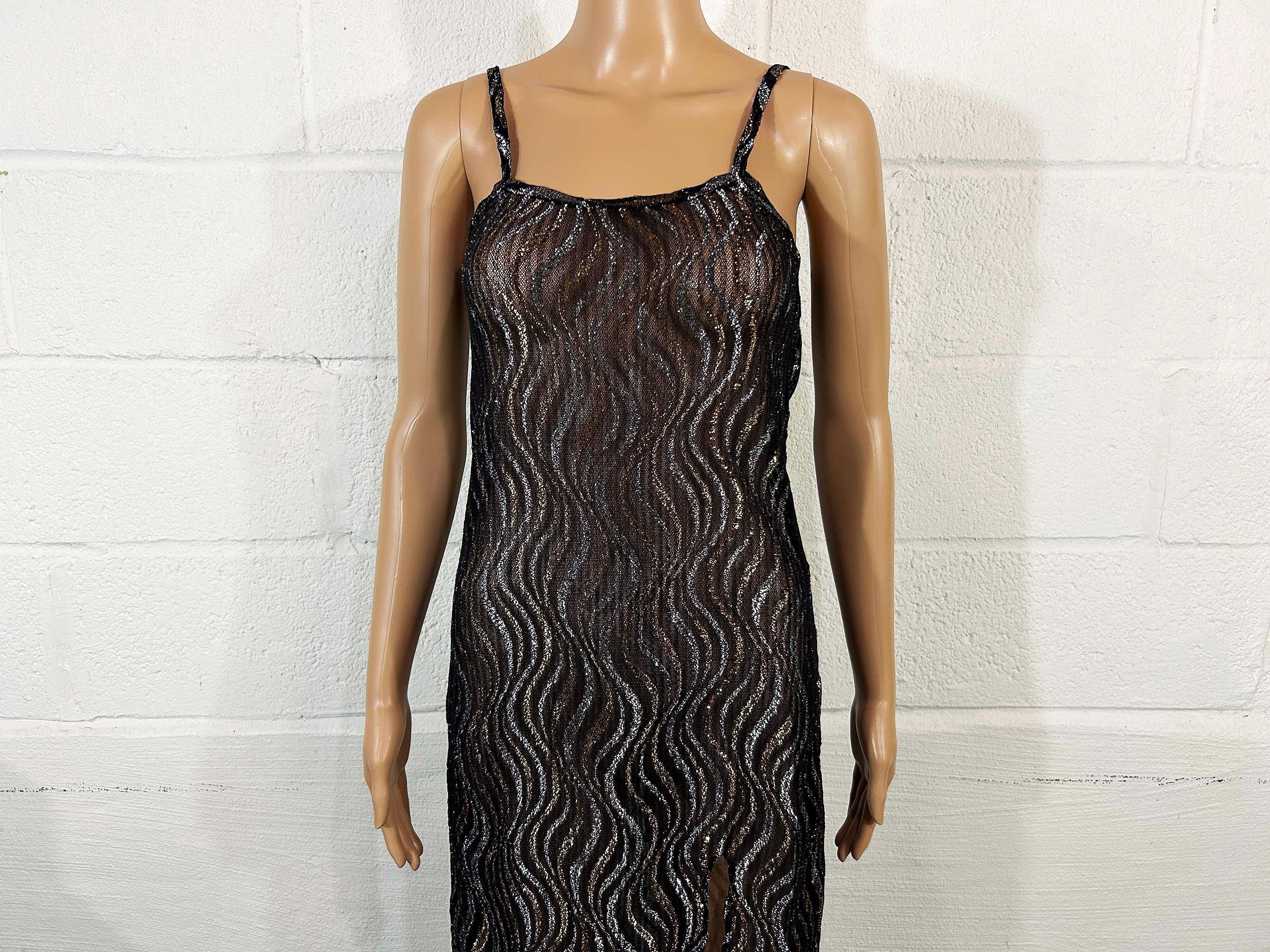 Vintage Sparkly Black Slip Dress Strappy Sleeveless Gold Silver Glitter Sheer New Year's Eve 1990s Small