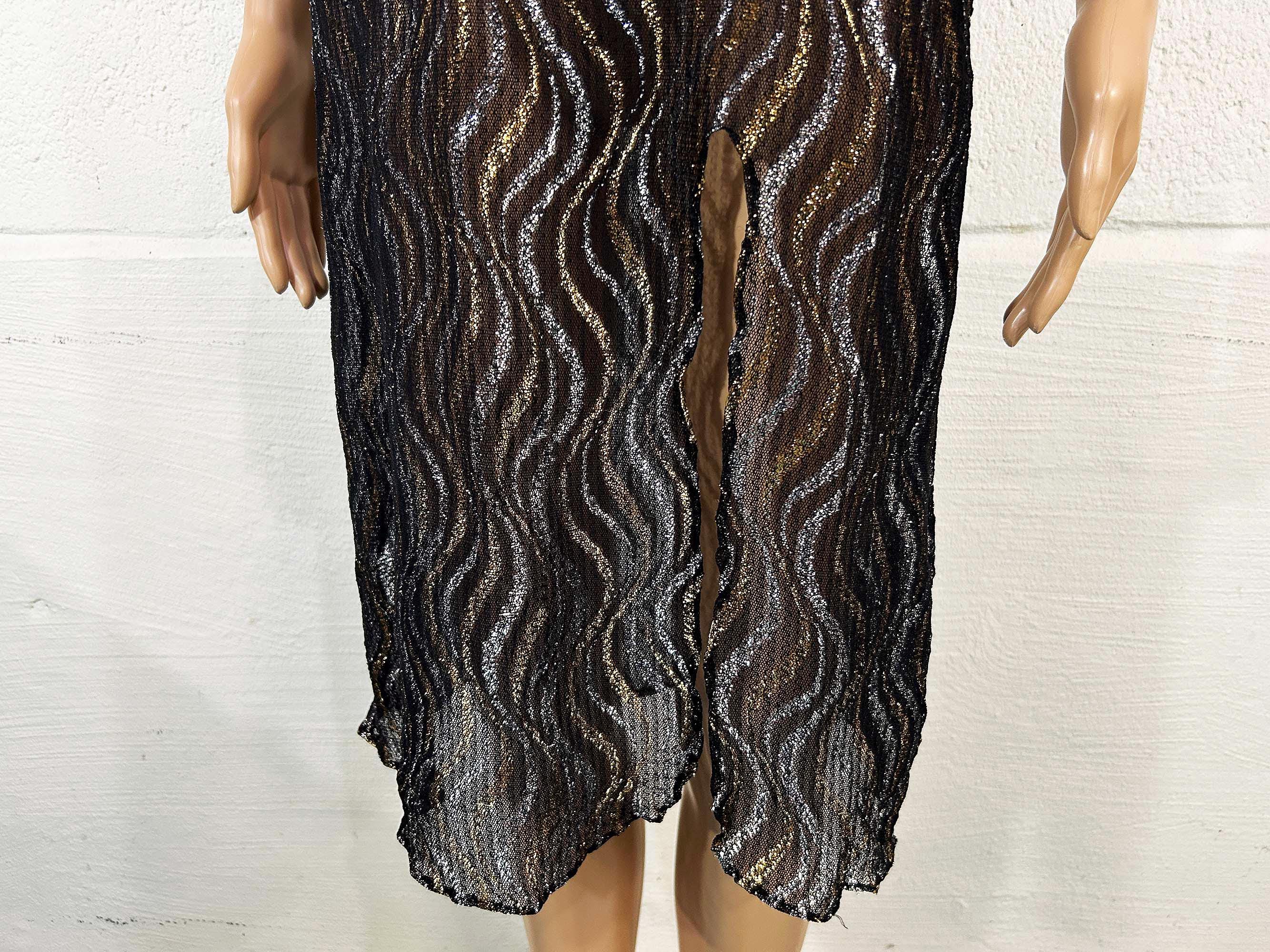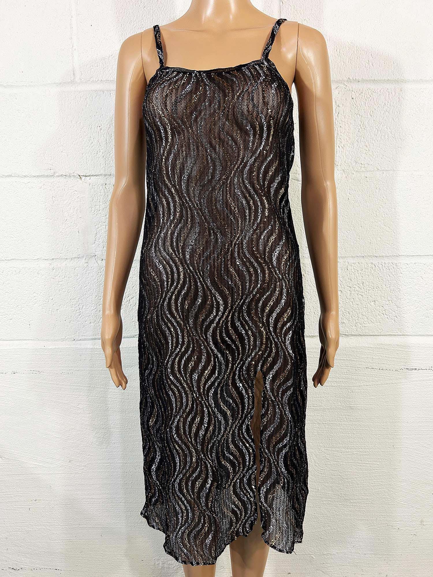Adorable black, gold, and silver sparkle sleeveless midi dress. Thin straps and a long 15 inch slit on one side. Fabric has some stretch.