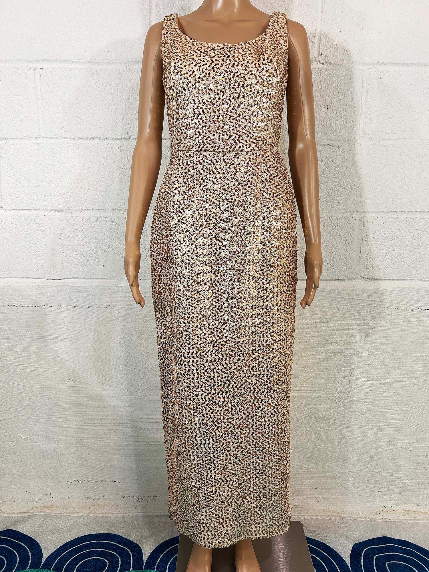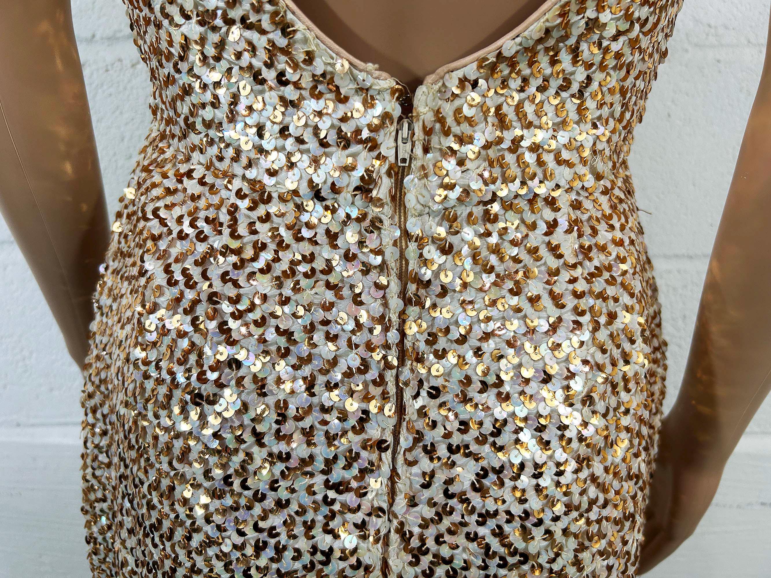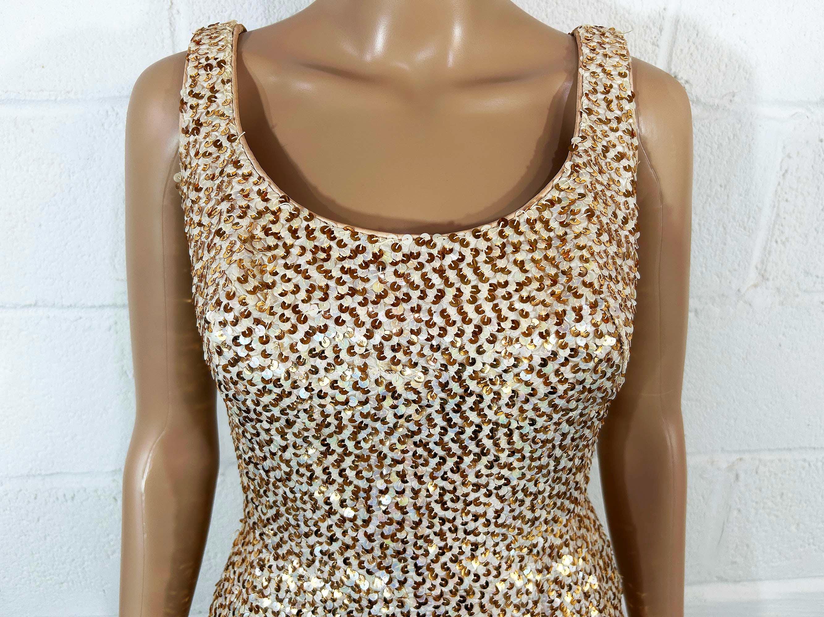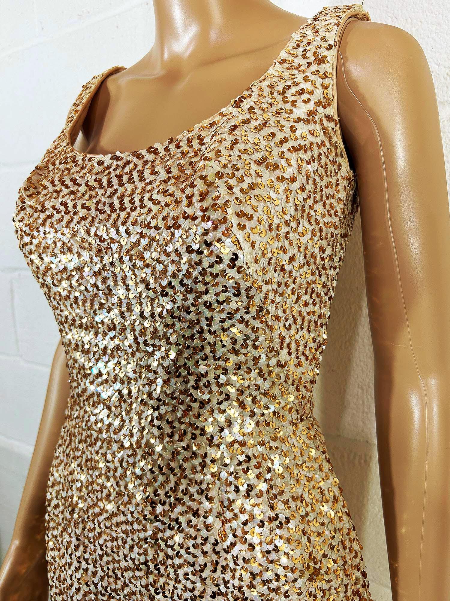 Gorgeous champagne colored sequin sleeveless formal dress! Dress is in great vintage condition with no significant flaws. There is a zipper in the back with a 13 inch slit. Fabric has no stretch and is lined with satin. The dress has no tag but it is very well made! It was purchased from an estate just outside of Washington, DC.