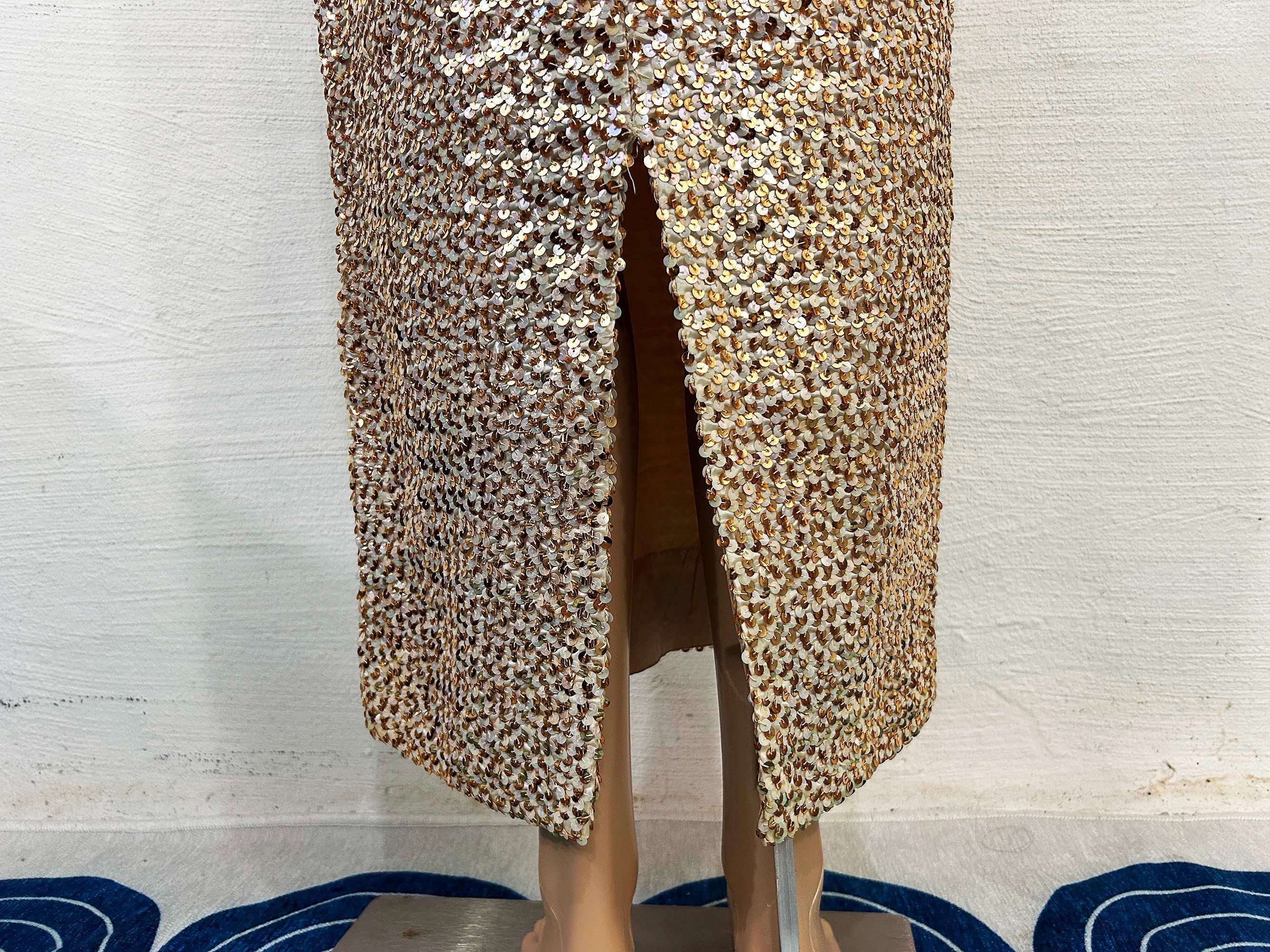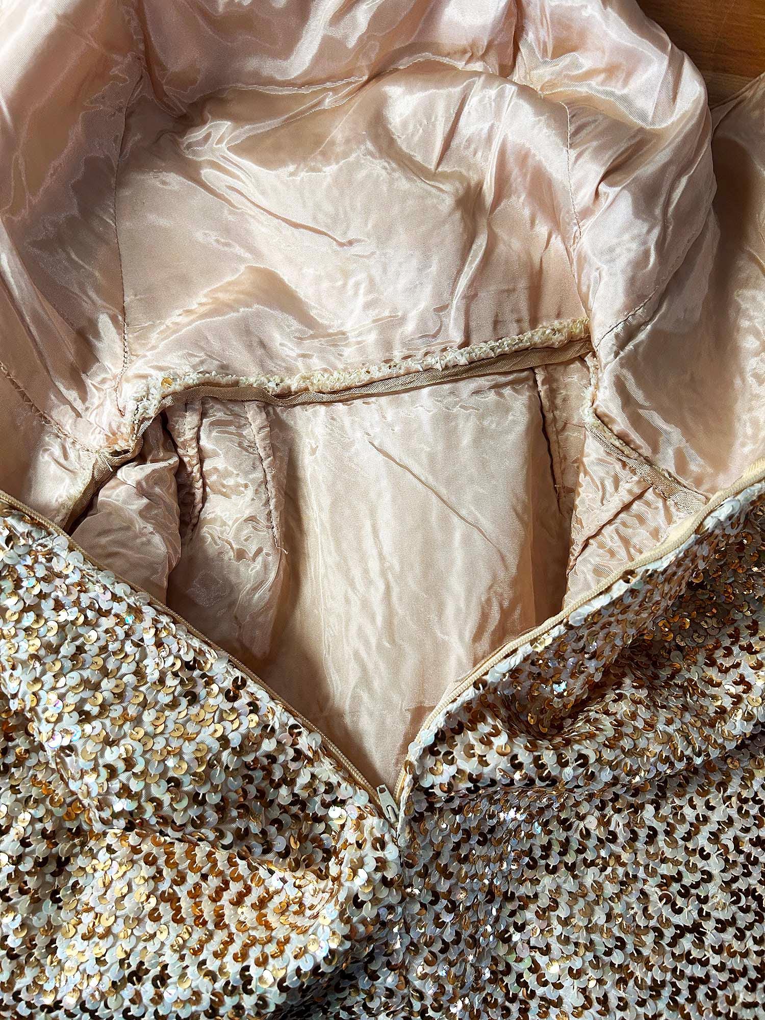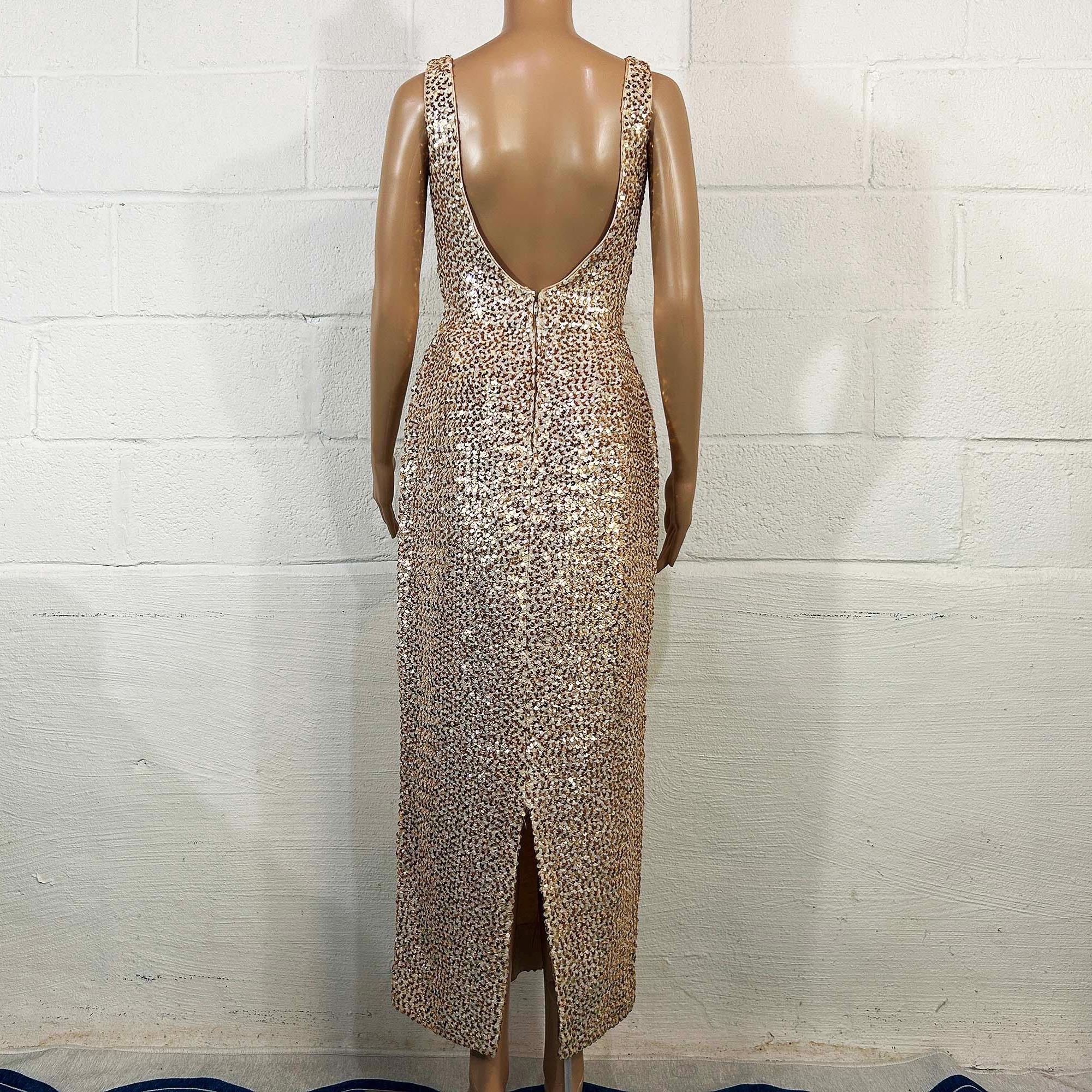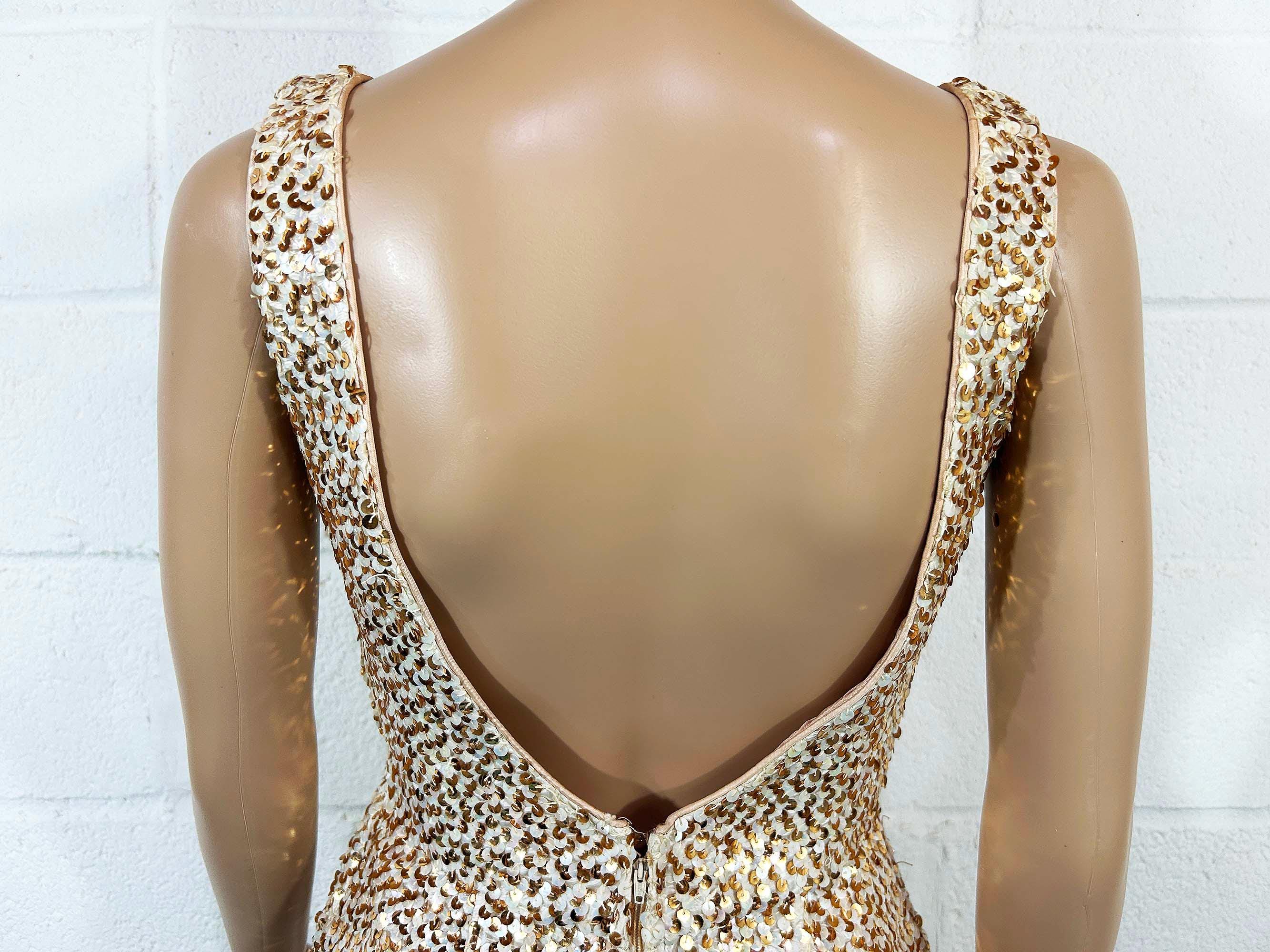 Gorgeous champagne colored sequin sleeveless formal dress! Dress is in great vintage condition with no significant flaws. There is a zipper in the back with a 13 inch slit. Fabric has no stretch and is lined with satin. The dress has no tag but it is very well made! It was purchased from an estate just outside of Washington, DC.