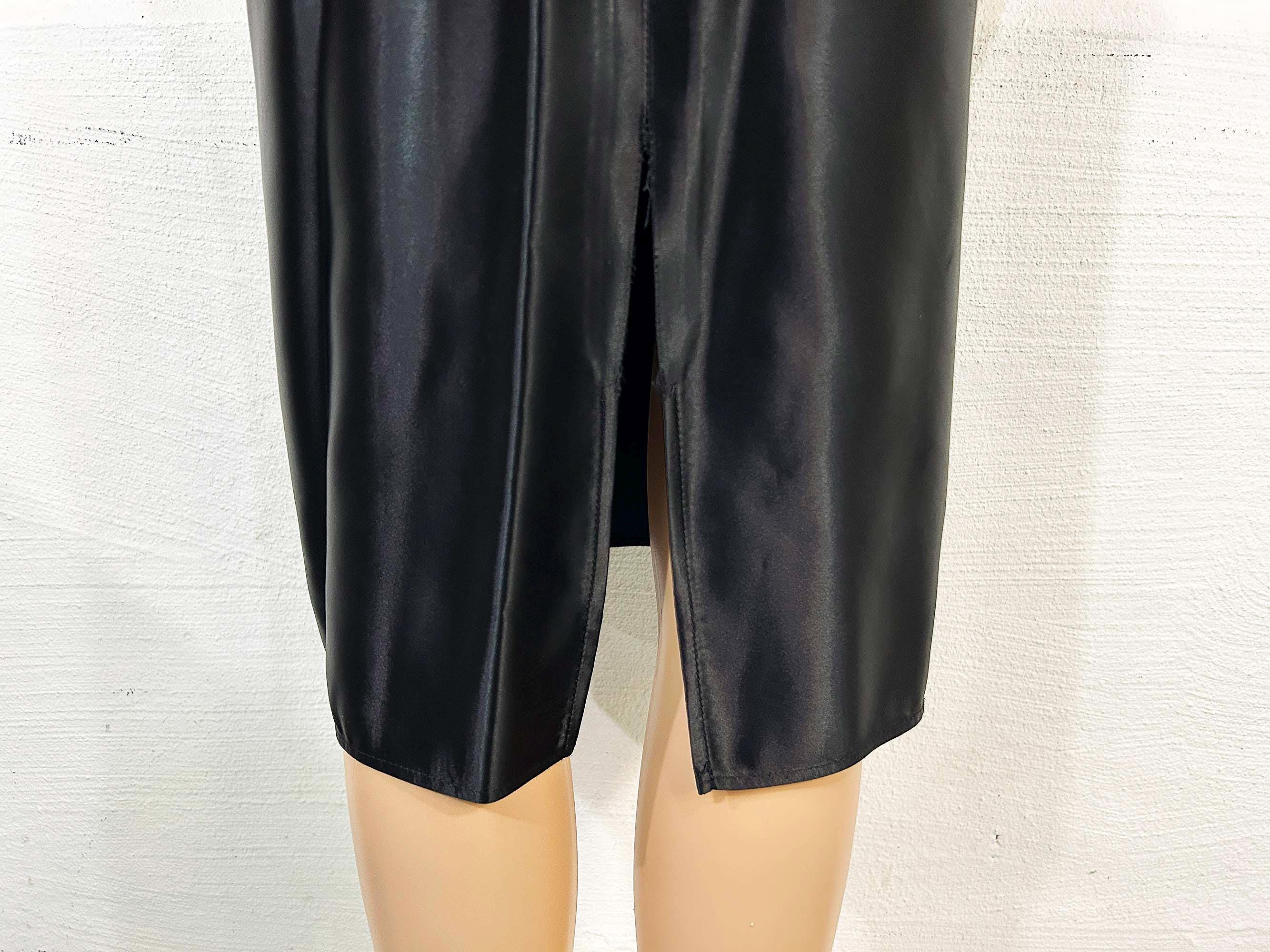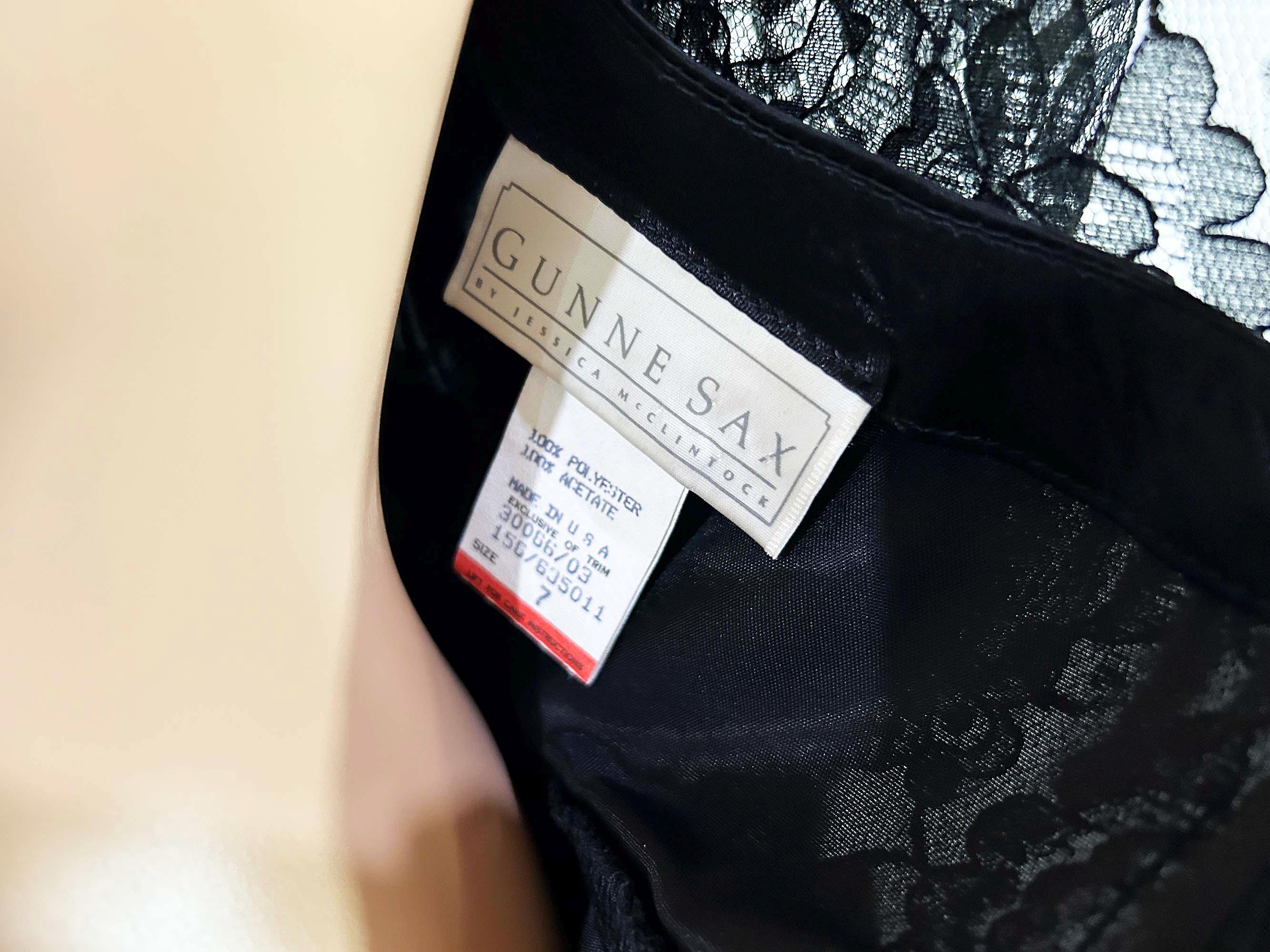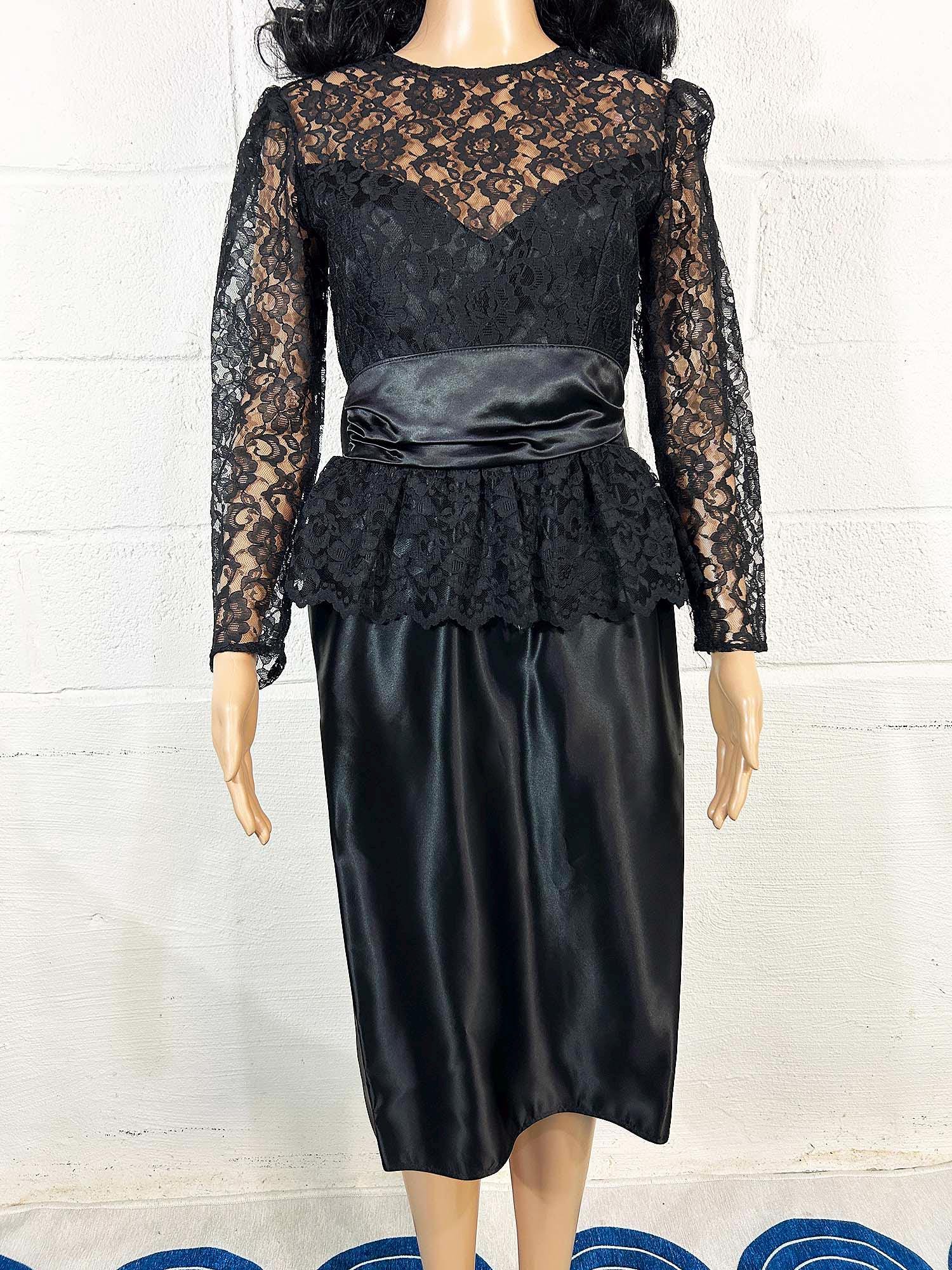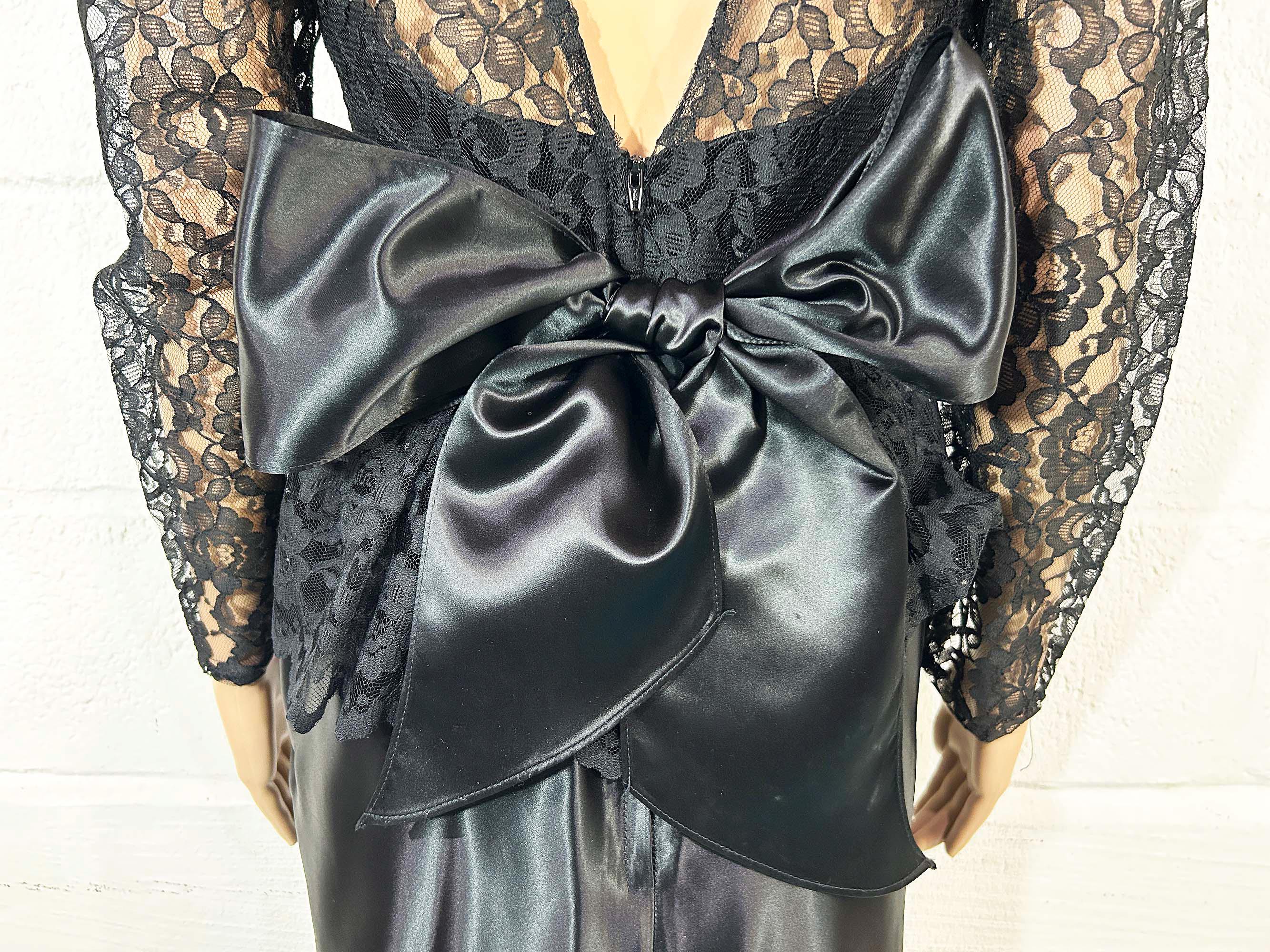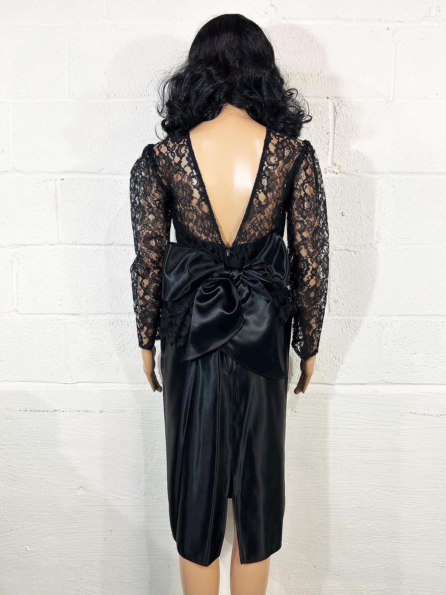 Incredible black lace dress with a large tie bow at the waist. Deep v in the back with a zipper. Long lace sleeves and peplum detail. In great vintage condition with no significant flaws.