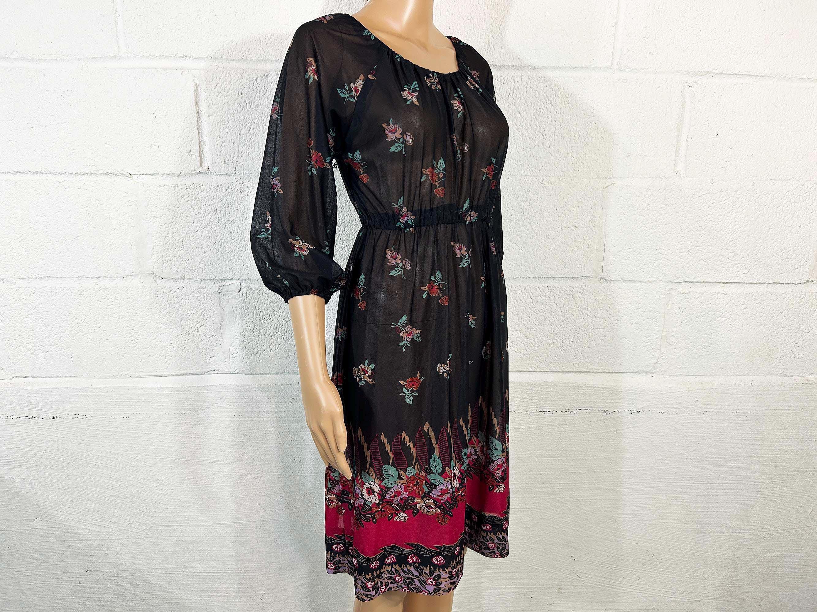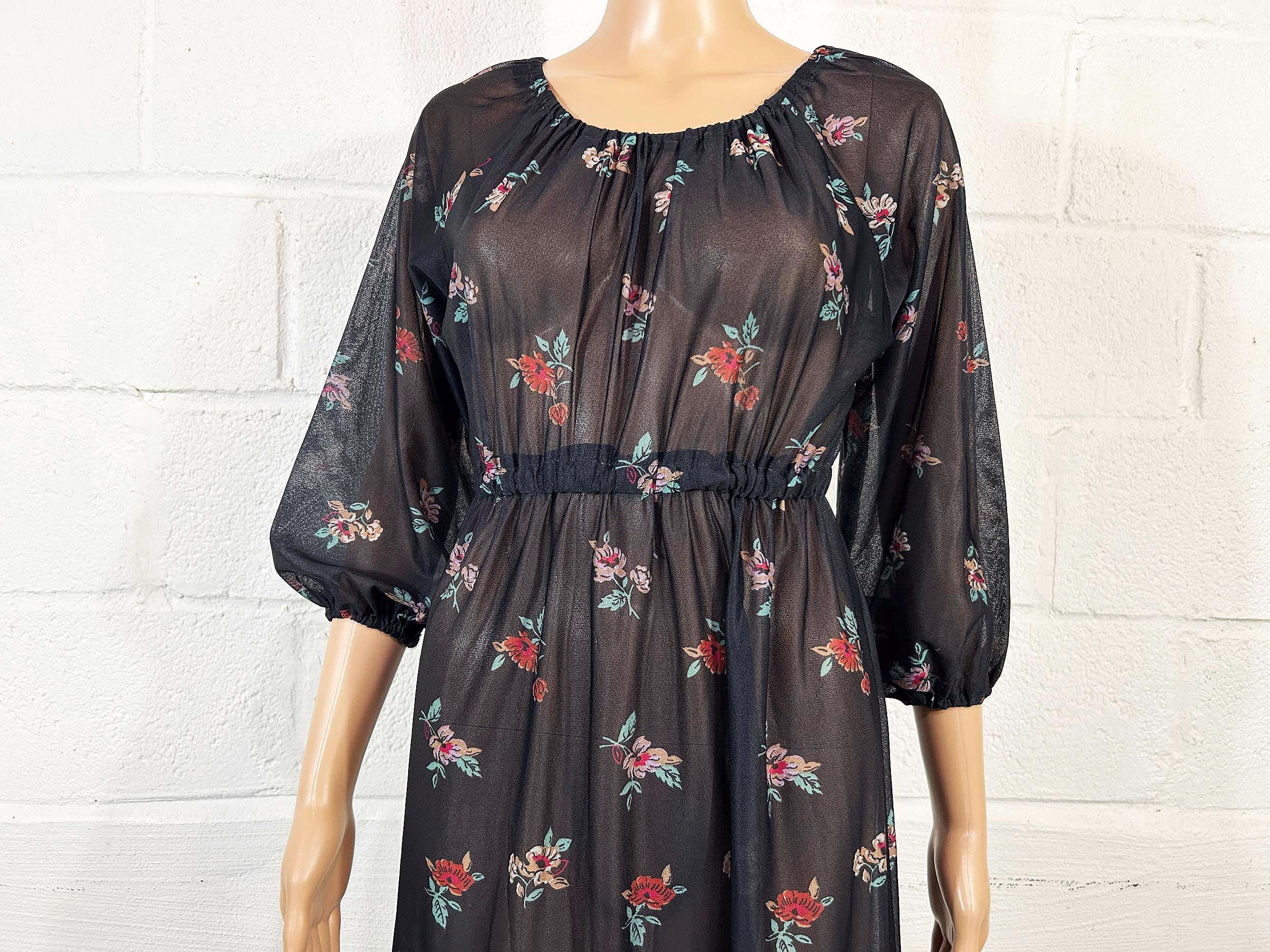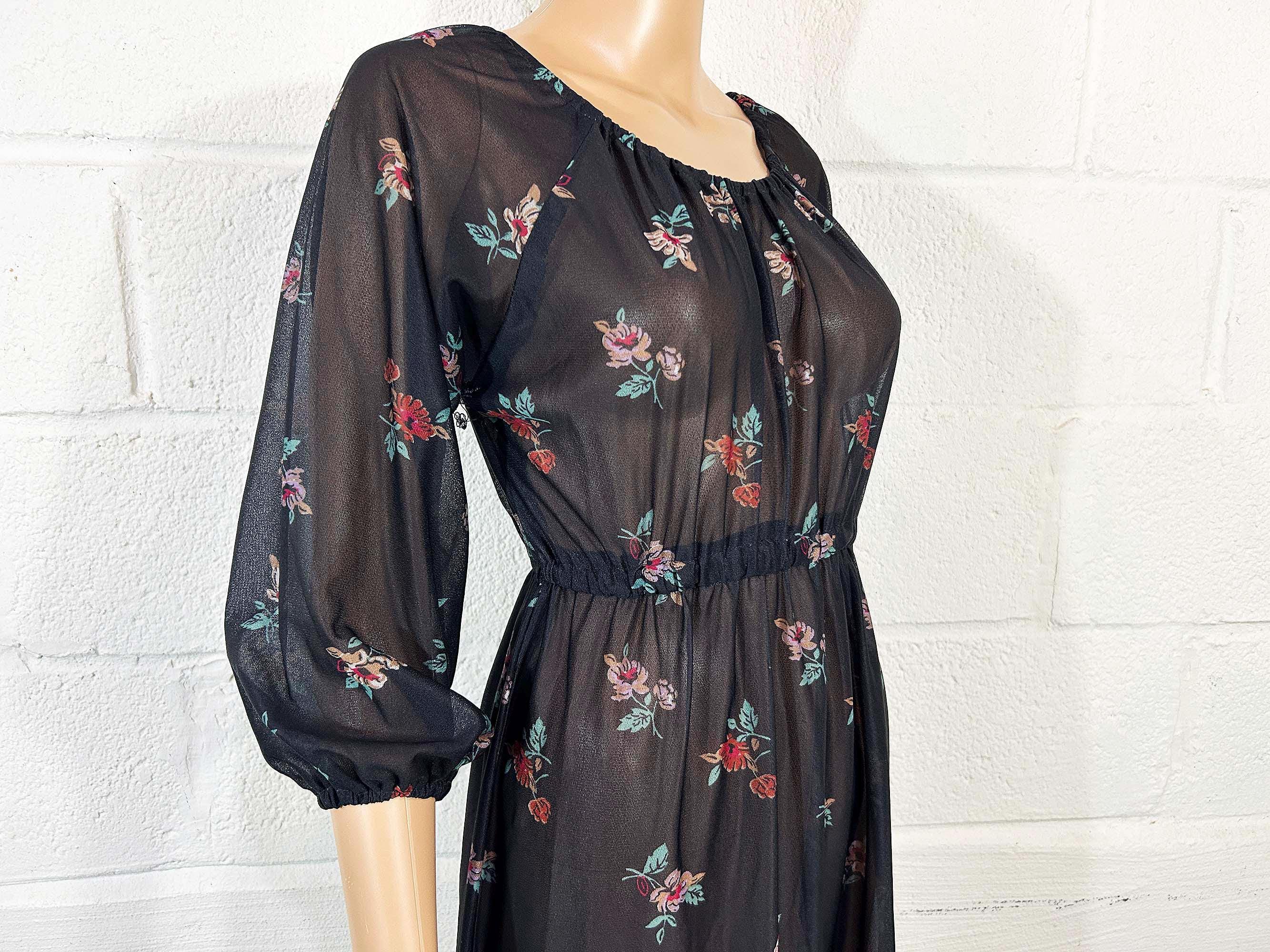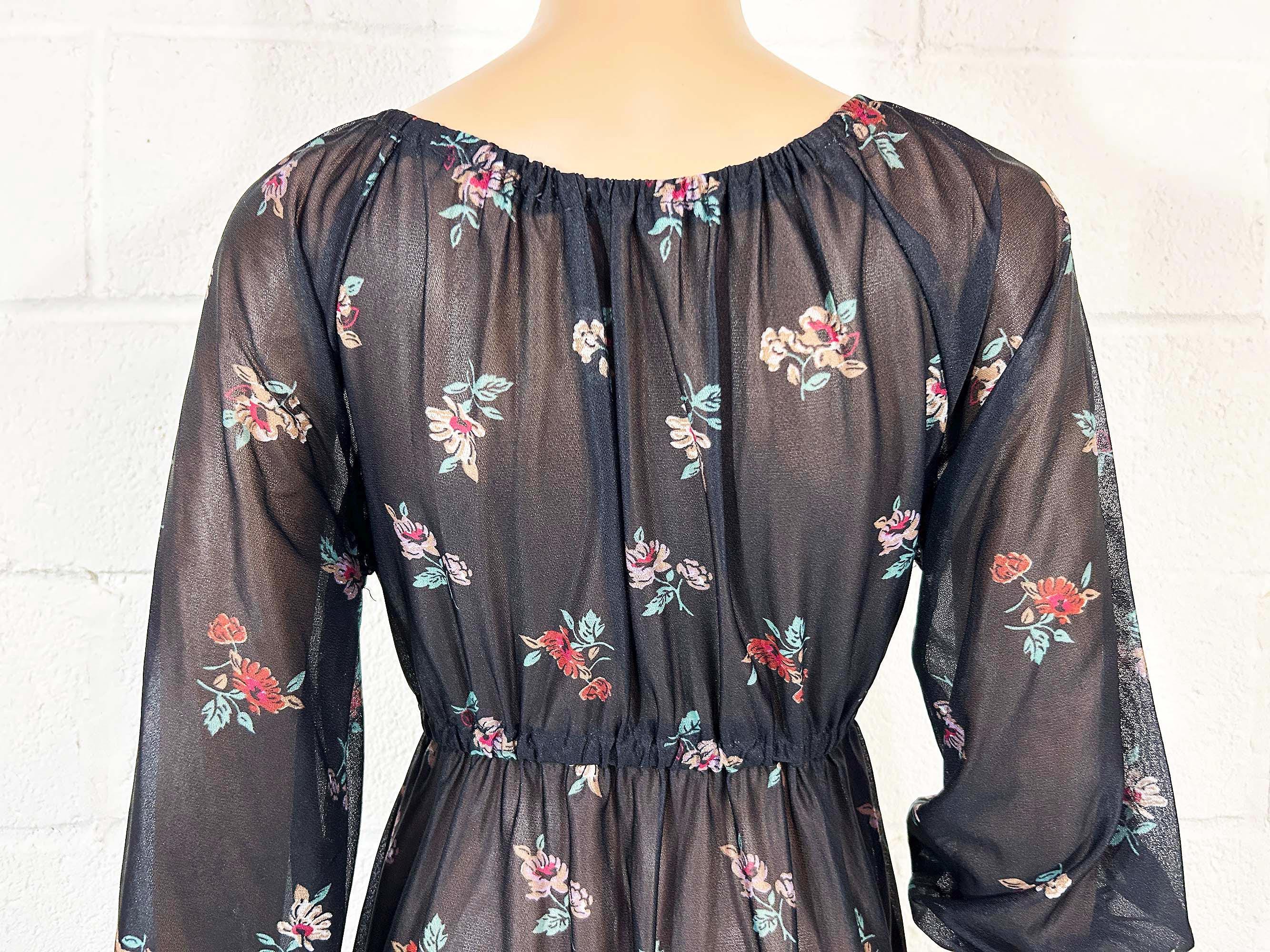 Lovely sheer floral dress with peasant sleeves. Elastic scoop neckline and an elastic waist. The material has slight stretch and is sheer. Dress is in overall good vintage condition.