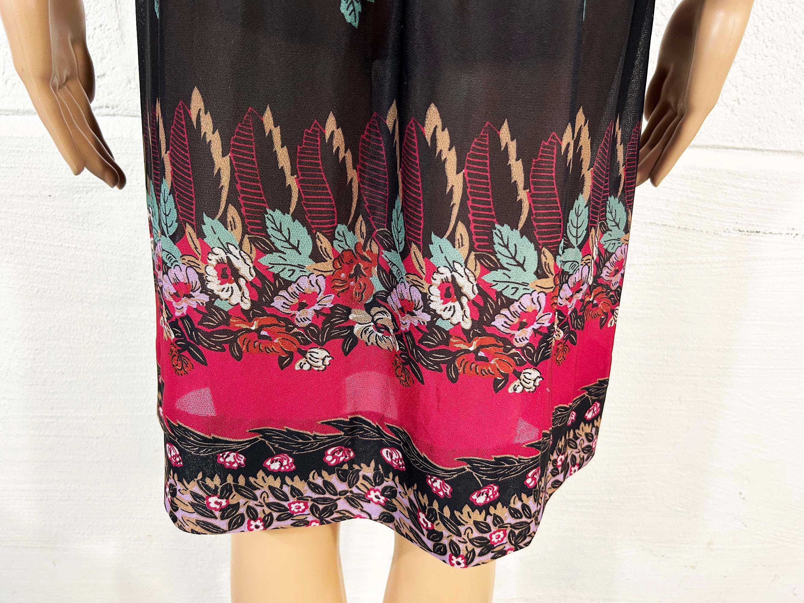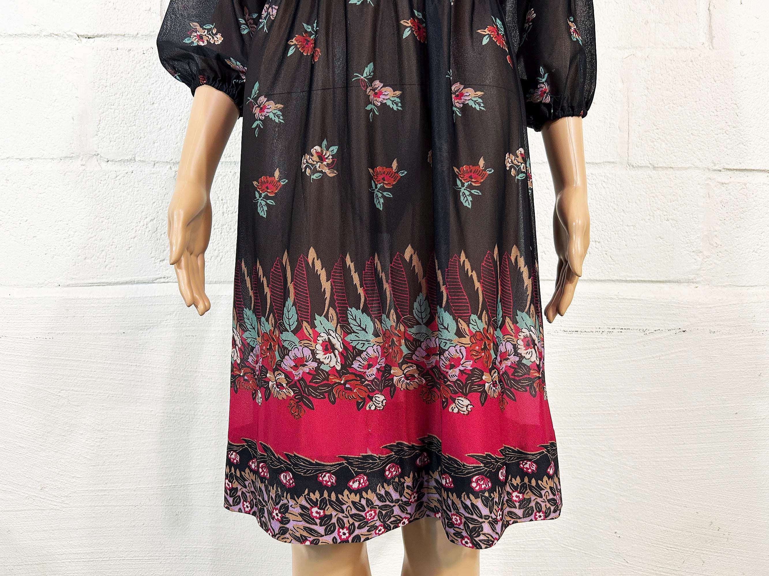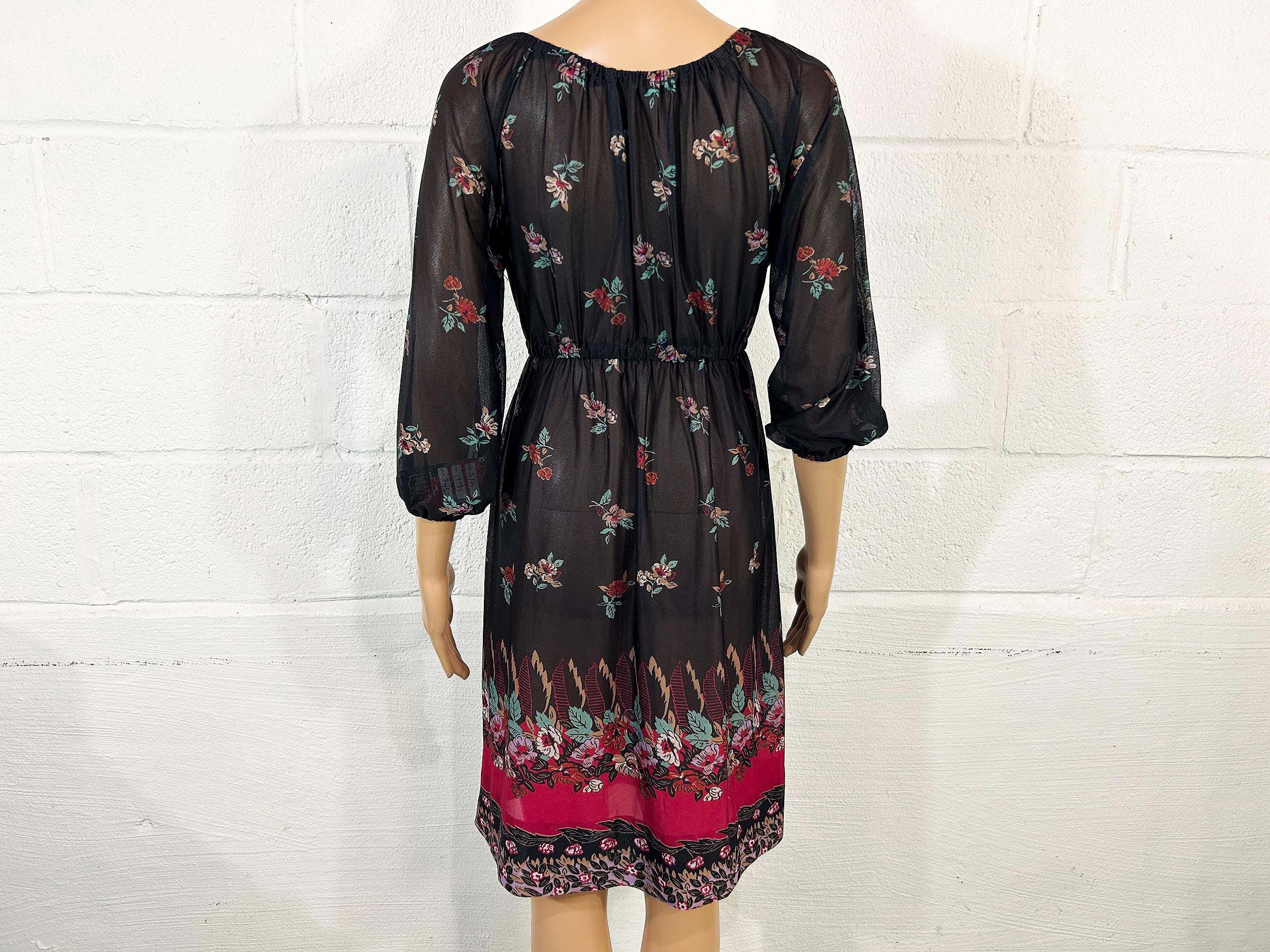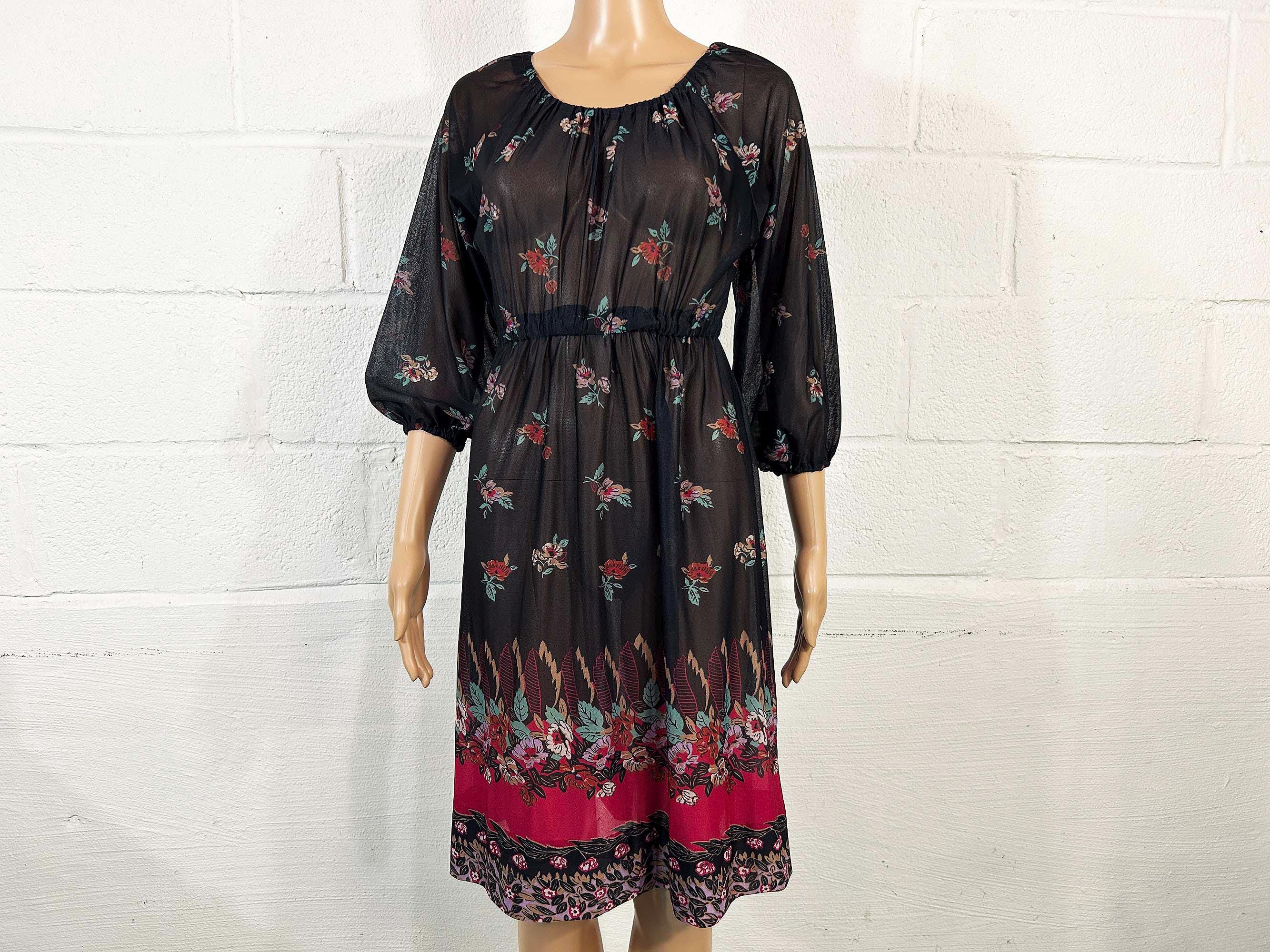 Lovely sheer floral dress with peasant sleeves. Elastic scoop neckline and an elastic waist. The material has slight stretch and is sheer. Dress is in overall good vintage condition.