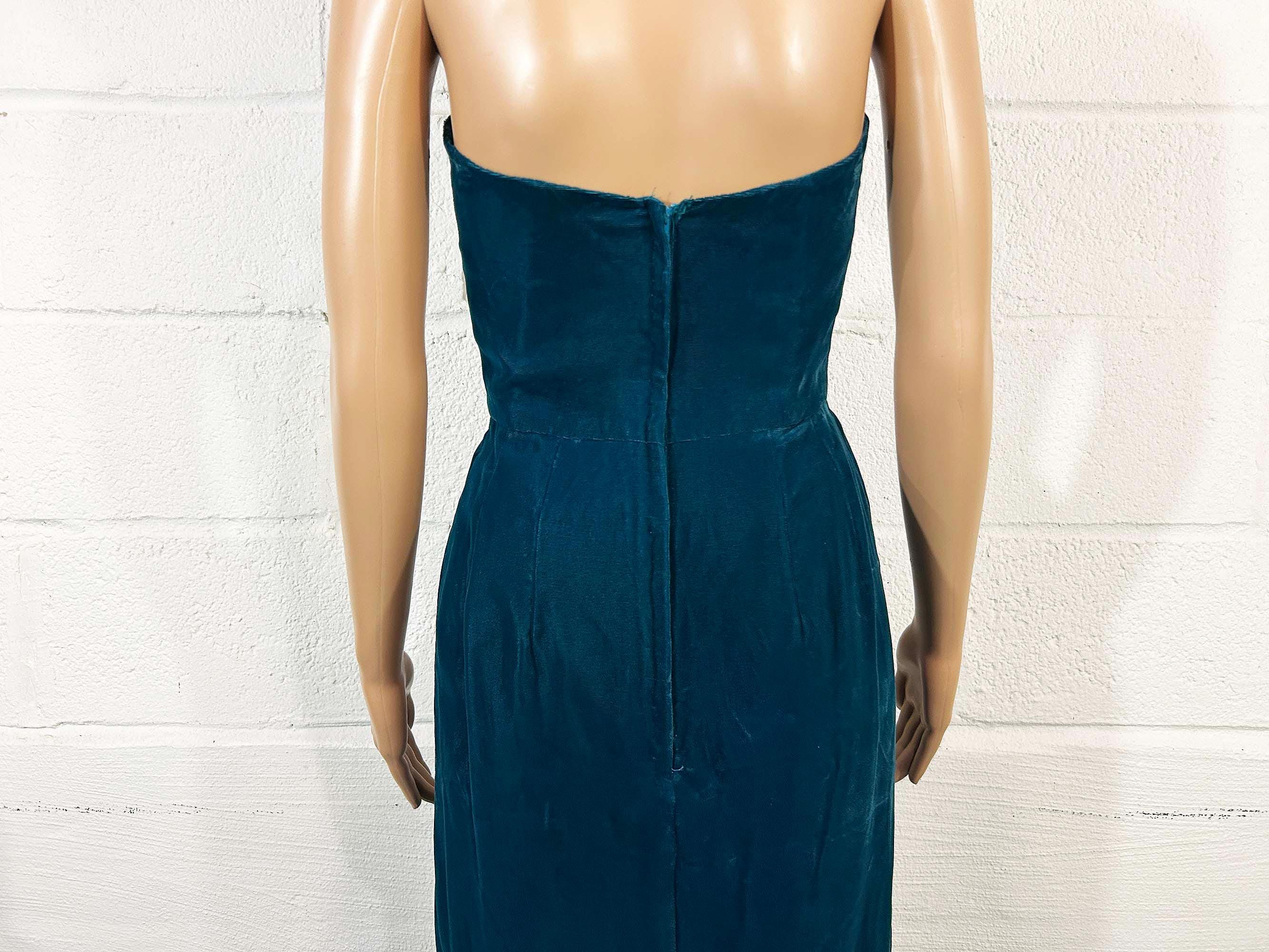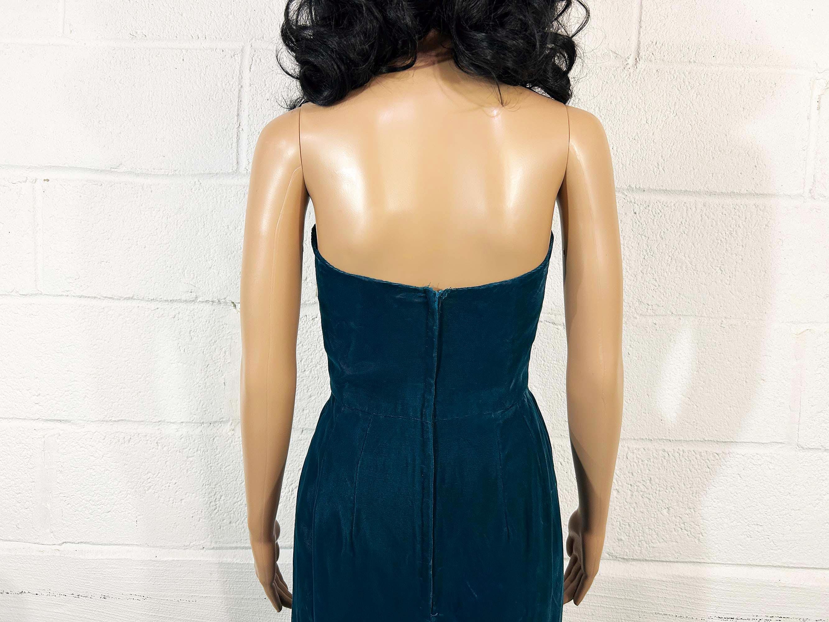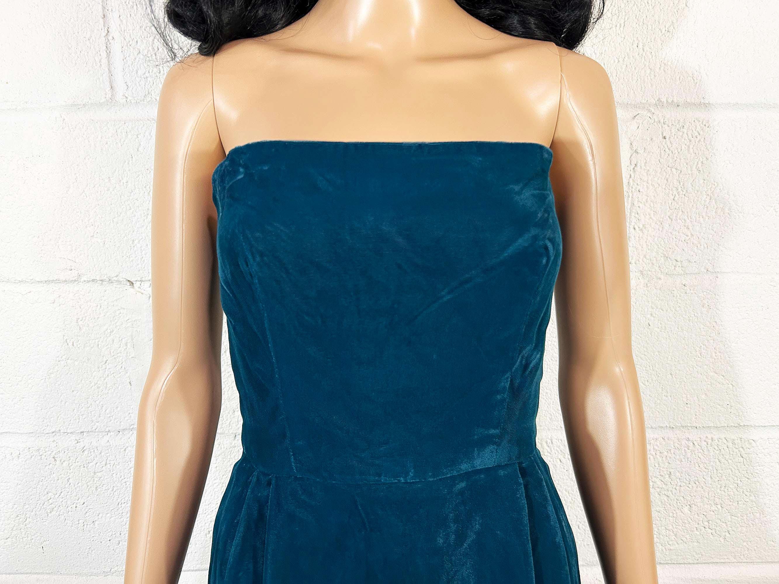 Incredible deep teal strapless velvet evening dress. I think this would make an awesome prom dress or party dress for New Year's Eve! Dress is in excellent shape with no significant flaws. Zipper and 13 inch slit in the back. Fabric has no stretch.