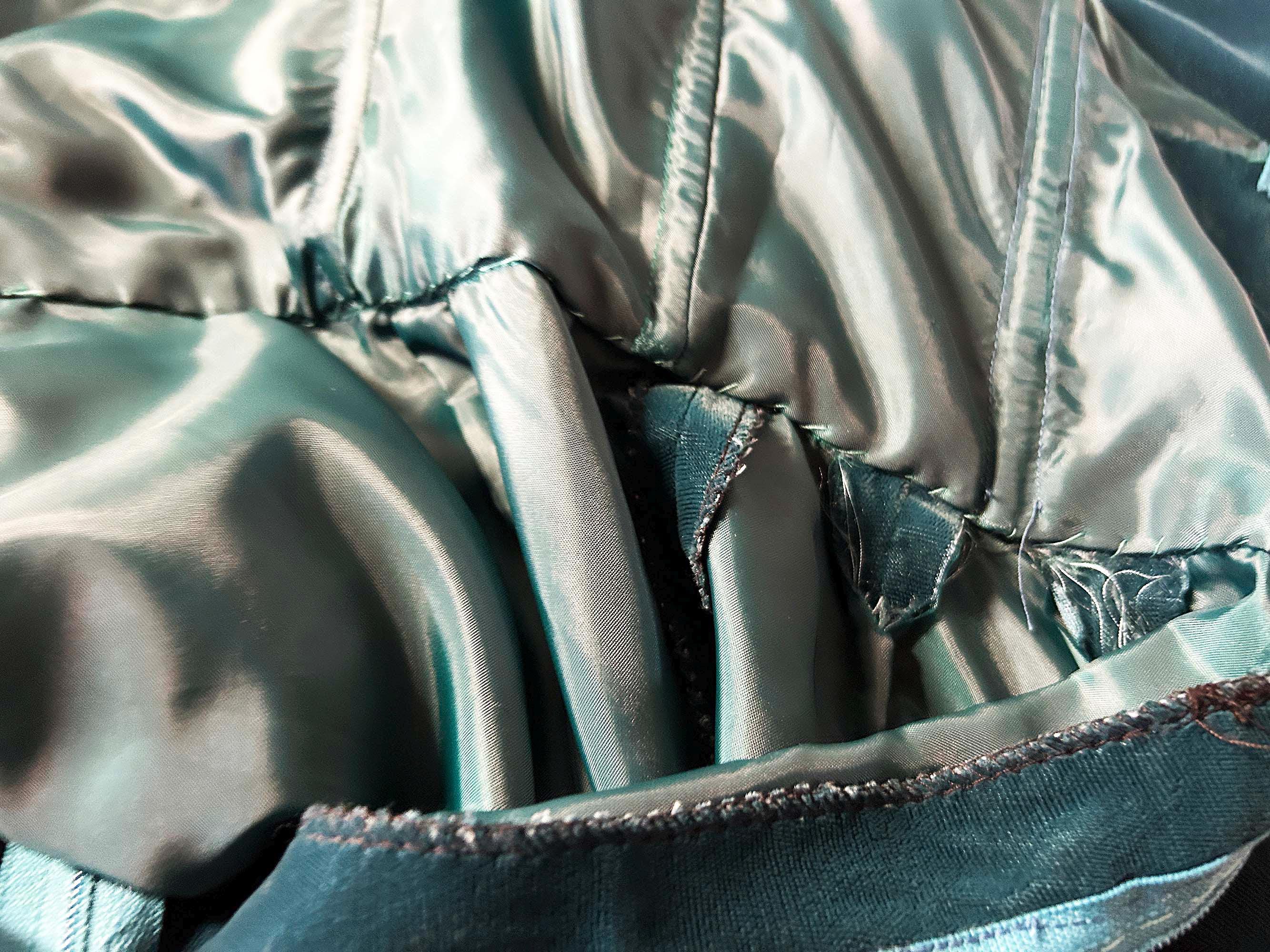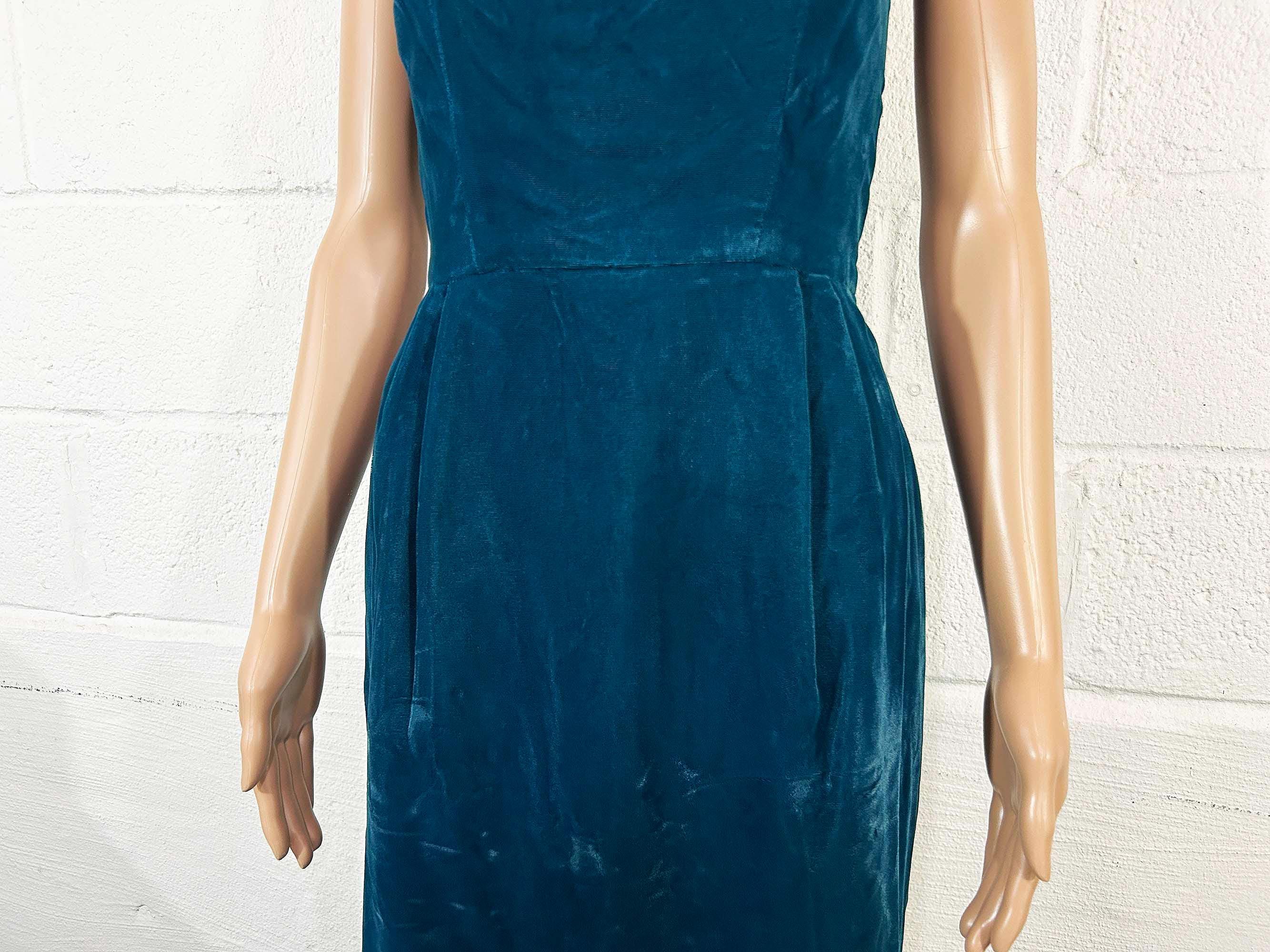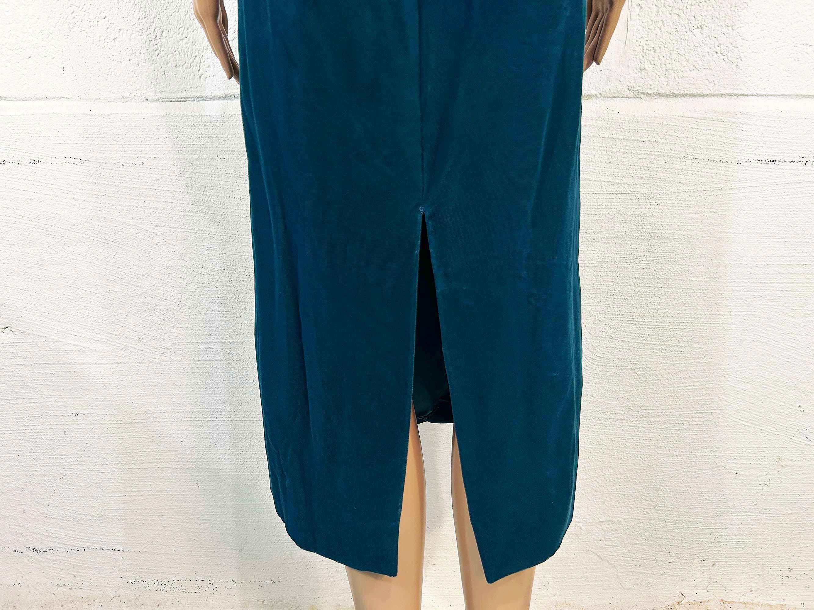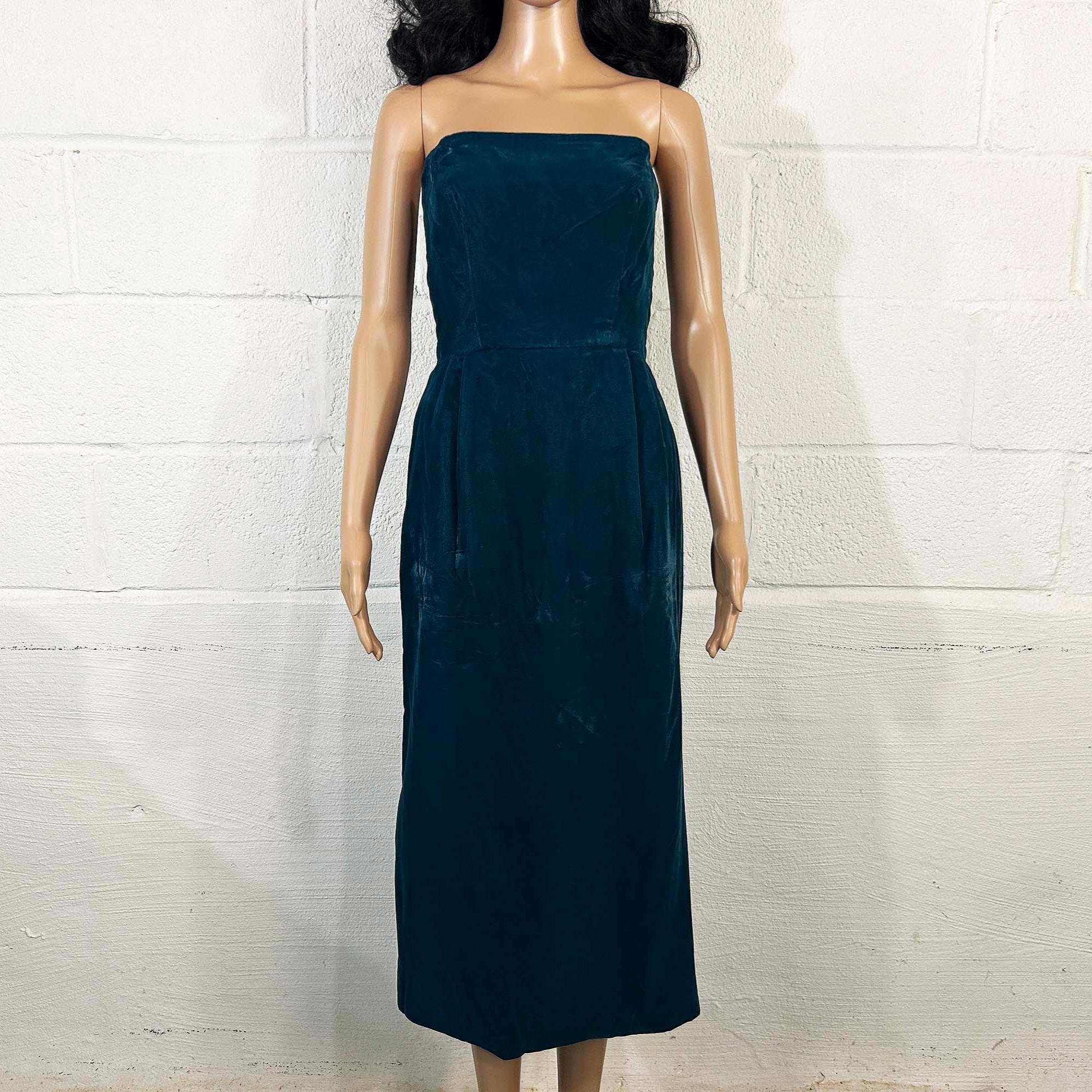 Incredible deep teal strapless velvet evening dress. I think this would make an awesome prom dress or party dress for New Year's Eve! Dress is in excellent shape with no significant flaws. Zipper and 13 inch slit in the back. Fabric has no stretch.