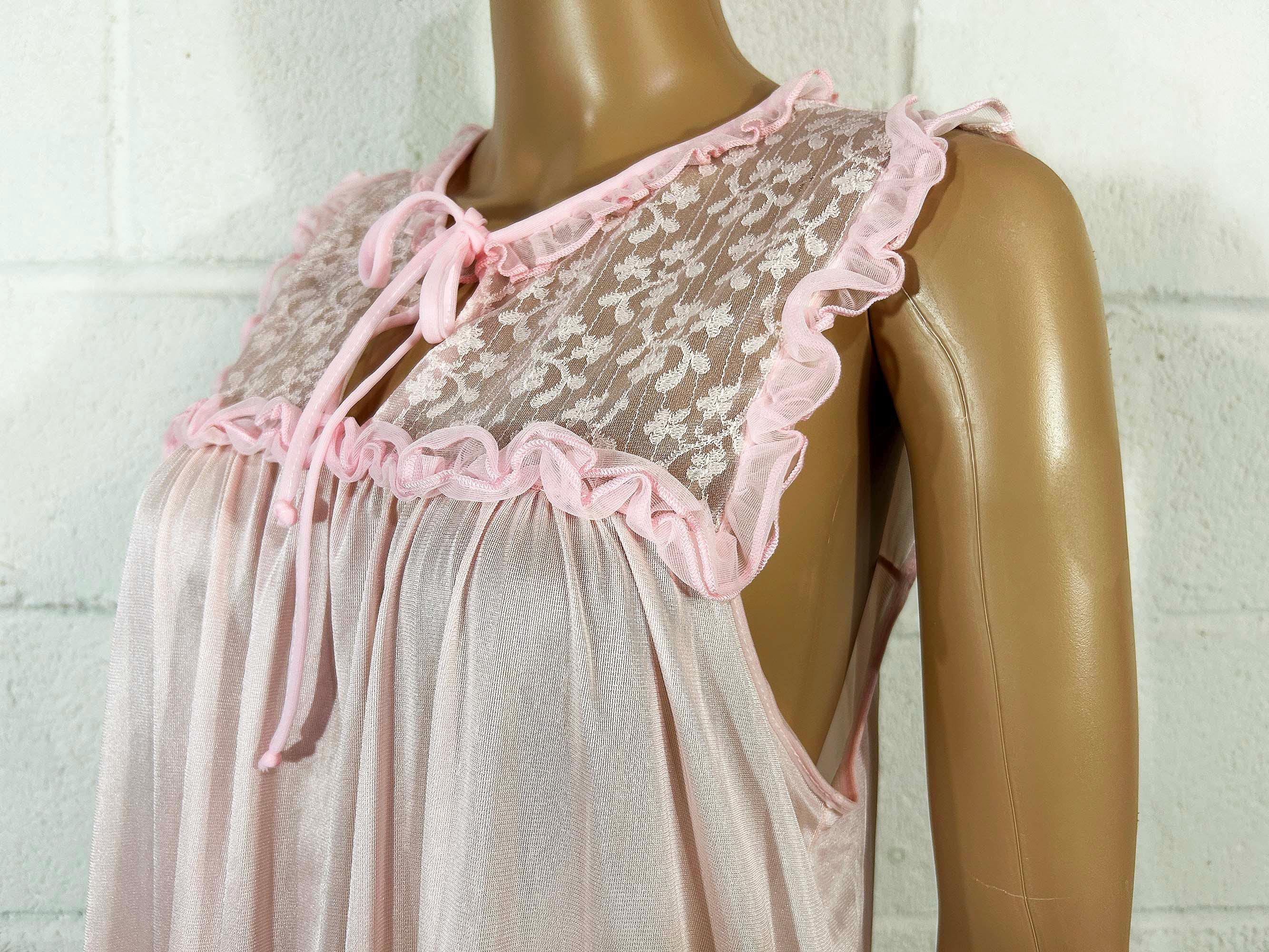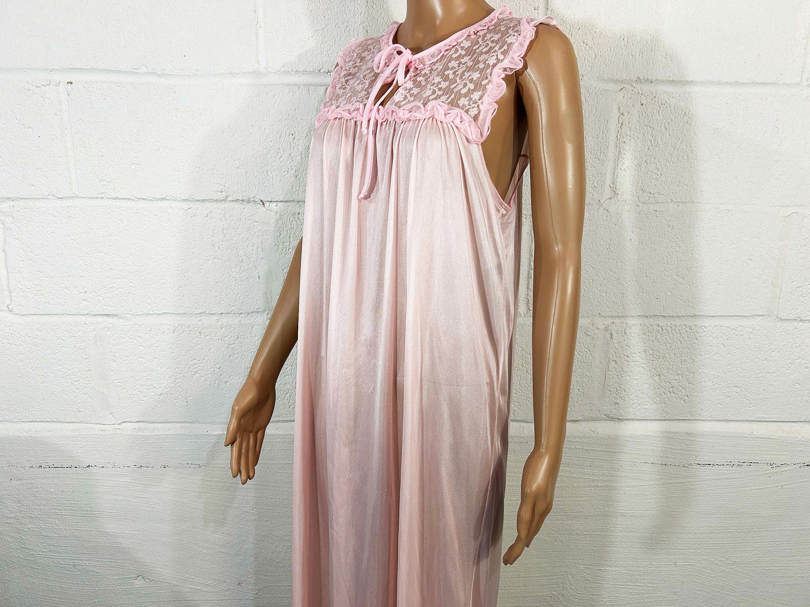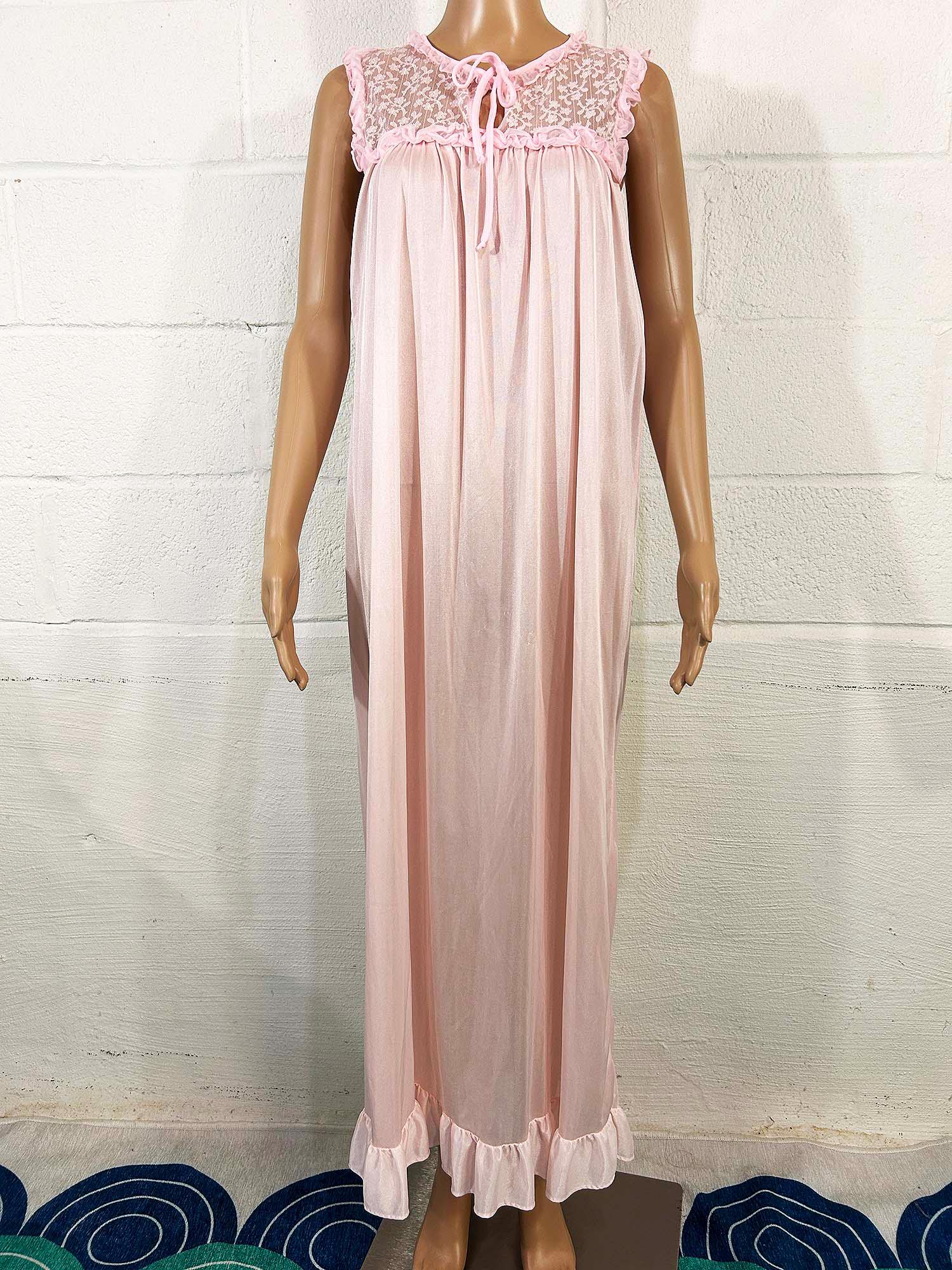 Adorable baby pink nylon long nightgown. Wide straps and lace trim at the neckline with a tie at the front. Fabric has slight stretch.