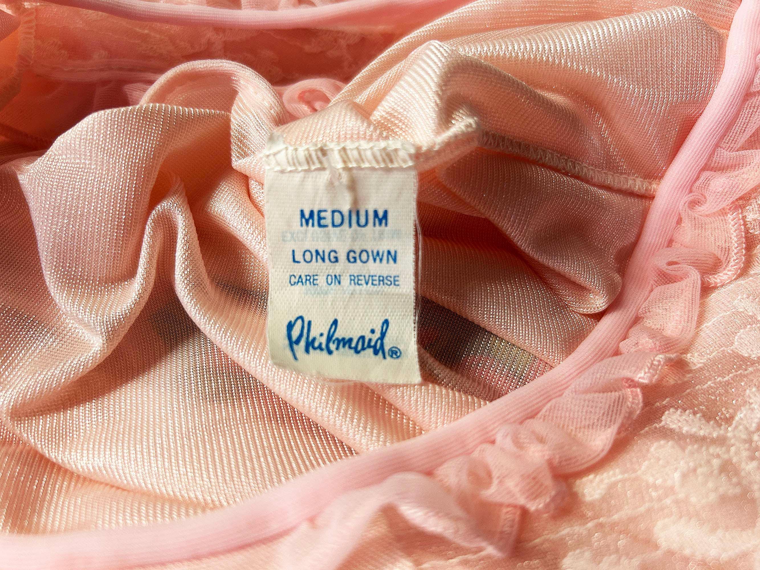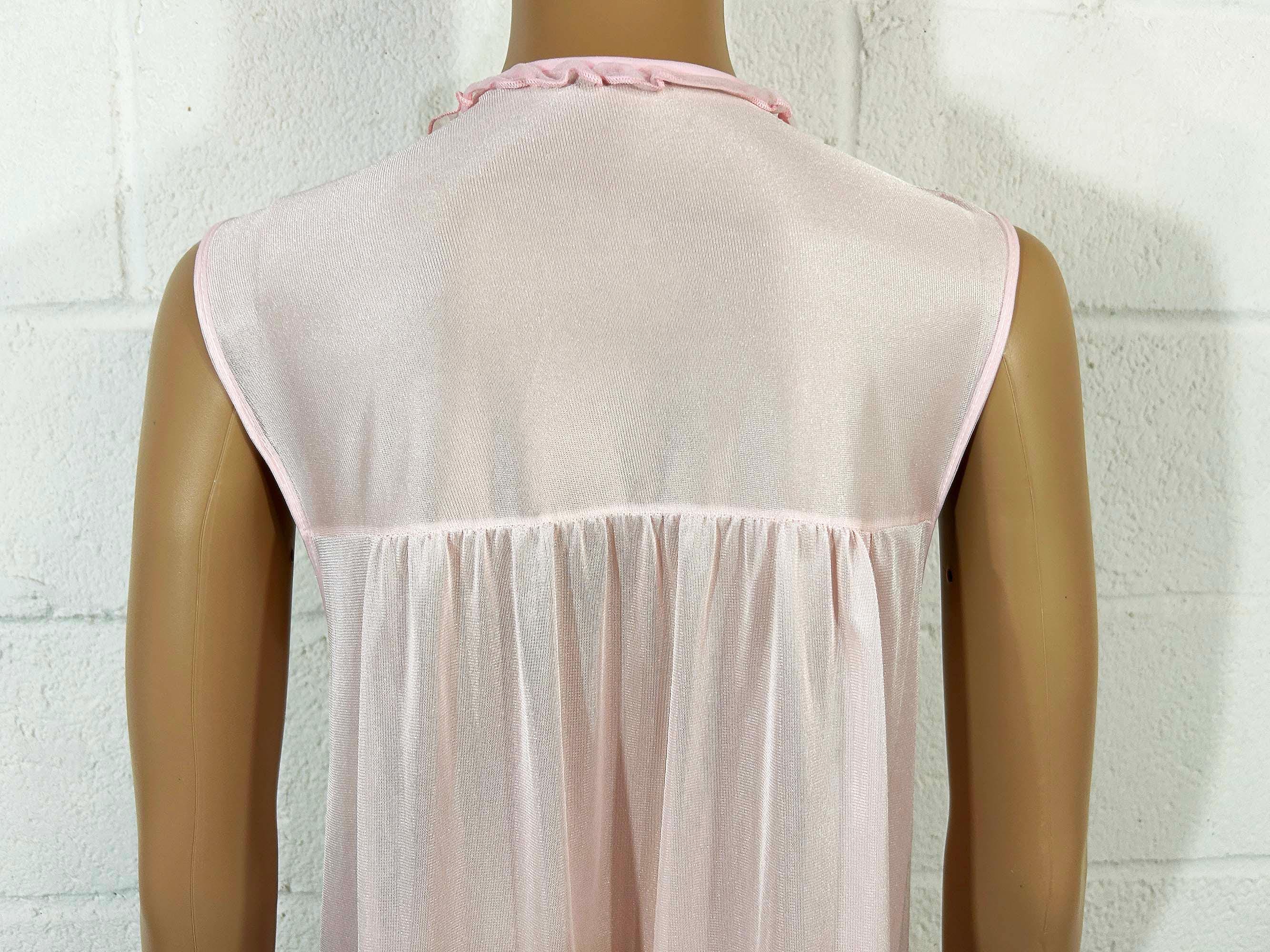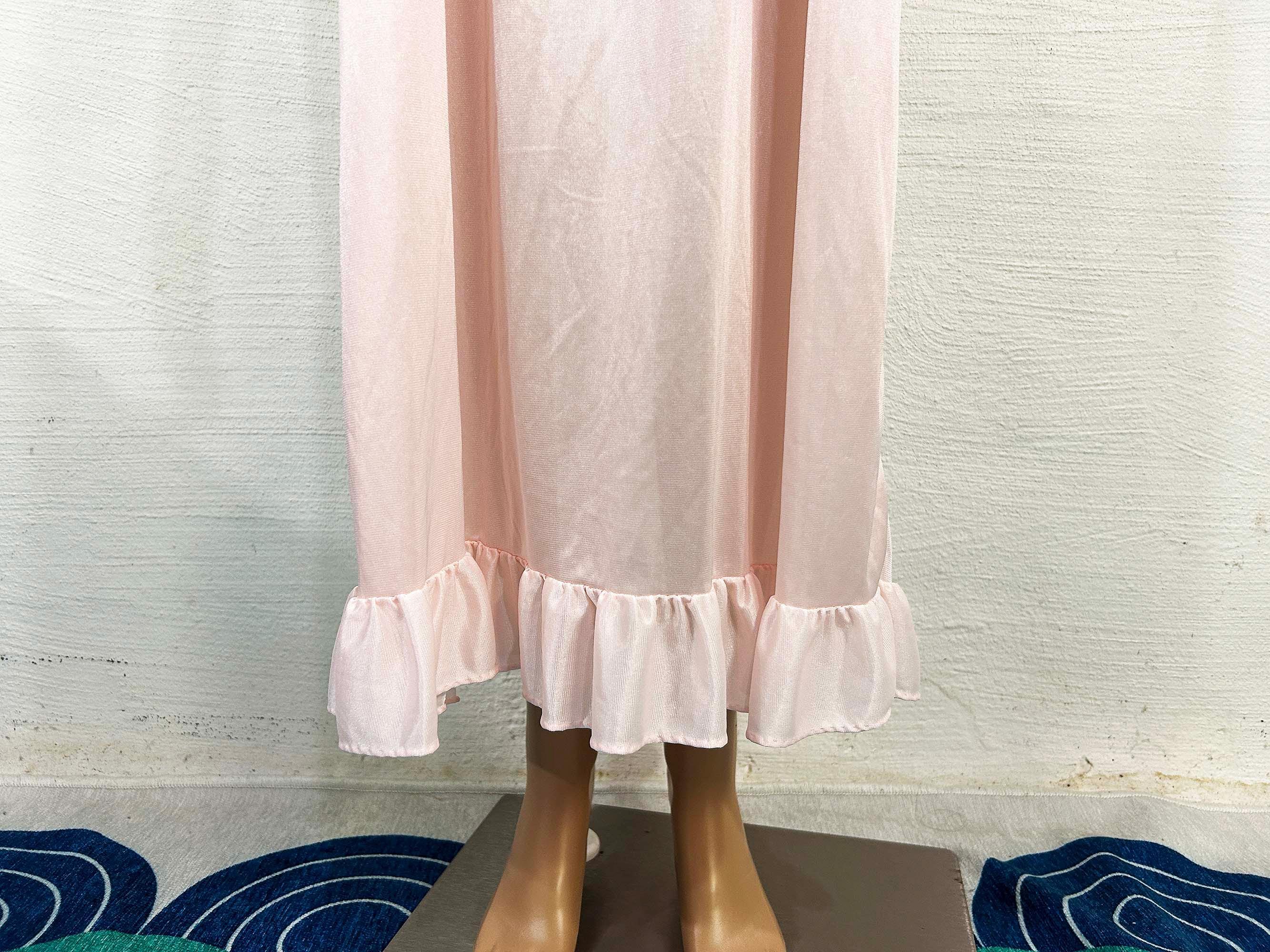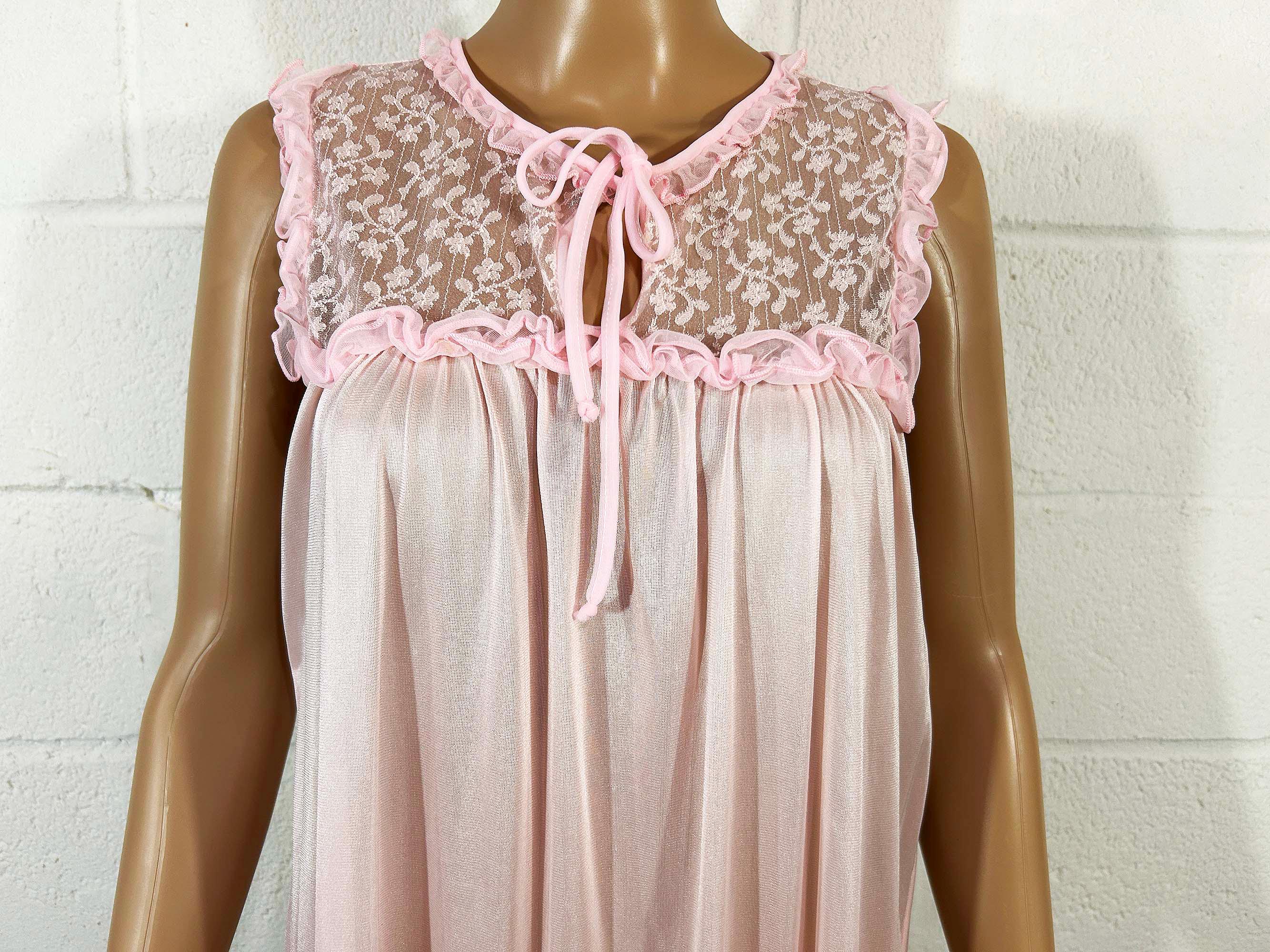 Adorable baby pink nylon long nightgown. Wide straps and lace trim at the neckline with a tie at the front. Fabric has slight stretch.