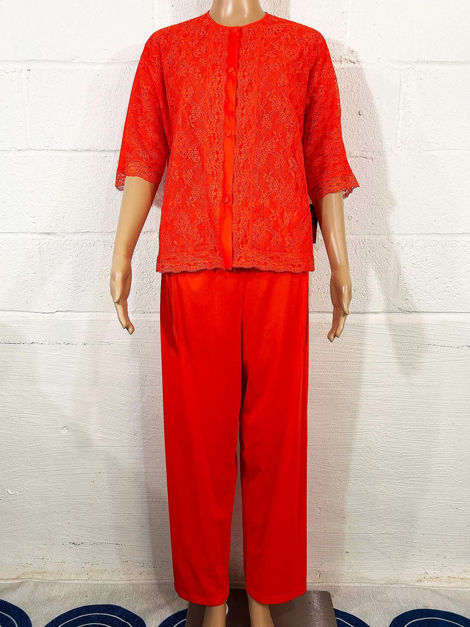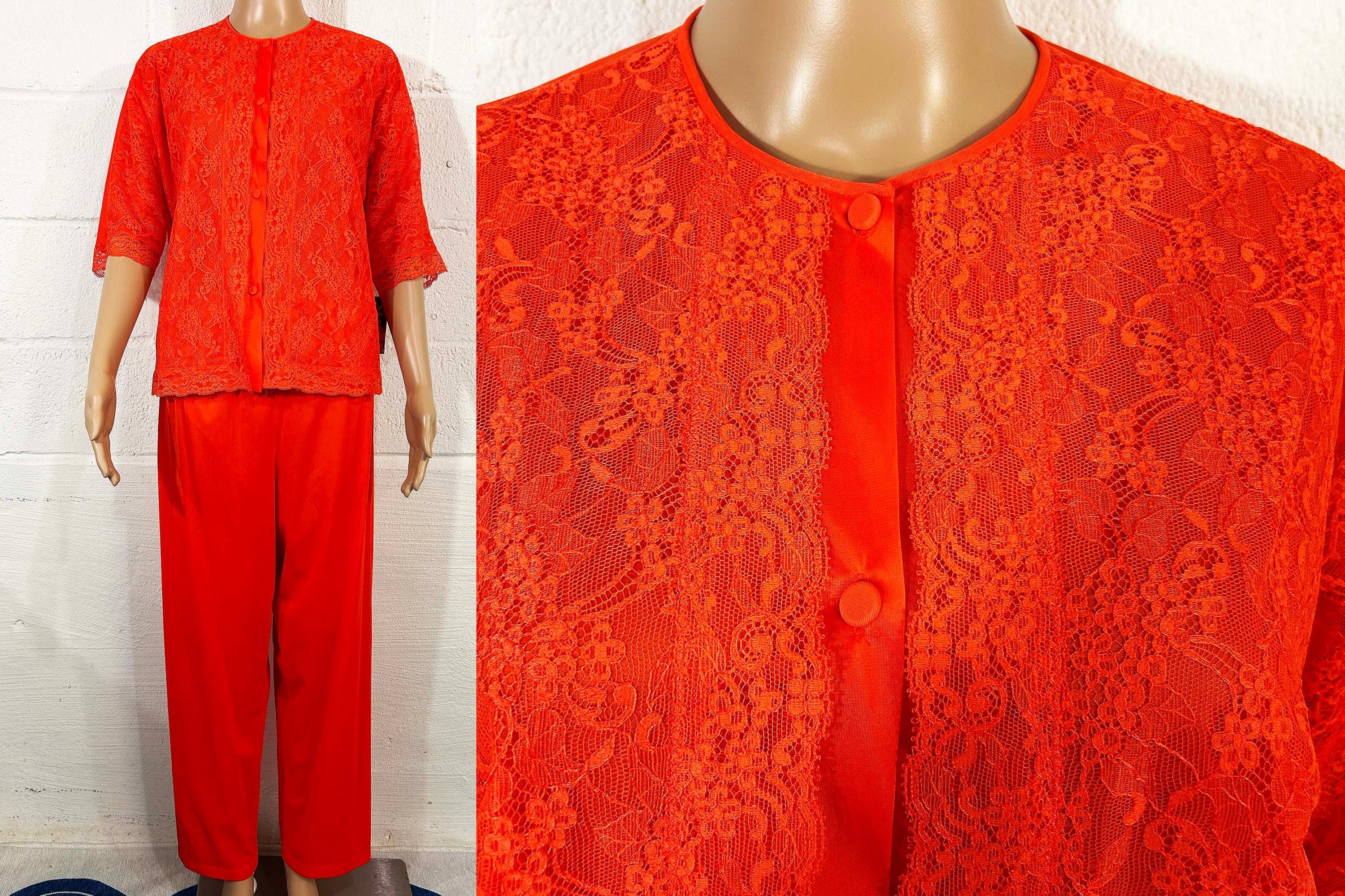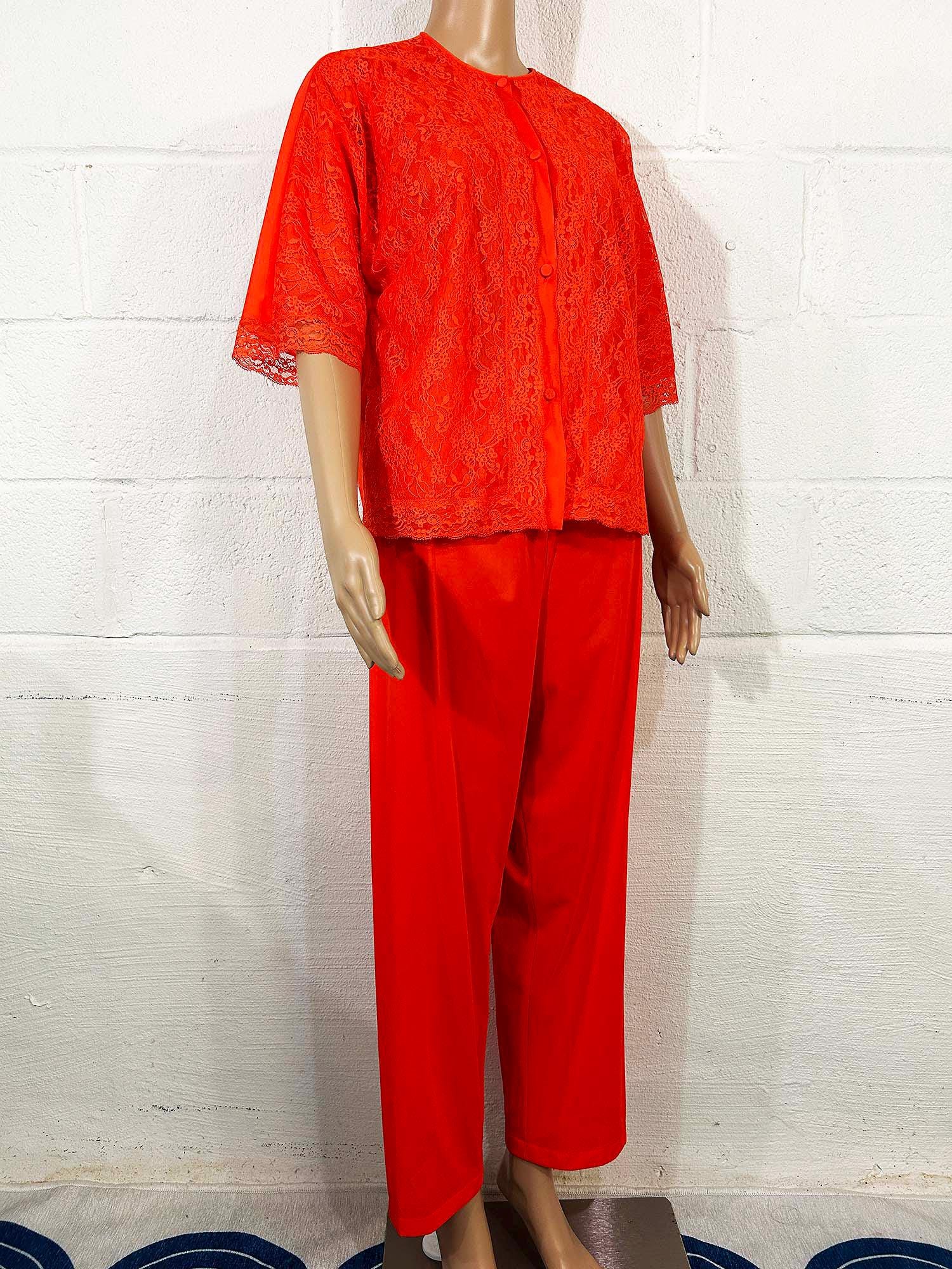 Adorable bright coral red pajama set. Lace button front shirt with short sleeves. Elastic waist pants. The set is in excellent condition with no significant flaws. Fabric has slight stretch.