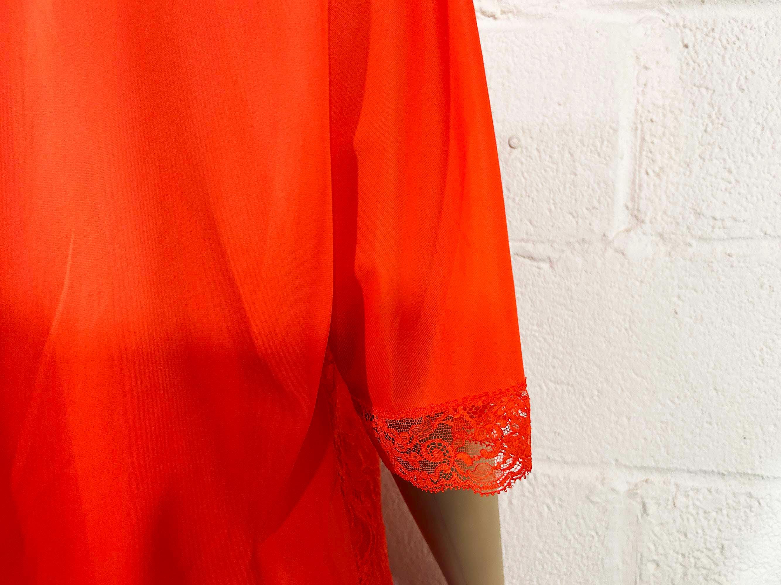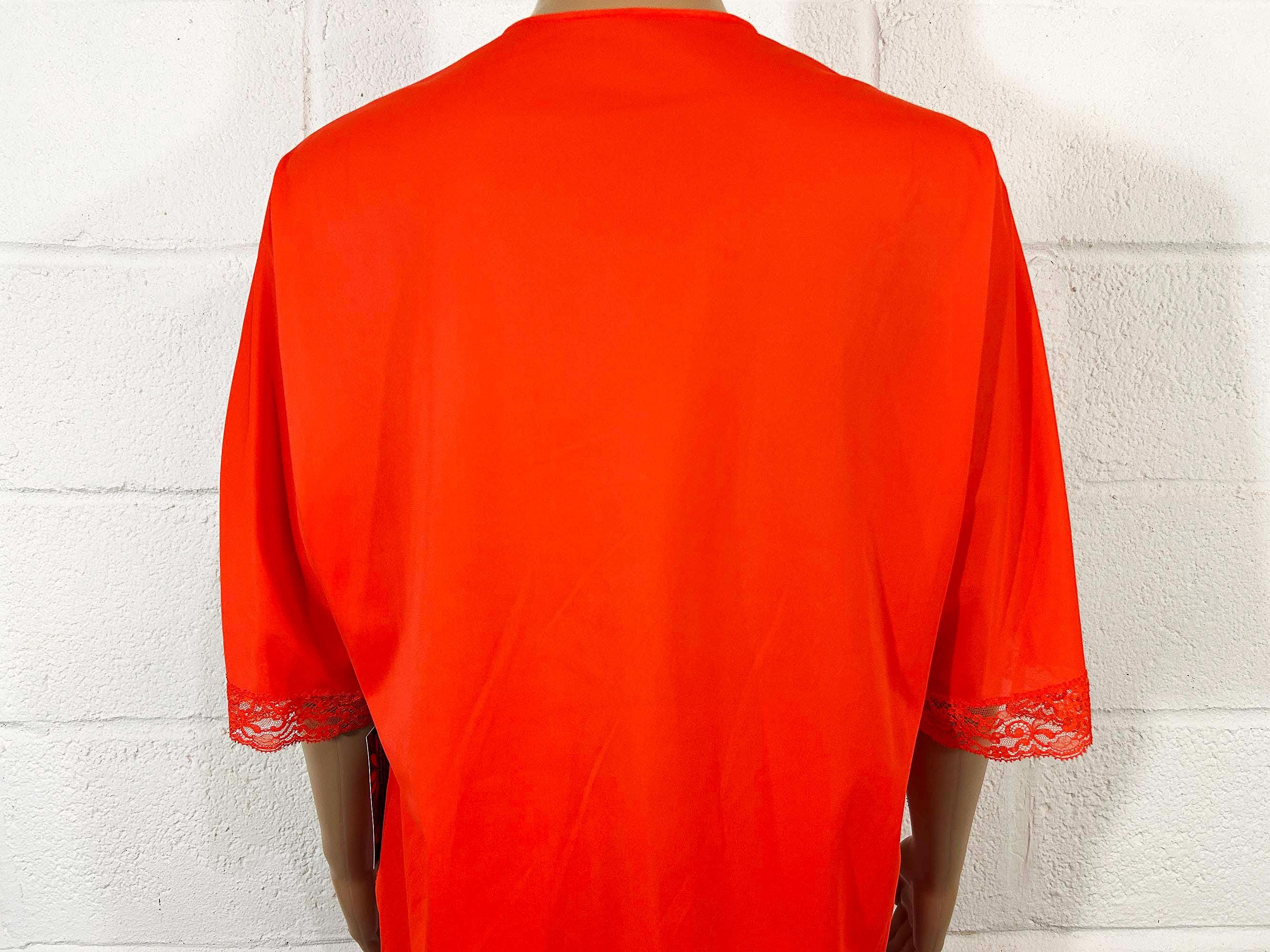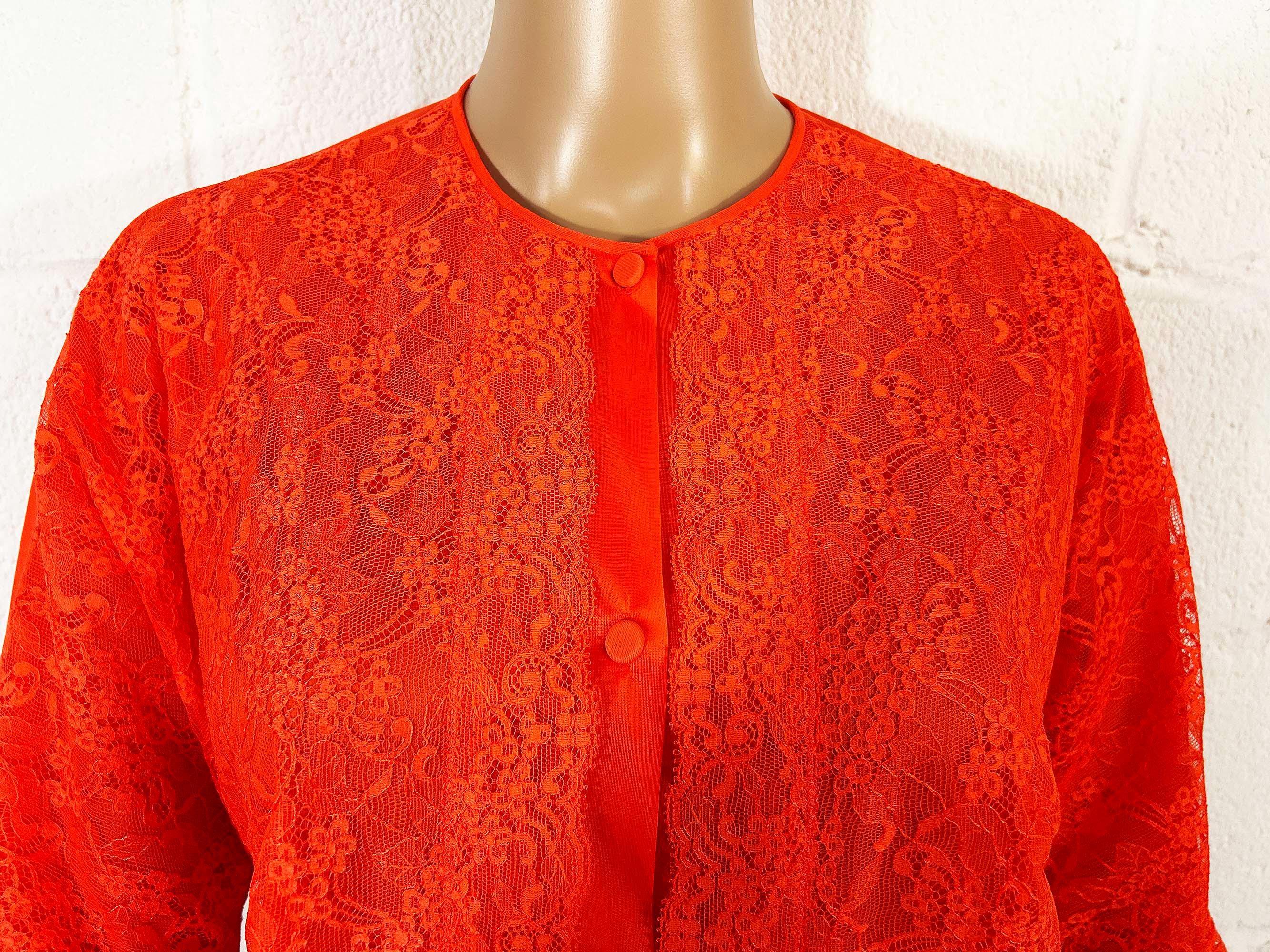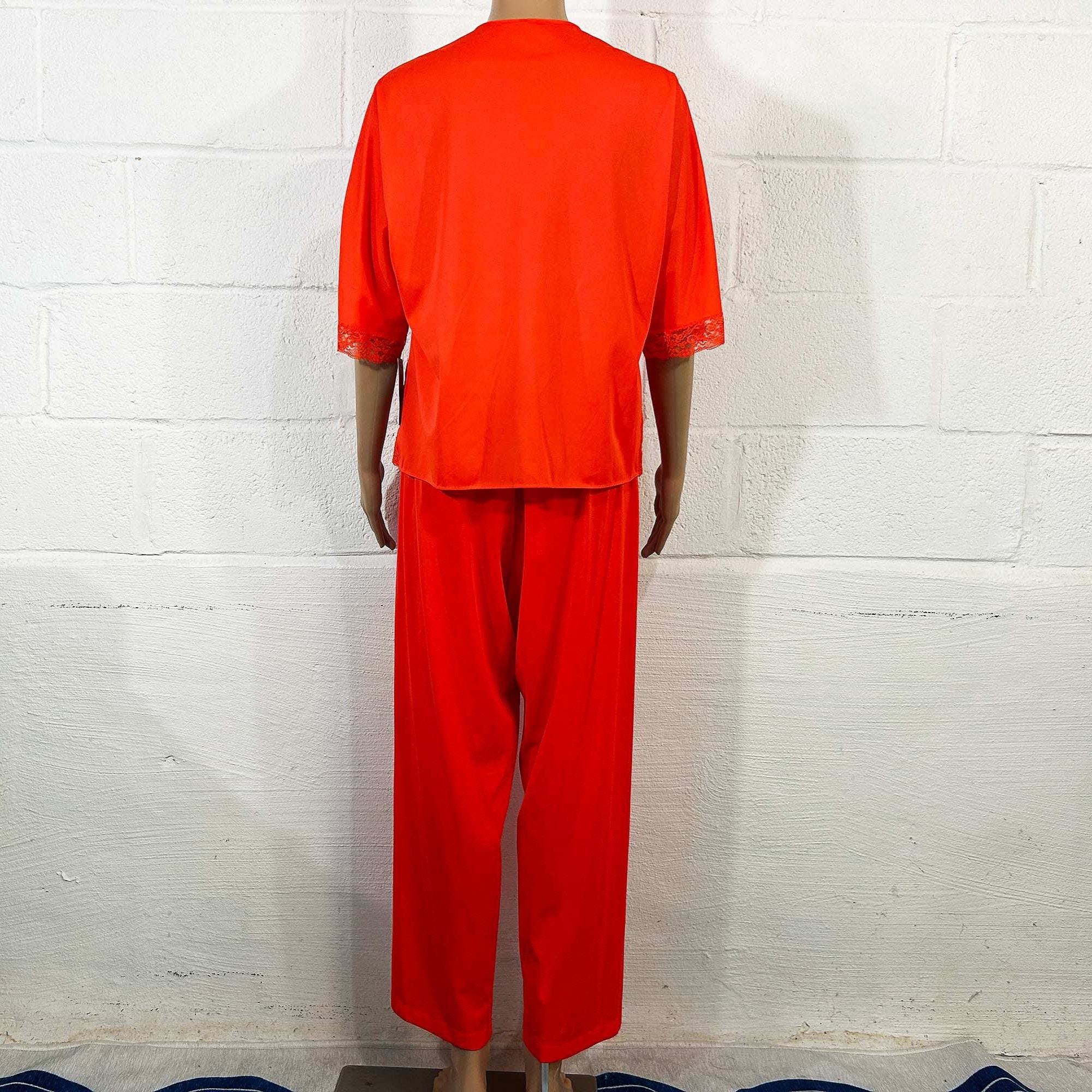Adorable bright coral red pajama set. Lace button front shirt with short sleeves. Elastic waist pants. The set is in excellent condition with no significant flaws. Fabric has slight stretch.