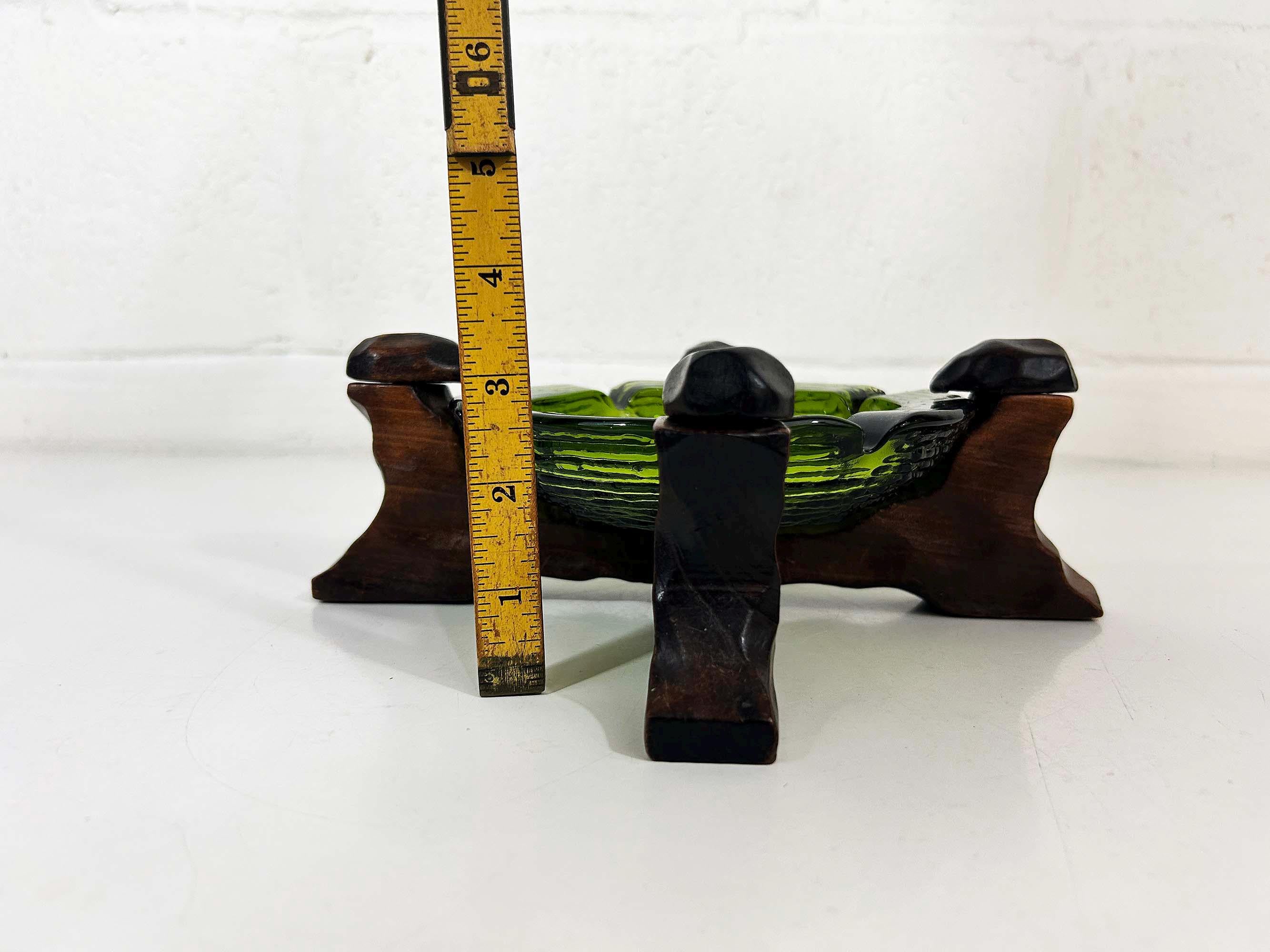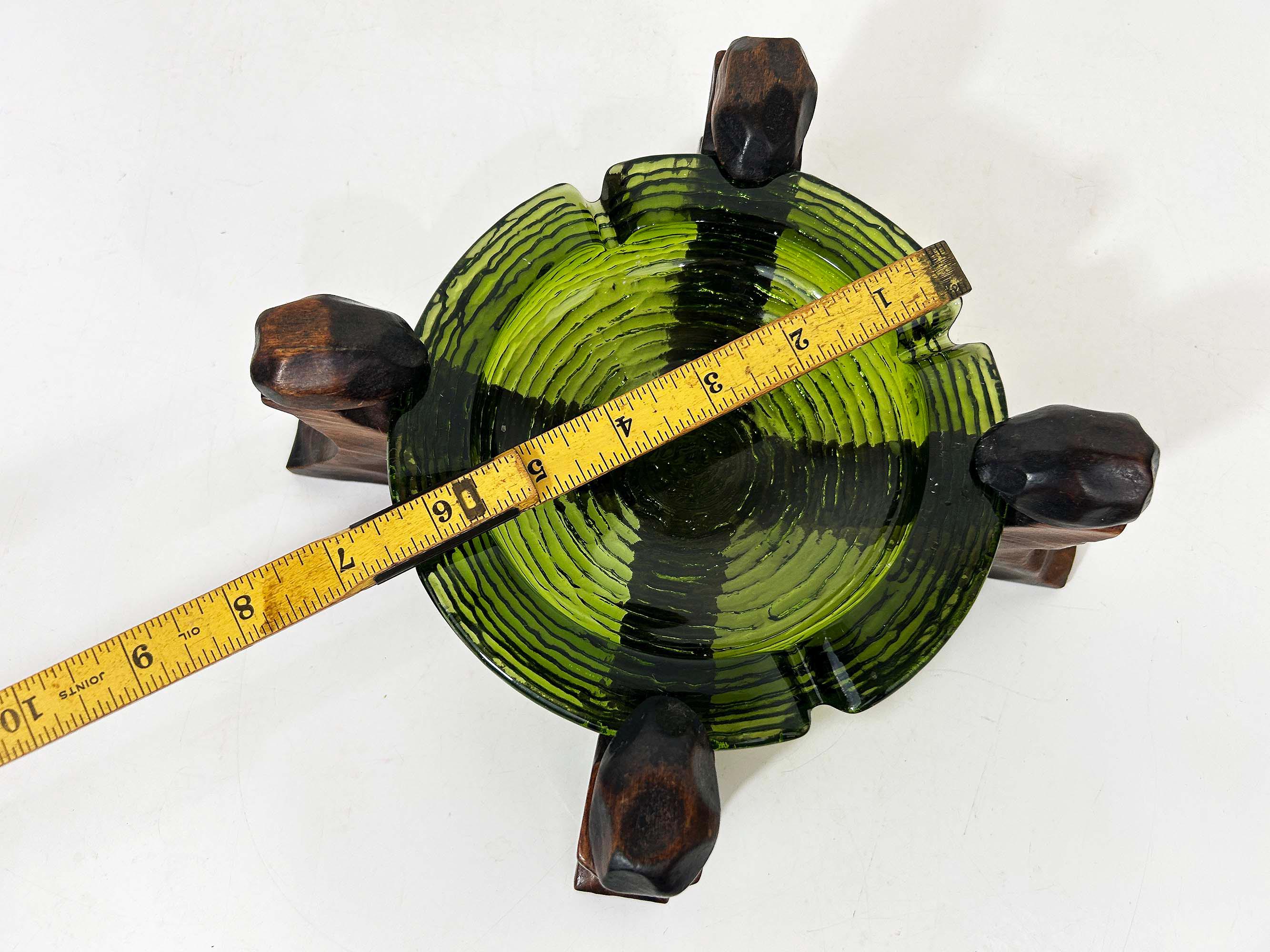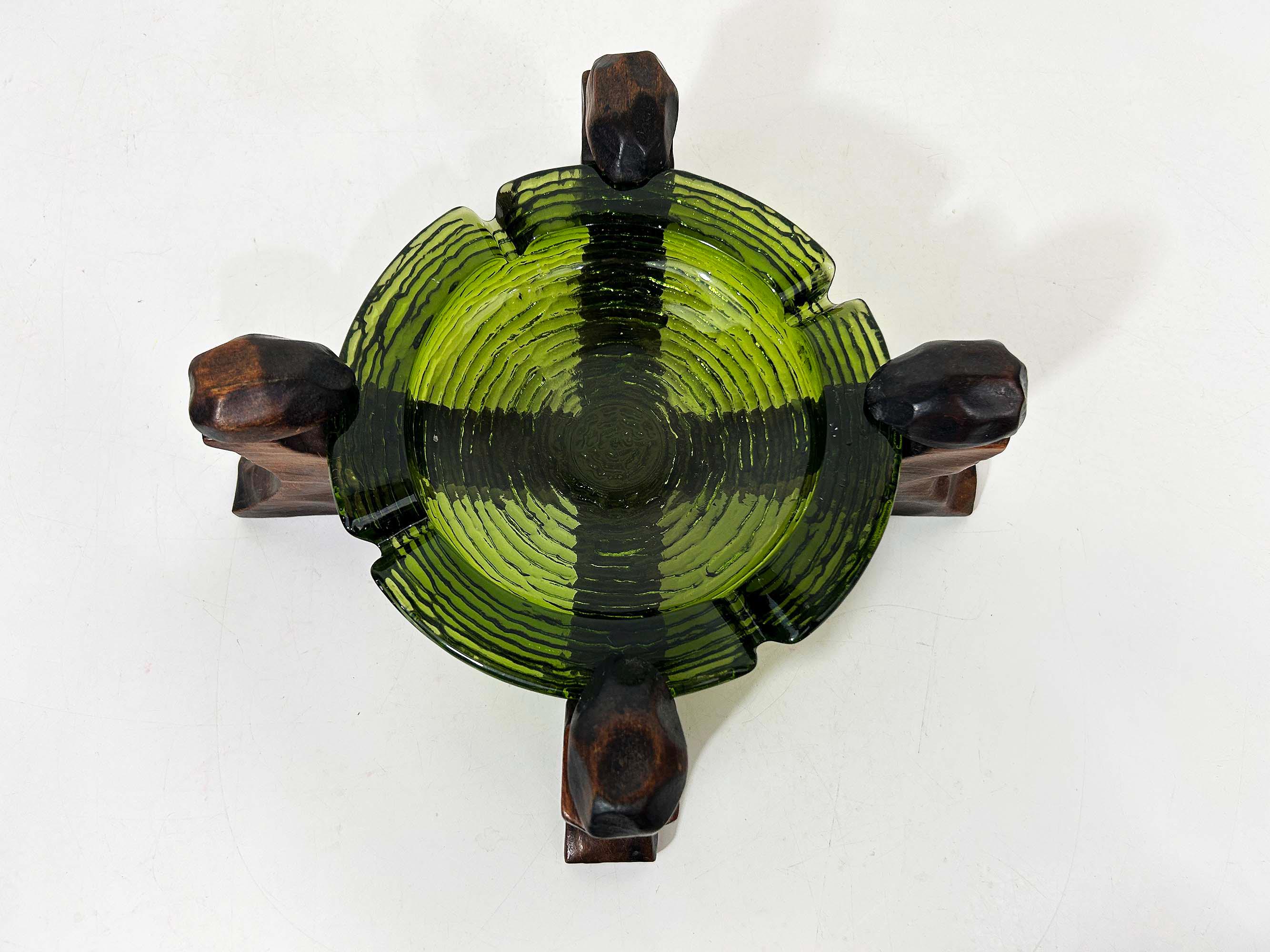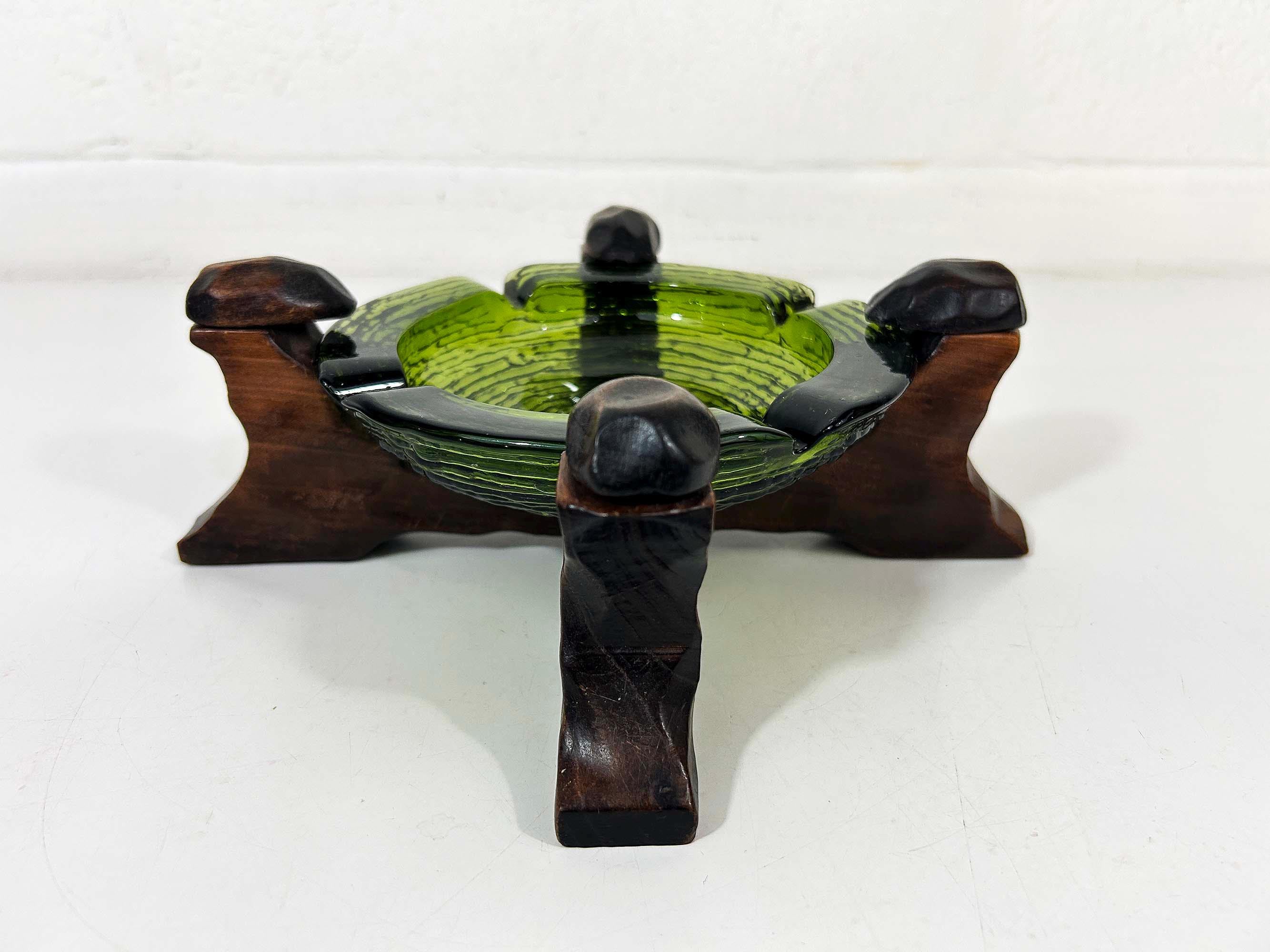 The funkiest green glass ashtray with a unique wood stand! It is in good vintage condition with no significant flaws. Such a cool statement piece for your home! The wooden stand comes apart so you can easily clean the glass ashtray. The ashtray is about 6 1/2 inches in diameter and 3 inches tall.